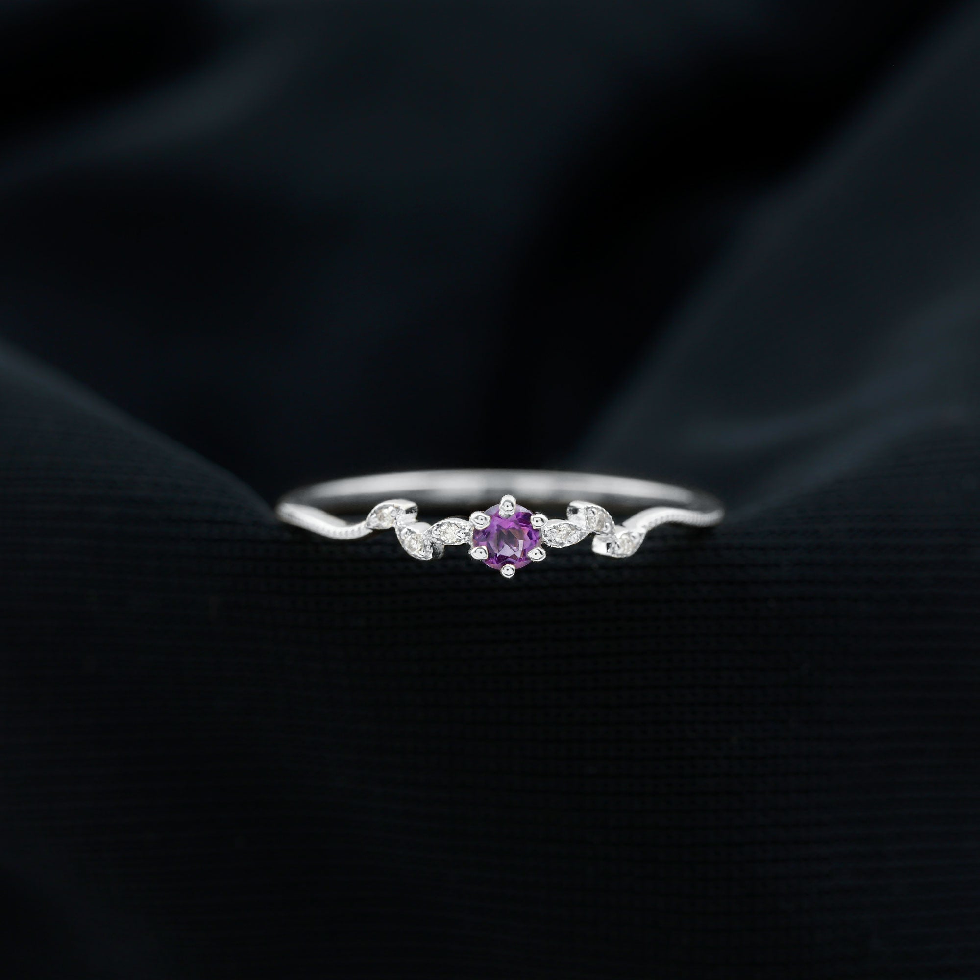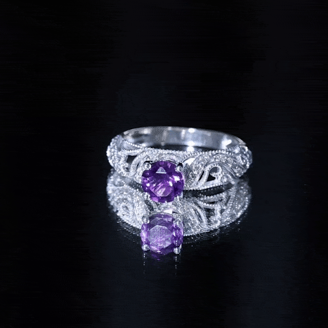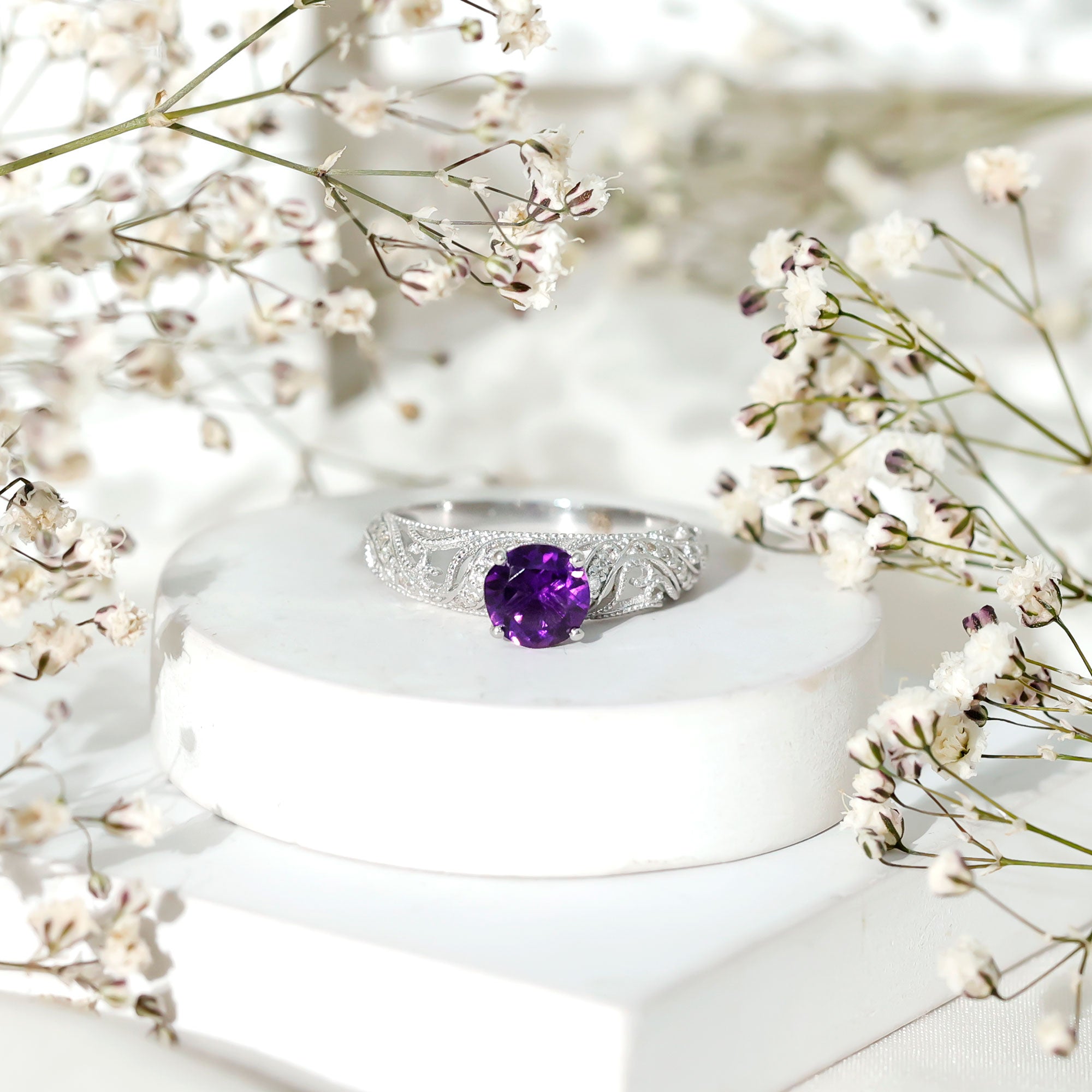 Amethyst as a center stone set in the filigree shank, cathedral, and miligrain shank is a vintage-inspired amethyst ring. Vintage style rings mix classic designs with modern technology, making them ideal for engagement and promises.