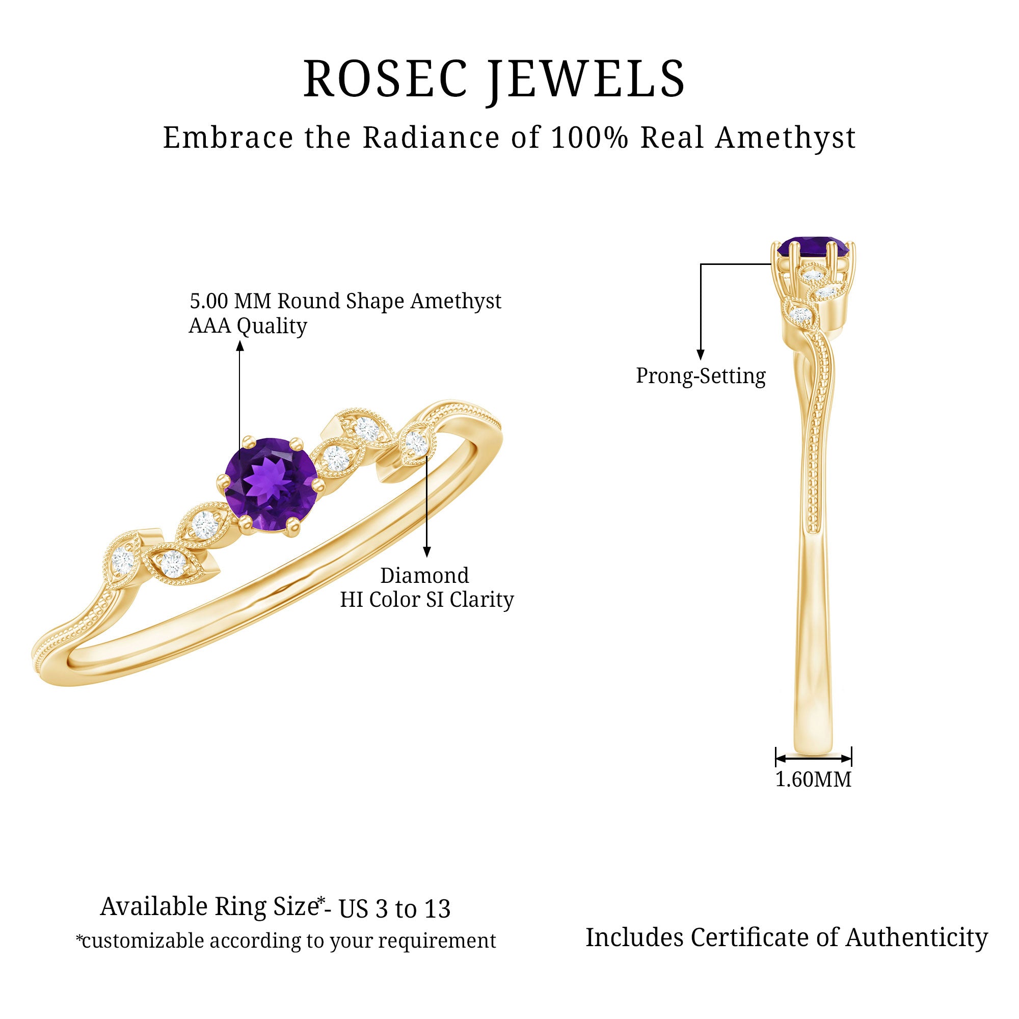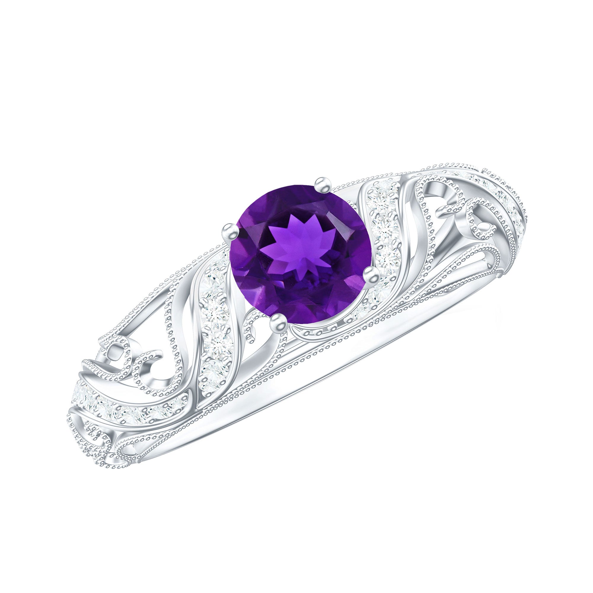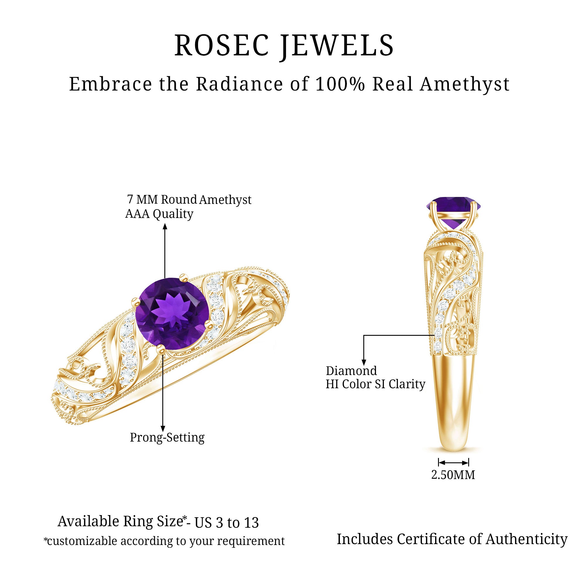 Amethyst as a center stone set in the filigree shank, cathedral, and miligrain shank is a vintage-inspired amethyst ring. Vintage style rings mix classic designs with modern technology, making them ideal for engagement and promises.