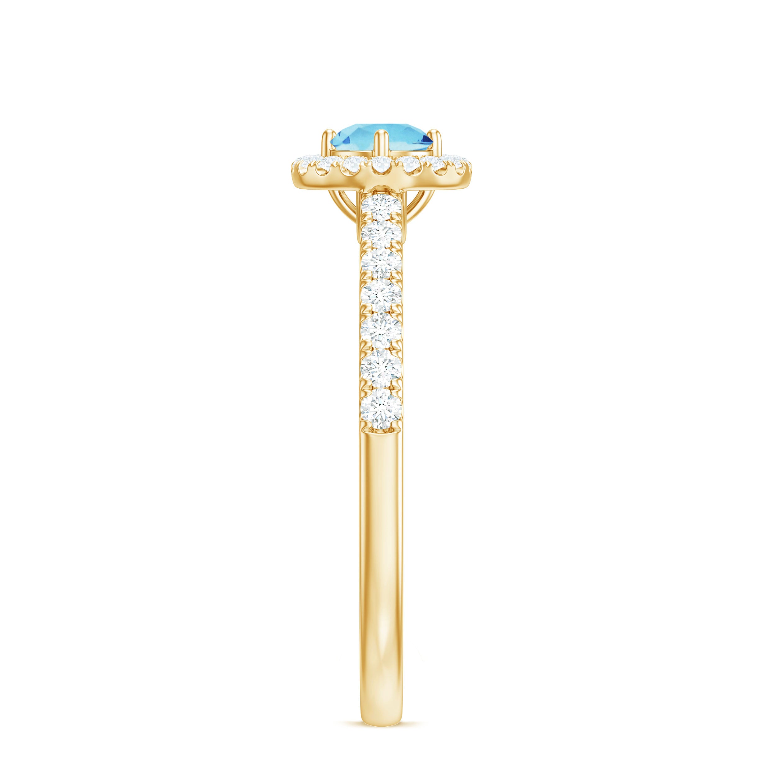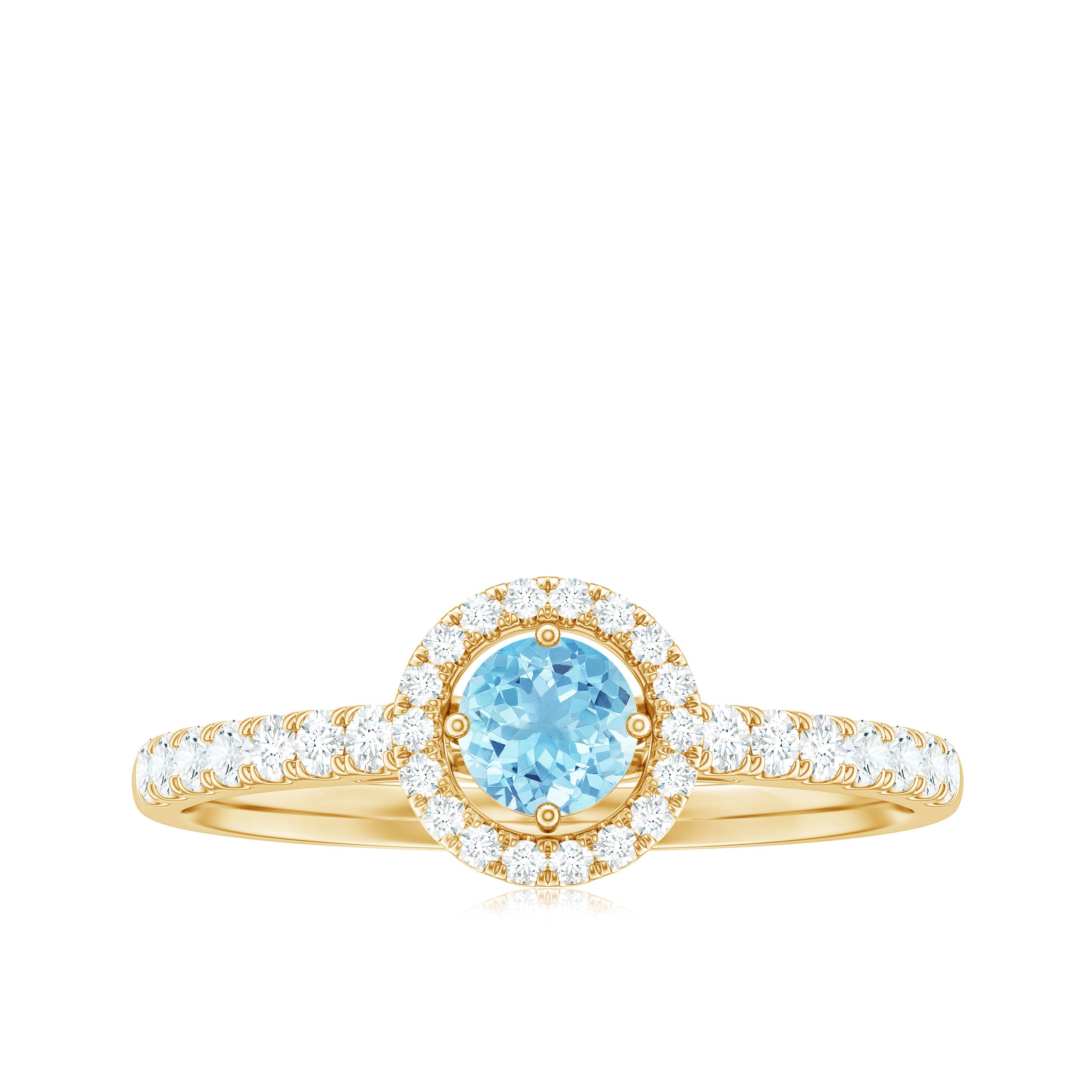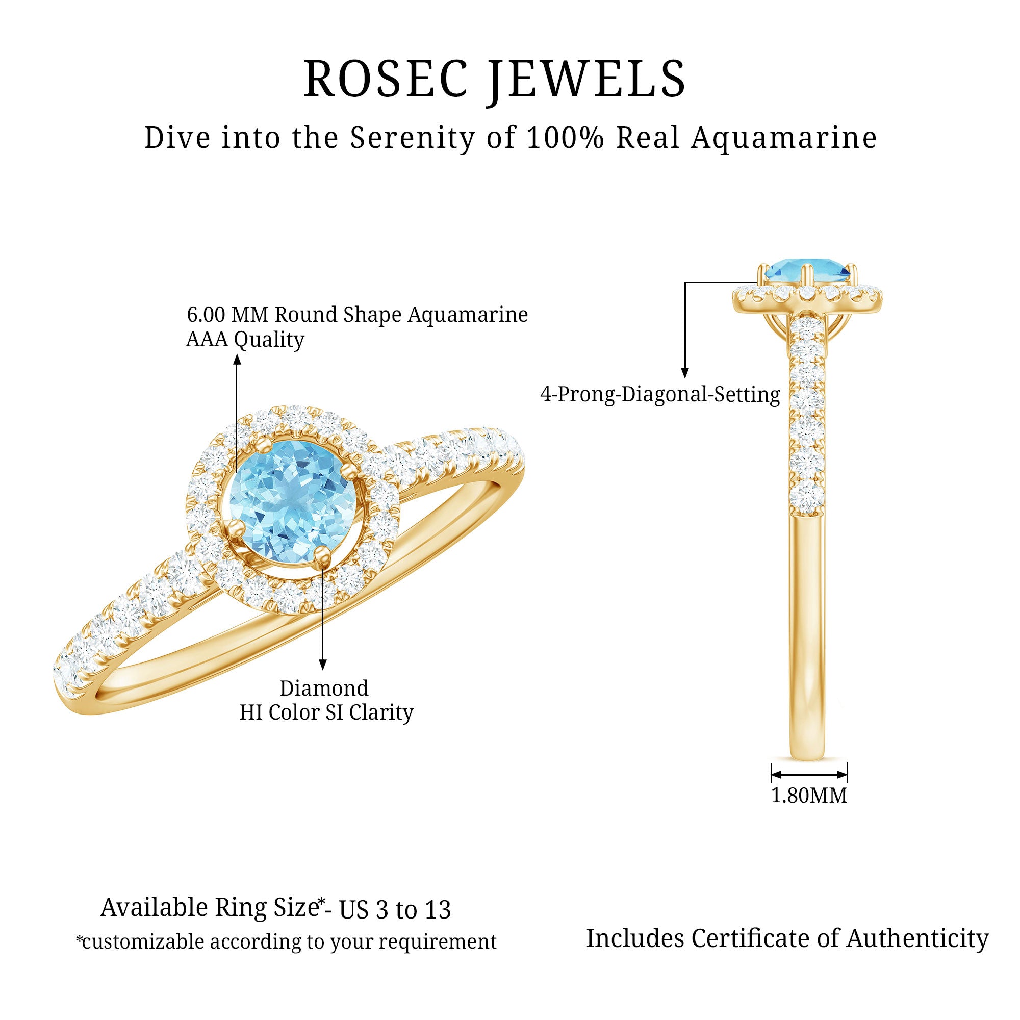 Aquamarine Halo Engagement Rings: - Showcasing an aquamarine centerstone with dainty round diamonds encircling it for an added brilliance. Our aquamarine diamond engagement rings exude timeless elegance, creating a mesmerizing and dazzling effect.