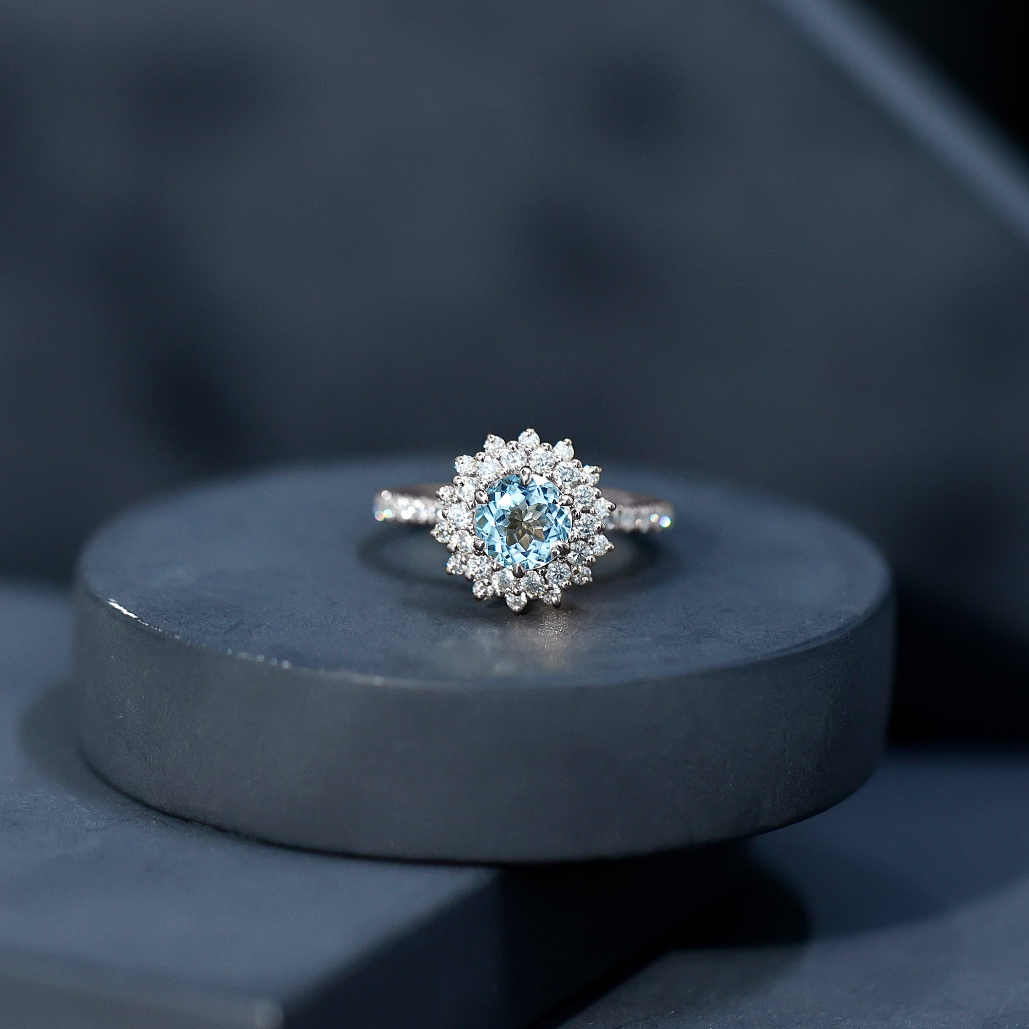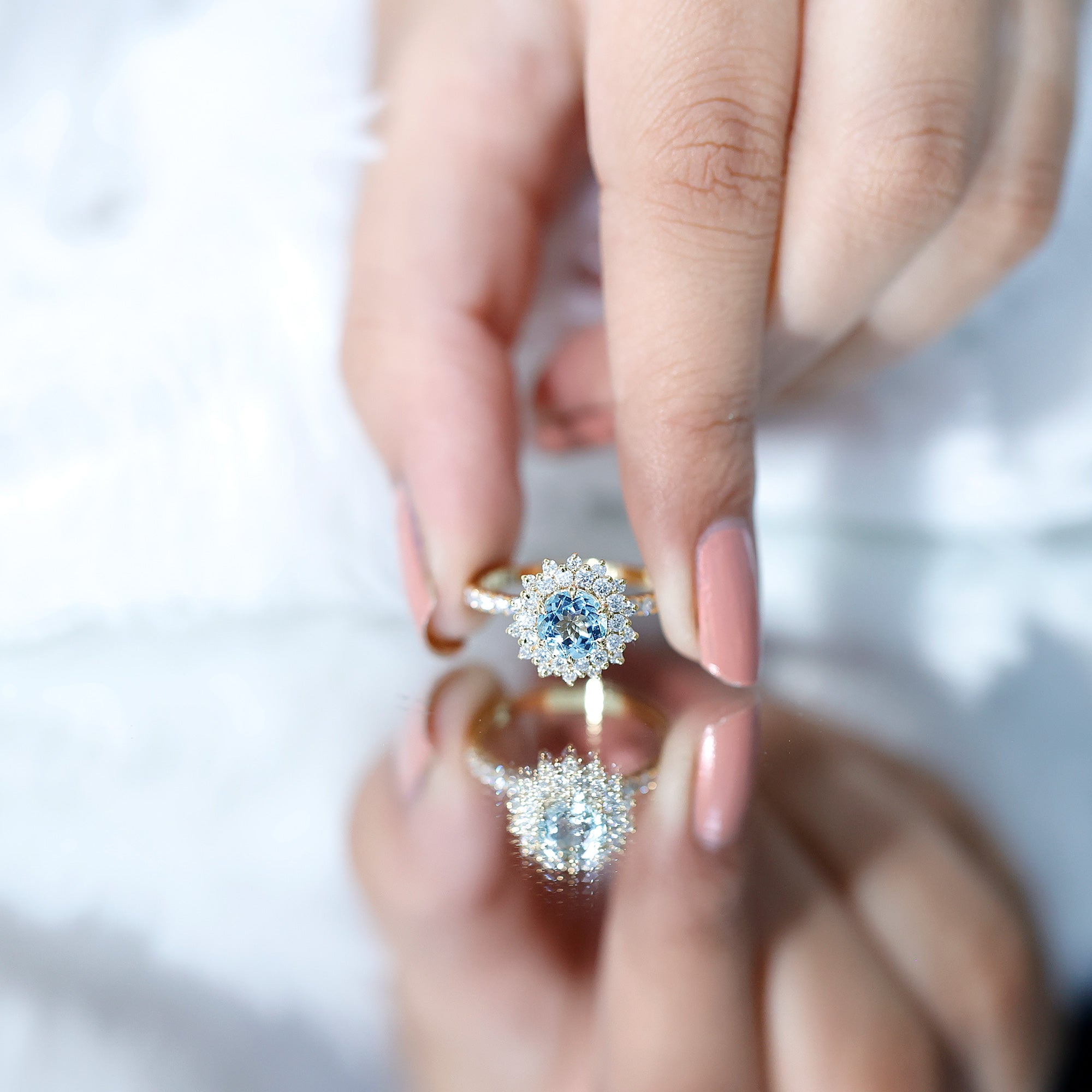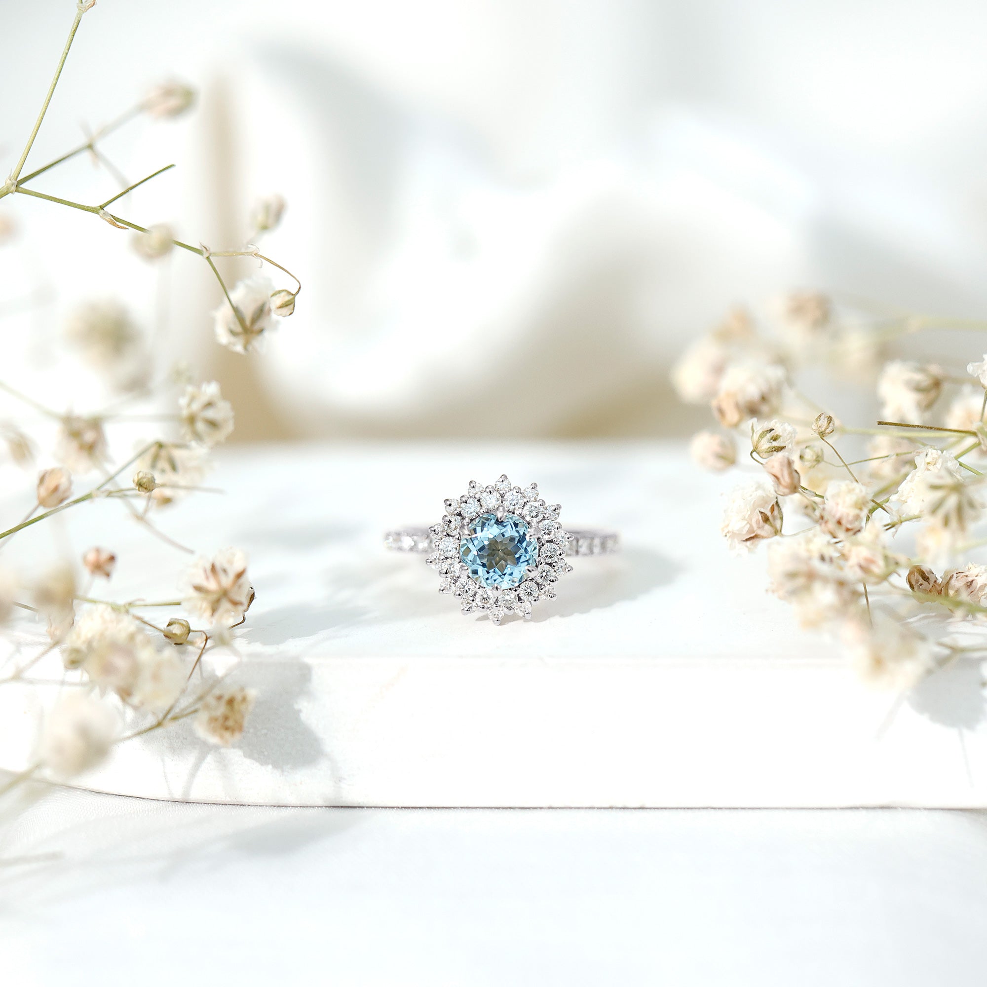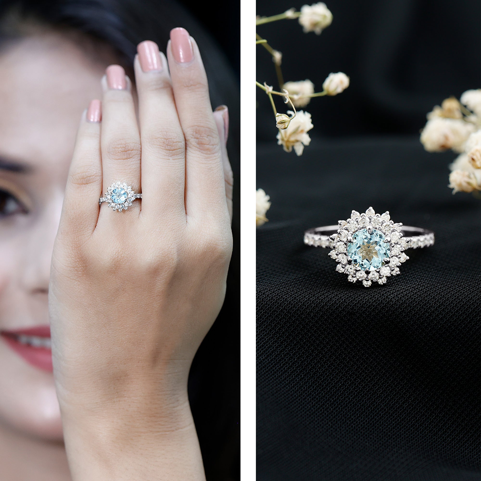 Aquamarine looks stunning in white gold for a crisp contrast, while yellow and rose gold add warmth and vintage charm. Protective settings such as halos, bezels, and secure prongs help safeguard the gemstone and enhance brilliance for daily wear.