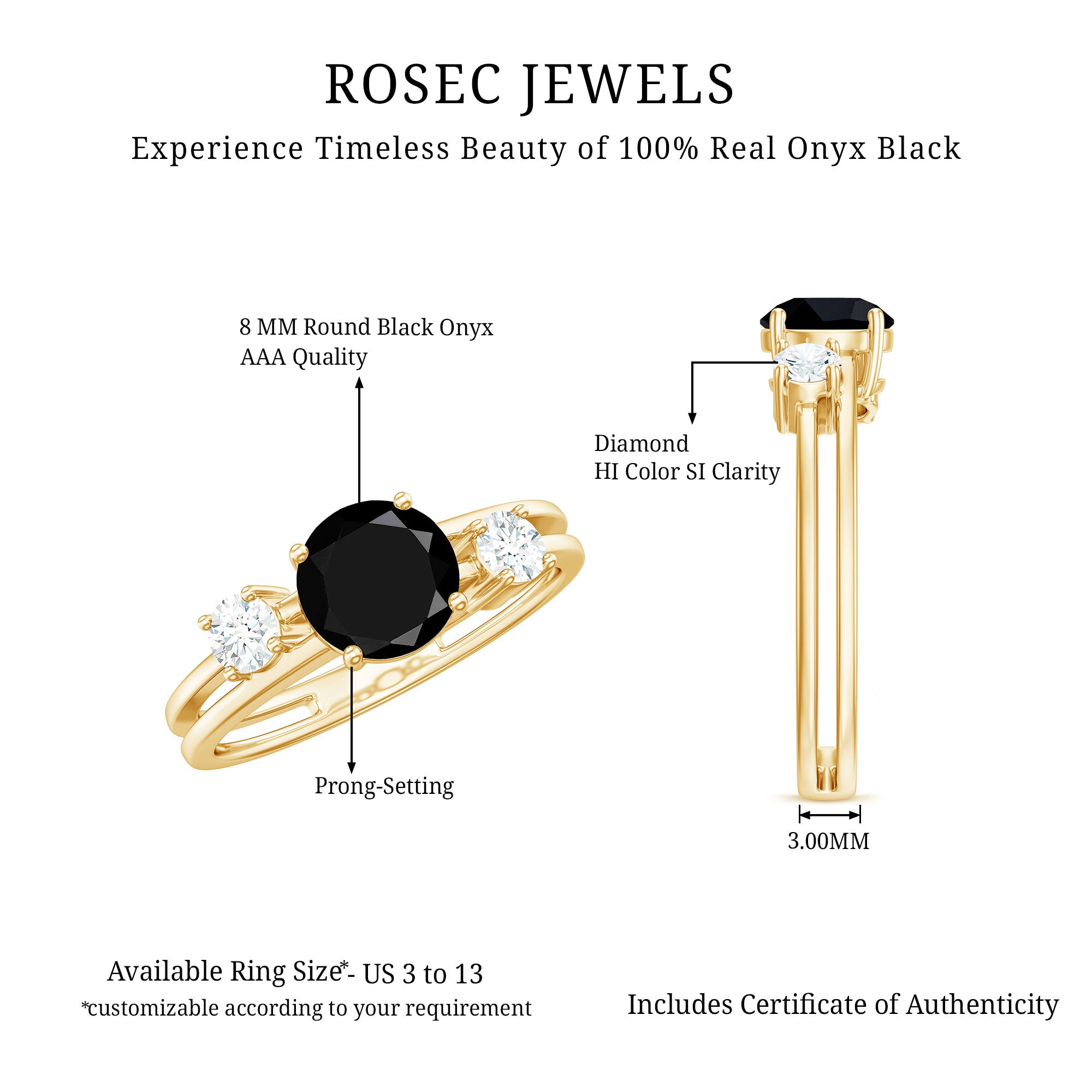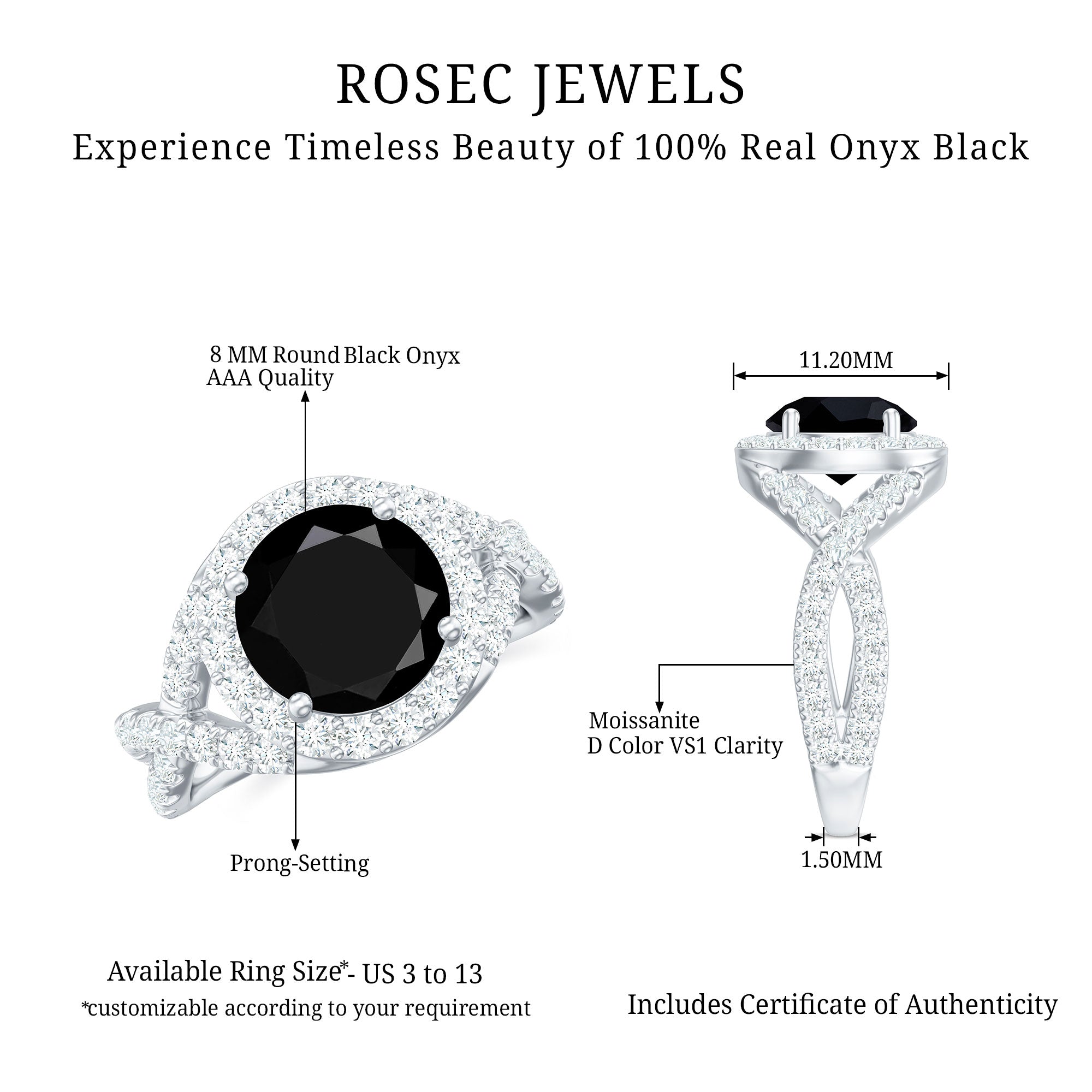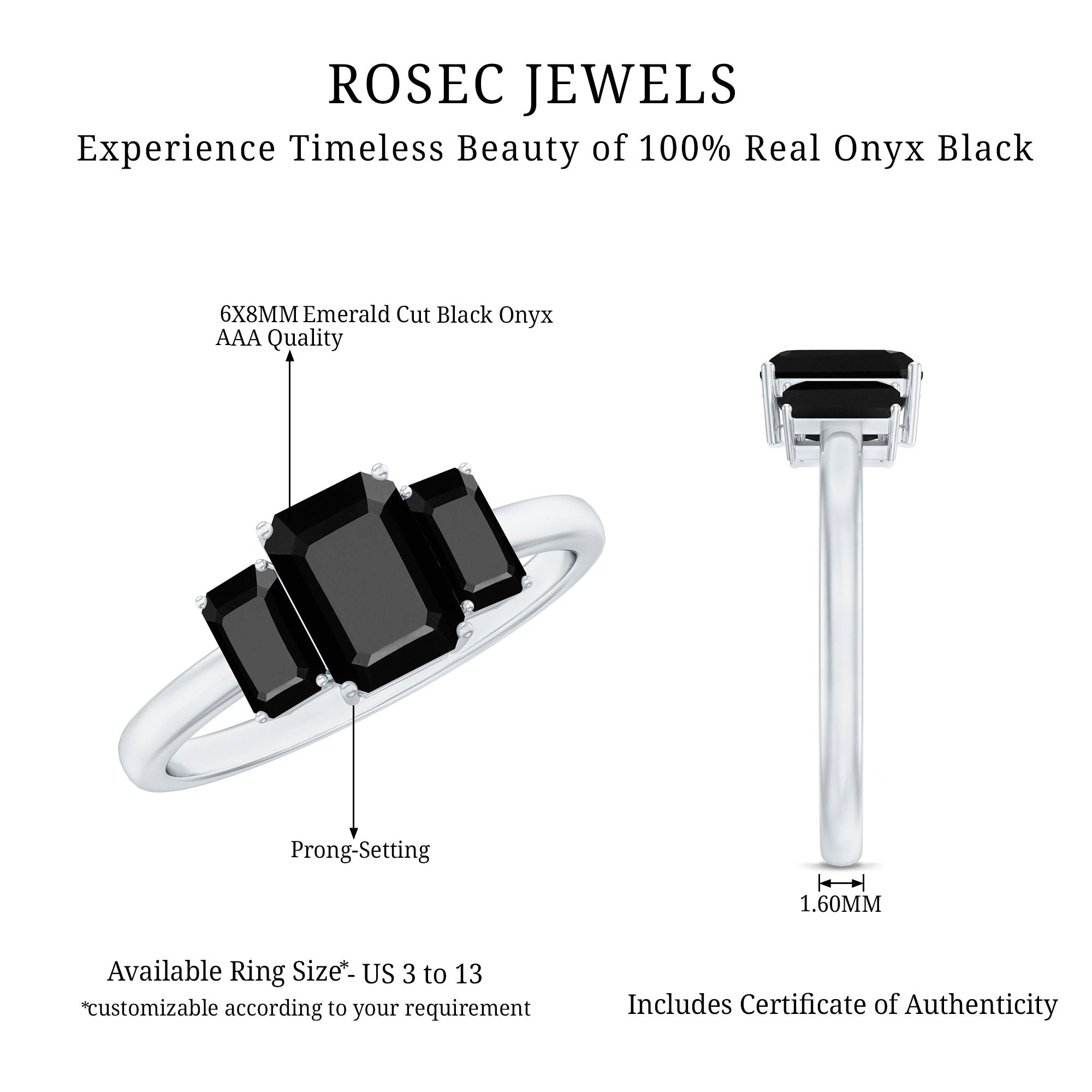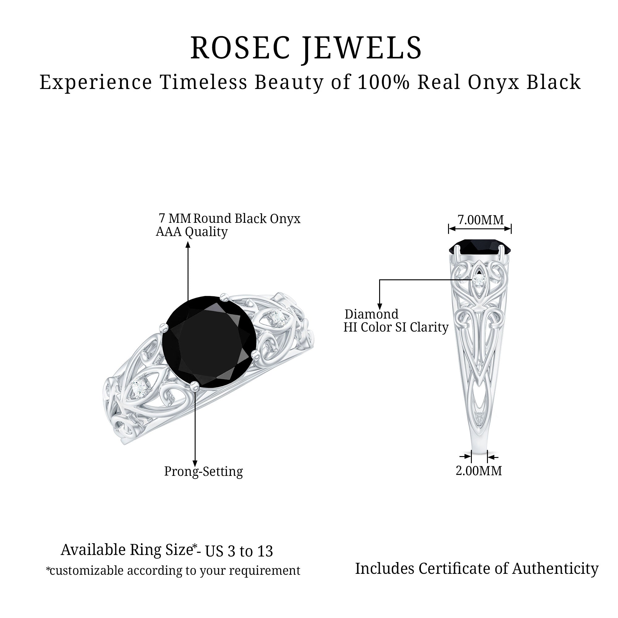 The extraordinary collection of black onyx engagement rings by Rosec Jewels is something to look for while buying engagement rings for women online. The unique parallel white banded black onyxes are a variety of silicon mineral making each piece unique in itself. We, at Rosec Jewels ensure quality check at every step of jewelry crafting and only after quality assurance, our black onyx rings find their way into the lives of women with a taste for latest jewelry trends and an inclination towards the age old traditions.