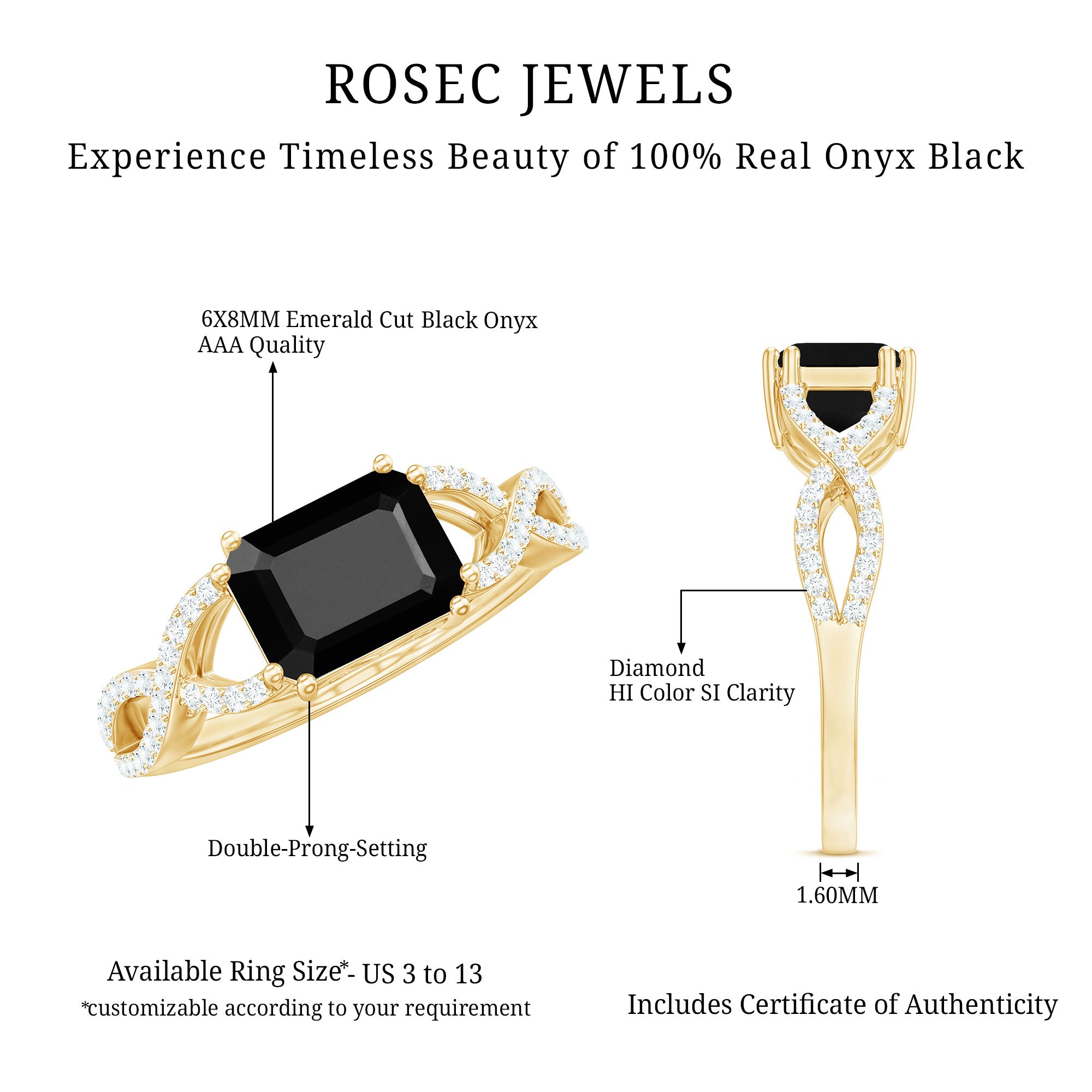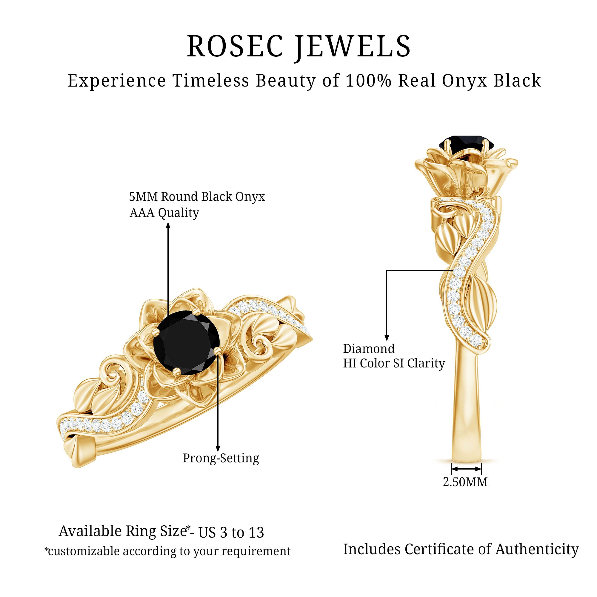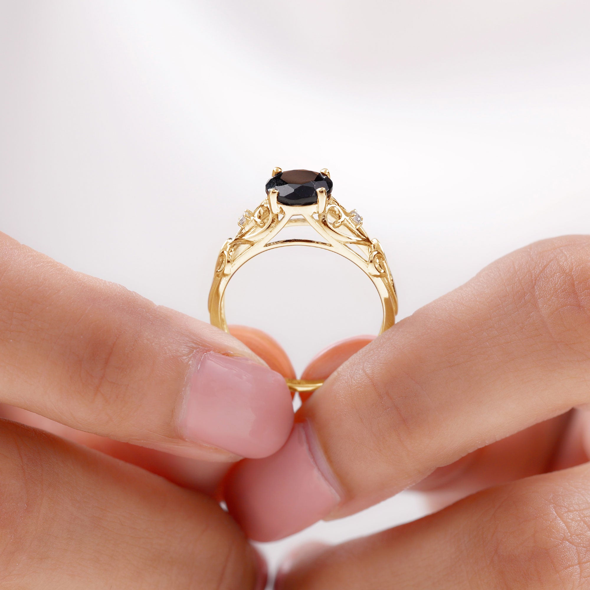 Alluring engagement ring styles are delicately crafted featuring the black onyx in variety of shapes ranging from round, oval, pear, marquise, cushion etc., and combining them with different gold colors. The gold onyx rings are curated only after assuring the 4 C’s of Black Onyx, our lapidarist are responsible for curating black onyx solitaire rings and vintage black onyx rings for engagement. Select from our onyx engagement rings for proposing your beloved and give her a chance to celebrate her happiness.