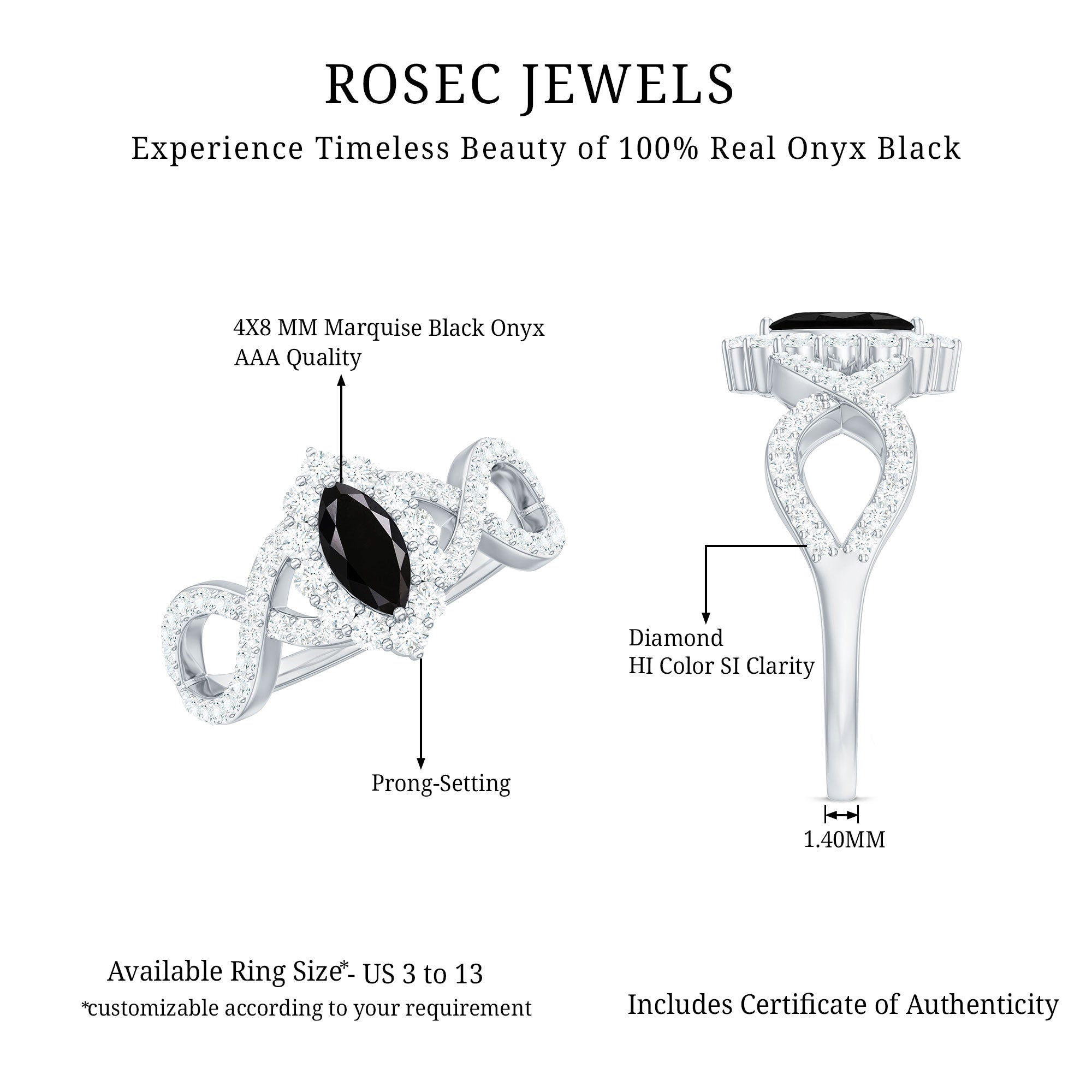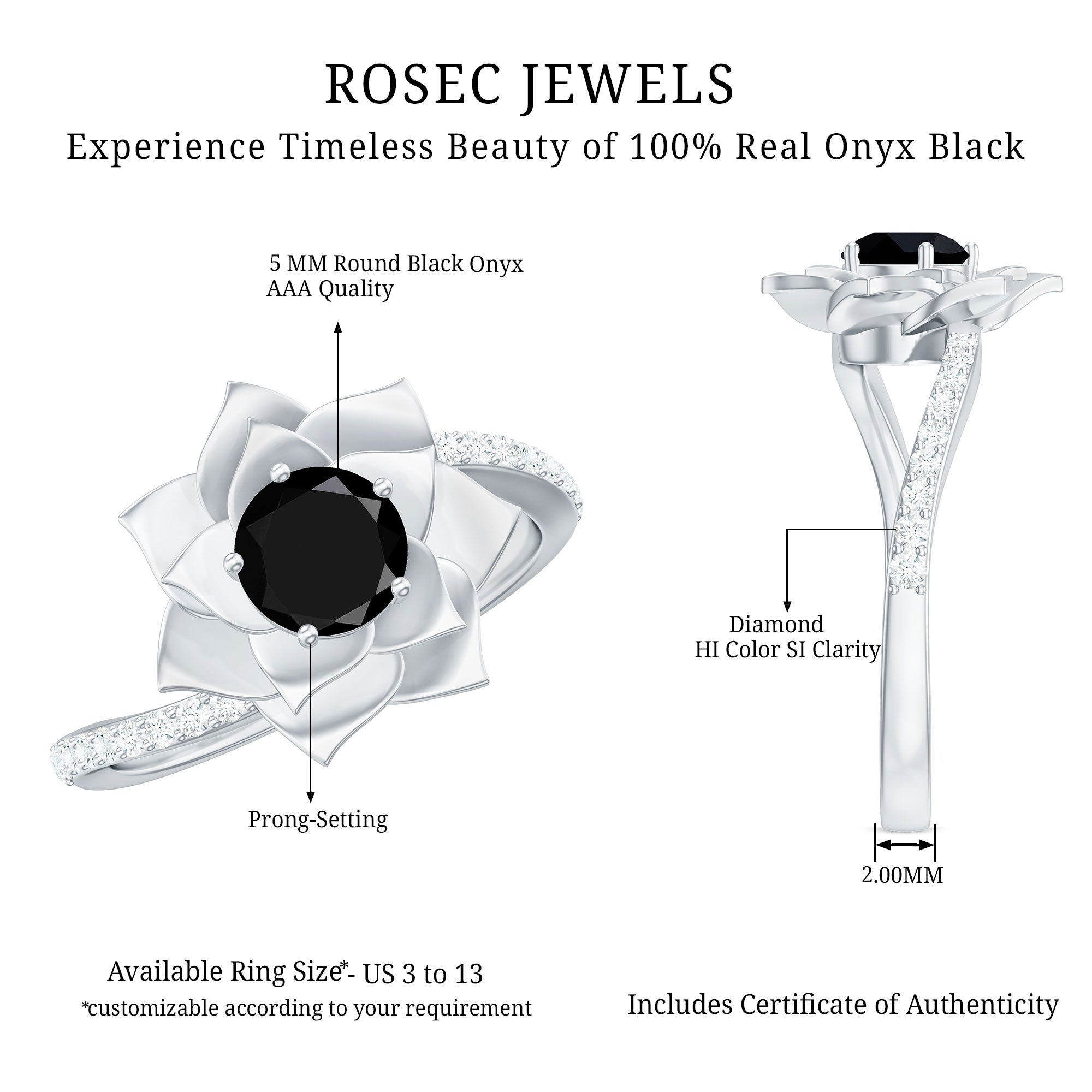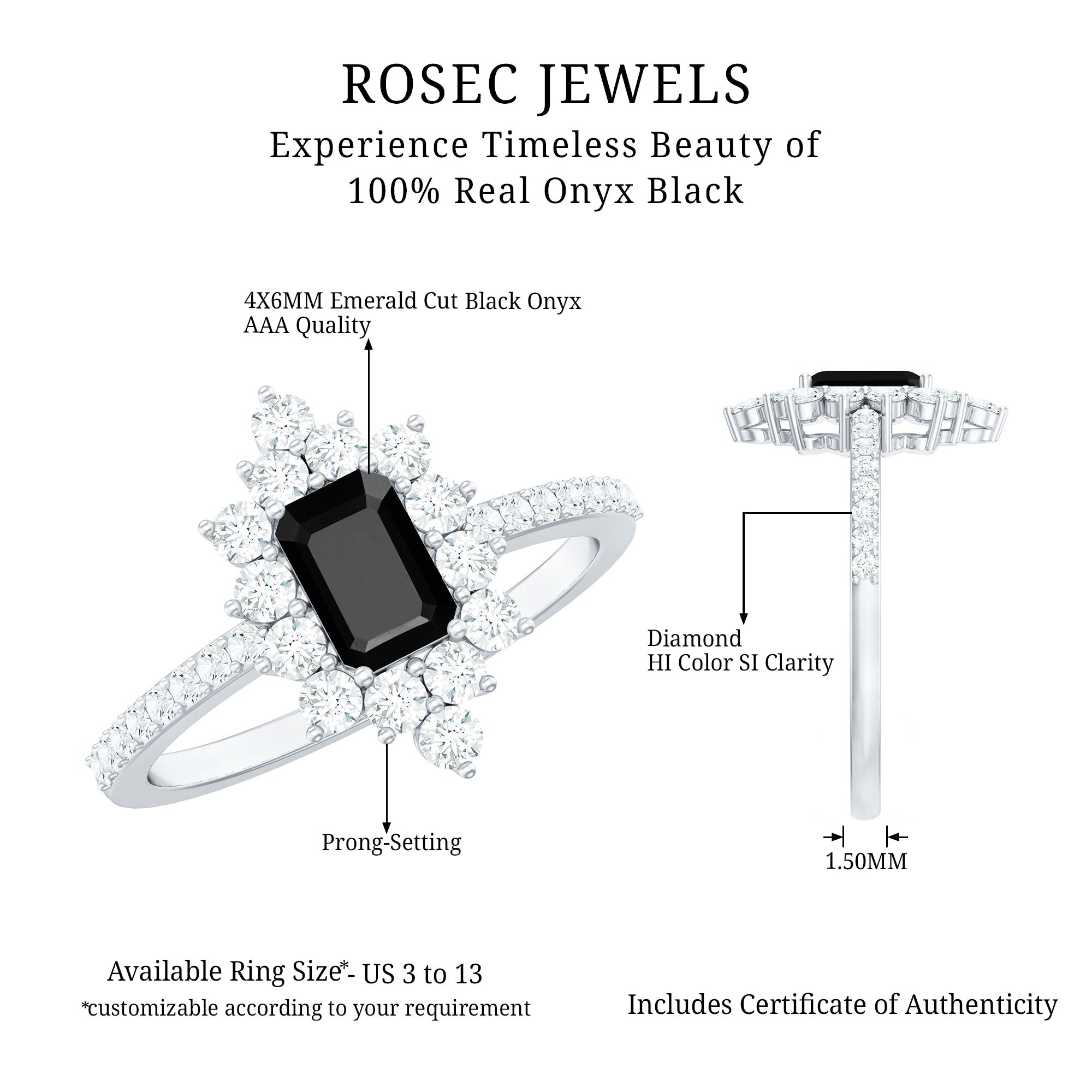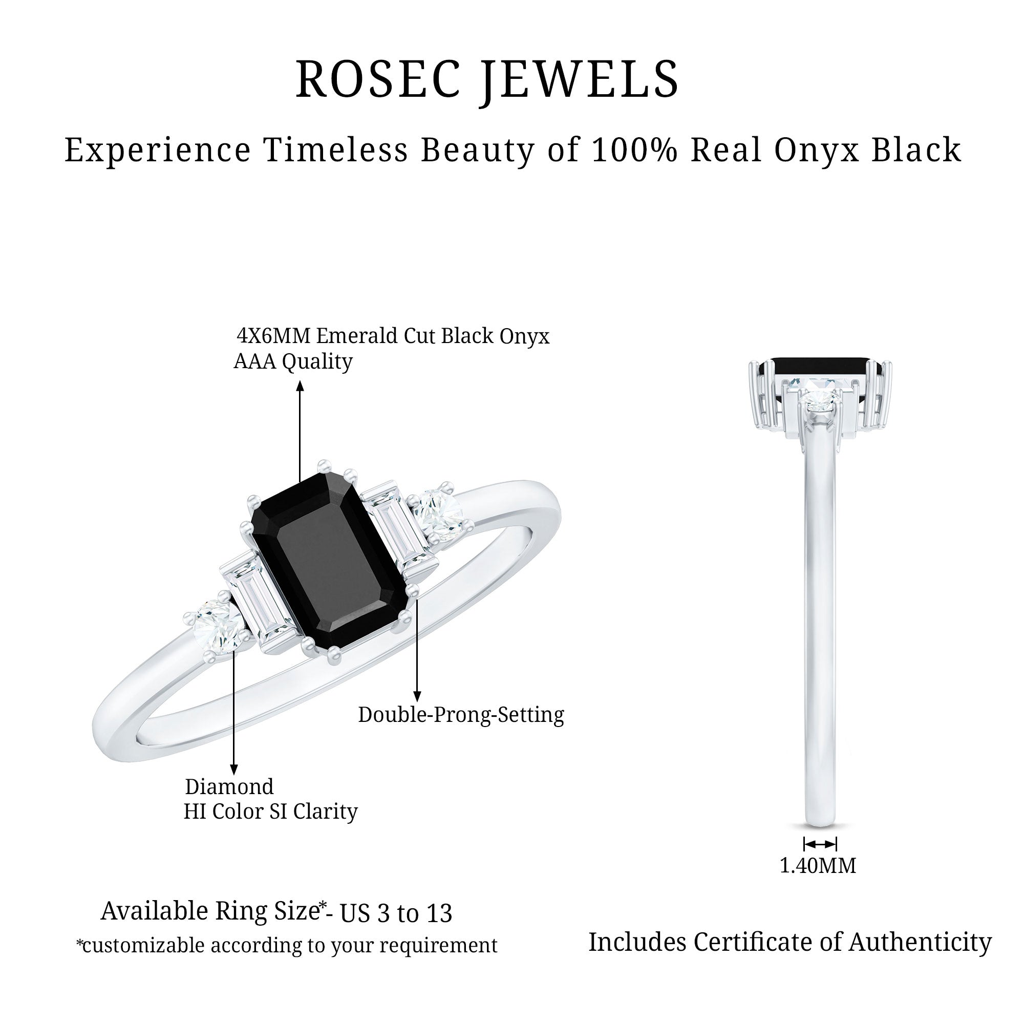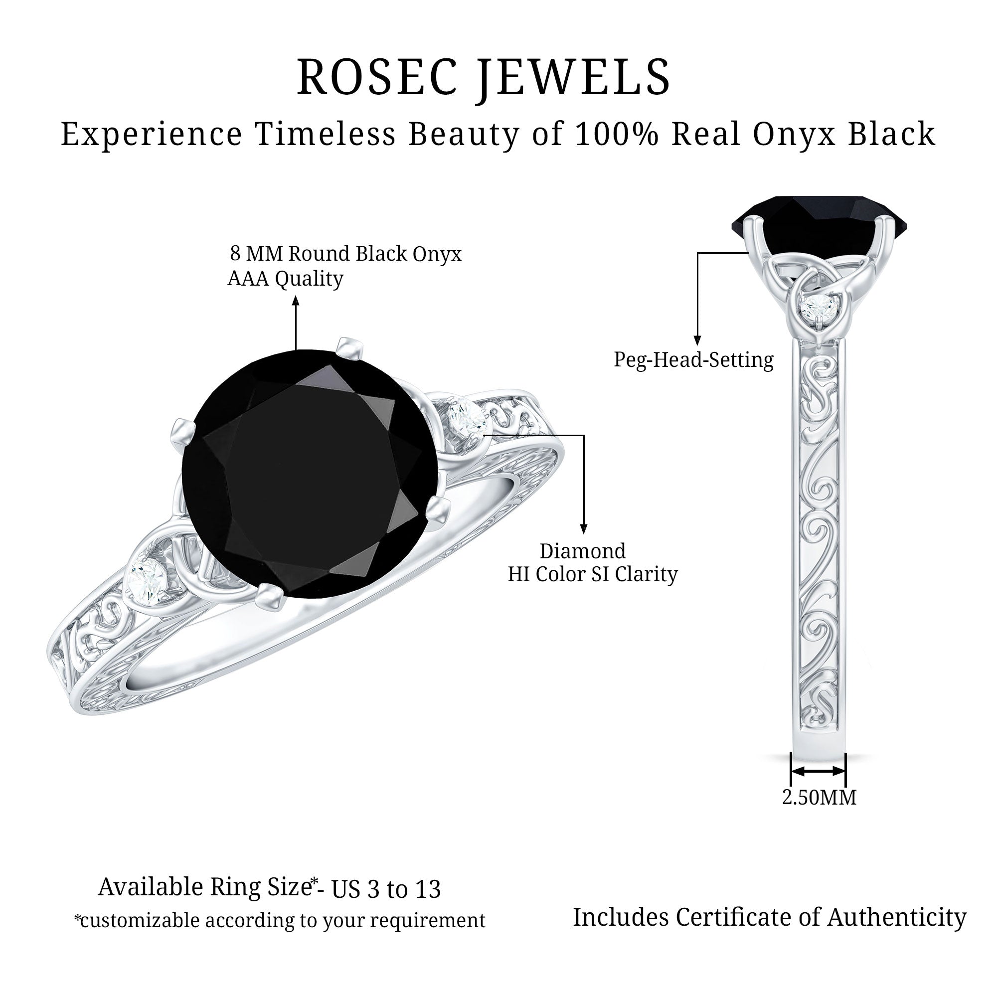 The extraordinary collection of black onyx engagement rings by Rosec Jewels is something to look for while buying engagement rings for women online. The unique parallel white banded black onyxes are a variety of silicon mineral making each piece unique in itself. We, at Rosec Jewels ensure quality check at every step of jewelry crafting and only after quality assurance, our black onyx rings find their way into the lives of women with a taste for latest jewelry trends and an inclination towards the age old traditions.