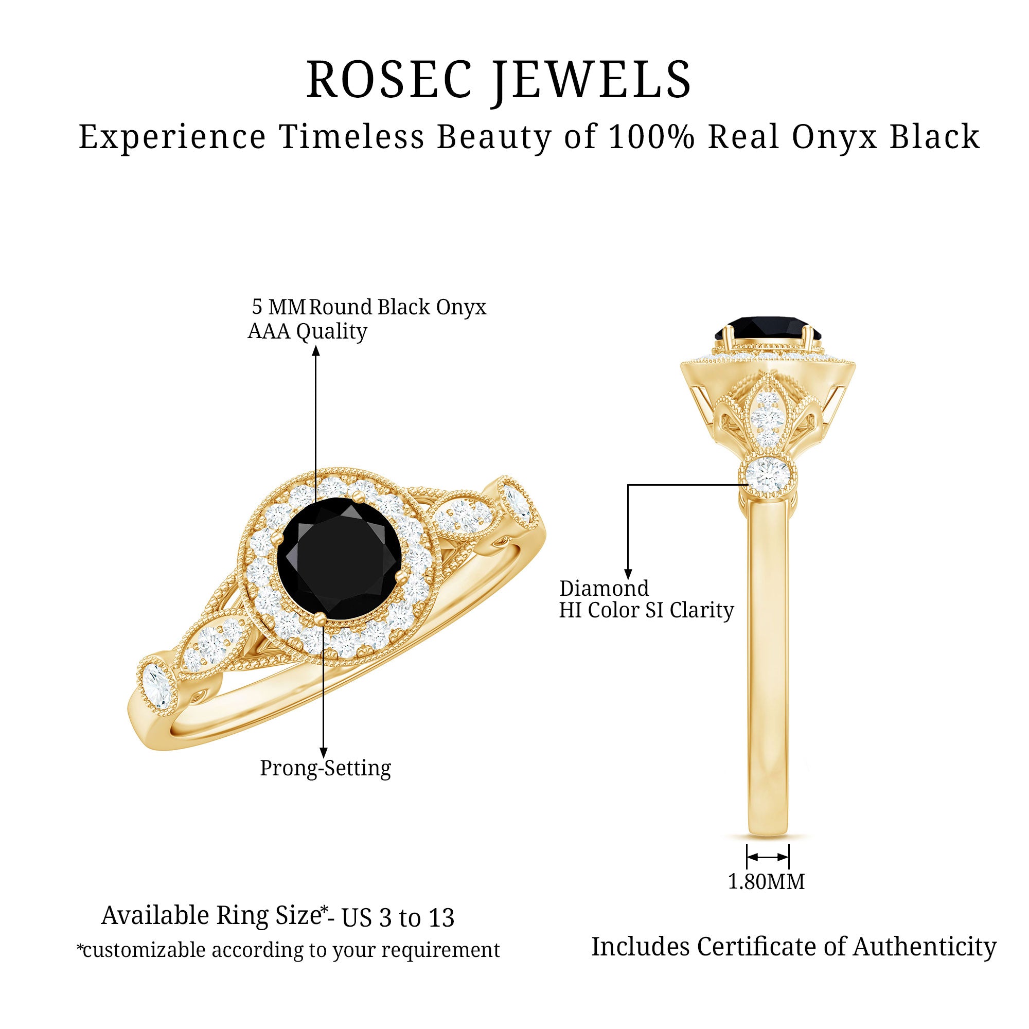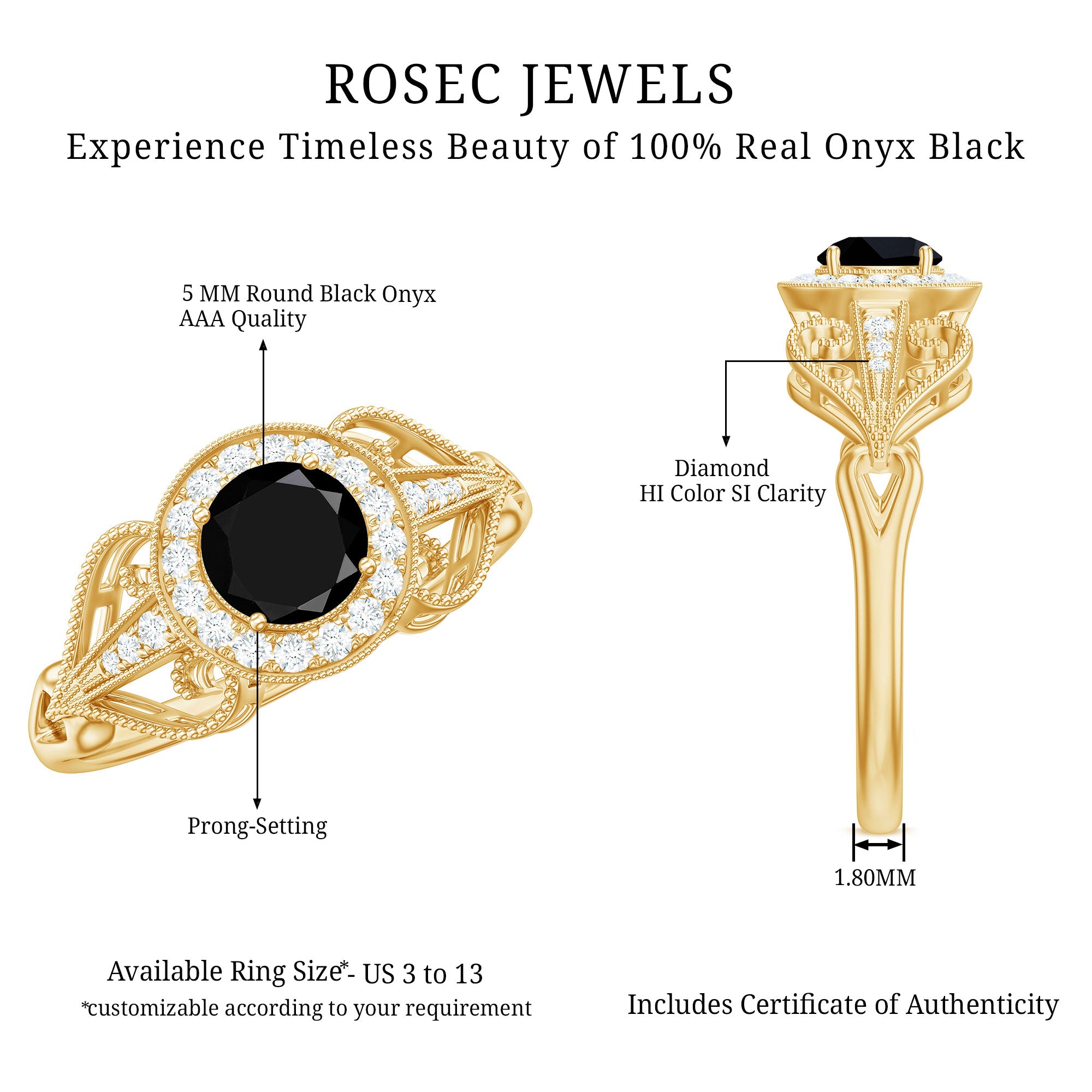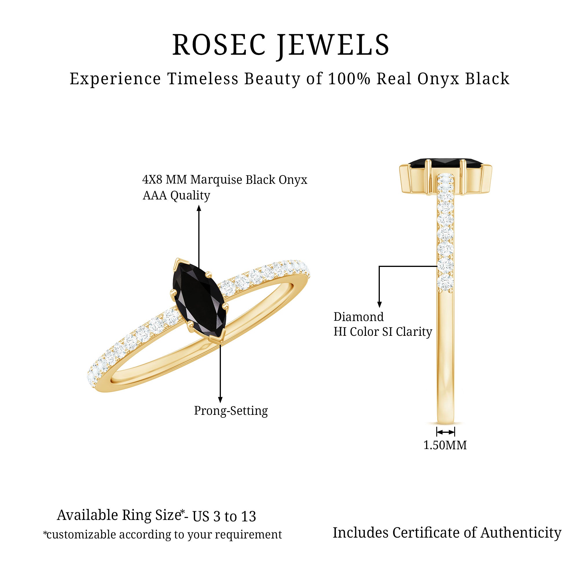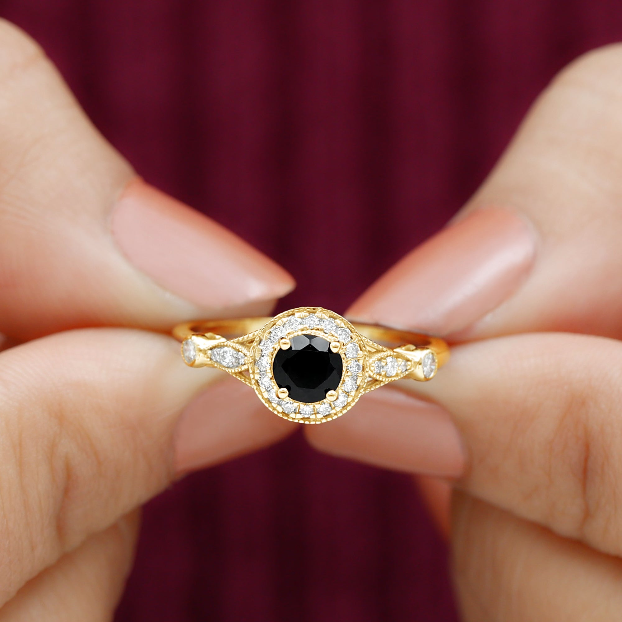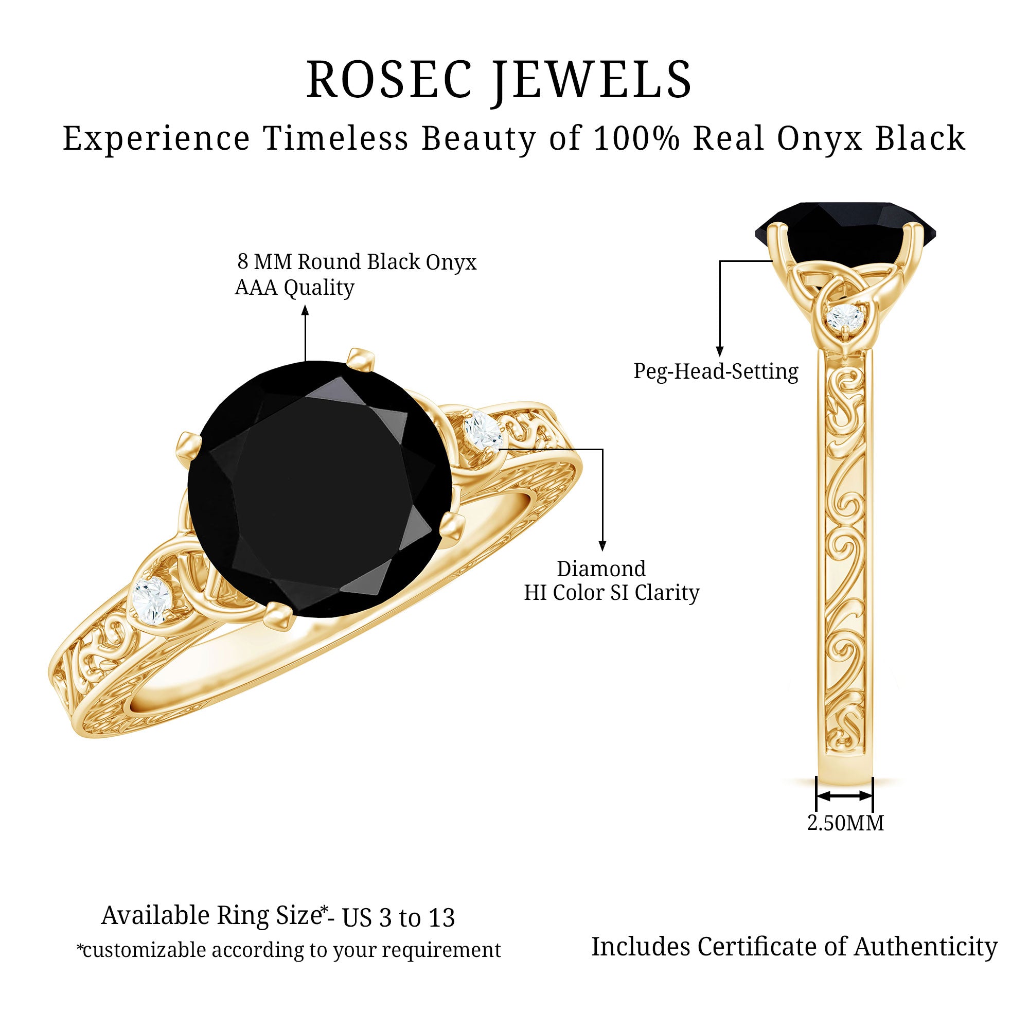 Alluring engagement ring styles are delicately crafted featuring the black onyx in variety of shapes ranging from round, oval, pear, marquise, cushion etc., and combining them with different gold colors. The gold onyx rings are curated only after assuring the 4 C’s of Black Onyx, our lapidarist are responsible for curating black onyx solitaire rings and vintage black onyx rings for engagement. Select from our onyx engagement rings for proposing your beloved and give her a chance to celebrate her happiness.