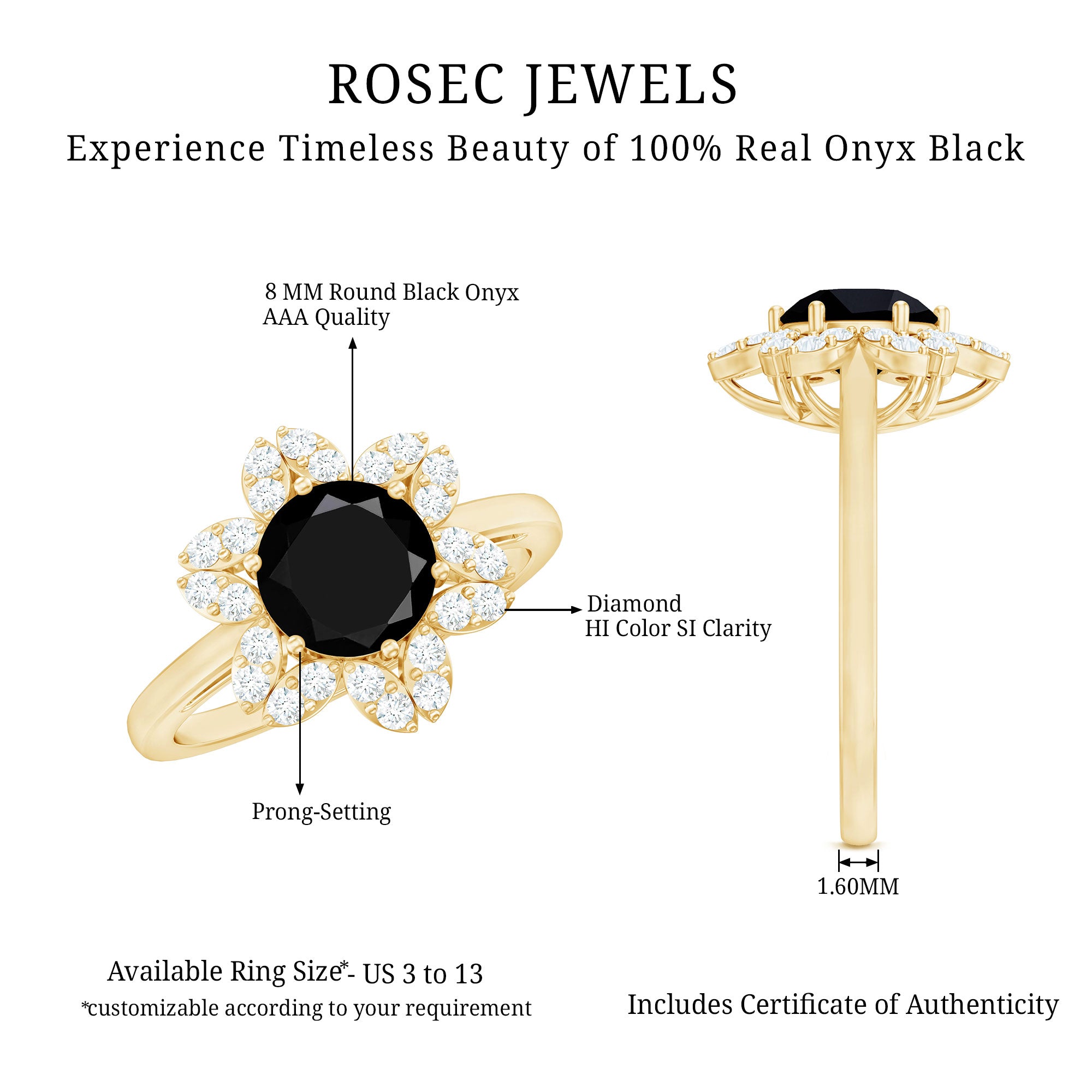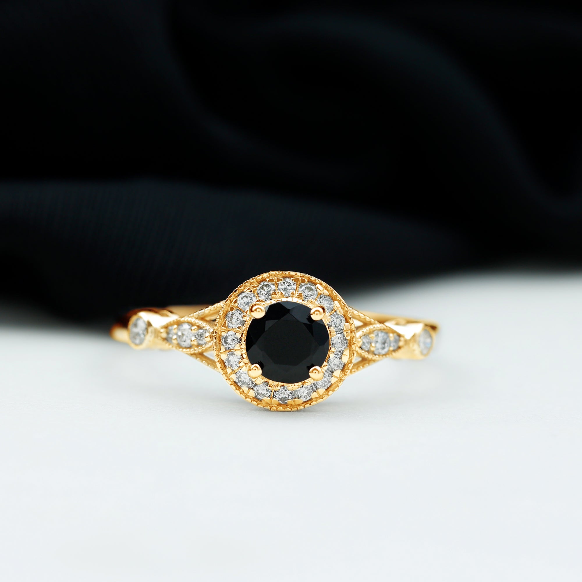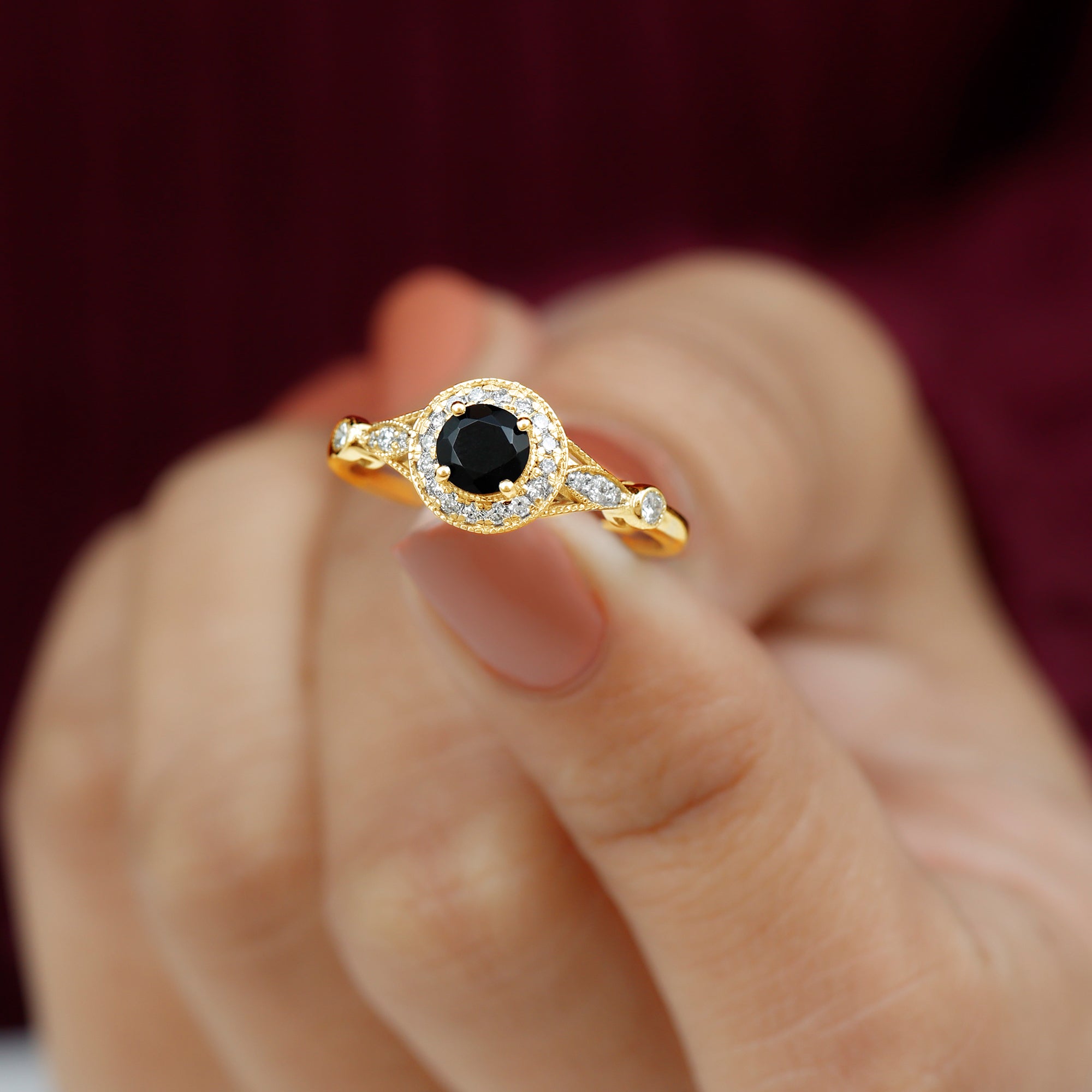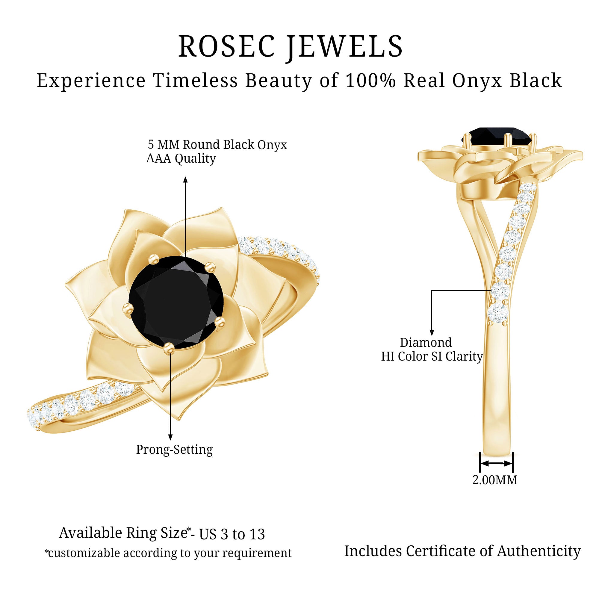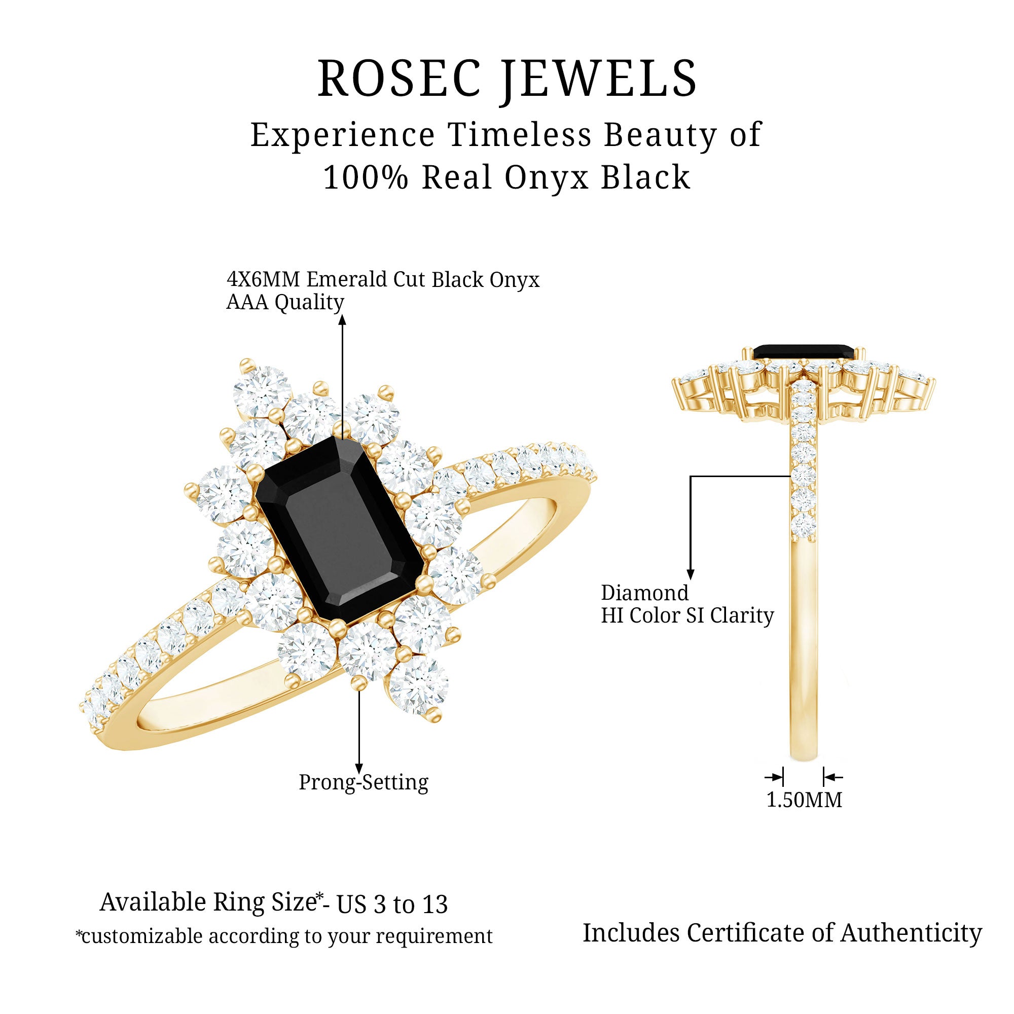 Alluring engagement ring styles are delicately crafted featuring the black onyx in variety of shapes ranging from round, oval, pear, marquise, cushion etc., and combining them with different gold colors. The gold onyx rings are curated only after assuring the 4 C’s of Black Onyx, our lapidarist are responsible for curating black onyx solitaire rings and vintage black onyx rings for engagement. Select from our onyx engagement rings for proposing your beloved and give her a chance to celebrate her happiness.