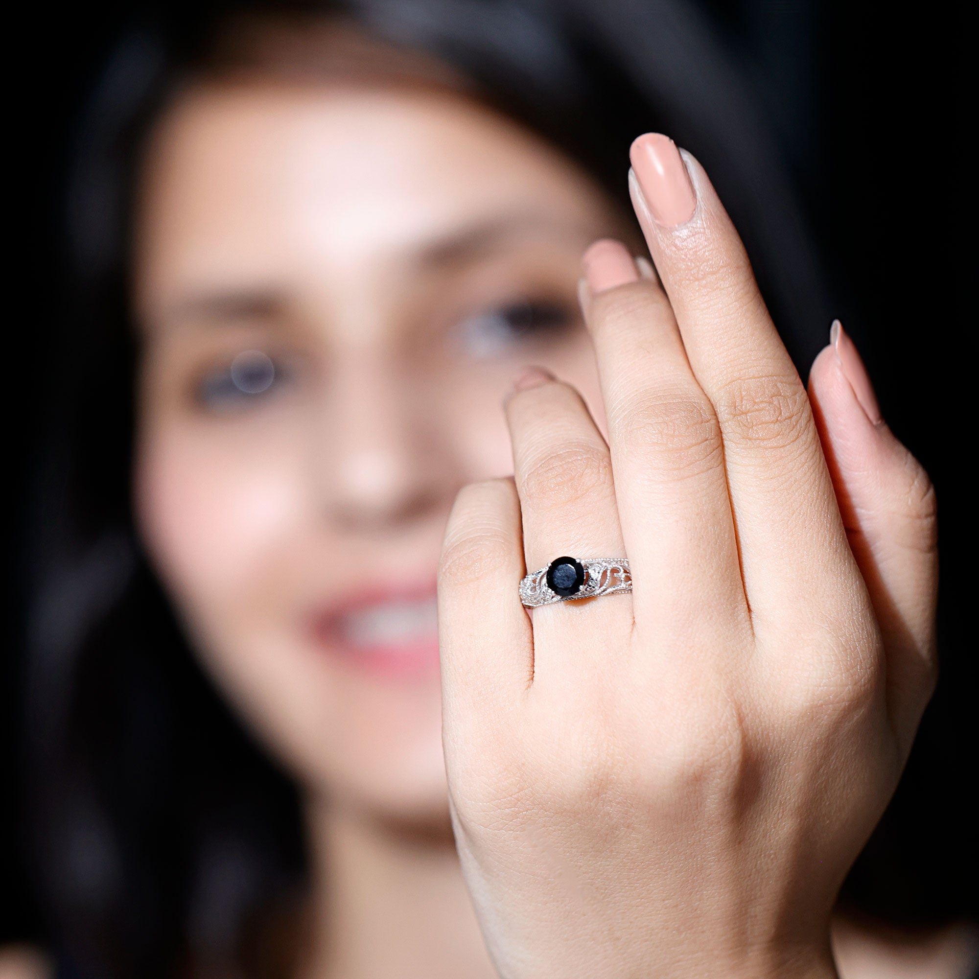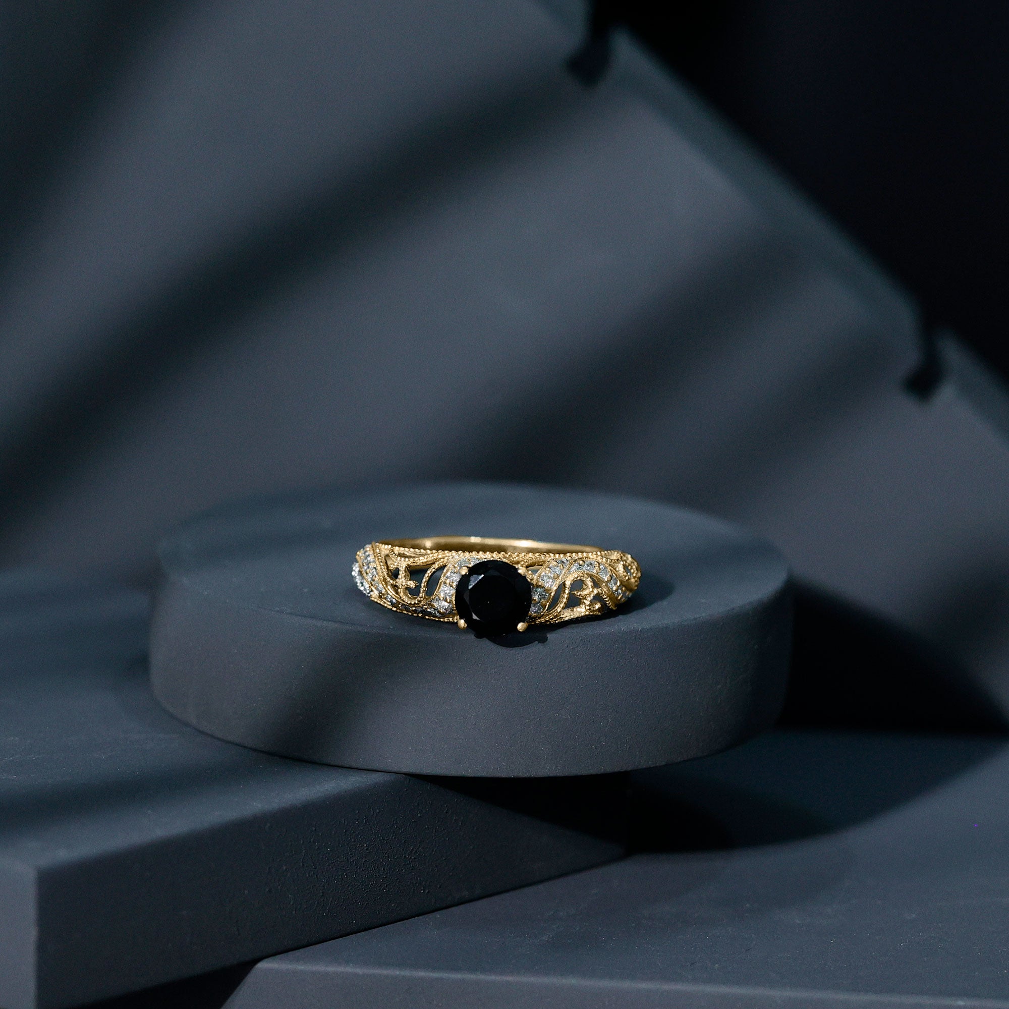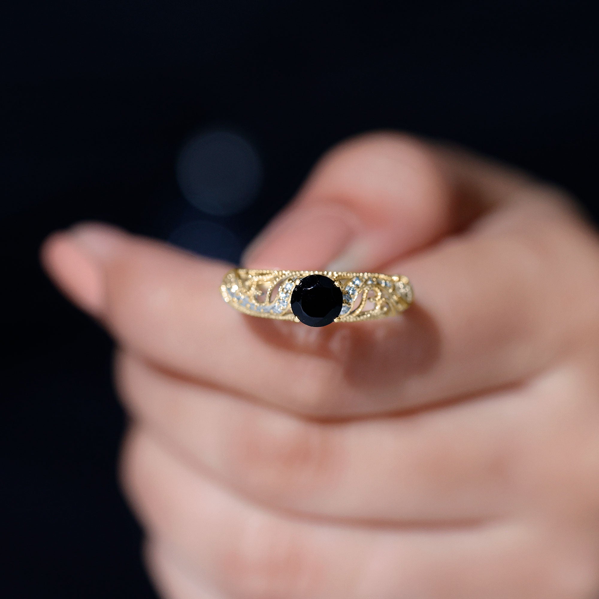 A Promise Ring highlights the Centerpiece of Black Onyx while staying understated. That’s because the size of Black Onyx here is a lot smaller (typically, around 4 mm or less). This ring style could incorporate elegant floral motifs, minimalist nature-inspired details, or accents of Diamond/Moissanite (without overdoing it). When presented, these Black Stone Rings insinuate a promise of togetherness and an intent to take the relationship to the next level.