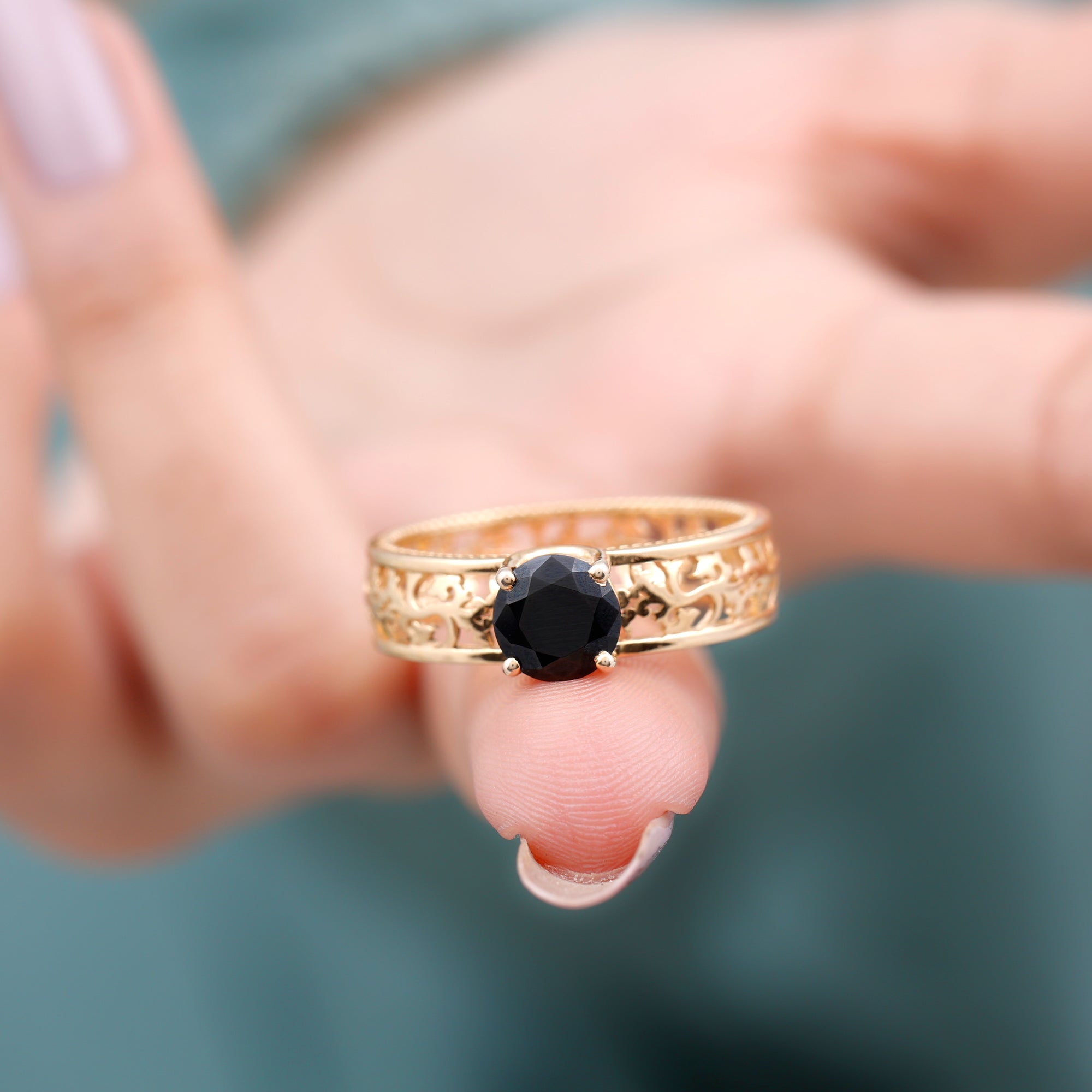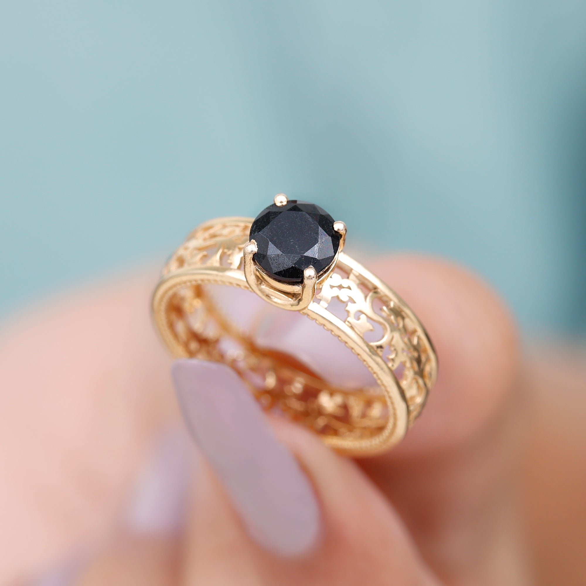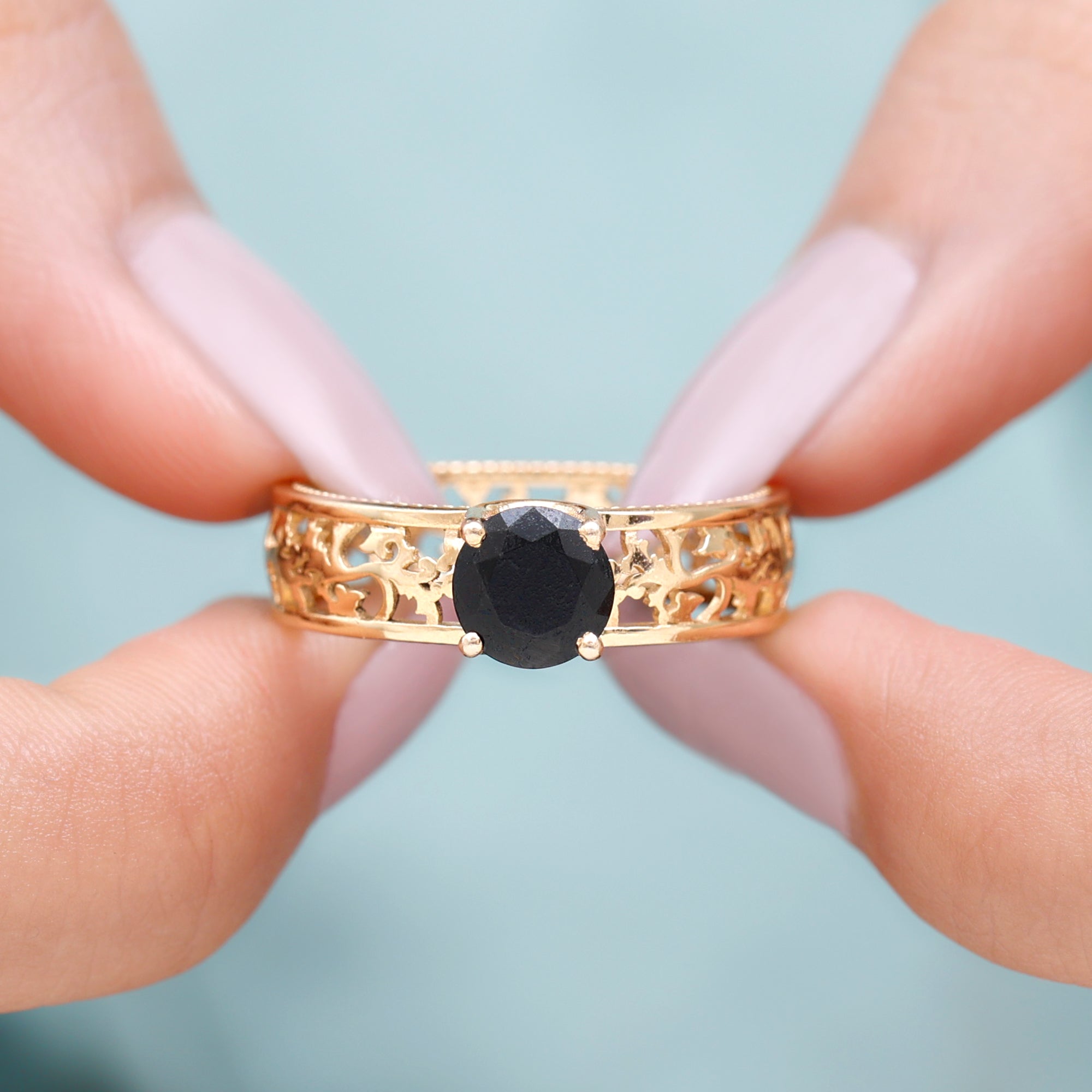 A Vintage-inspired Ring re-incarnates the designs that were significant back in Art Deco, Edwardian, and Victorian Eras. This Antique Black Onyx Ring features filigree, milgrain, and other old-school engravings. It is best complemented by the bold centerpiece of Black Onyx that helps it look like a fashion-forward retro ring. (Talk about mix n match!)