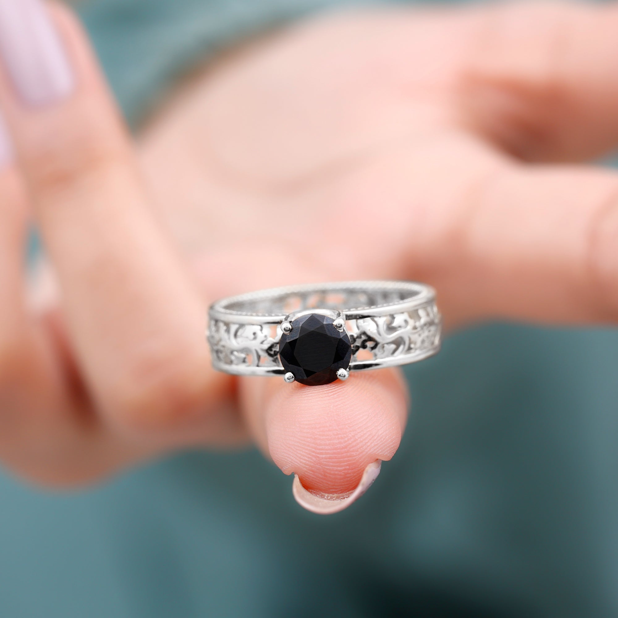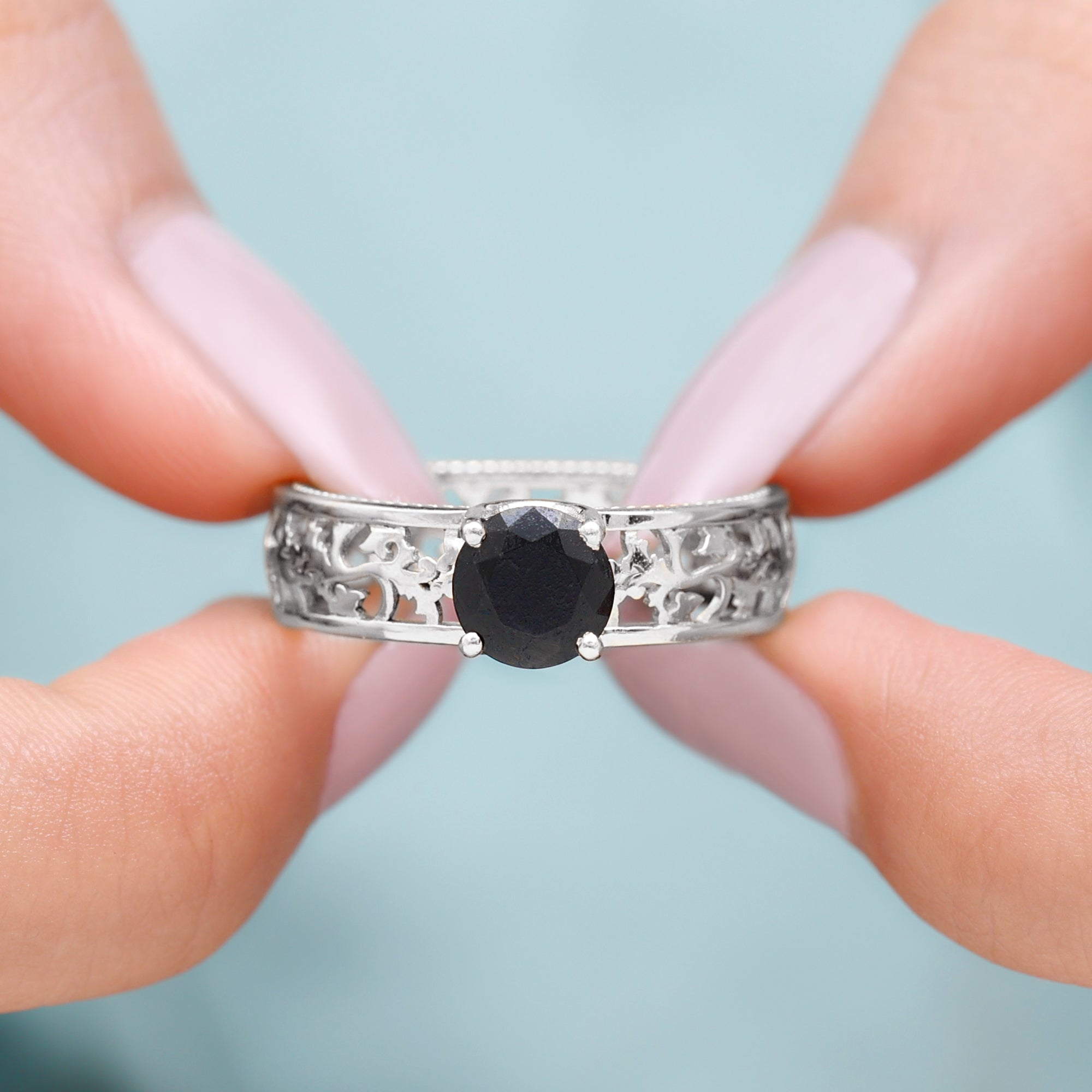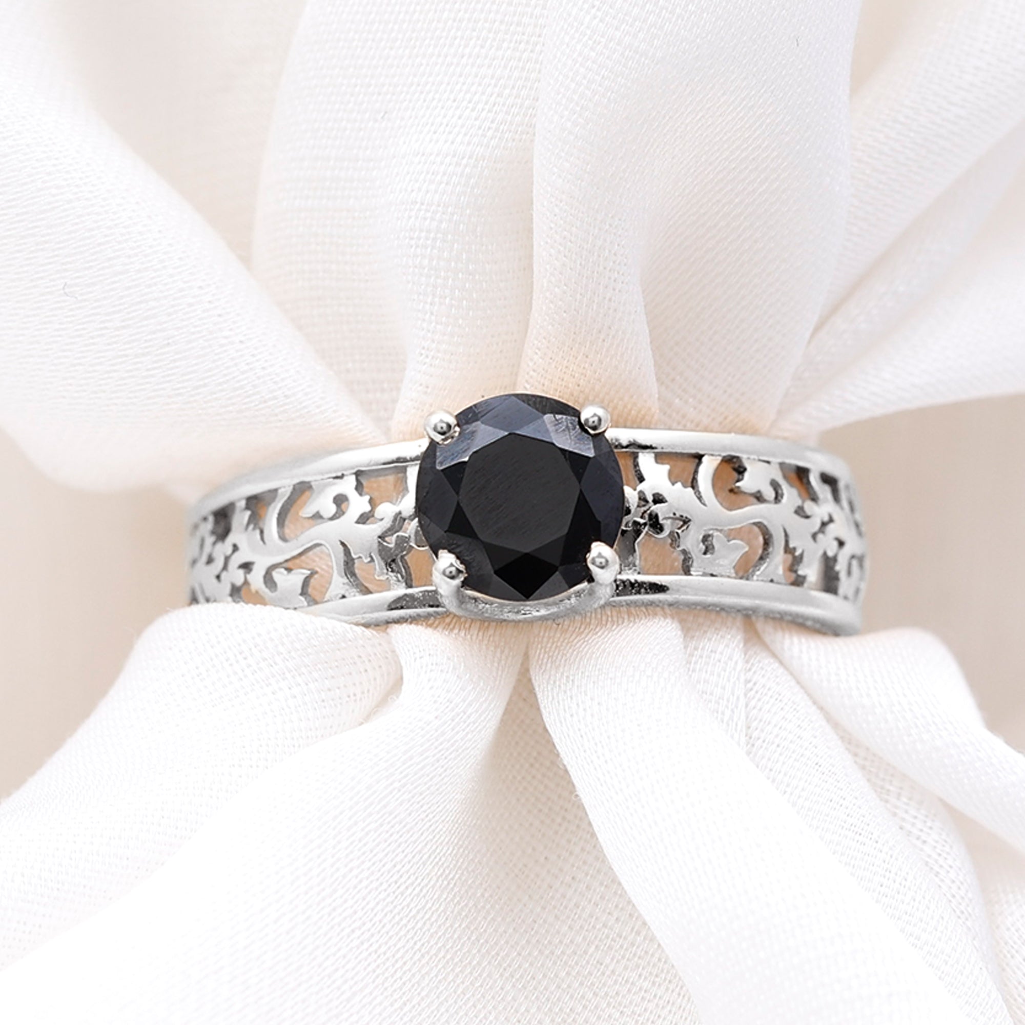 A Promise Ring highlights the Centerpiece of Black Onyx while staying understated. That’s because the size of Black Onyx here is a lot smaller (typically, around 4 mm or less). This ring style could incorporate elegant floral motifs, minimalist nature-inspired details, or accents of Diamond/Moissanite (without overdoing it). When presented, these Black Stone Rings insinuate a promise of togetherness and an intent to take the relationship to the next level.