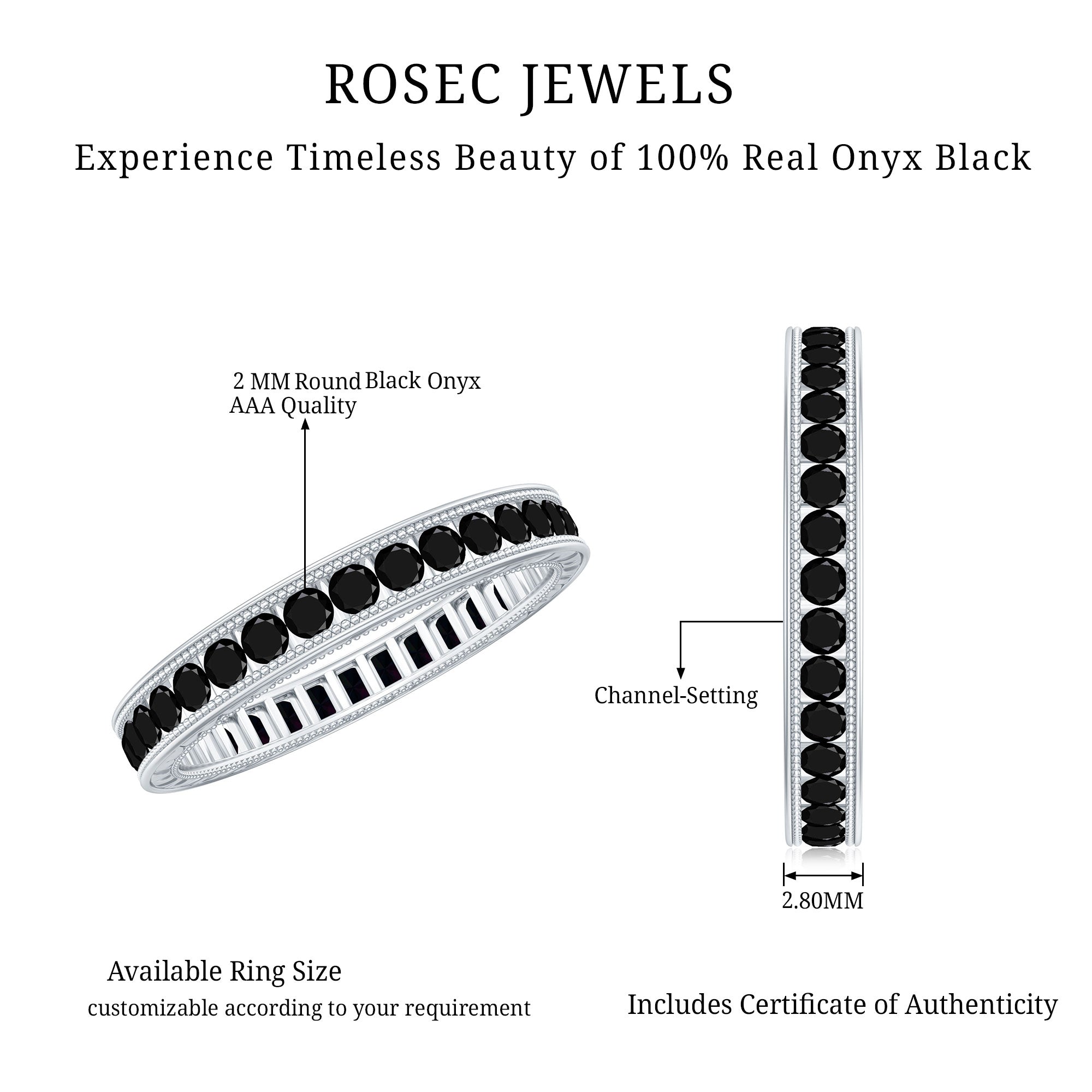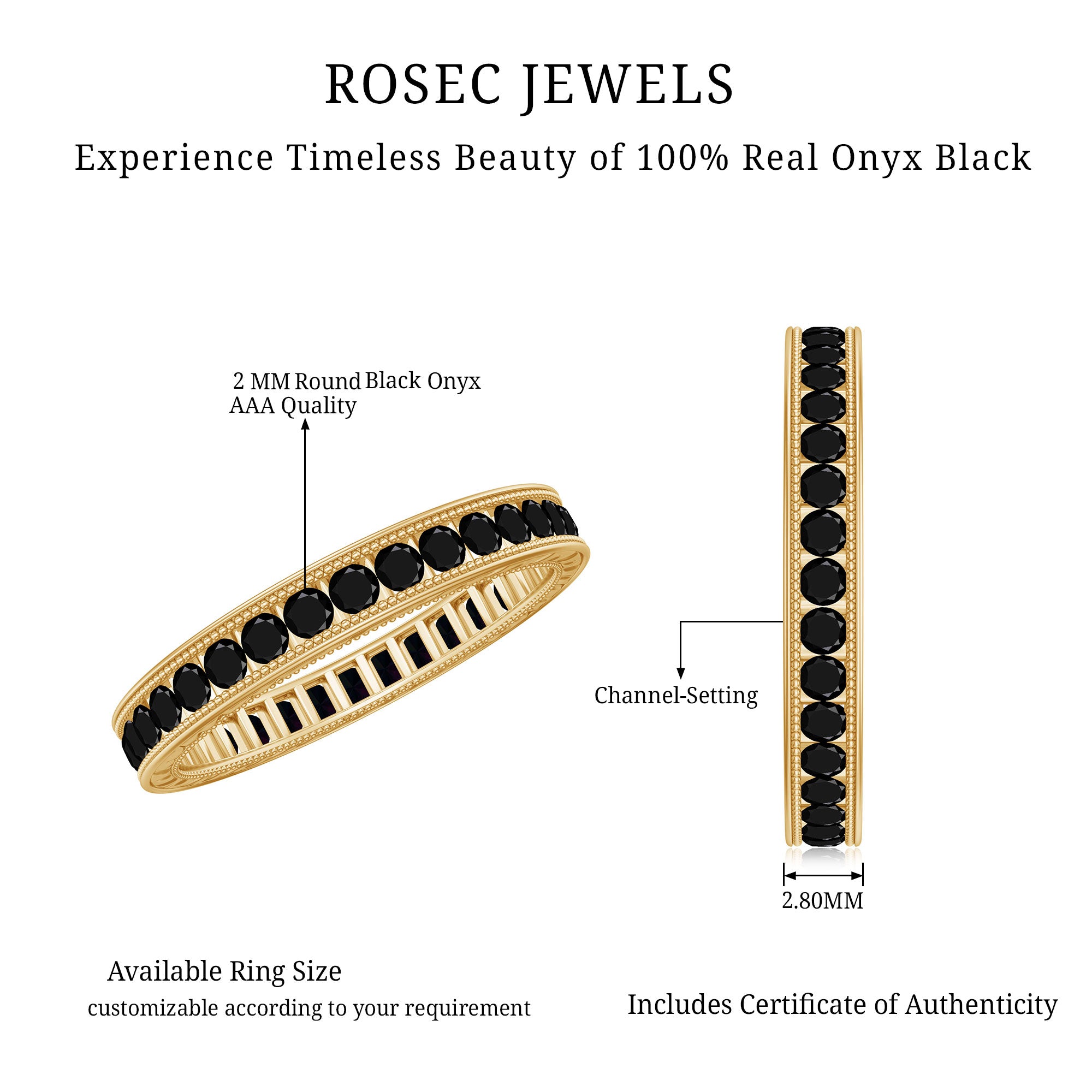 - Color: Black onyx is found in nature either as slightly translucent or fully opaque with the signature black color adored in onyx wedding rings.