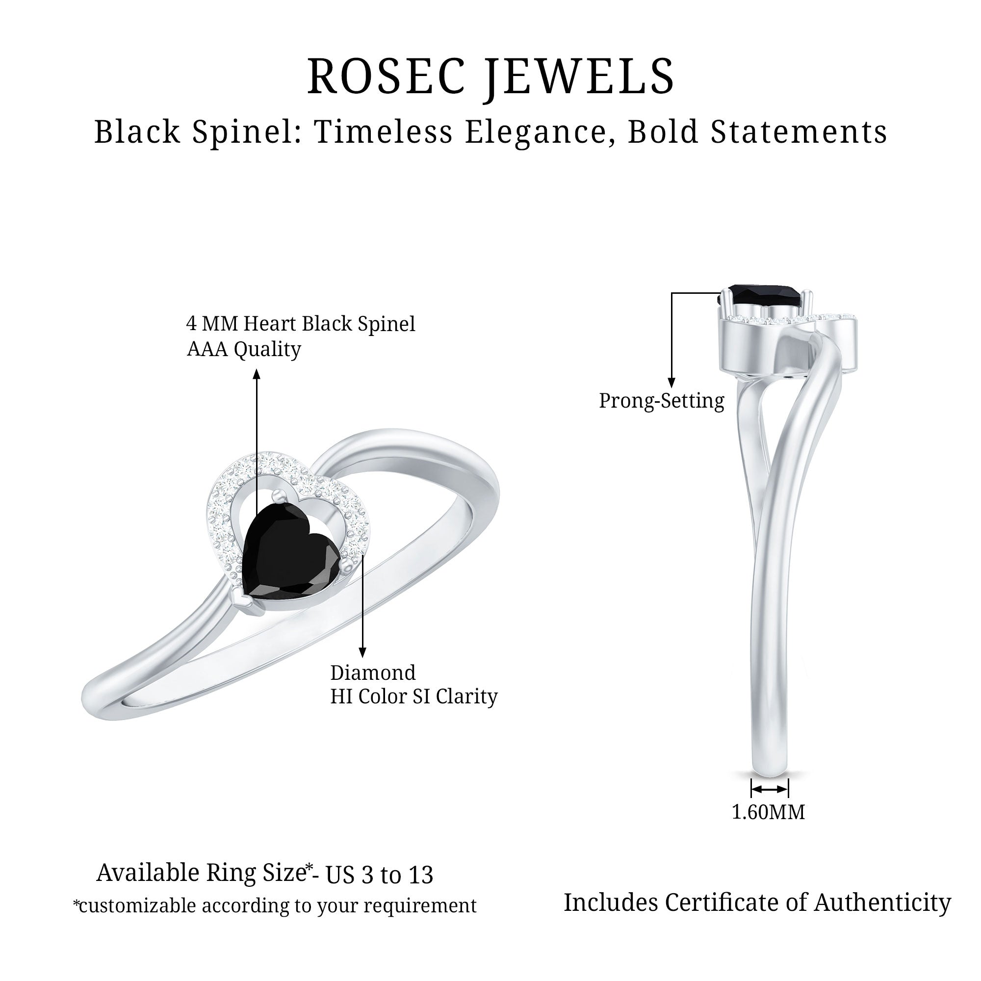 A Black Spinel Promise Ring might insinuate a specific meaning but it isn’t confined to a specific style. It can range from a Simple Solitaire Ring that exudes an understated aesthetic with a size of 4 MM or even less. Or for an exquisite visual appeal, be ornately detailed with nature-inspired designs, flower, and infinity motifs, or sparkling accents of Diamond/Moissanite. Behind that, it reflects upon the promise of eternal commitment (that usually precedes an engagement).