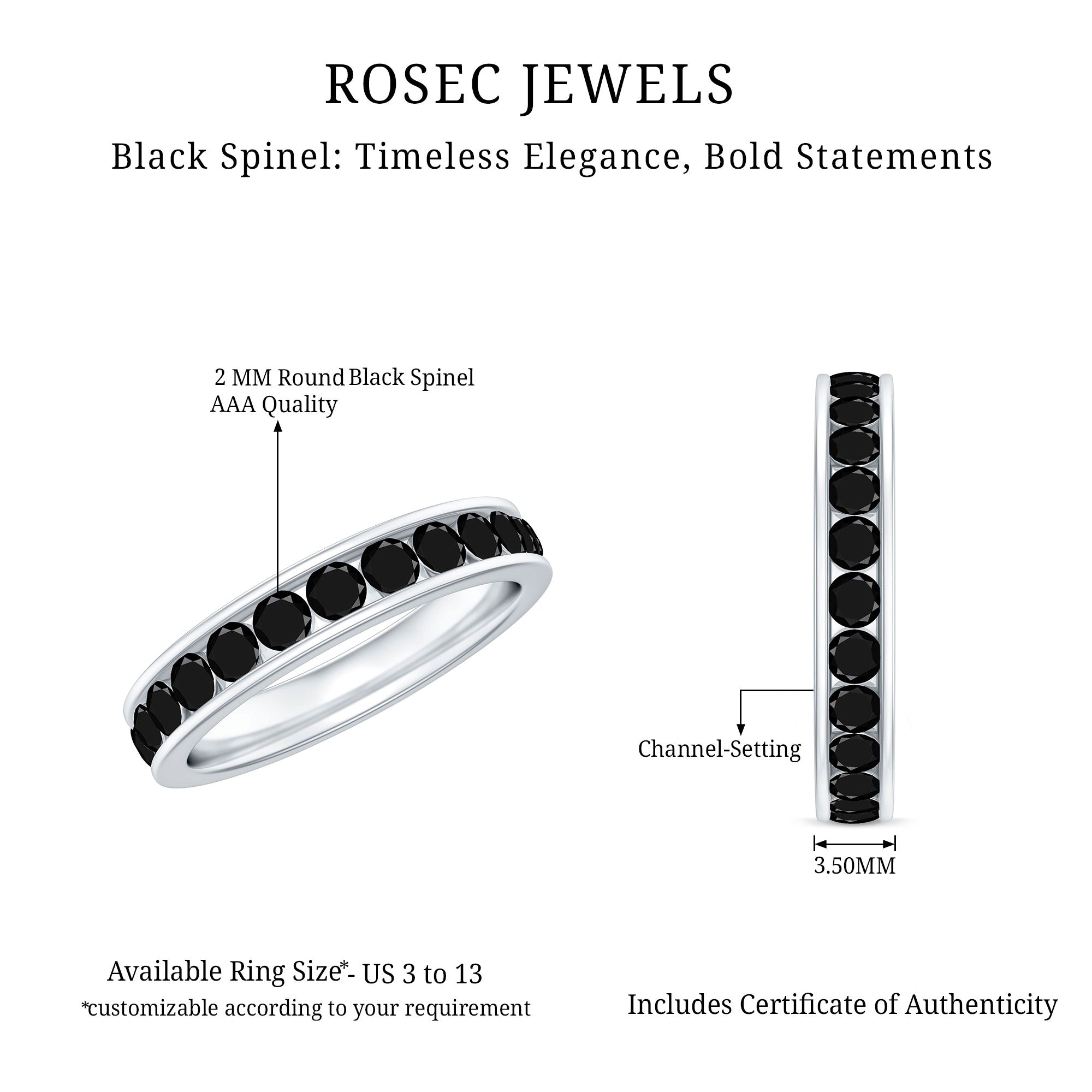 Black Spinel registers a fairly durable hardness rating of 8 out of 10 on Mohs Scale. That makes it highly resistant to regular wear and tear. So be it a Black Spinel Eternity Ring or the one fashioned in the Classic Solitaire Style, you can wear it everyday.