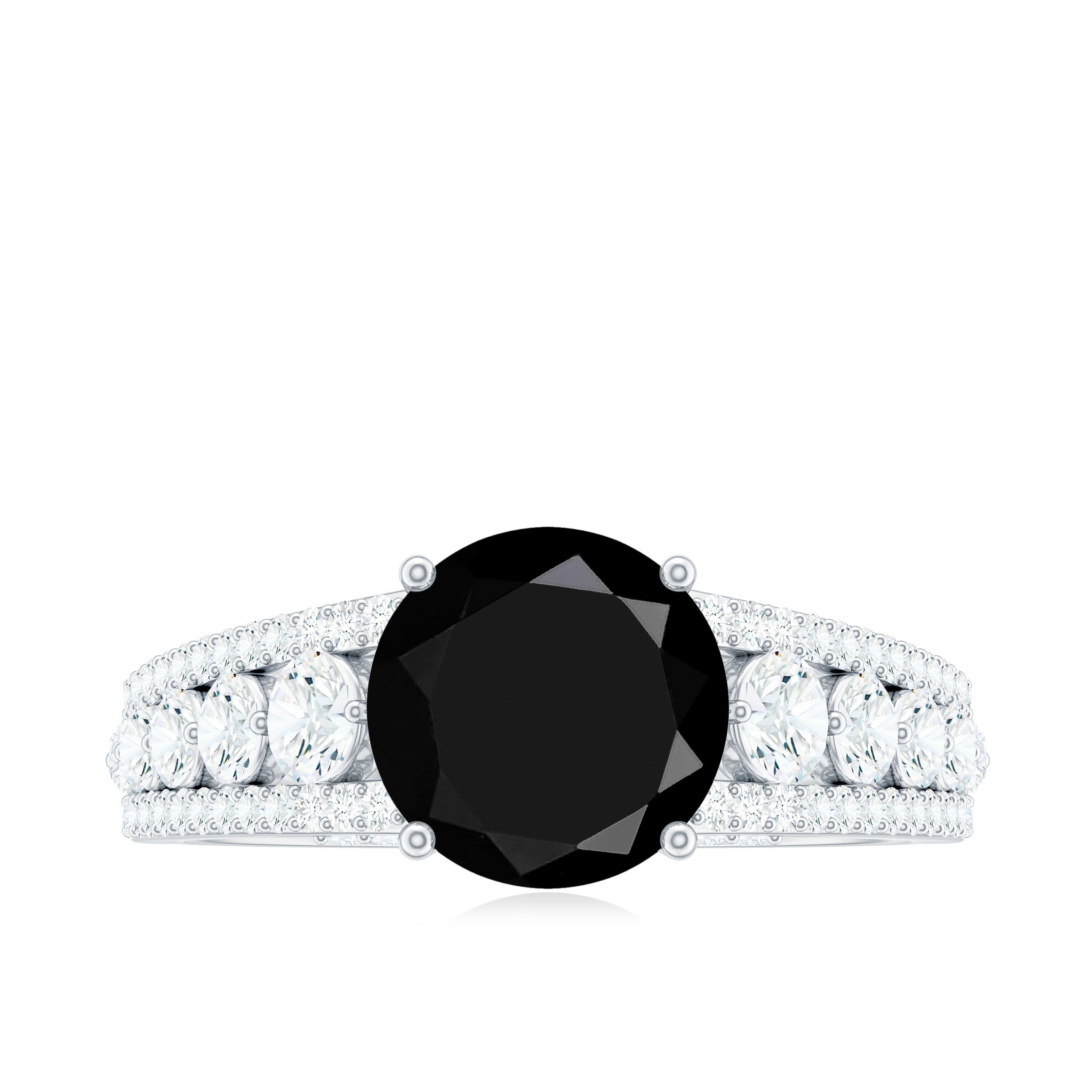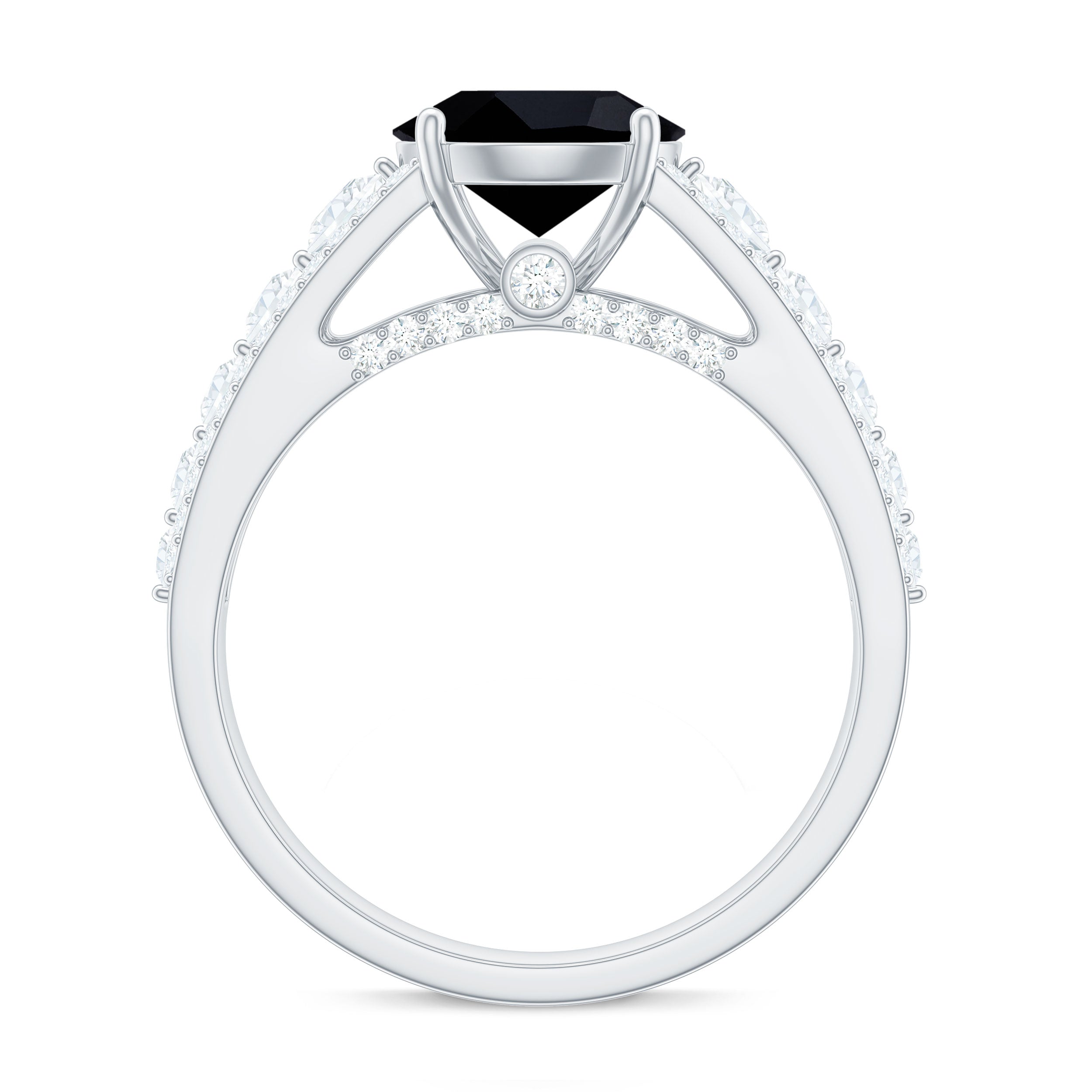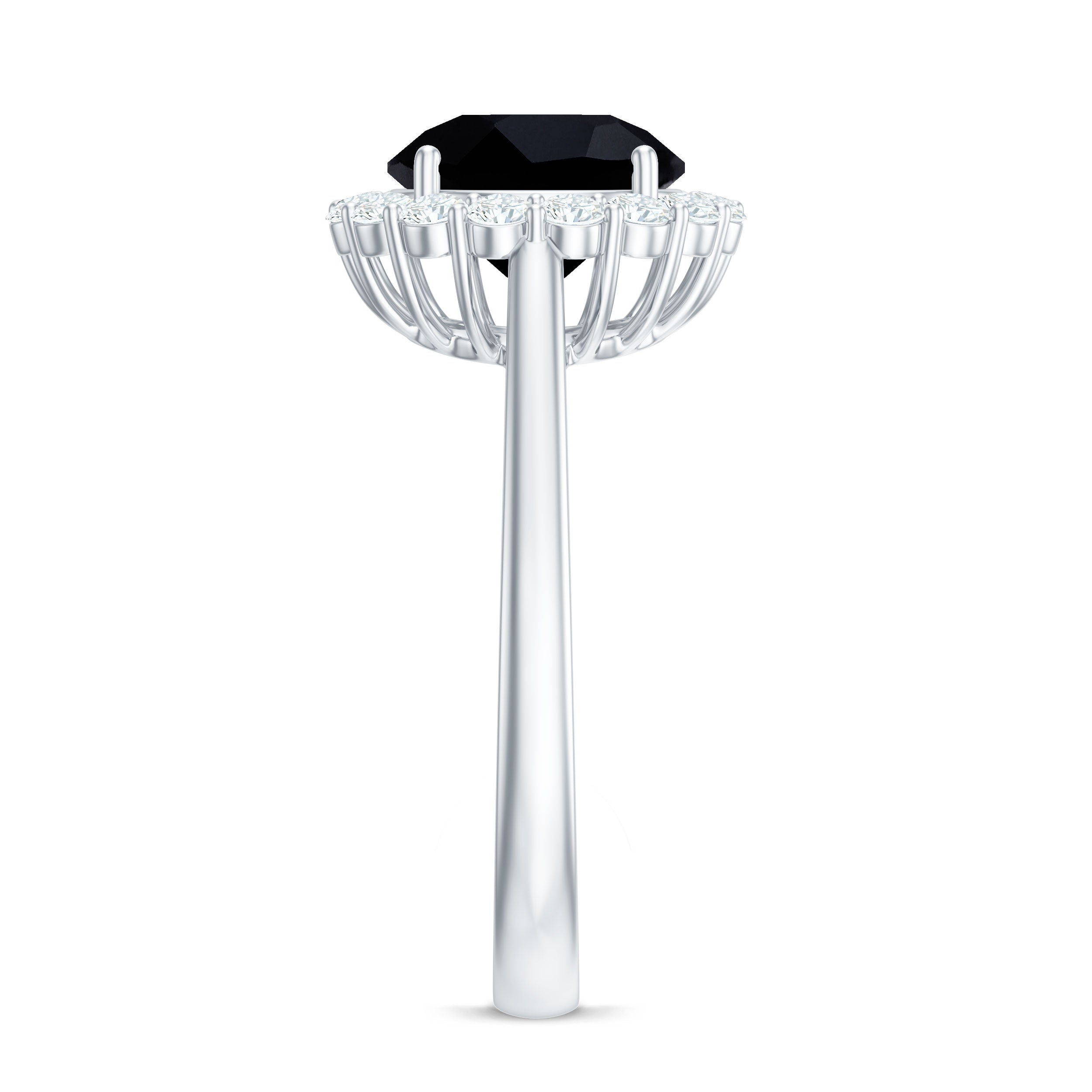 Lending an interesting visual appeal to the Black Spinel Solitaire Ring, a Halo encircles the Black Spinel with a parade of diamond/moissanite. The best part about a Halo is that it rewards more personality as well as an illusion of a larger-looking size to your Black Spinel. So, it is a unique blend of classic and flashy. That makes it another popular choice of the Black Spinel Engagement Ring.