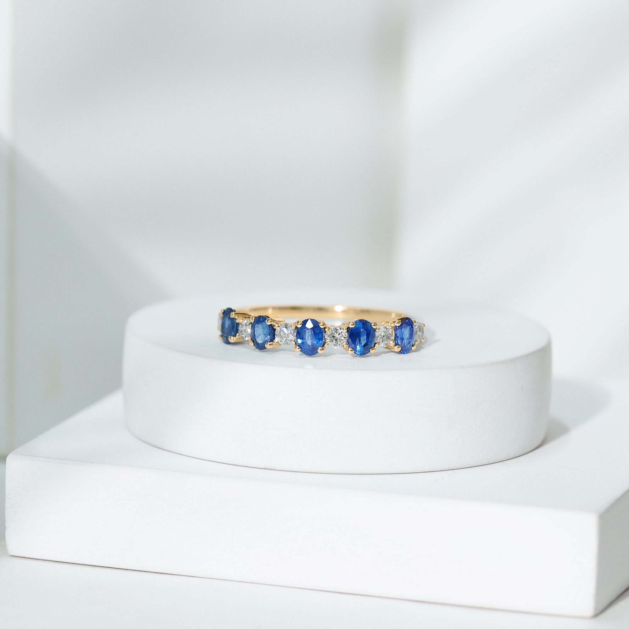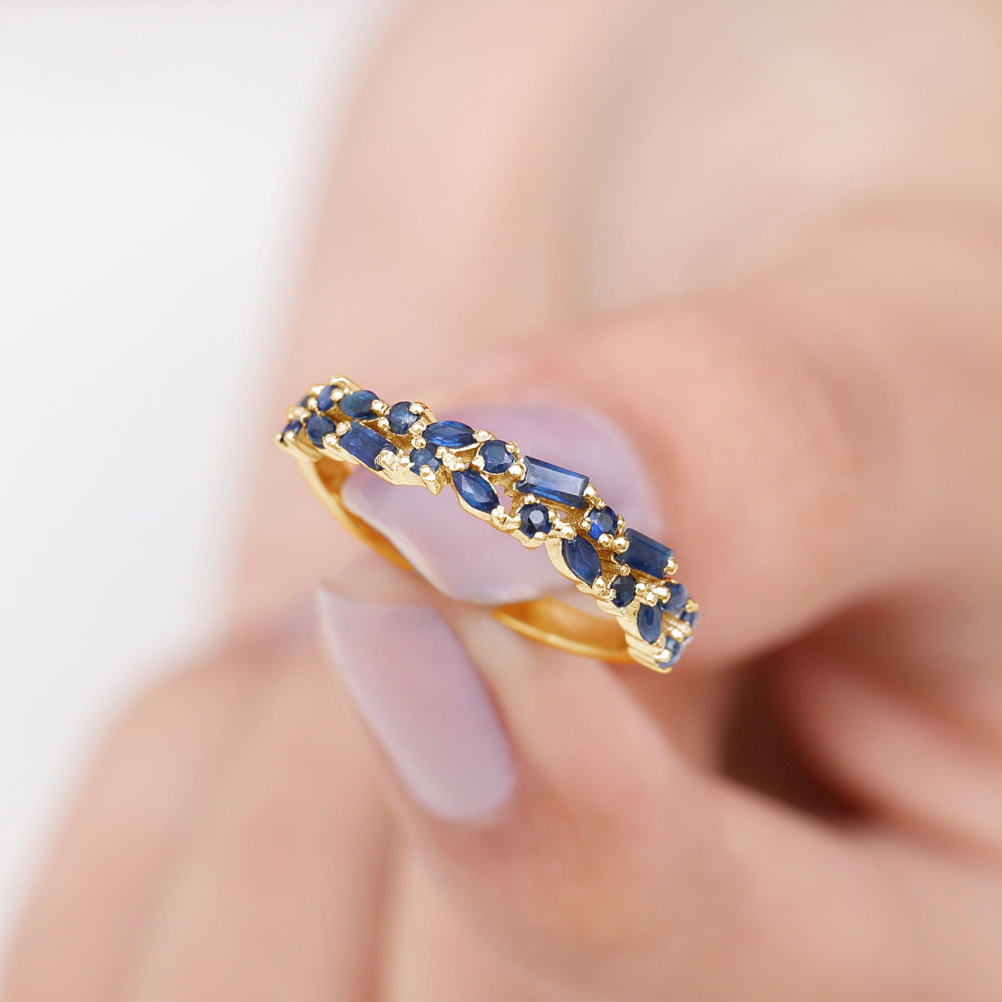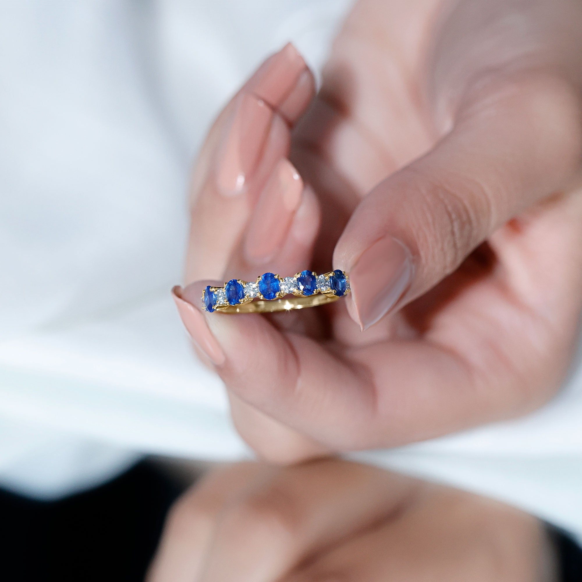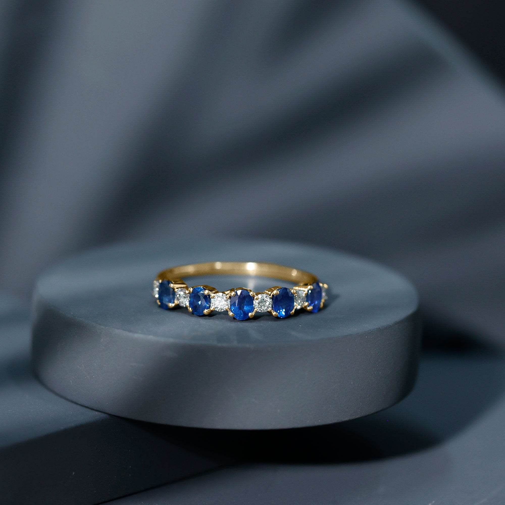 Half Eternity Wedding Bands: - Eternity bands fill one's relationship with lots of love, affection, and warmth. Out of all the eternity wedding bands, our blue sapphire half-eternity bands are the most popular. Each ring is a stunning piece, either secured in a prong or bezel setting to keep the gemstone on place.
