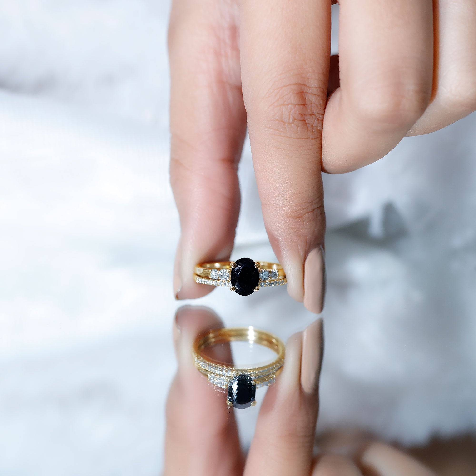 Bridal sets come in various designs, from ornate filigree to contemporary minimalist forms, to fit every couple's preferences and personalities. The identical bands give the finger a seamless appearance, highlighting the unity of the couple's commitment.