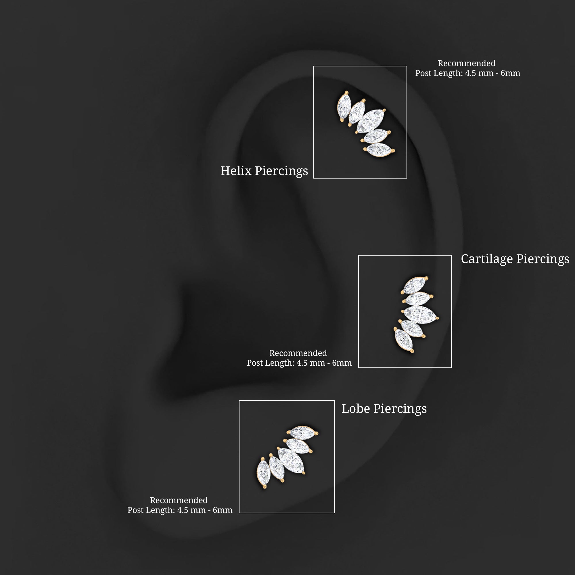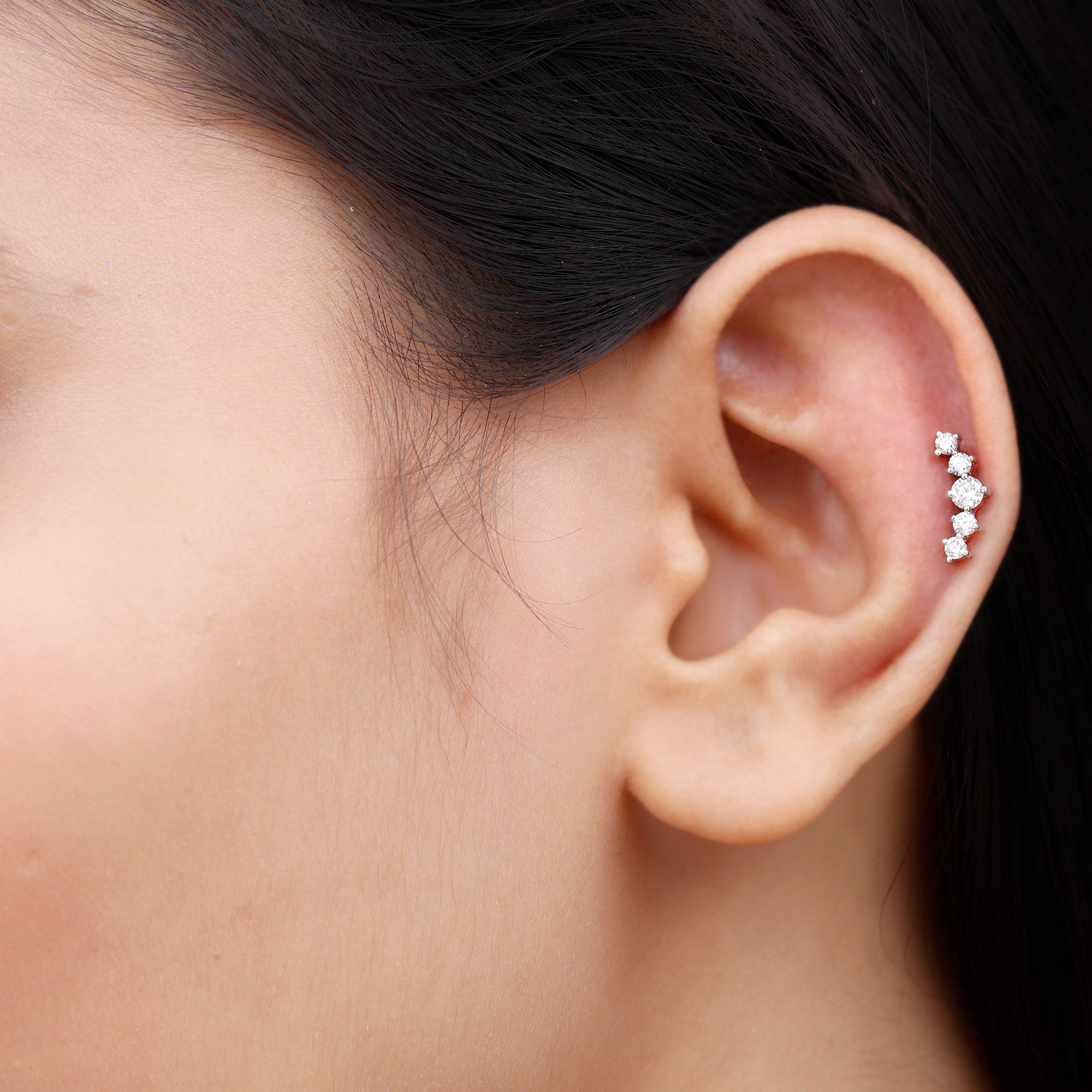 • Curved Cartilage Earrings: Ear climbers & crawlers are one of the trending styles. These ear climbers studded with sparkling diamonds or colored gemstones are truly irresistible. Ear cuffs and climbers are statement pieces that never fail to make a unique statement. If you are fashion-forward, they are must-haves in your jewelry collection.