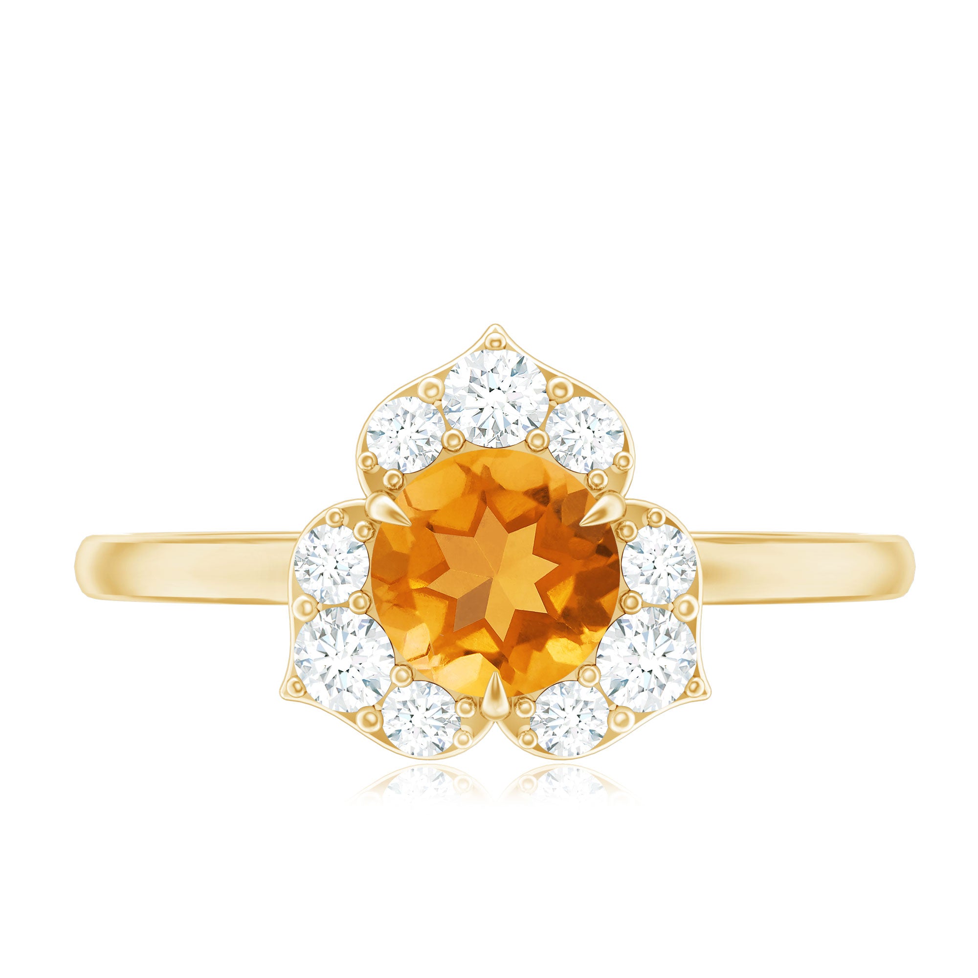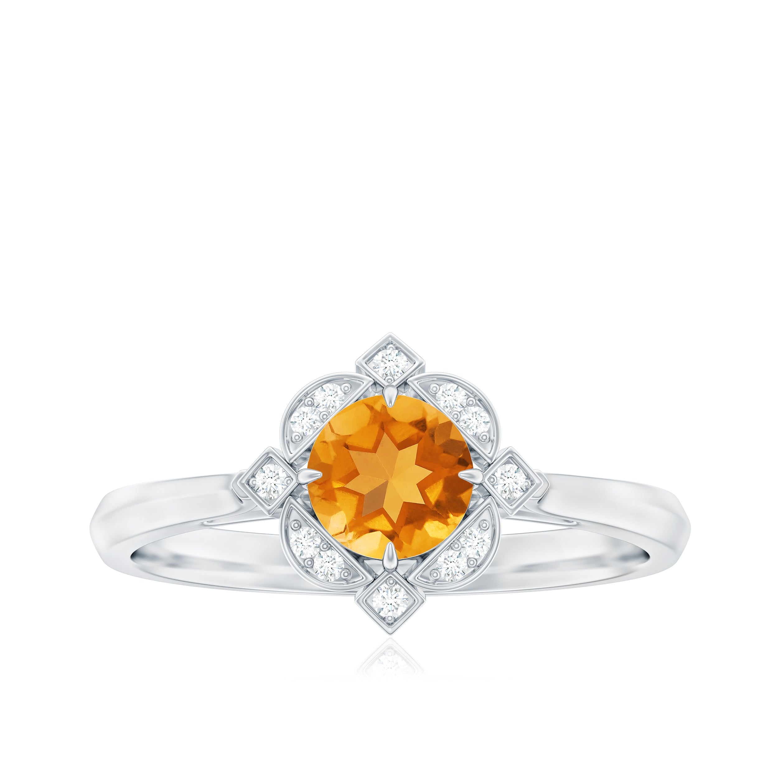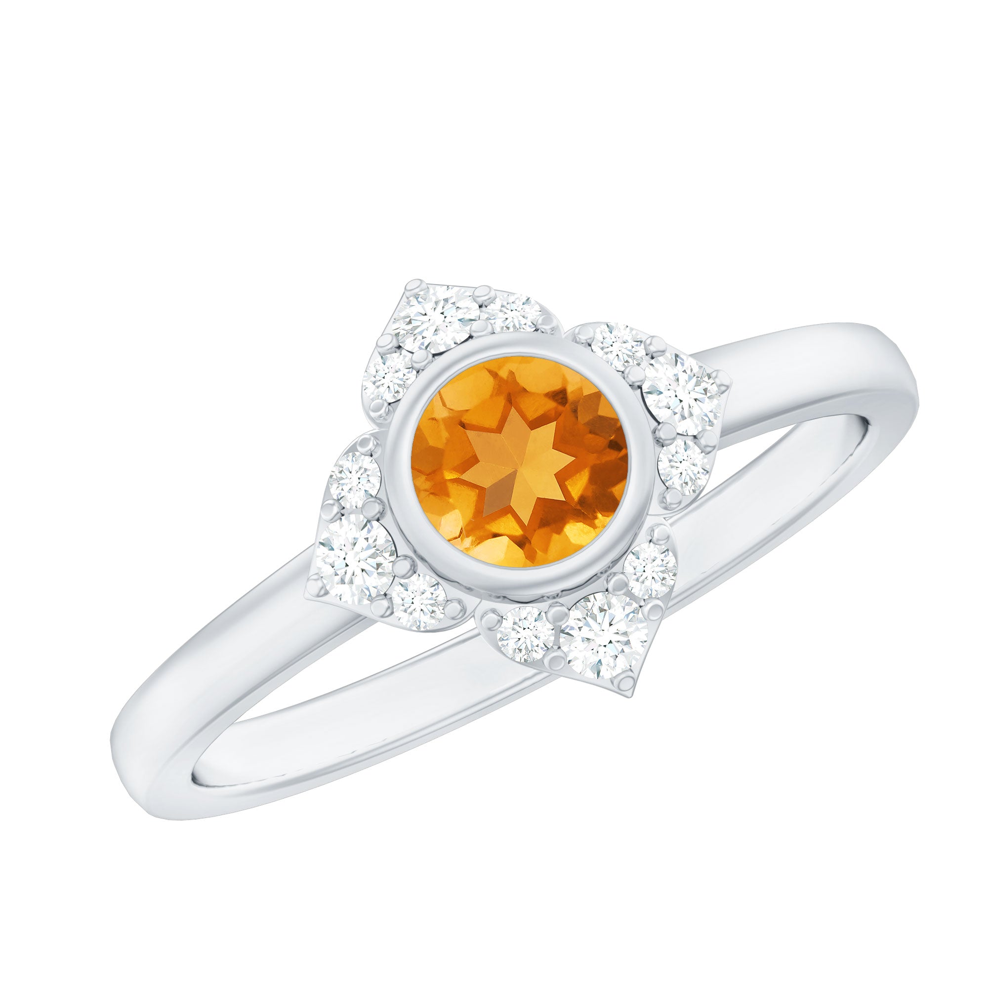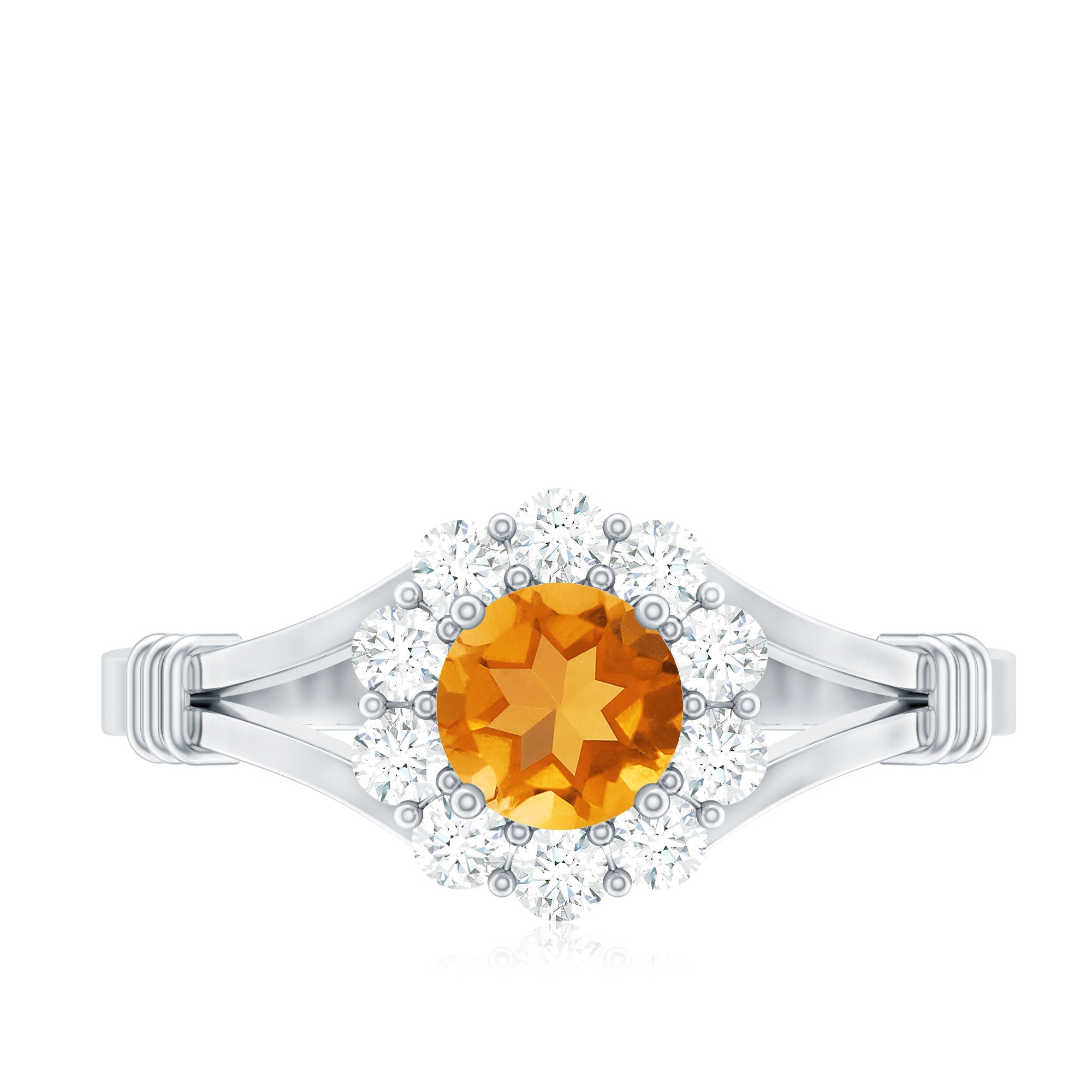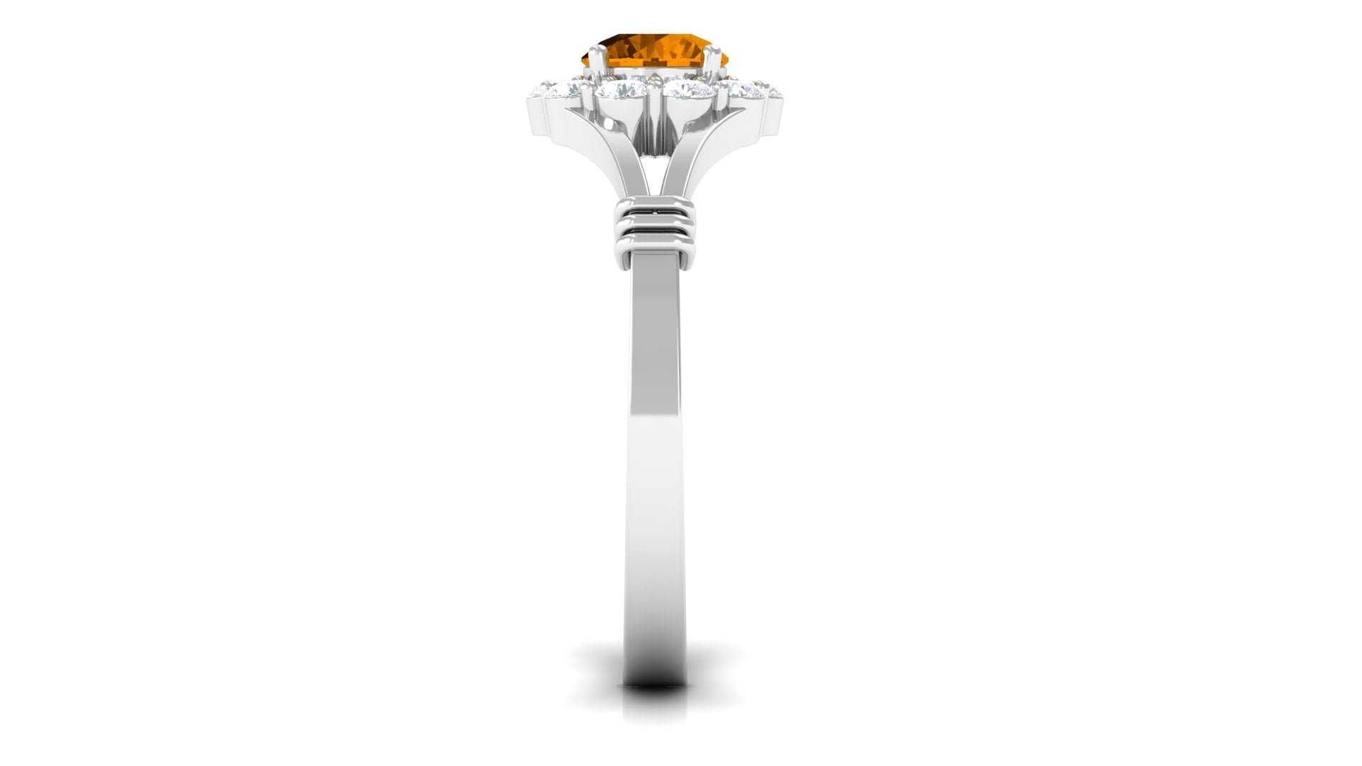 Features a citrine stone, that is a focal point, and small shimmery diamonds add an extra layer of shine & sparkle to the citrine centerpiece. The halo accent enhances the beauty and brilliance of the gem.