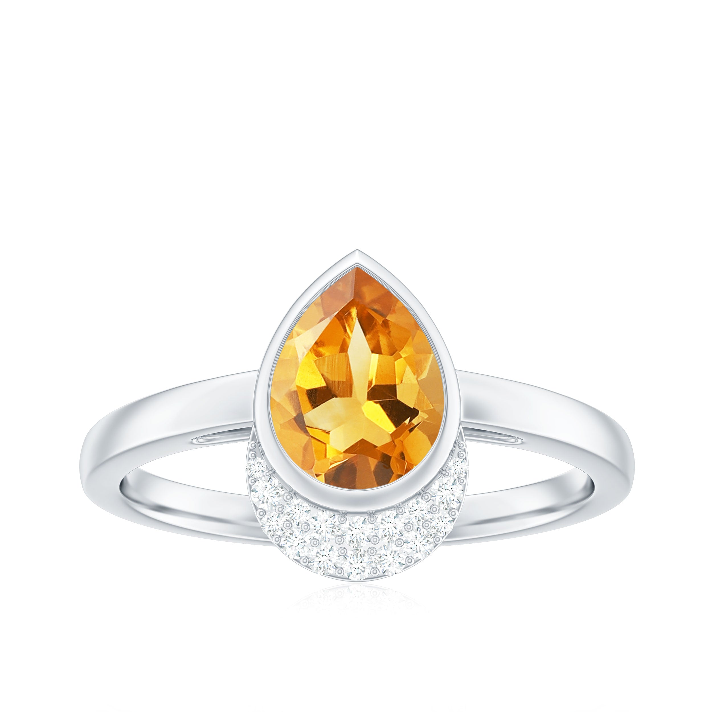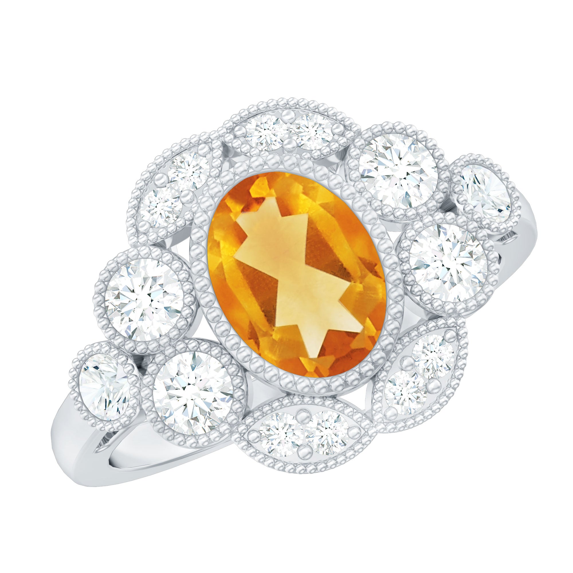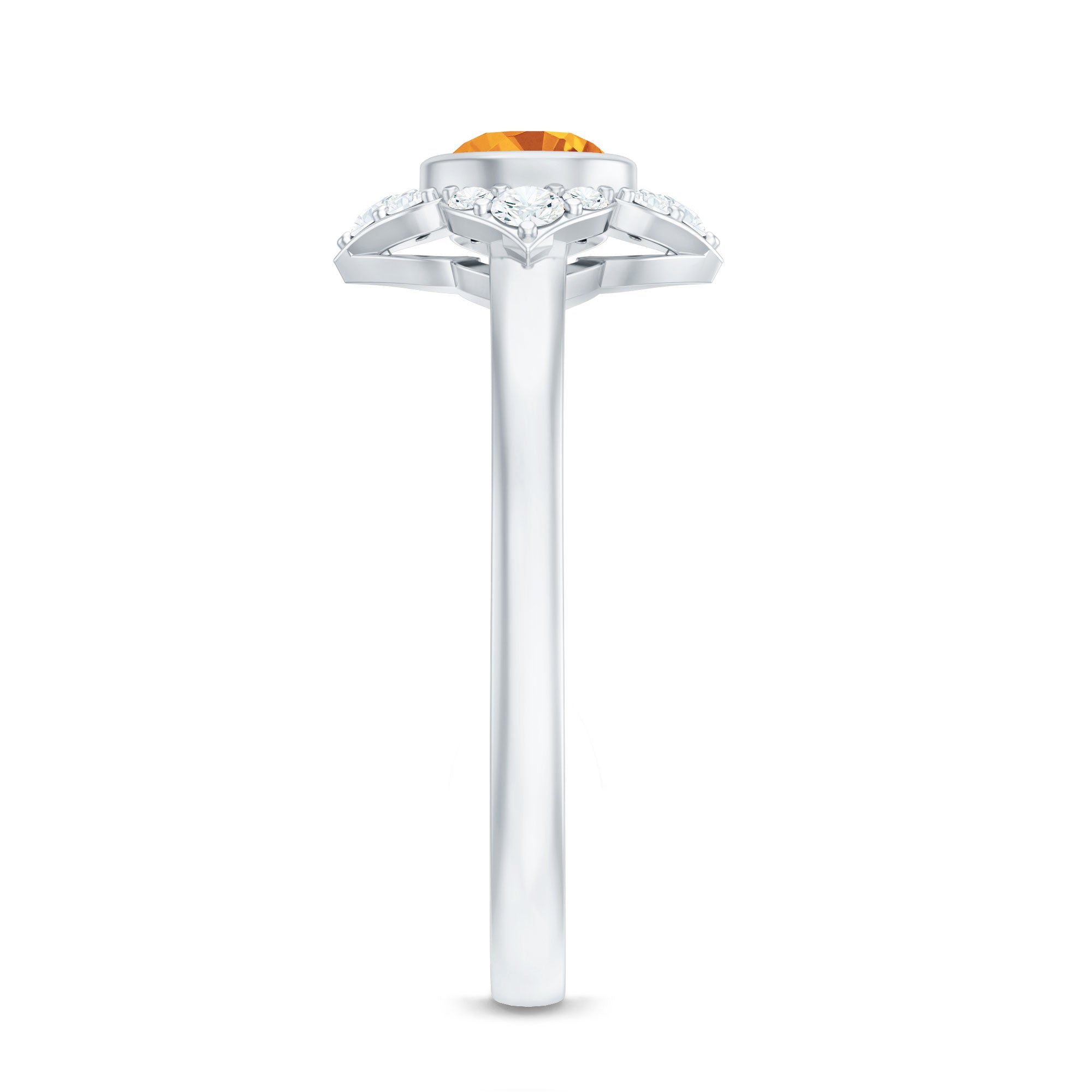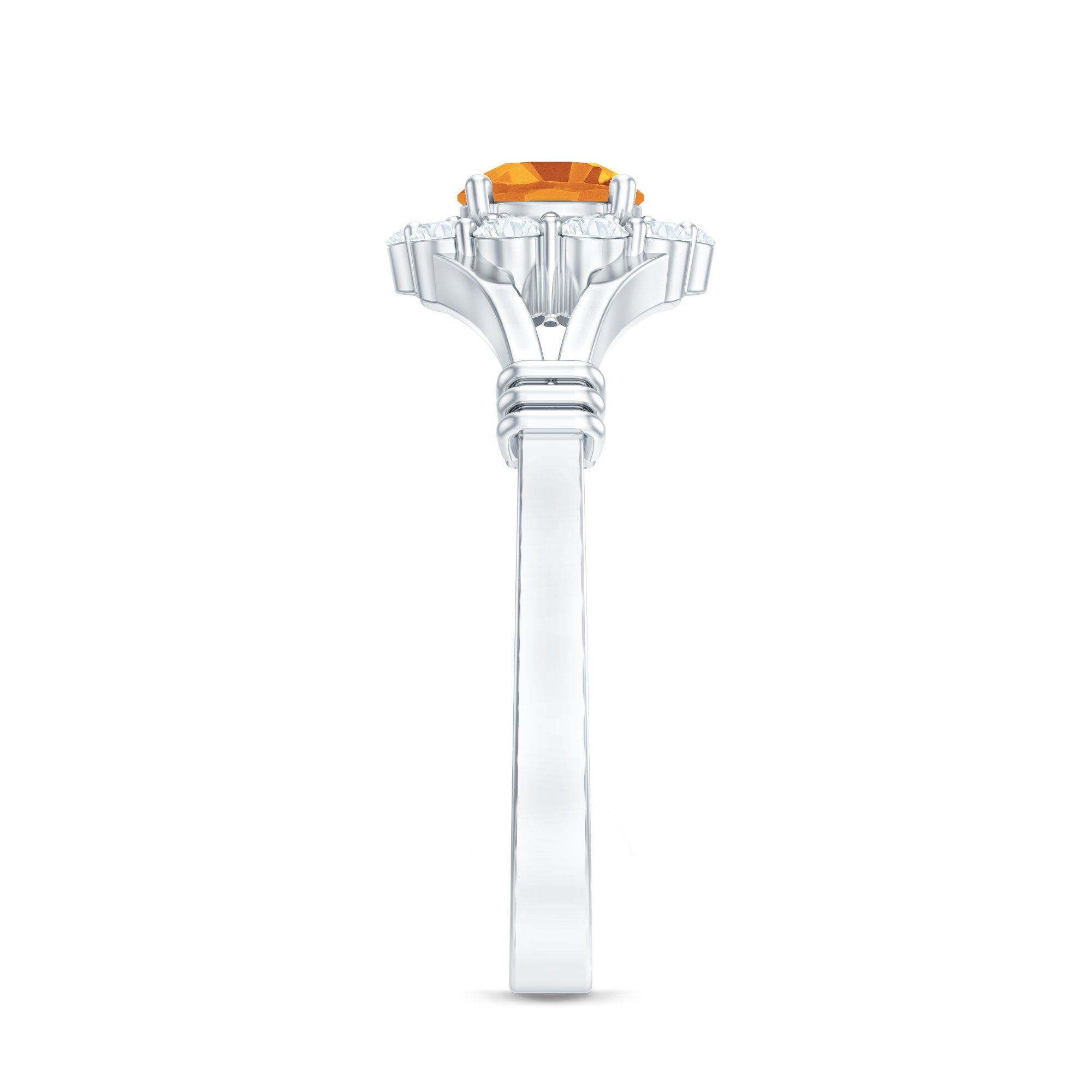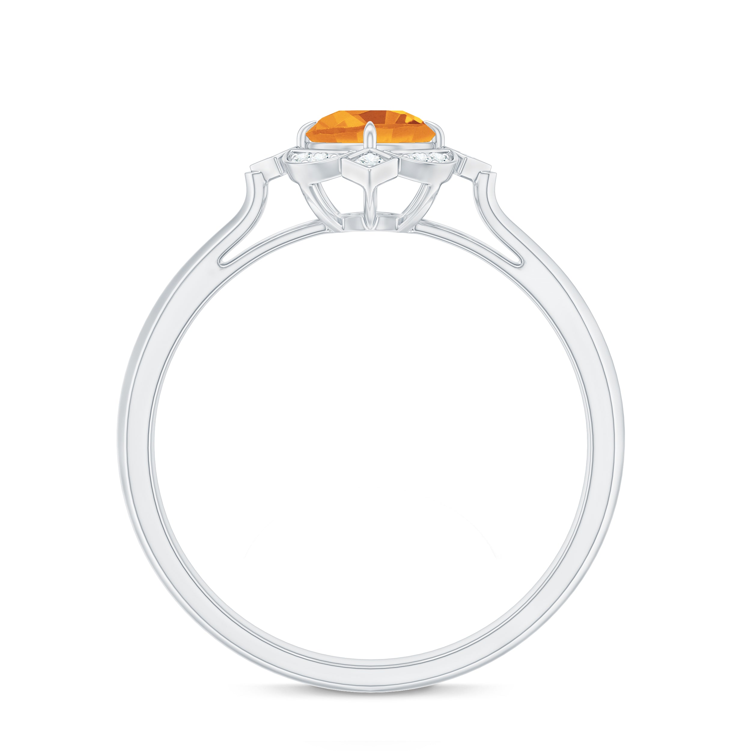 Features a citrine stone, that is a focal point, and small shimmery diamonds add an extra layer of shine & sparkle to the citrine centerpiece. The halo accent enhances the beauty and brilliance of the gem.