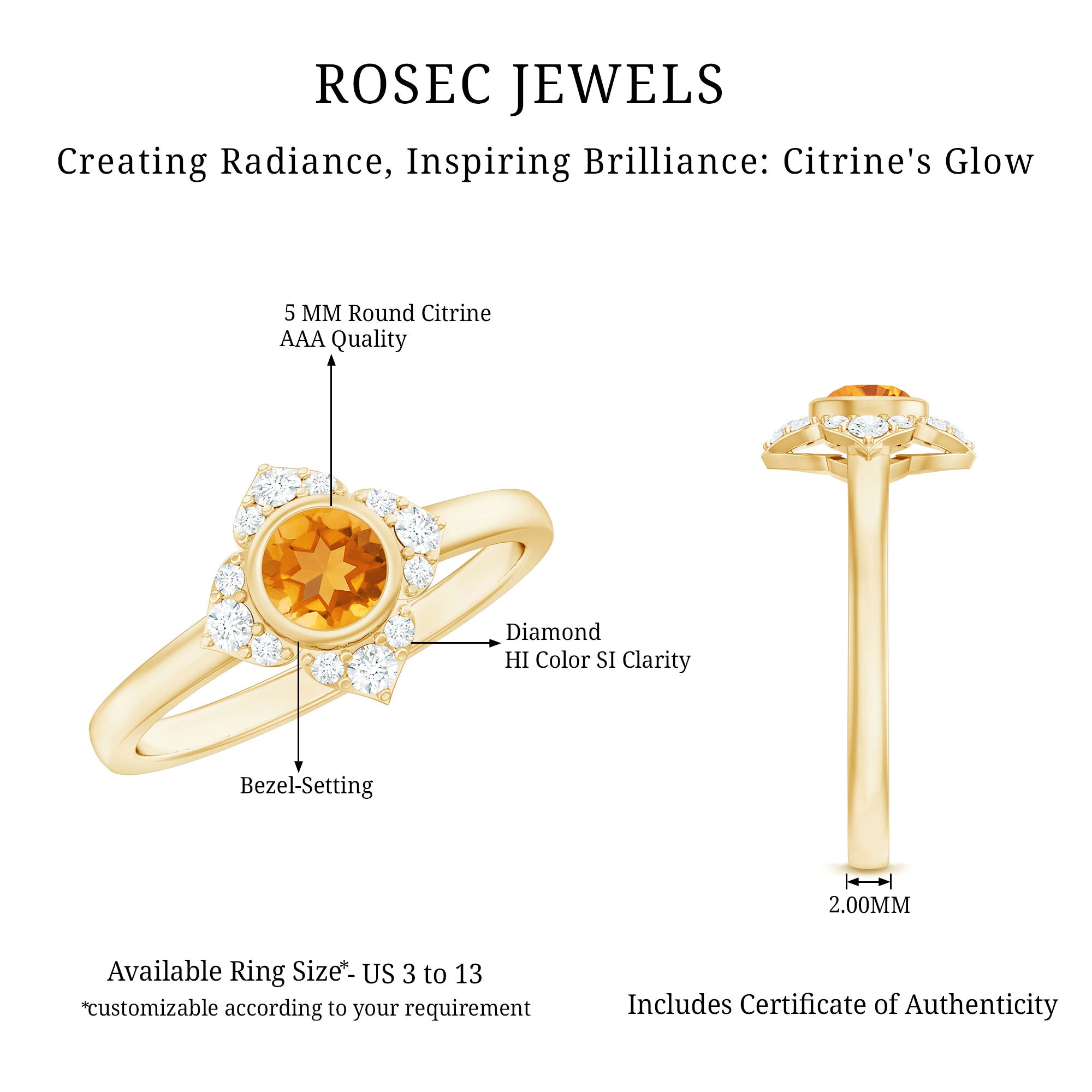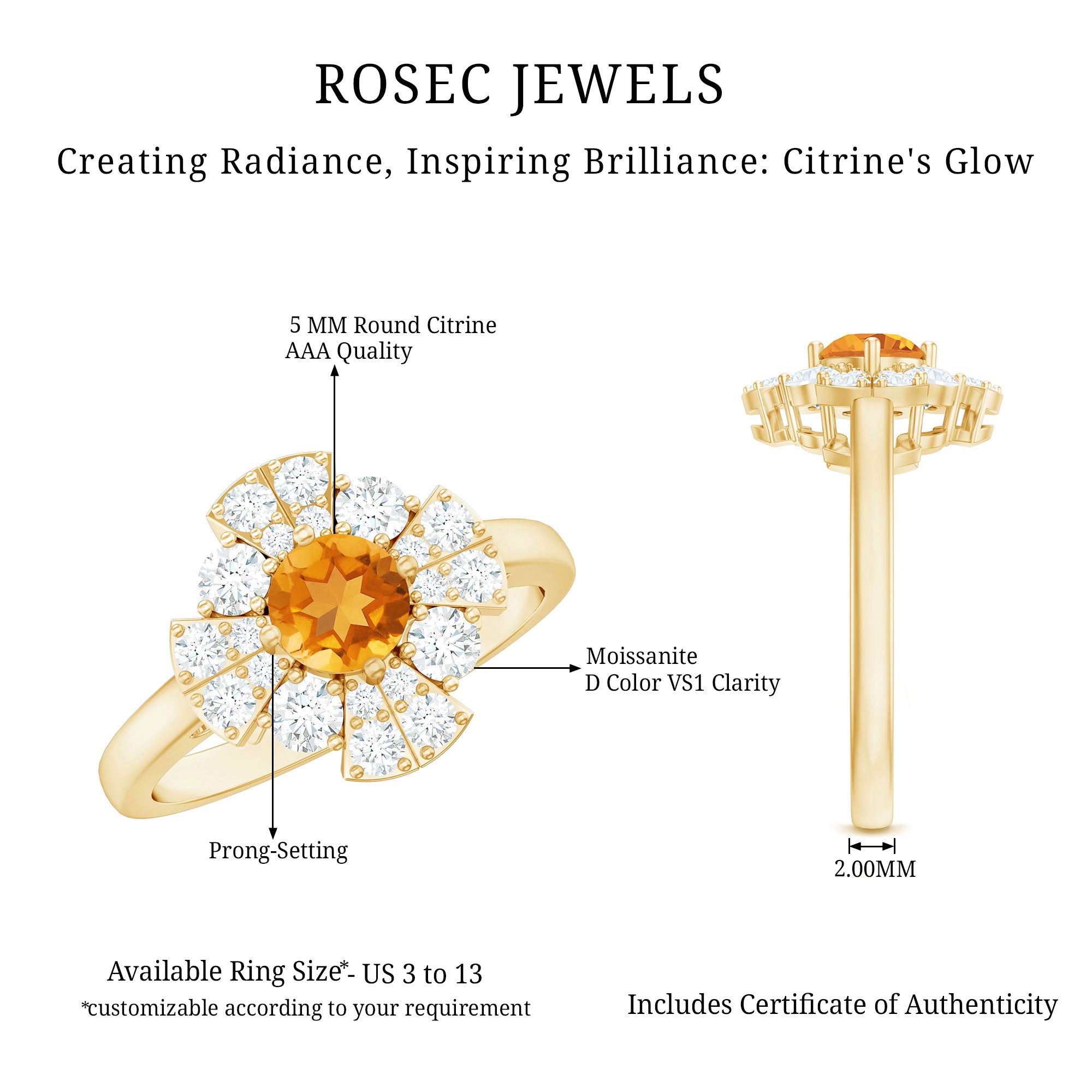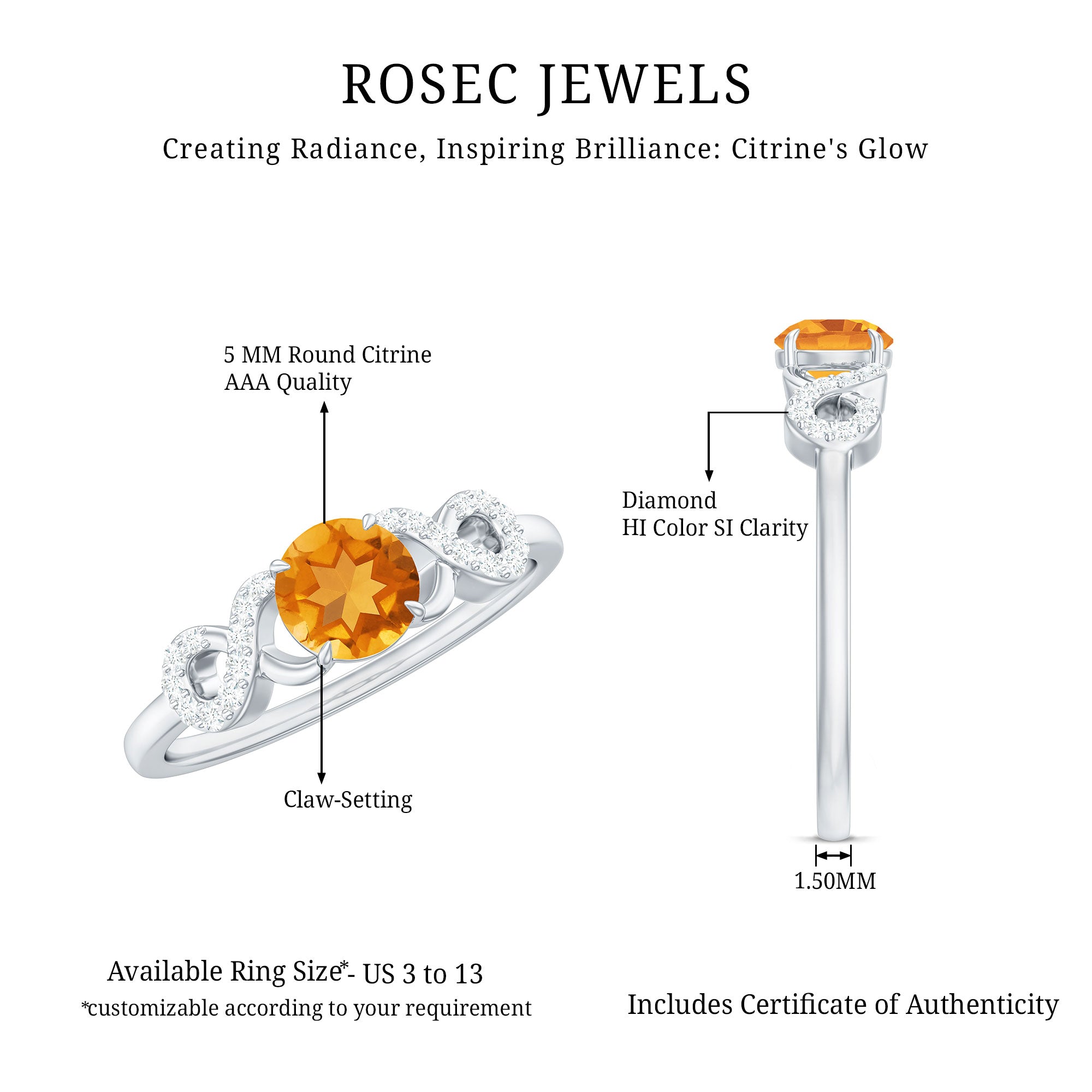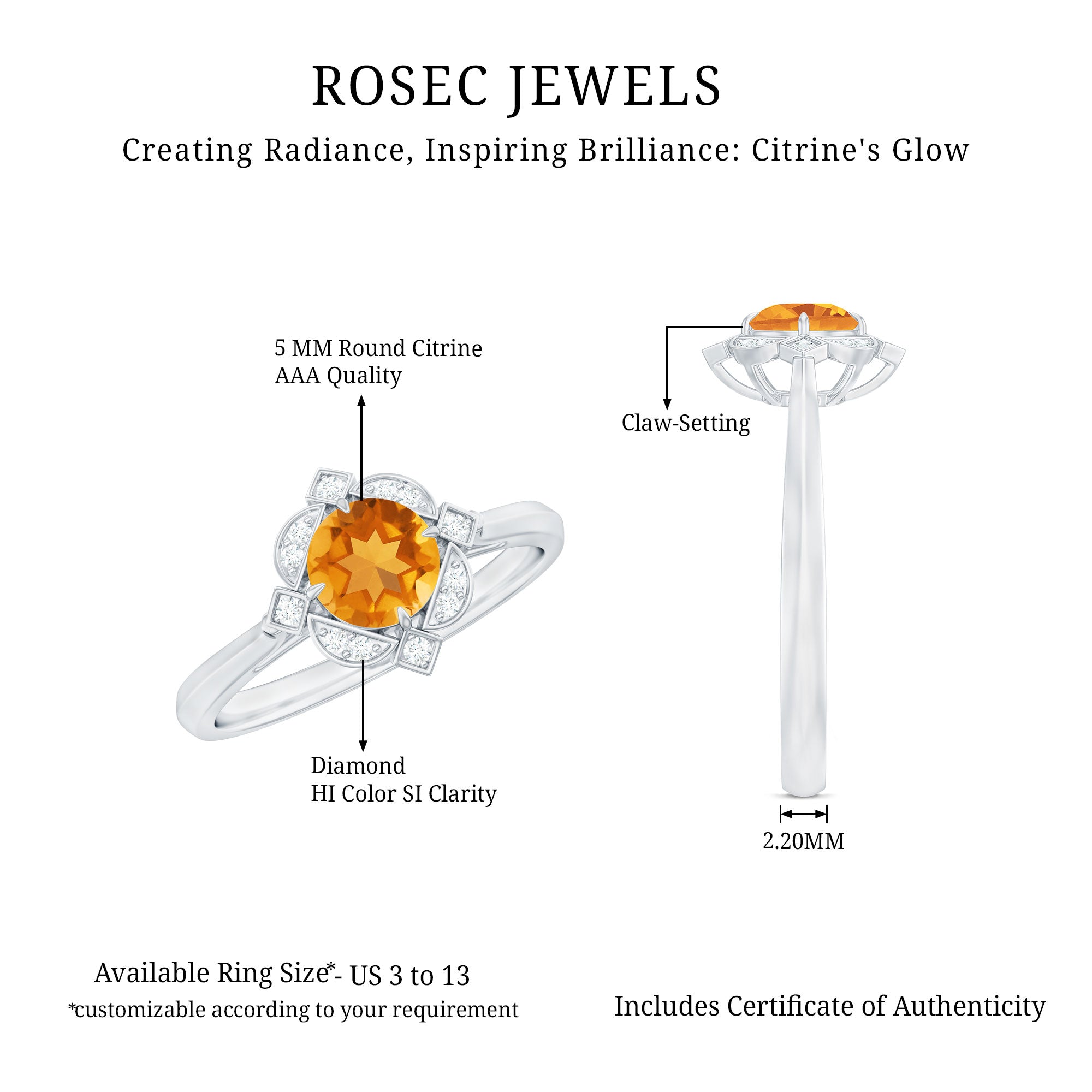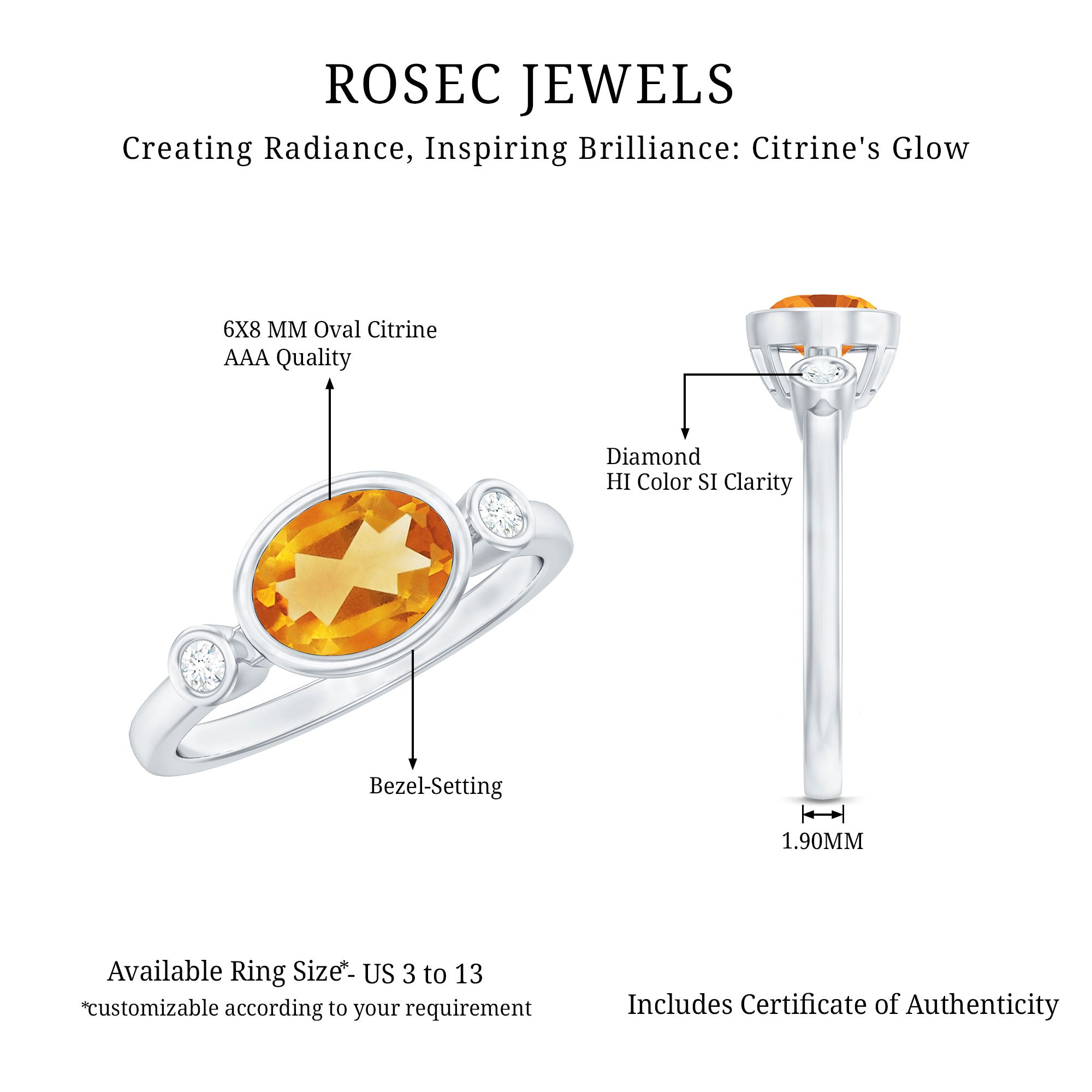 Rosec jewels always provide certificate with every citrine gemstone of AAA quality. Our commitment to high quality means that each ring will be long-lasting with timeless elegance.