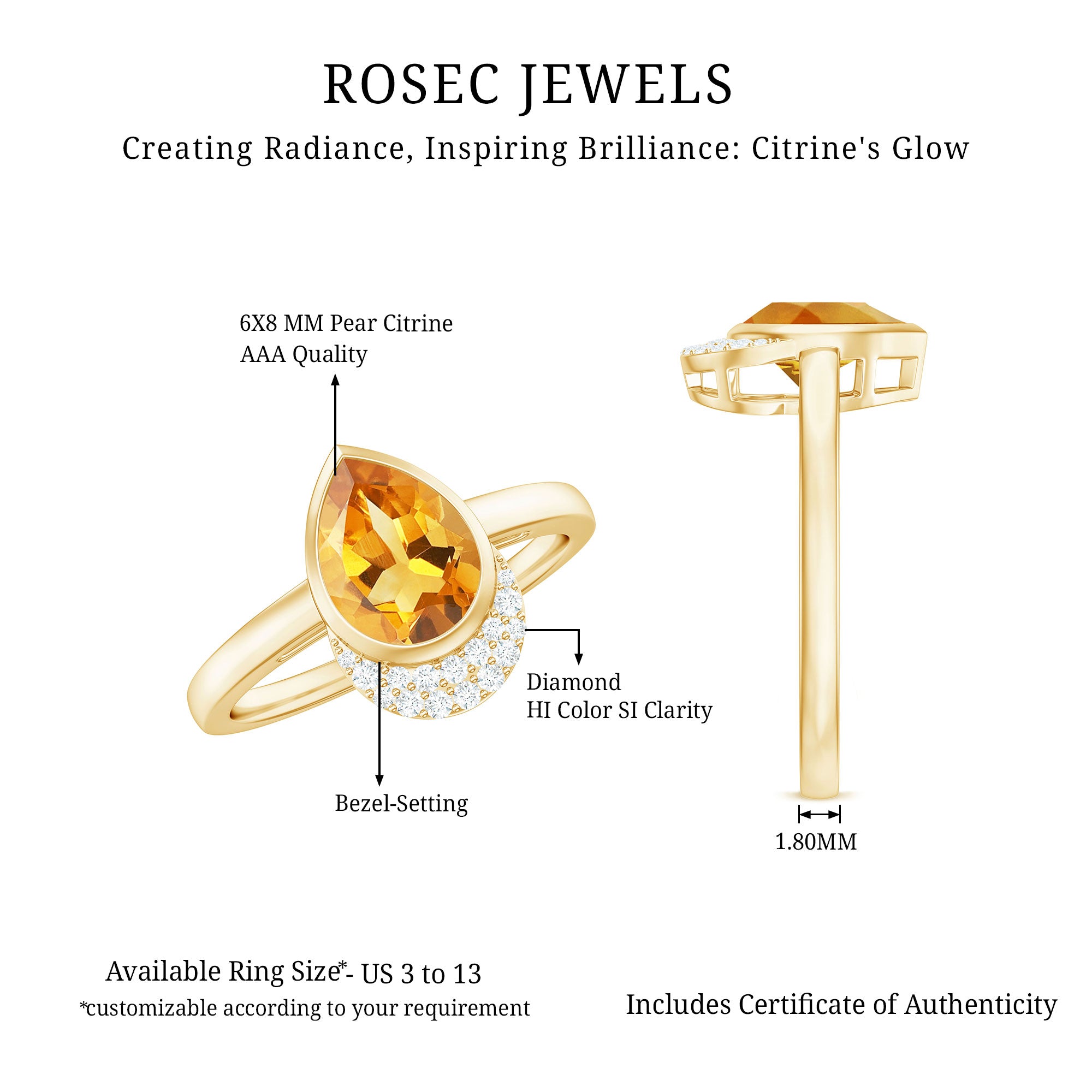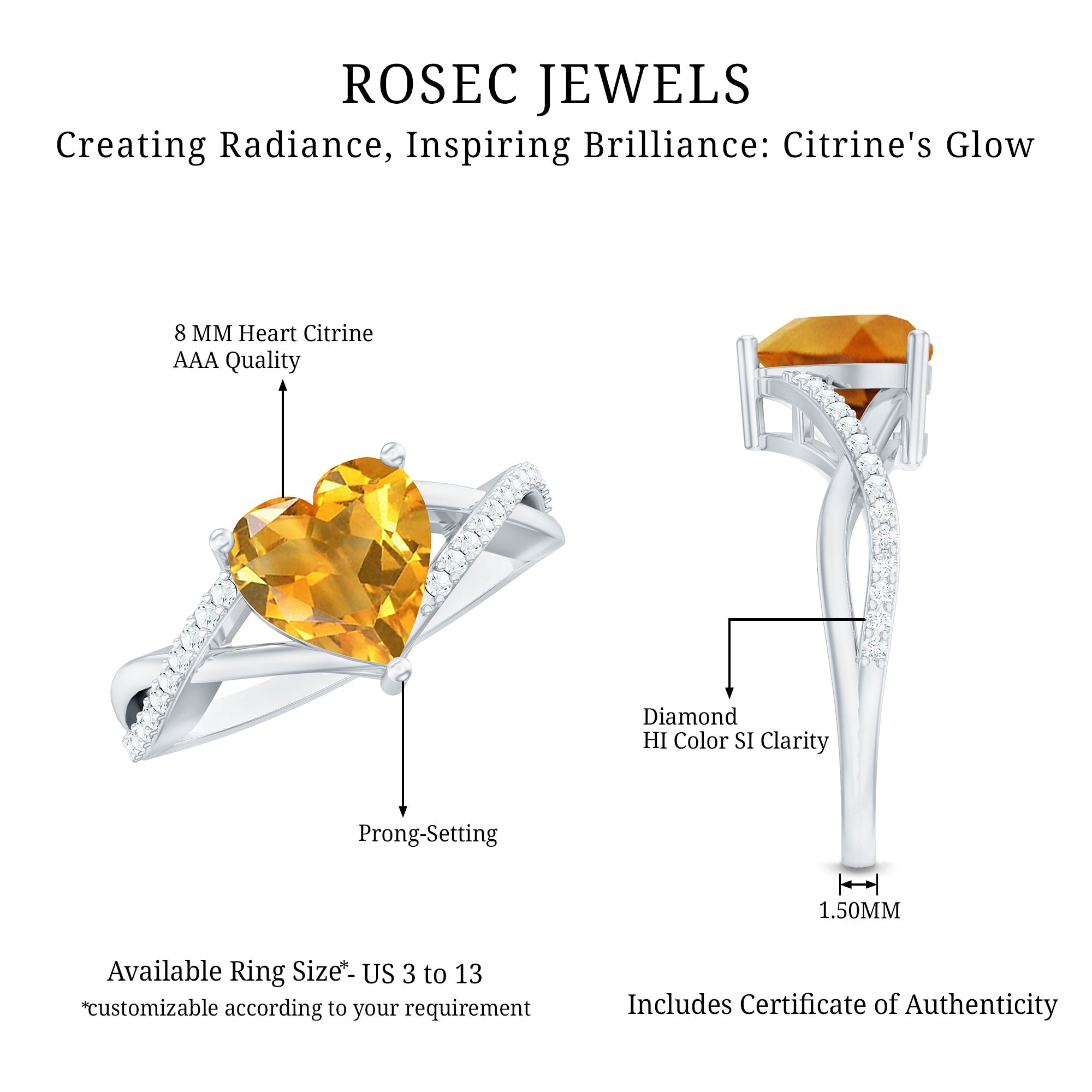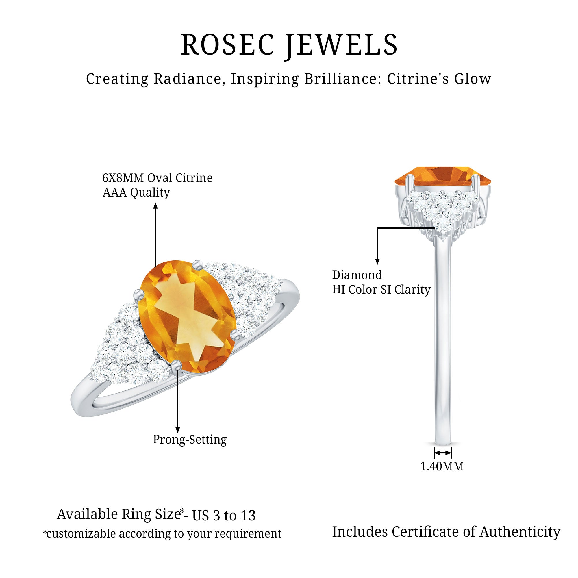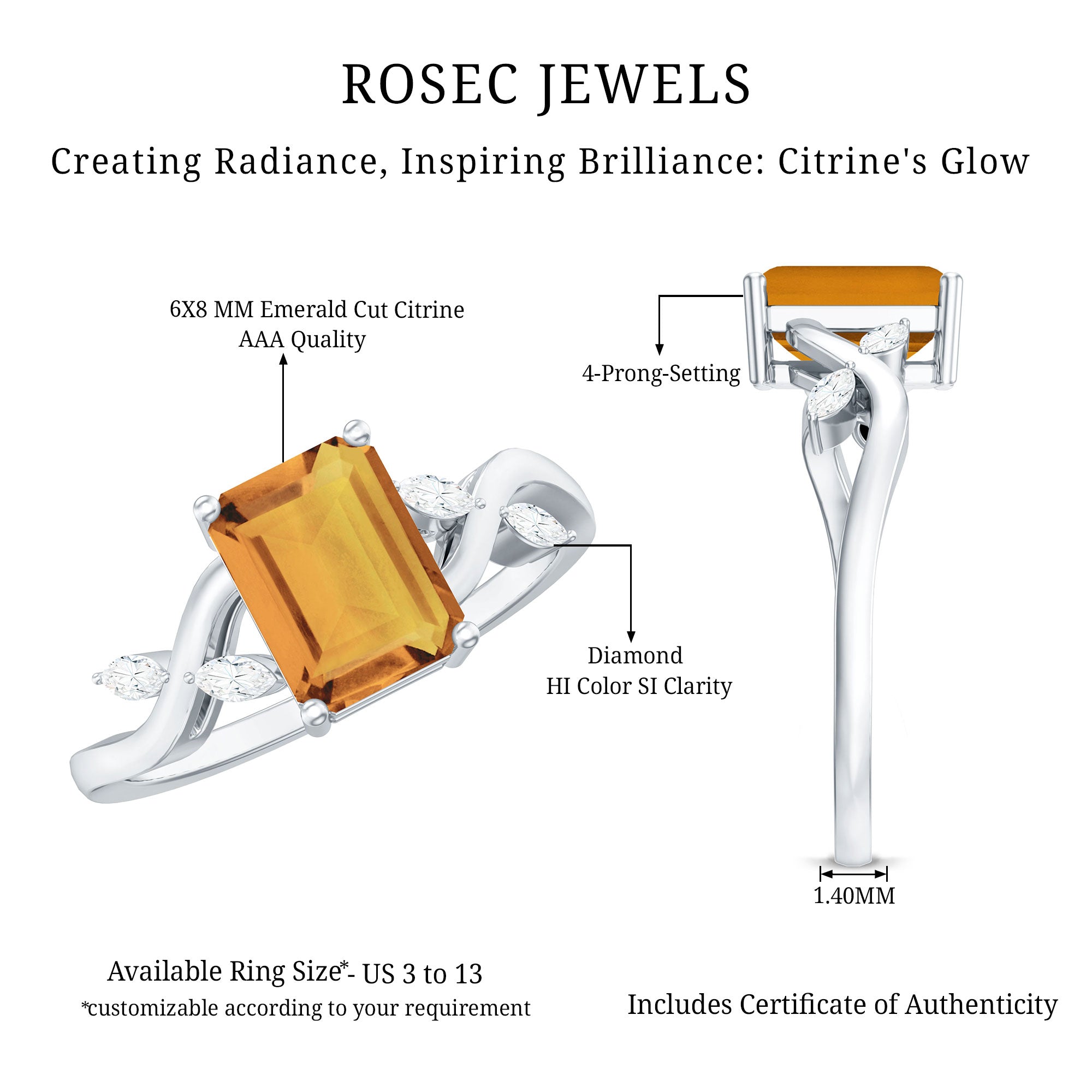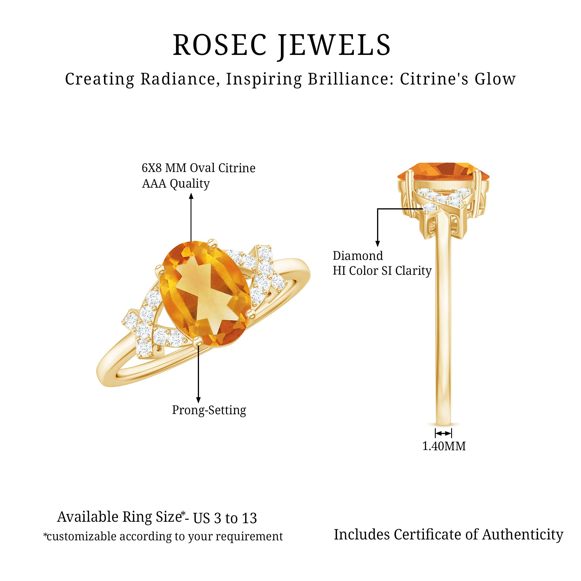 Rosec jewels always provide certificate with every citrine gemstone of AAA quality. Our commitment to high quality means that each ring will be long-lasting with timeless elegance.