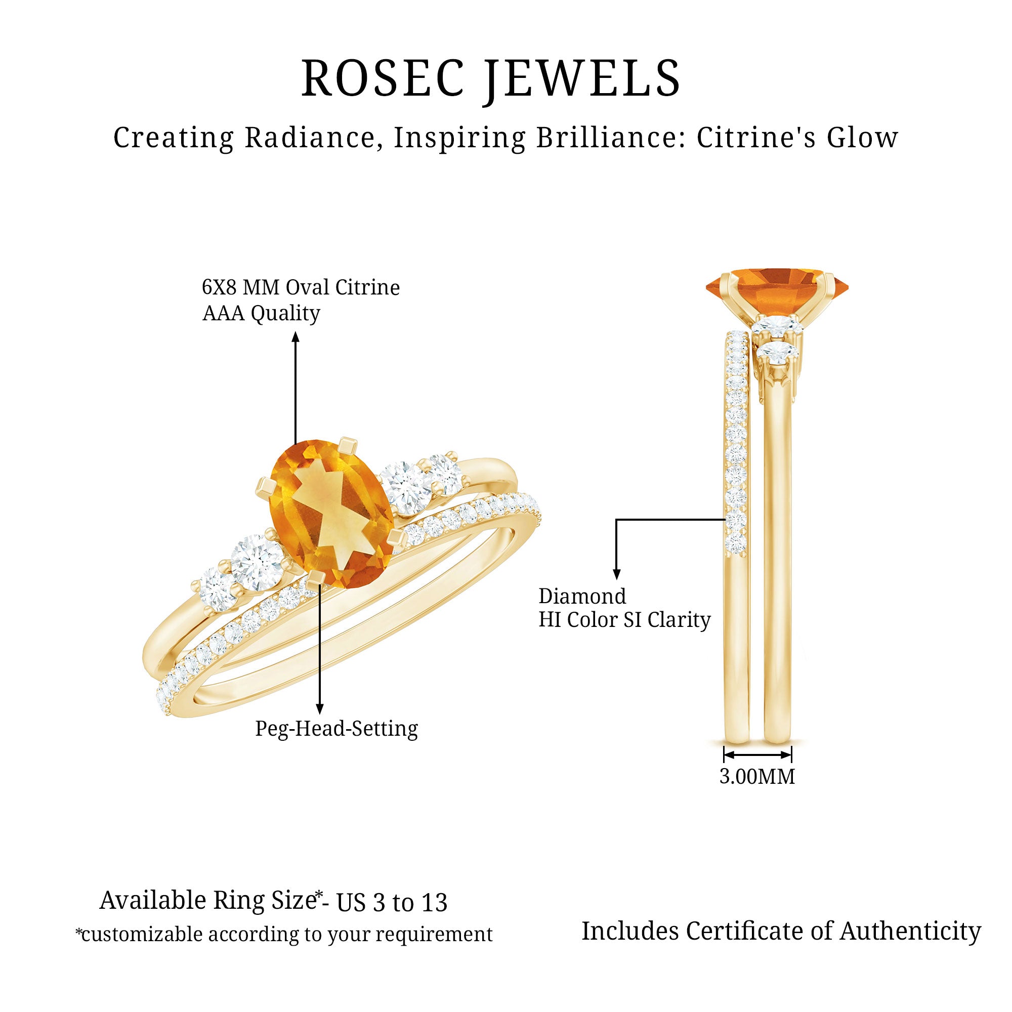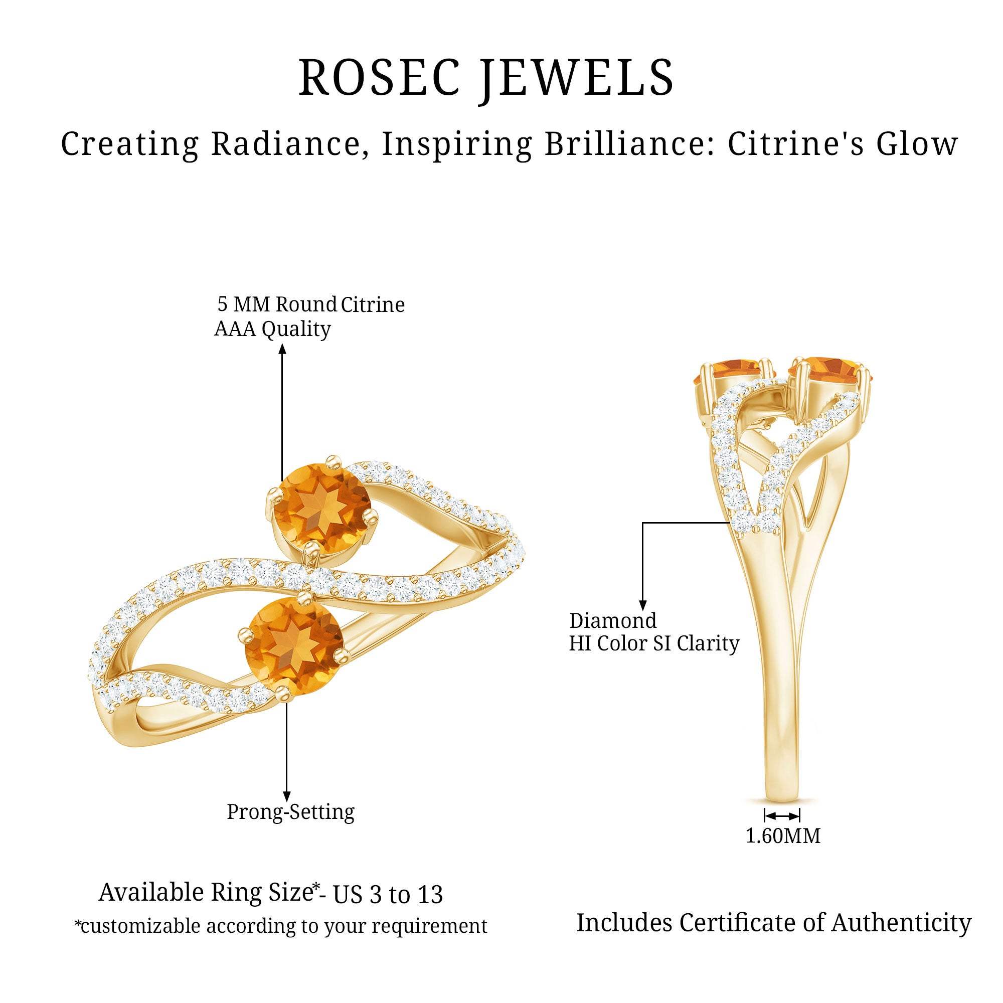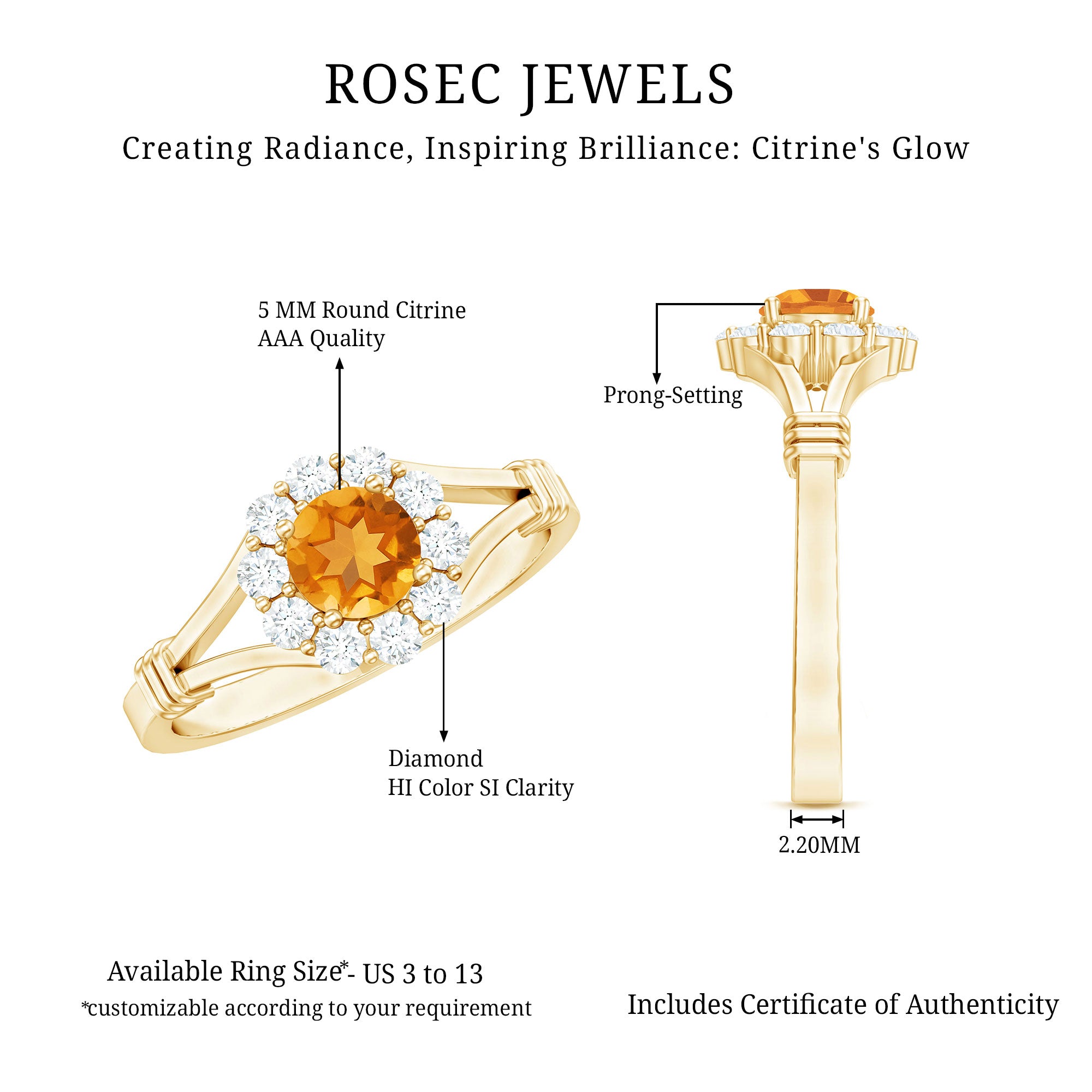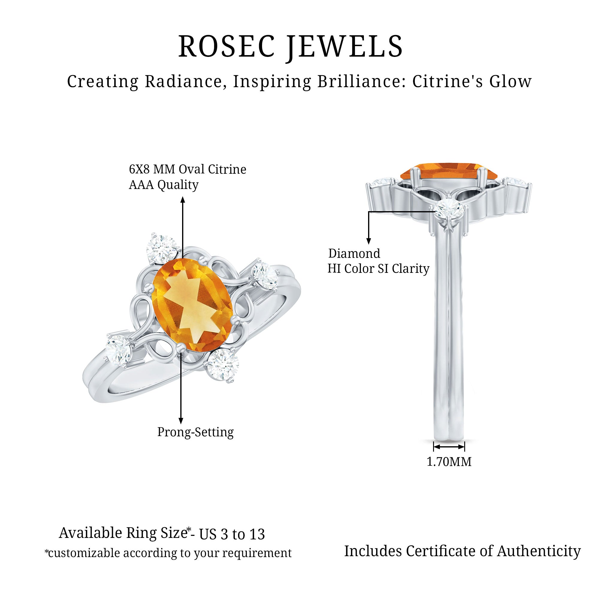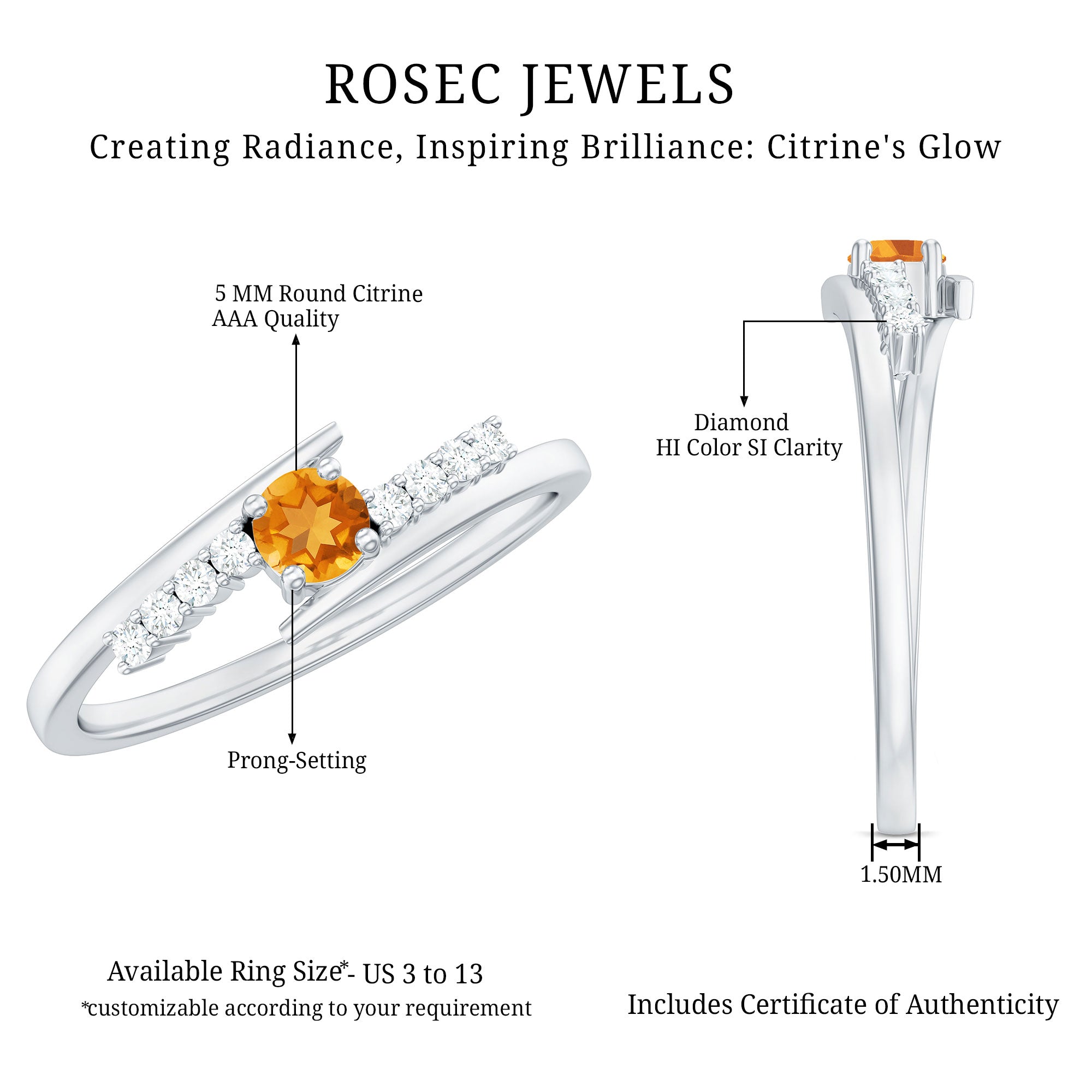 Rosec jewels always provide certificate with every citrine gemstone of AAA quality. Our commitment to high quality means that each ring will be long-lasting with timeless elegance.