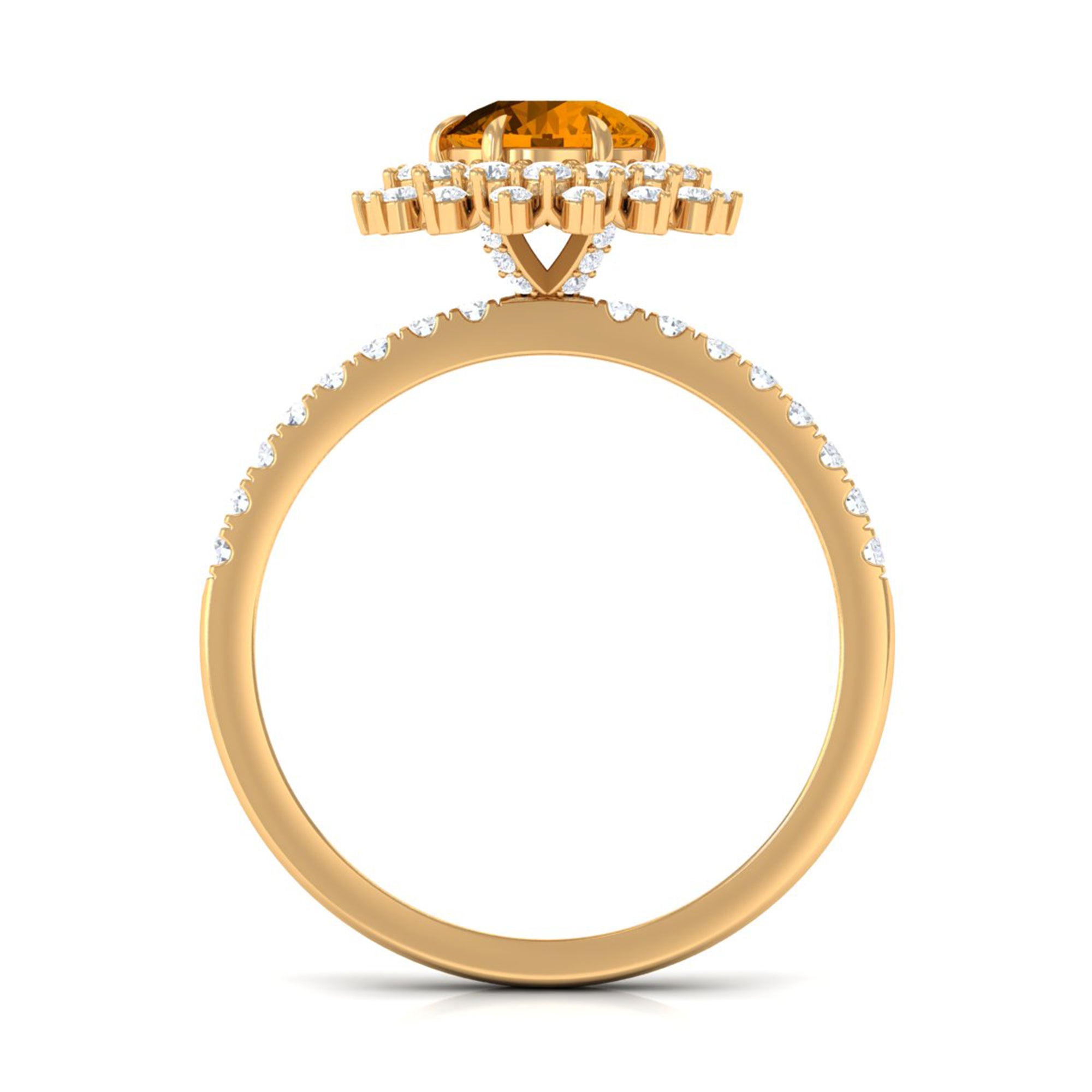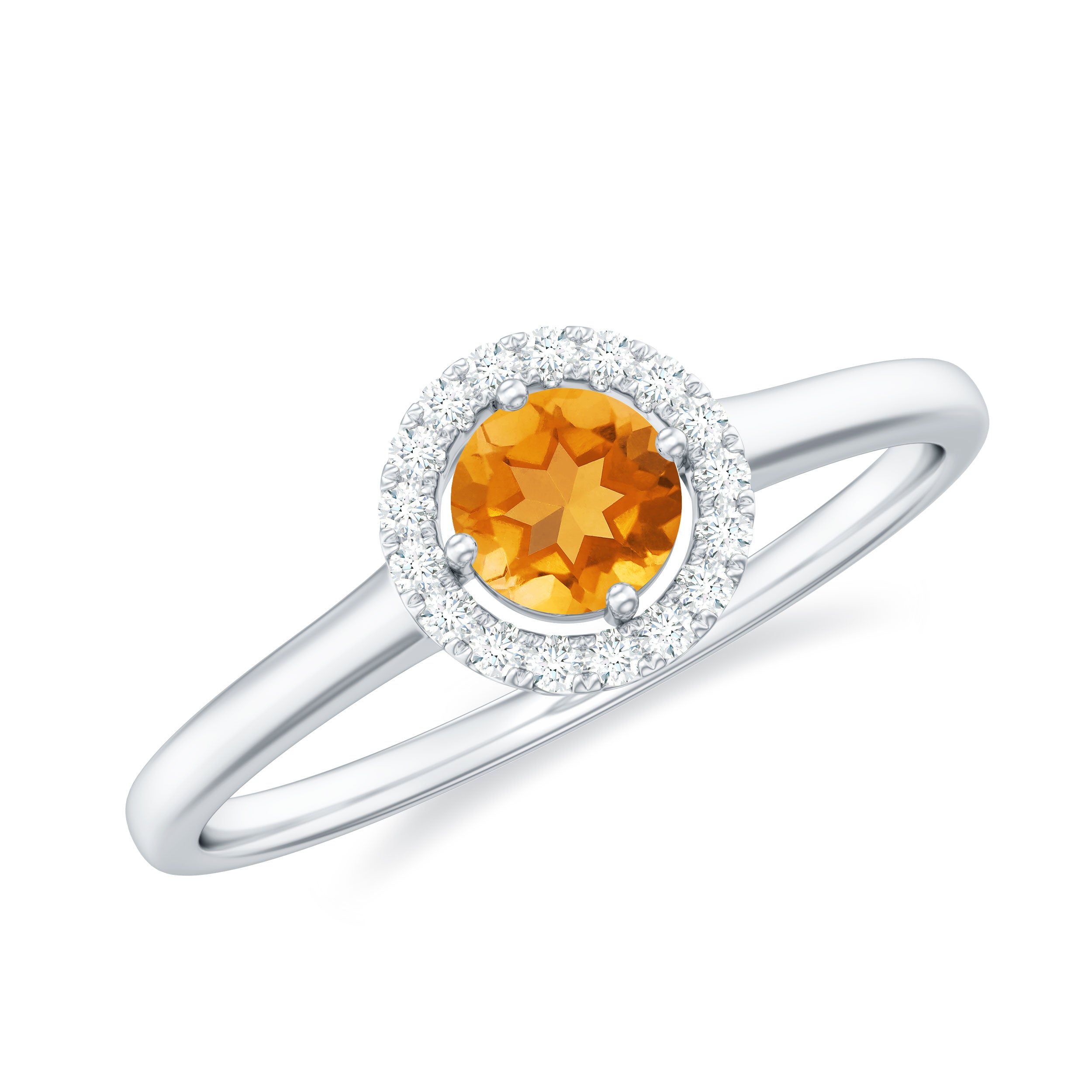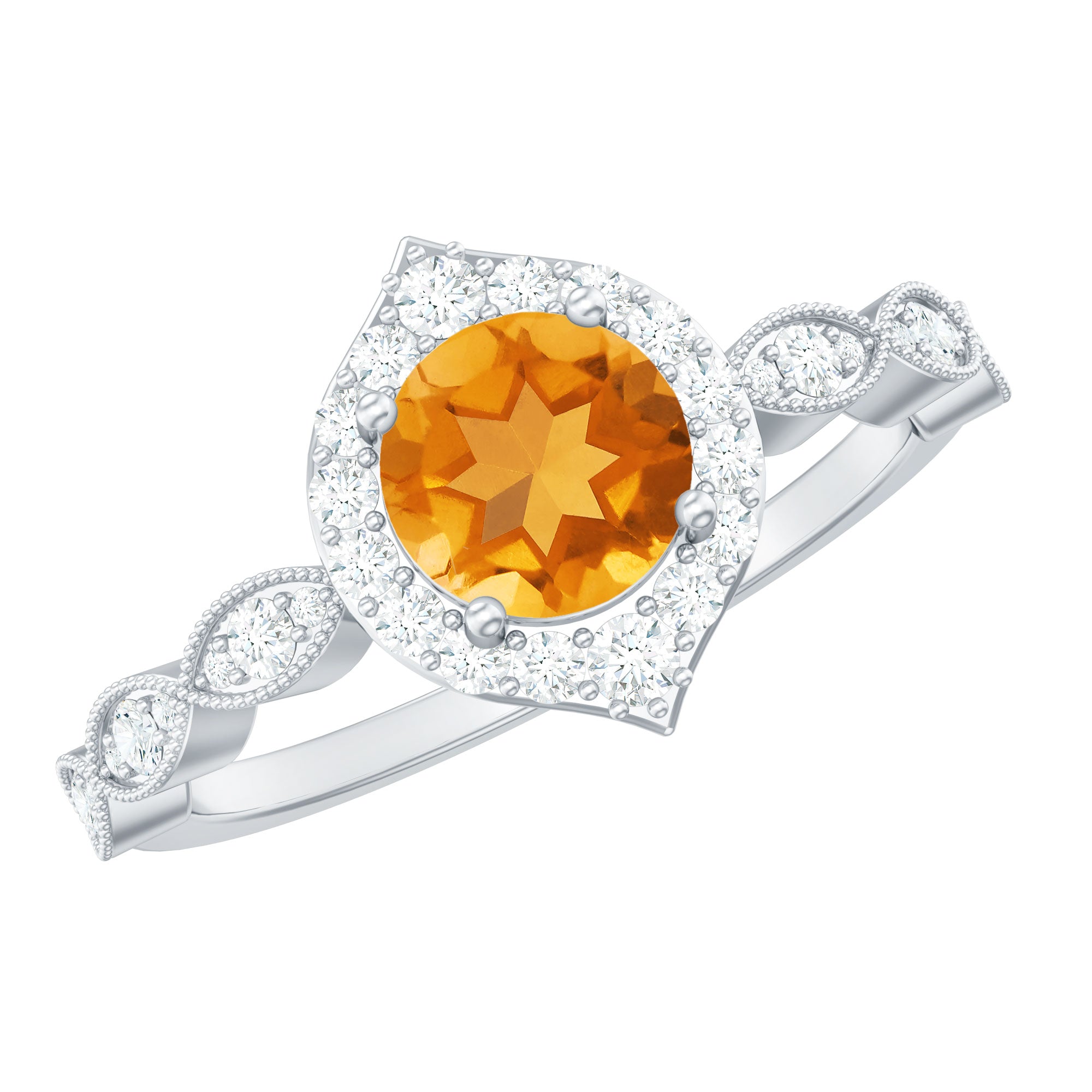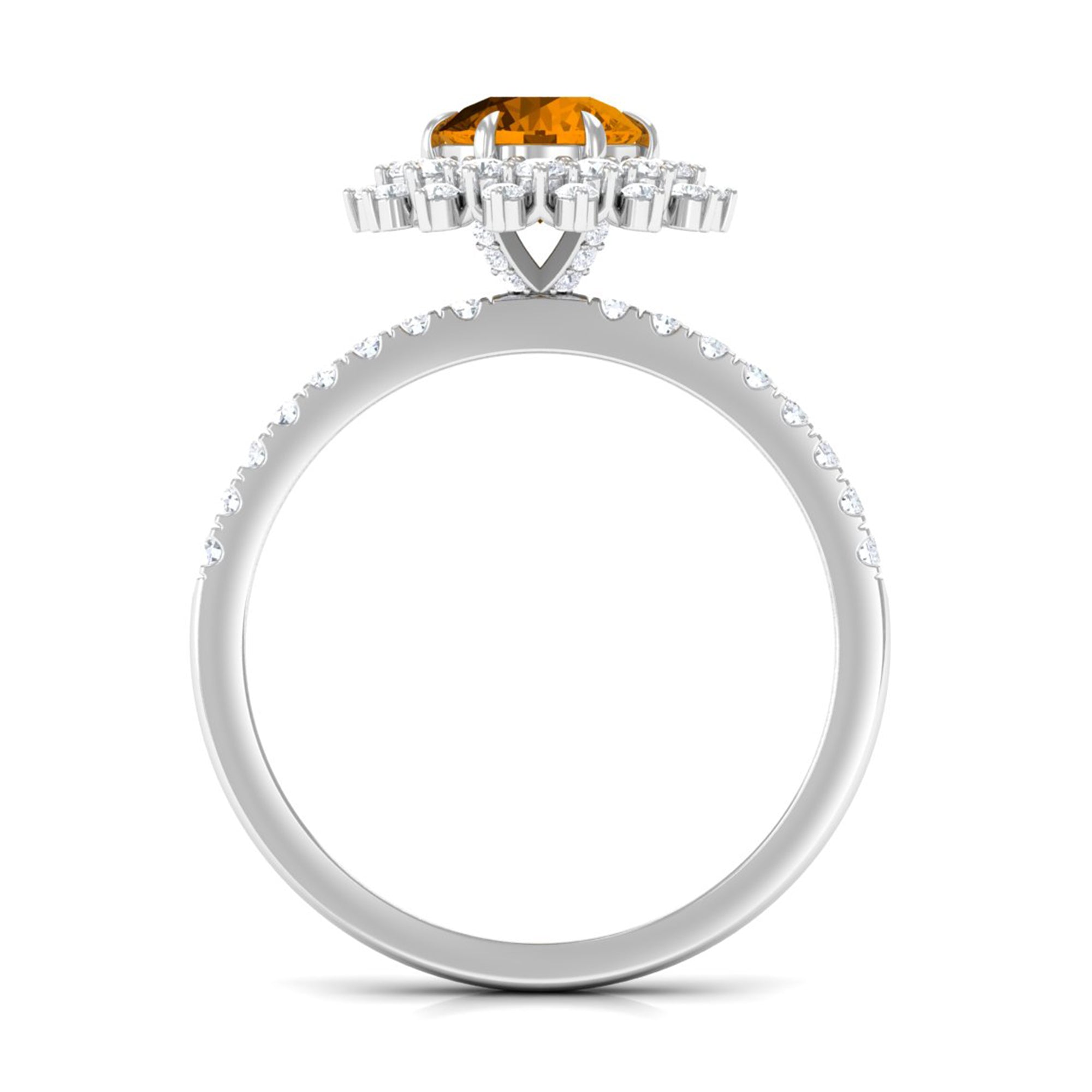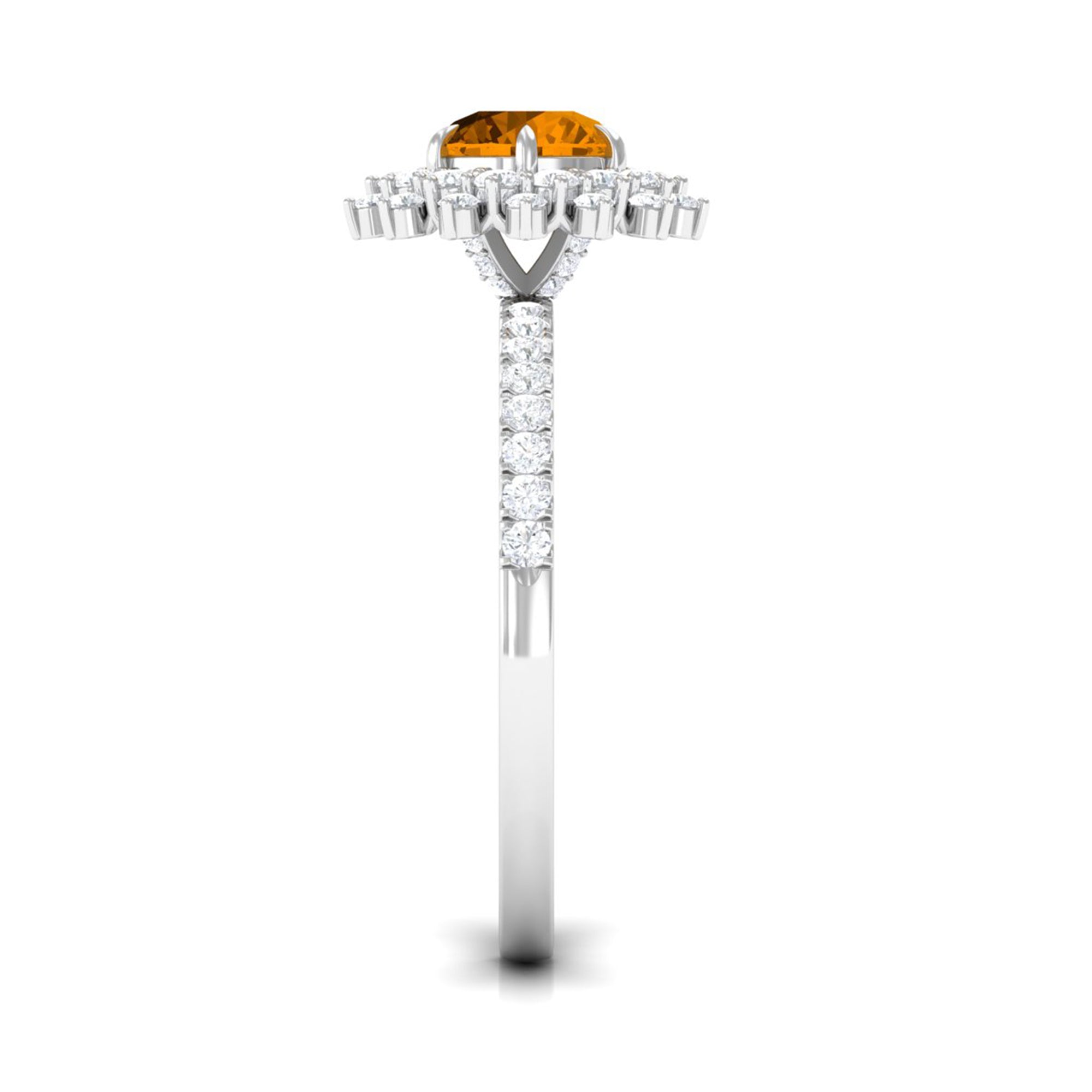 Features a citrine stone, that is a focal point, and small shimmery diamonds add an extra layer of shine & sparkle to the citrine centerpiece. The halo accent enhances the beauty and brilliance of the gem.