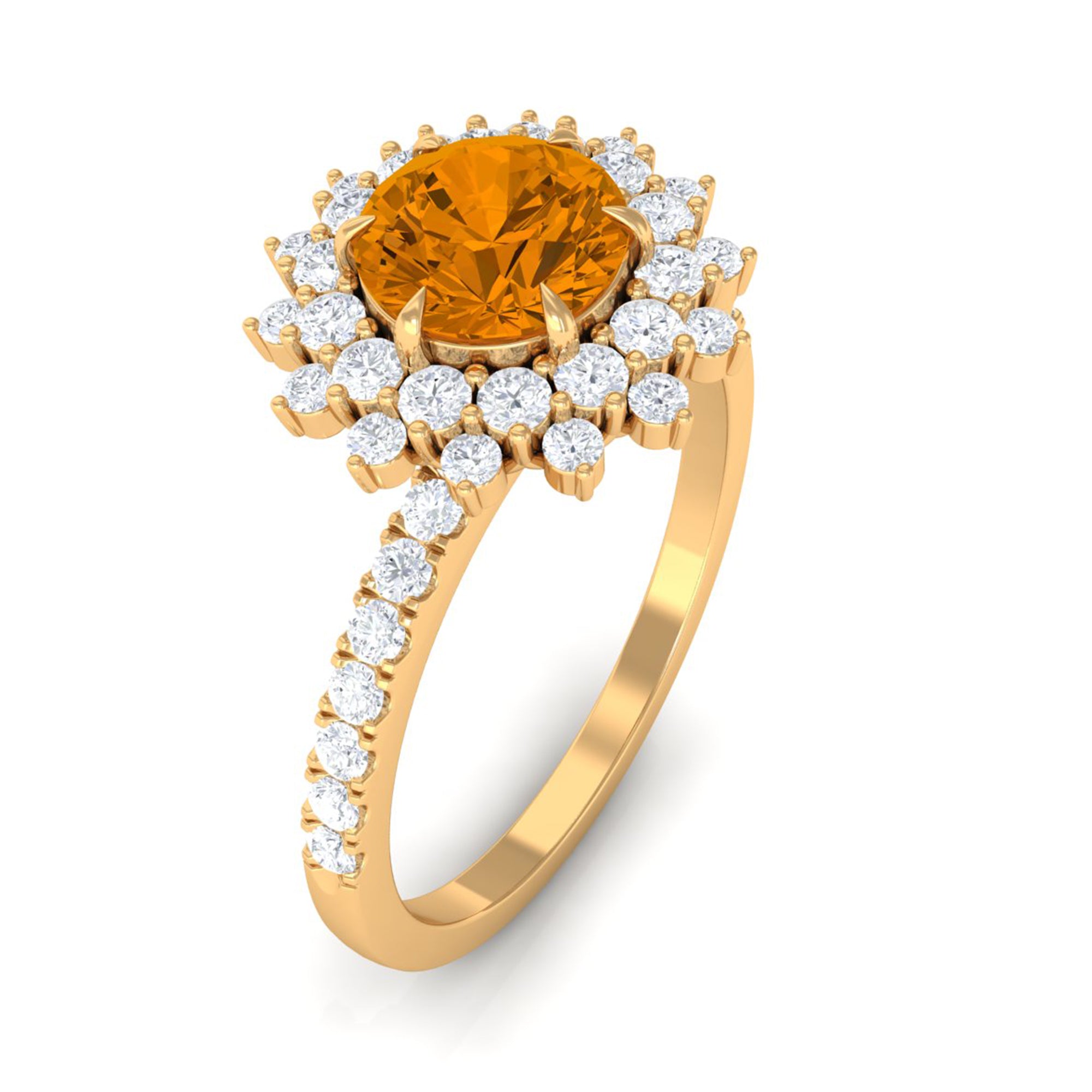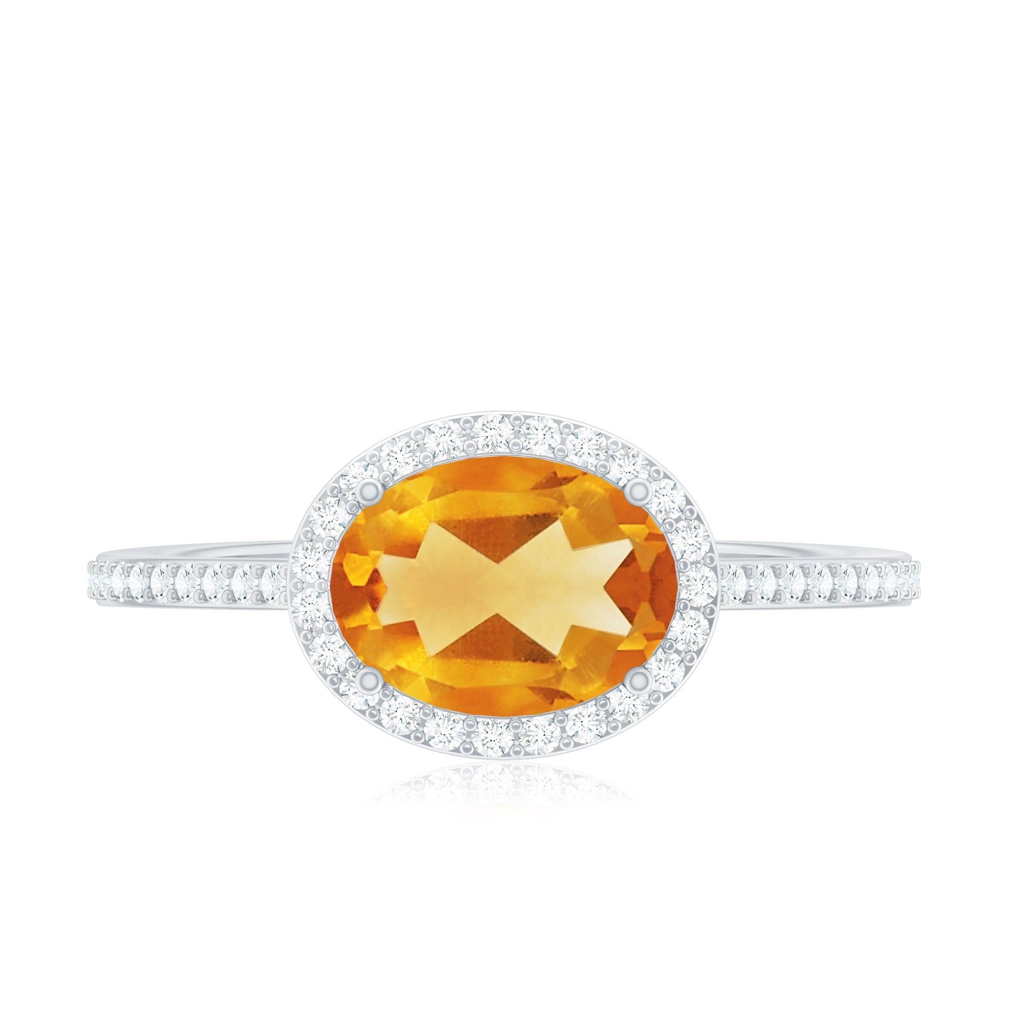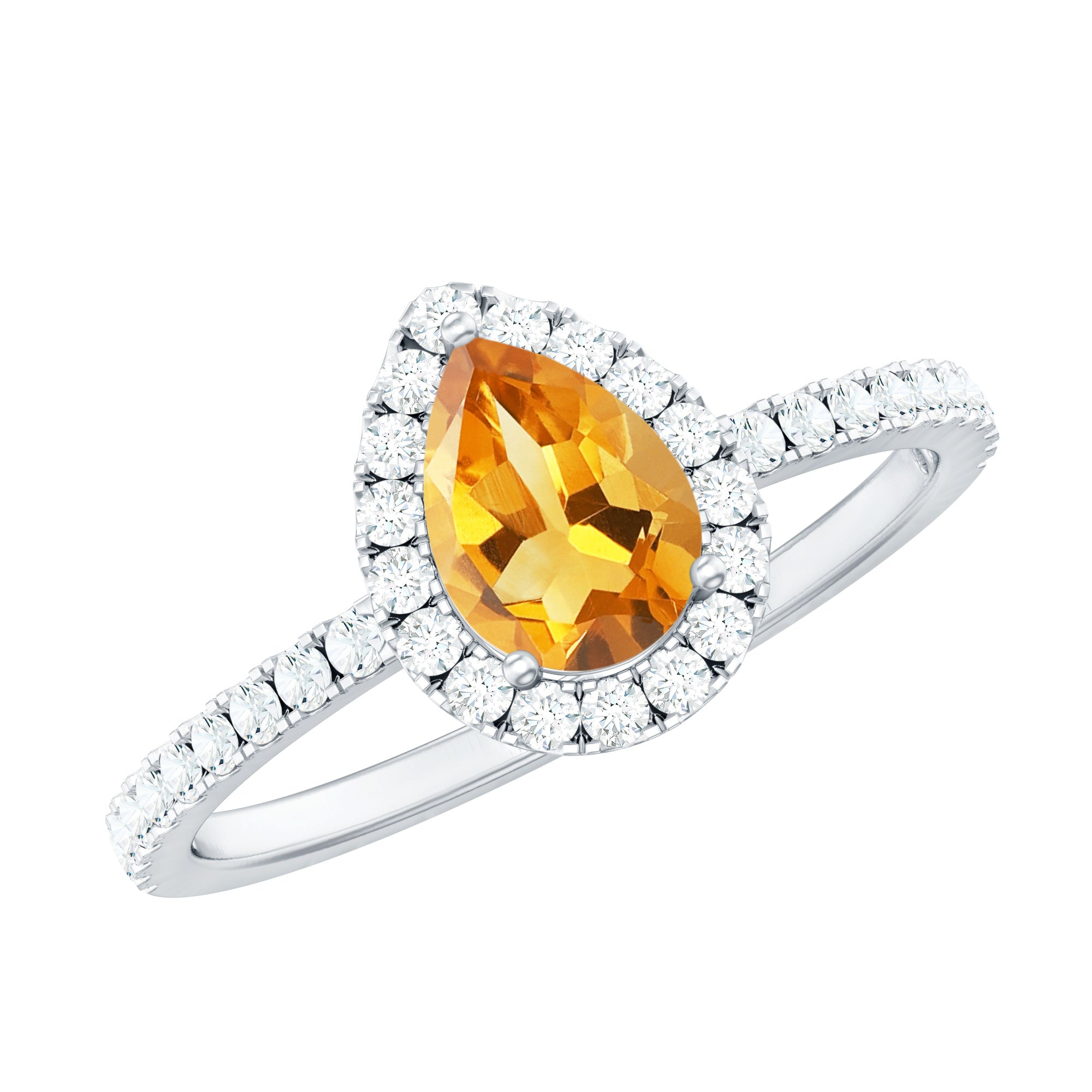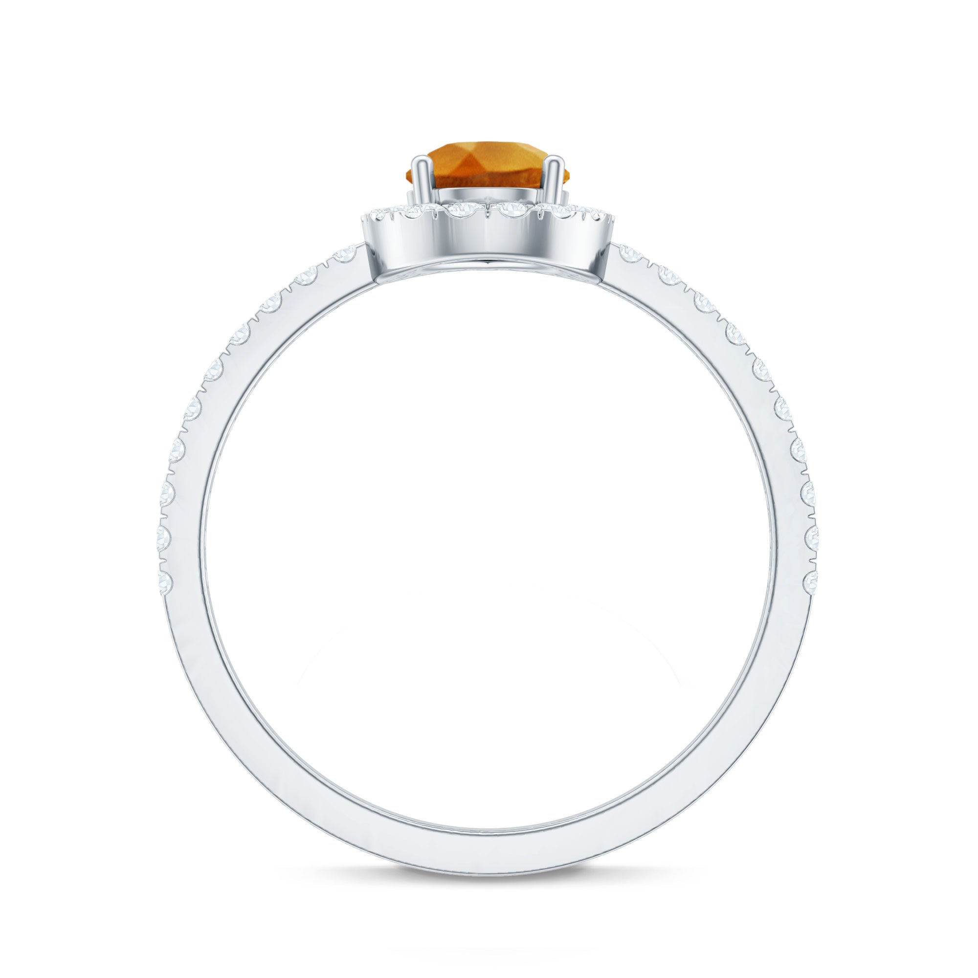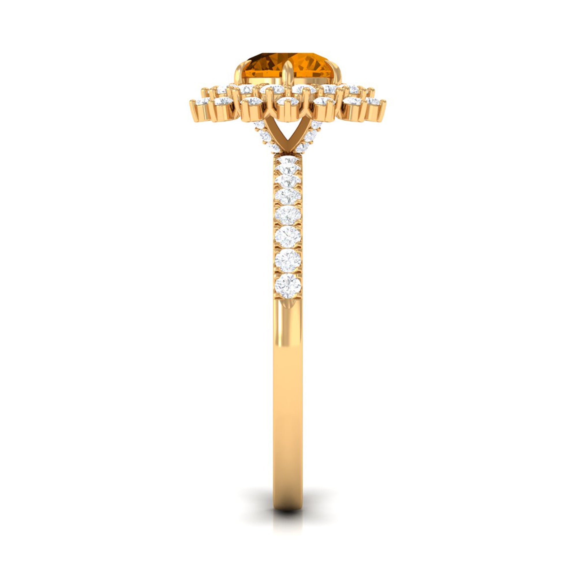 Features a citrine stone, that is a focal point, and small shimmery diamonds add an extra layer of shine & sparkle to the citrine centerpiece. The halo accent enhances the beauty and brilliance of the gem.