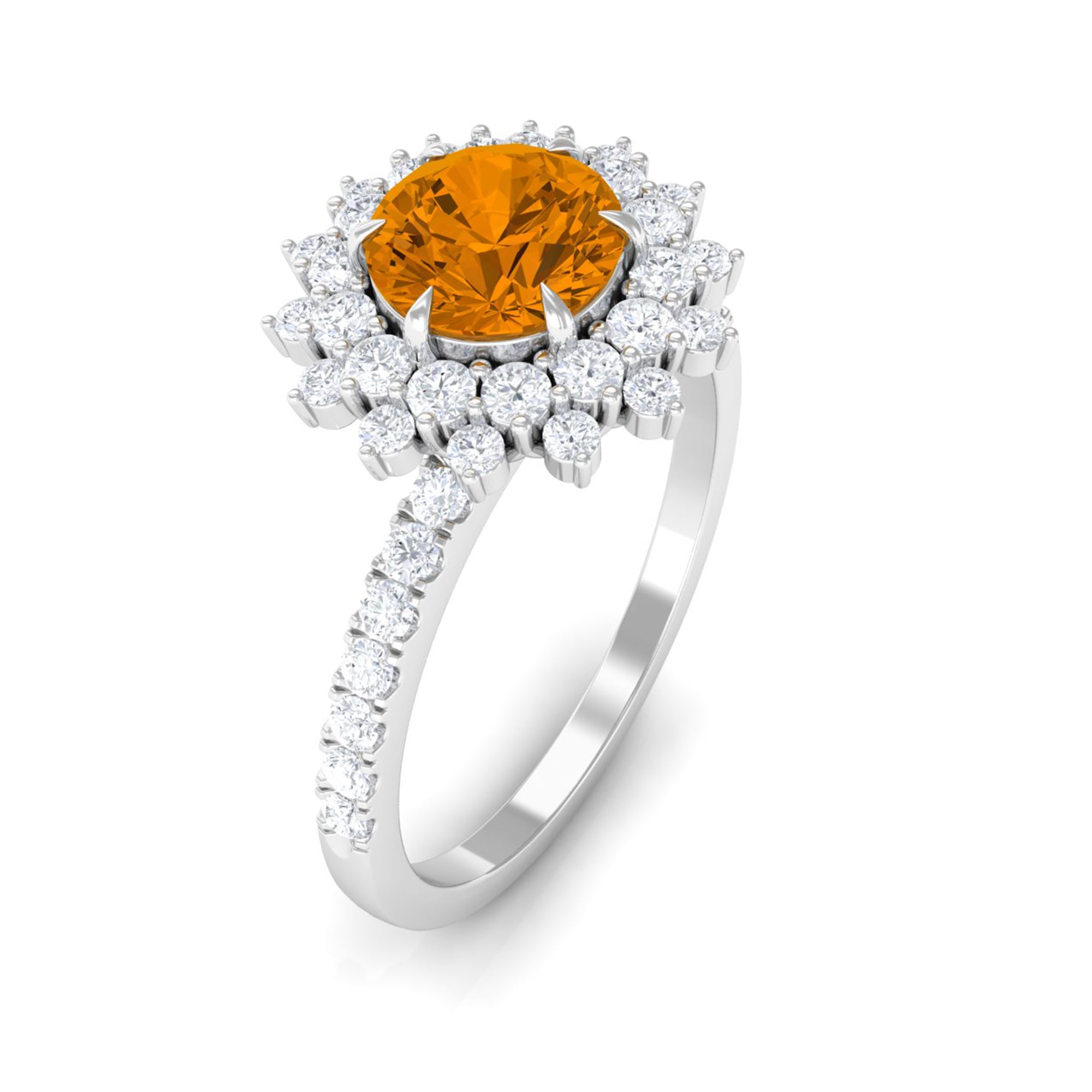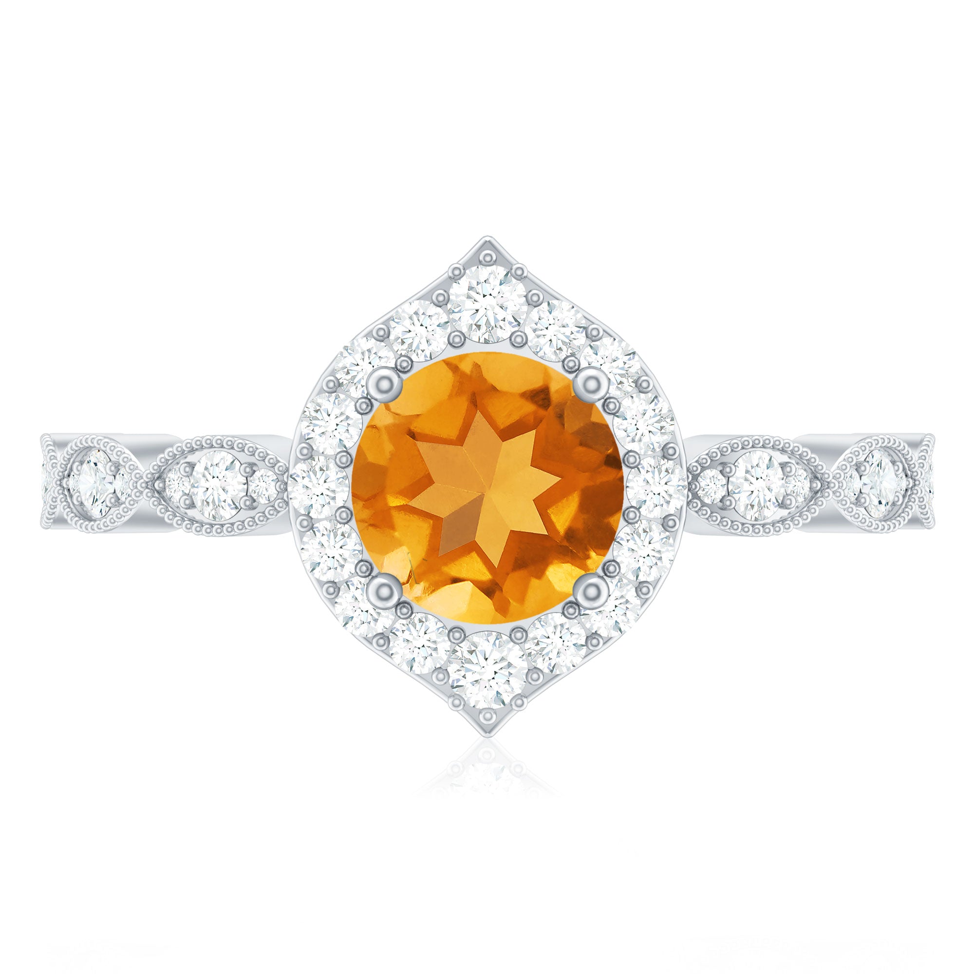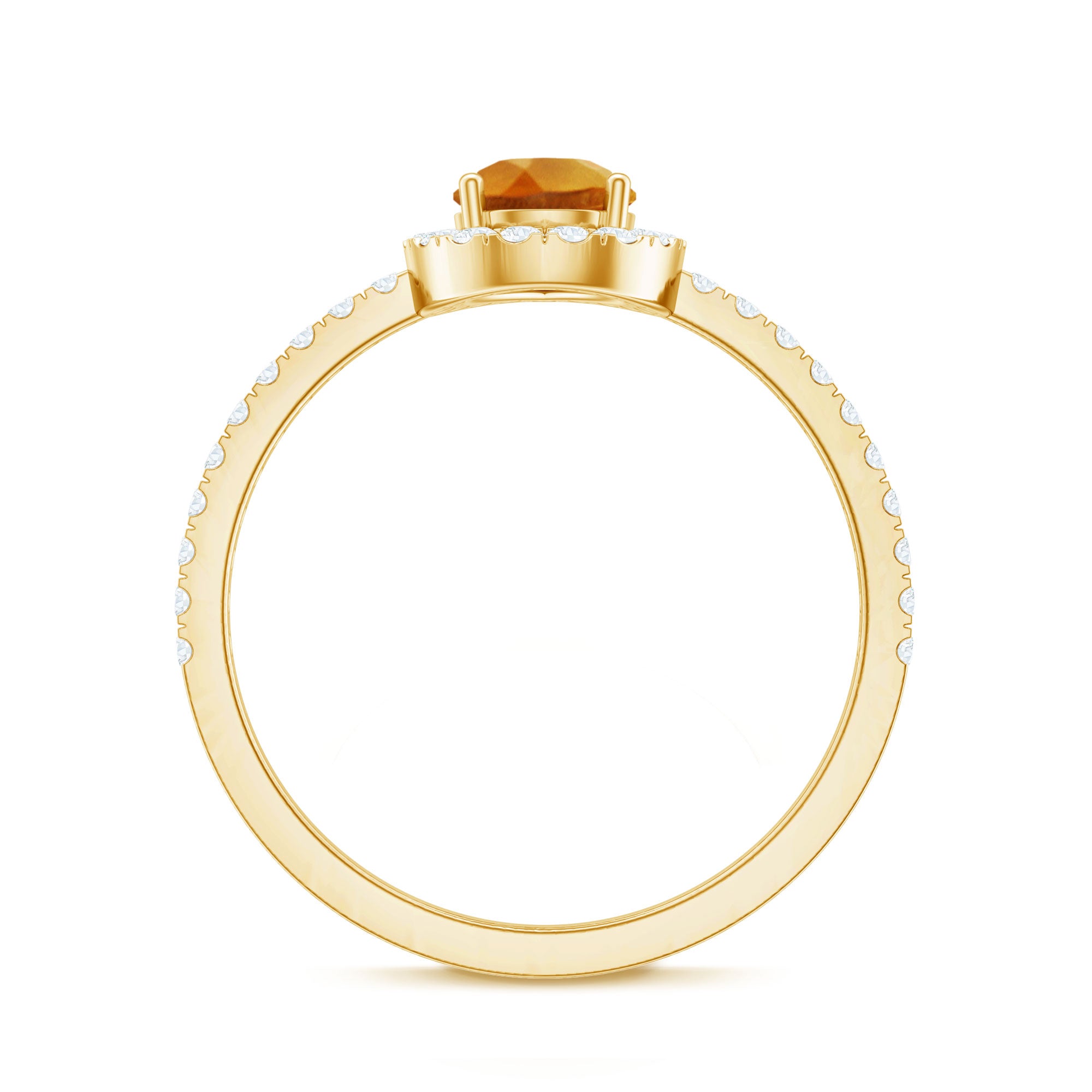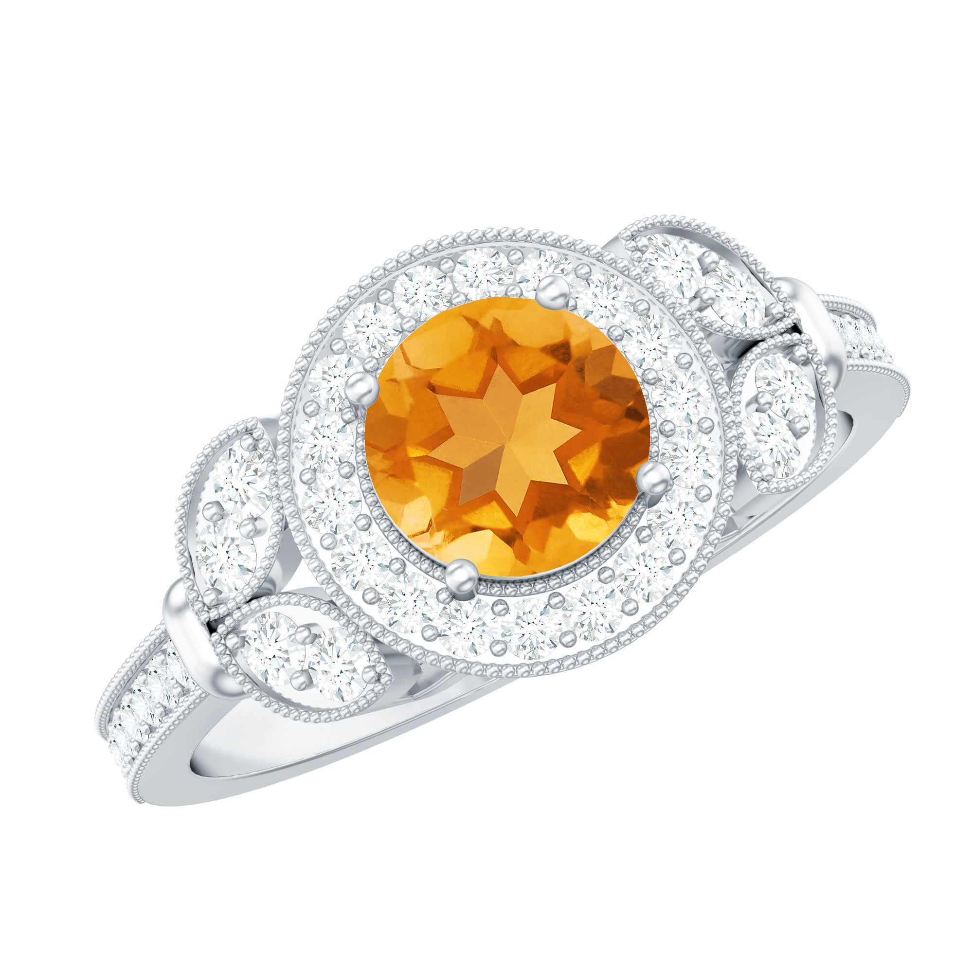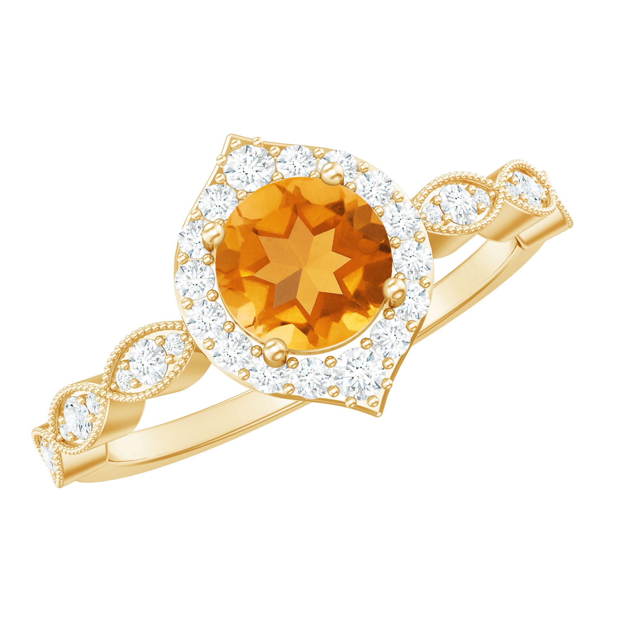 Features a citrine stone, that is a focal point, and small shimmery diamonds add an extra layer of shine & sparkle to the citrine centerpiece. The halo accent enhances the beauty and brilliance of the gem.