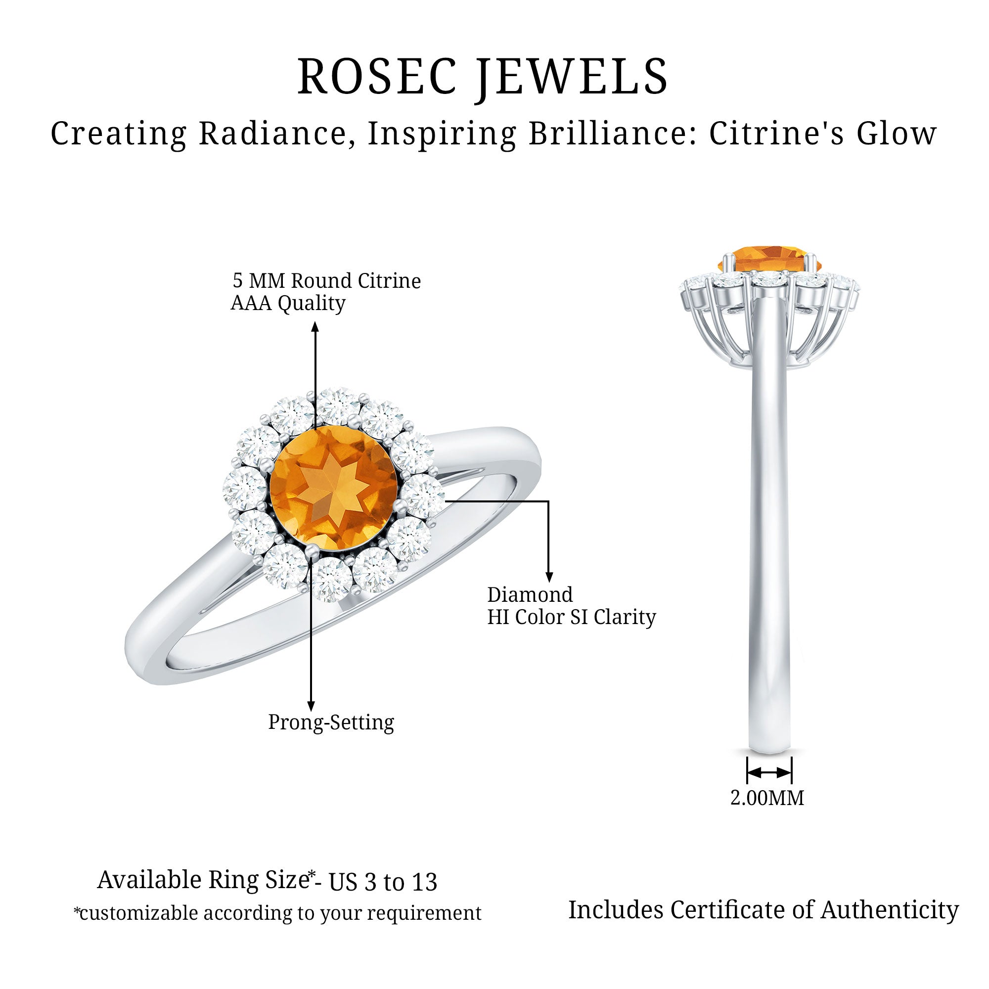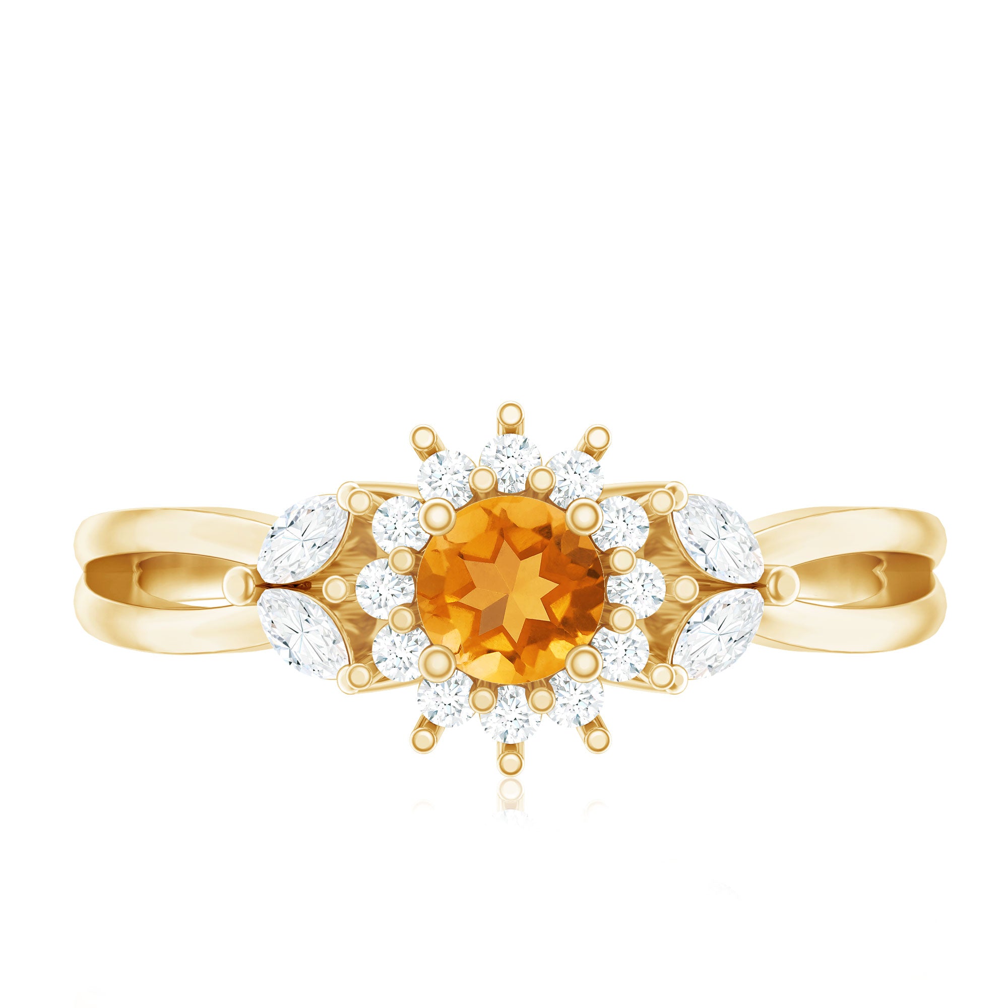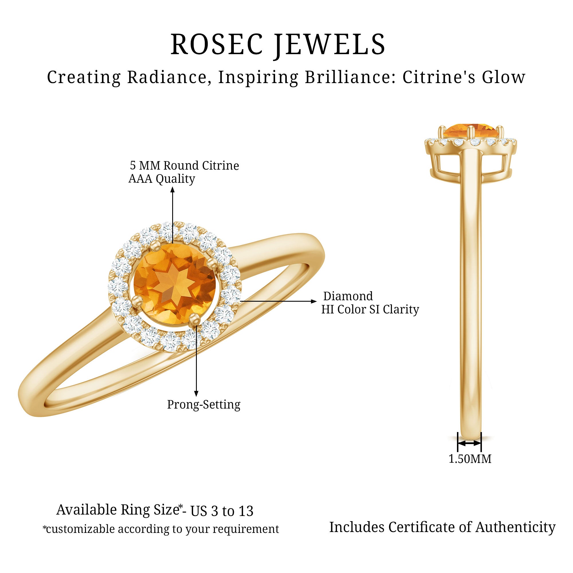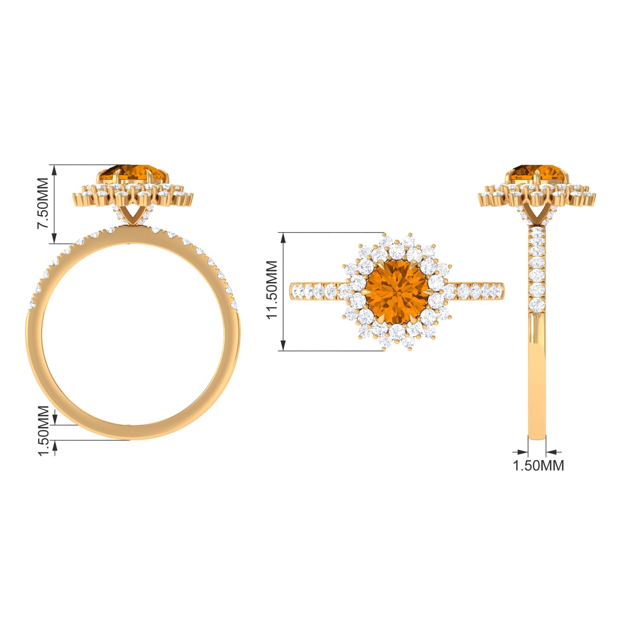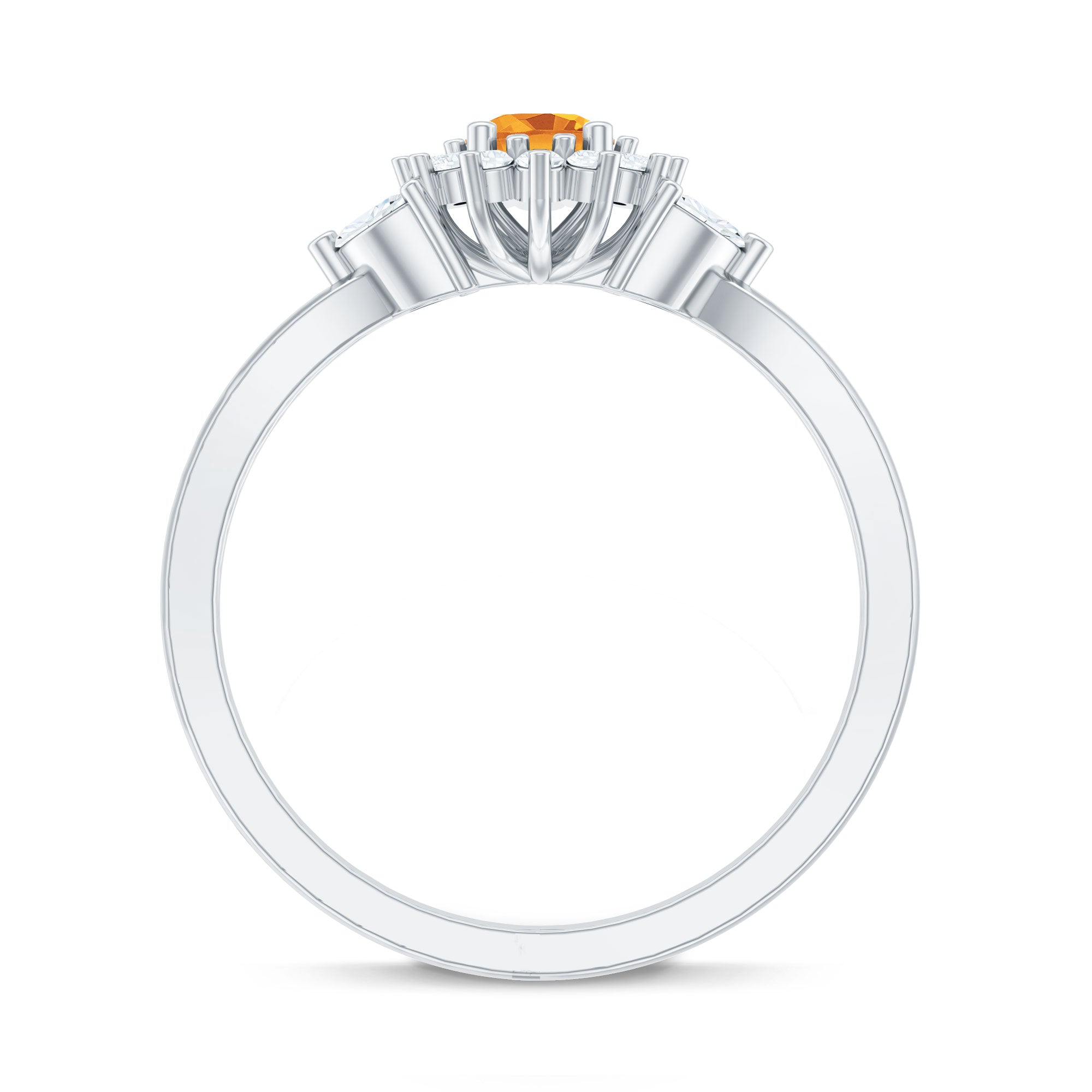 Features a citrine stone, that is a focal point, and small shimmery diamonds add an extra layer of shine & sparkle to the citrine centerpiece. The halo accent enhances the beauty and brilliance of the gem.