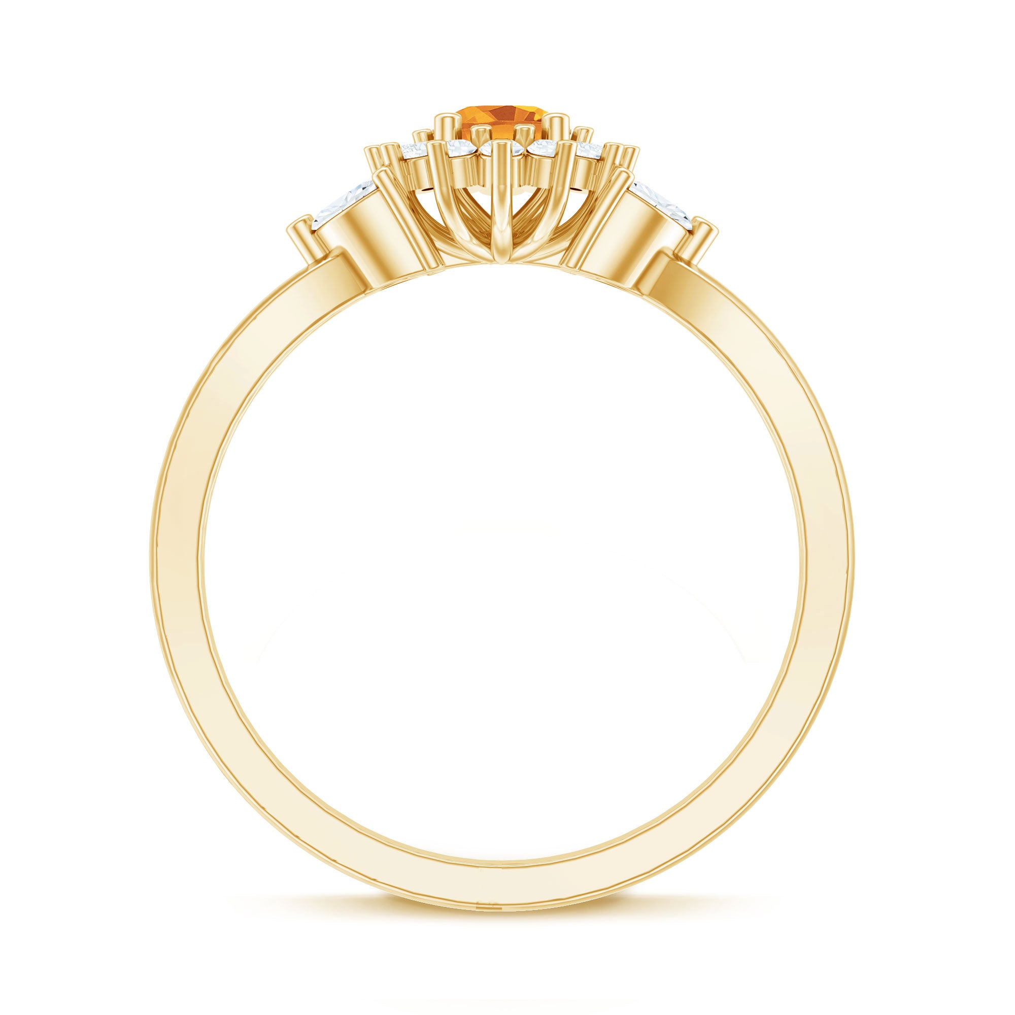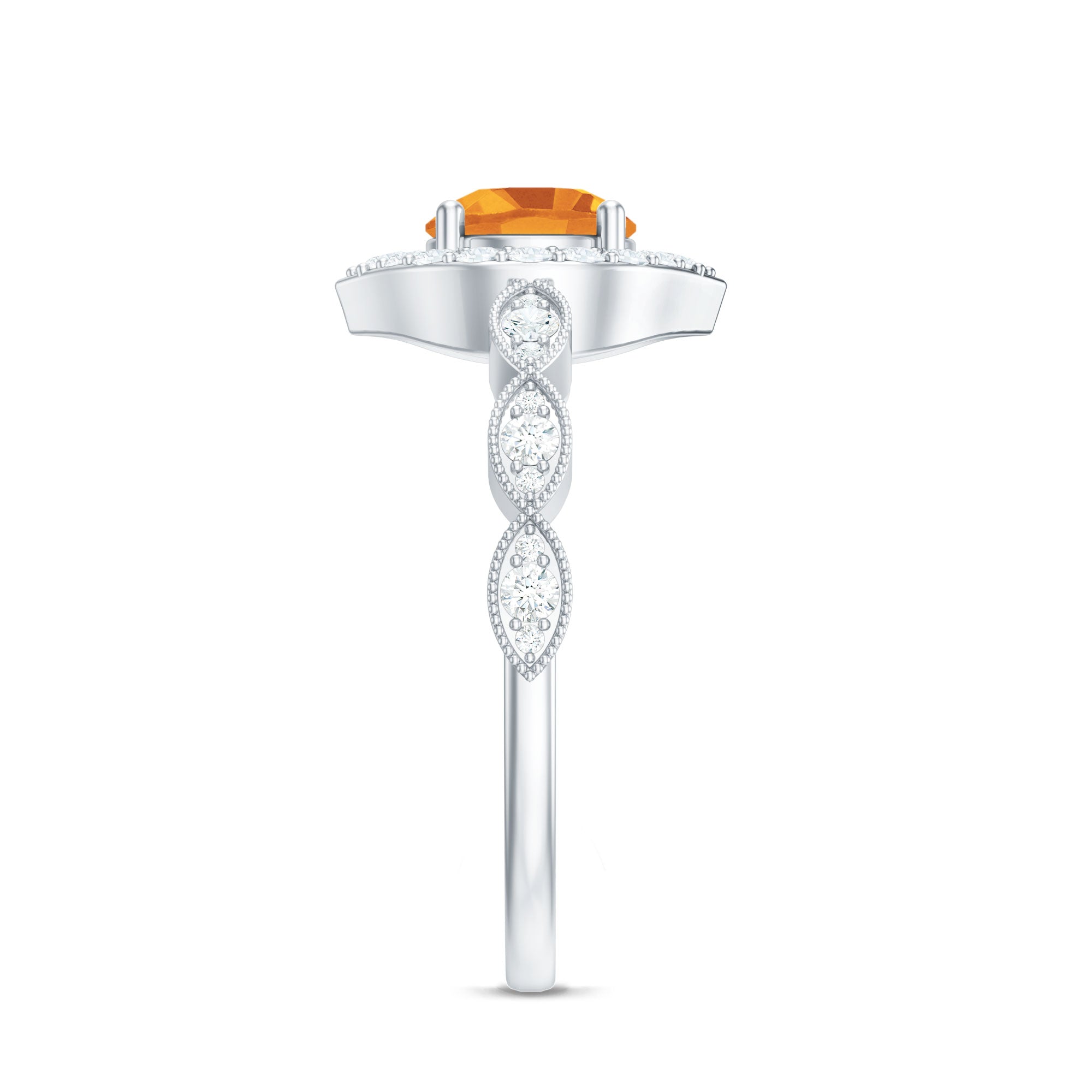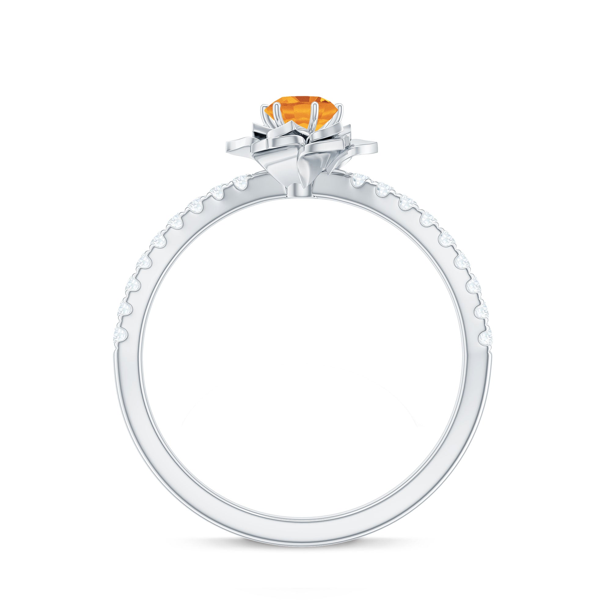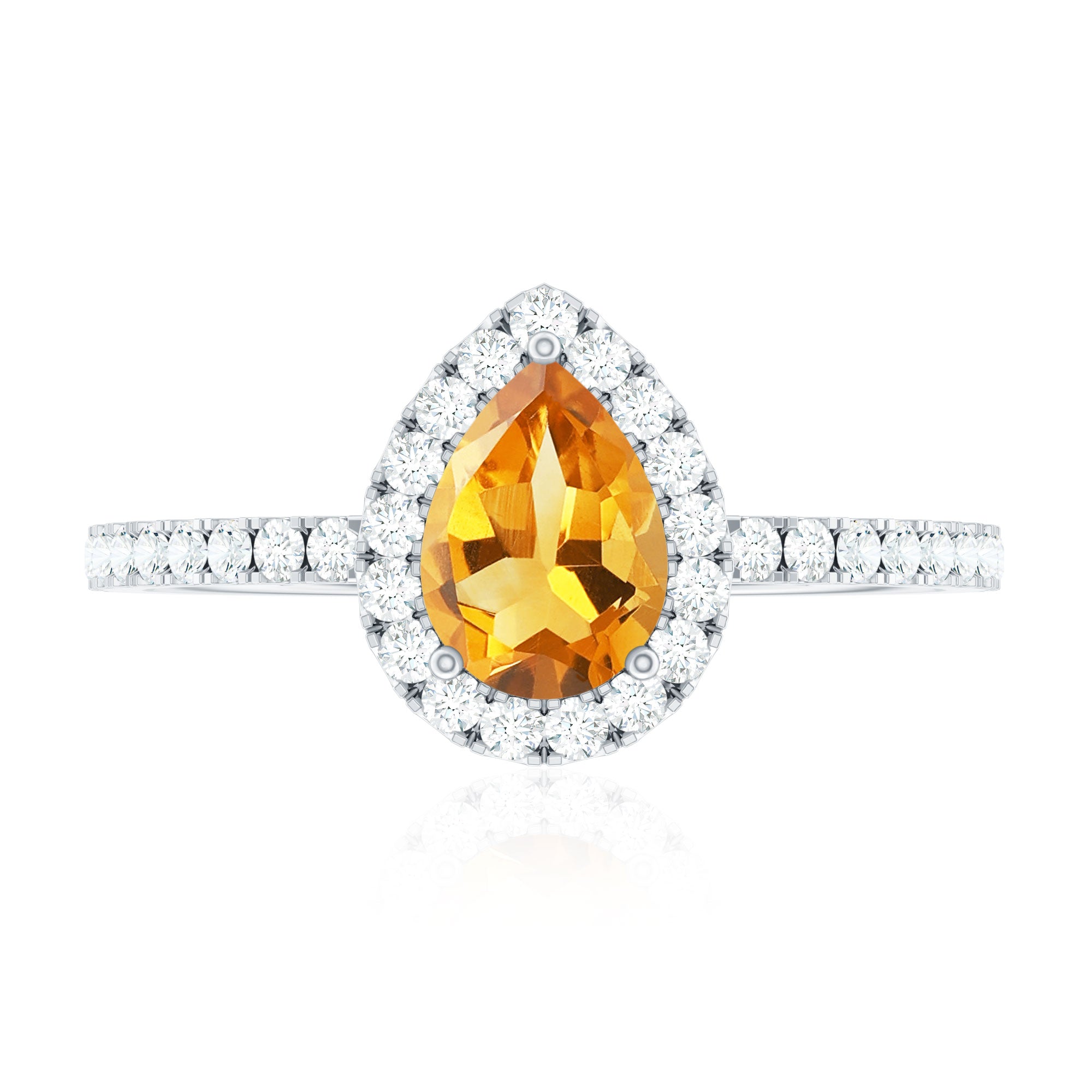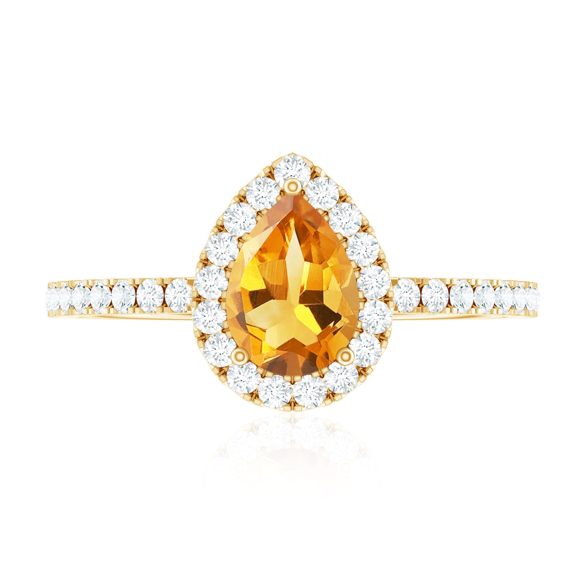 Features a citrine stone, that is a focal point, and small shimmery diamonds add an extra layer of shine & sparkle to the citrine centerpiece. The halo accent enhances the beauty and brilliance of the gem.