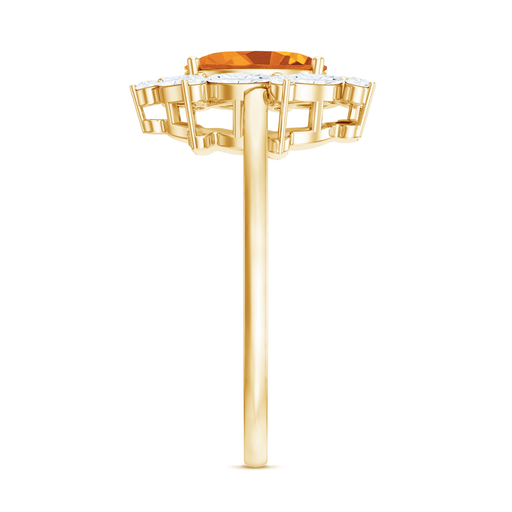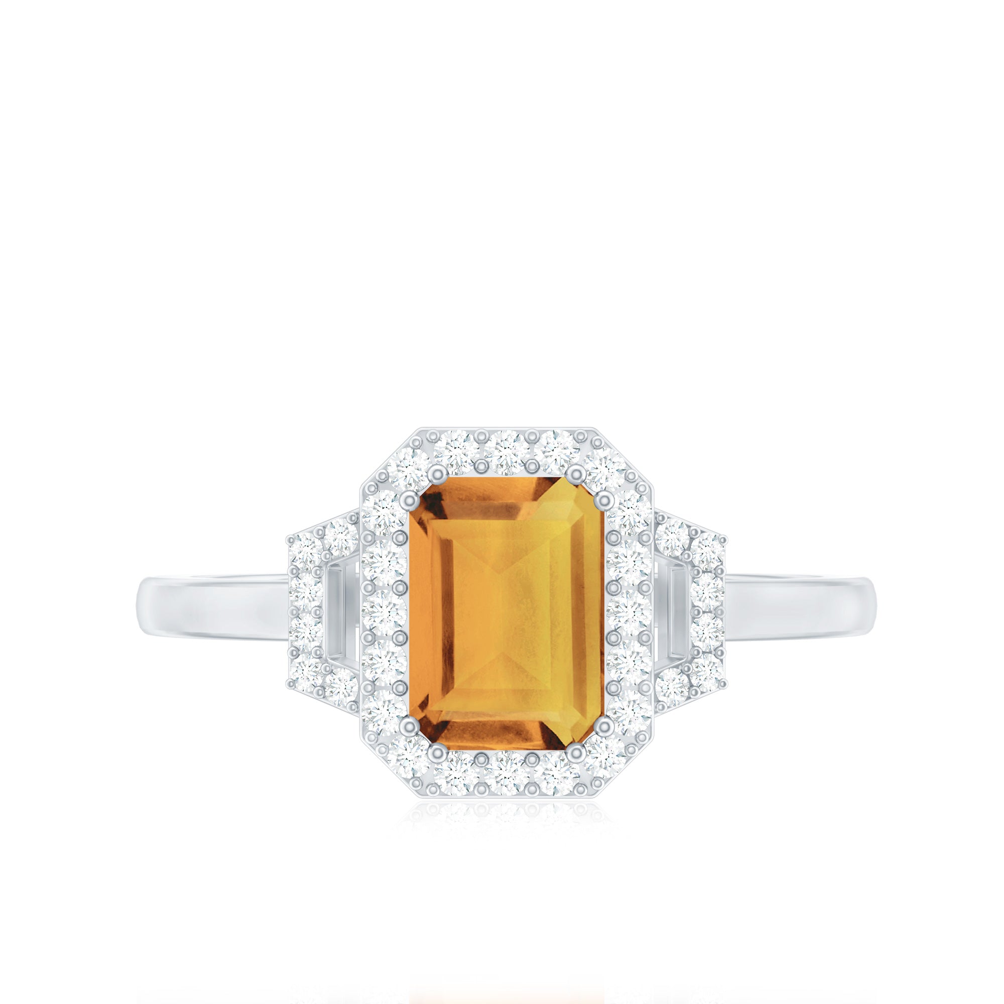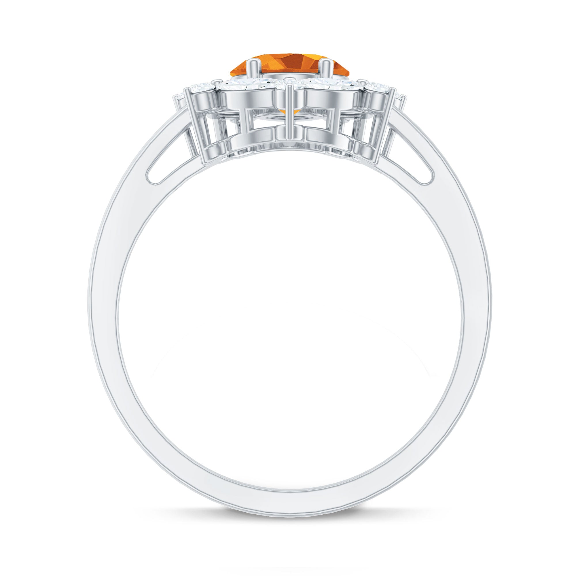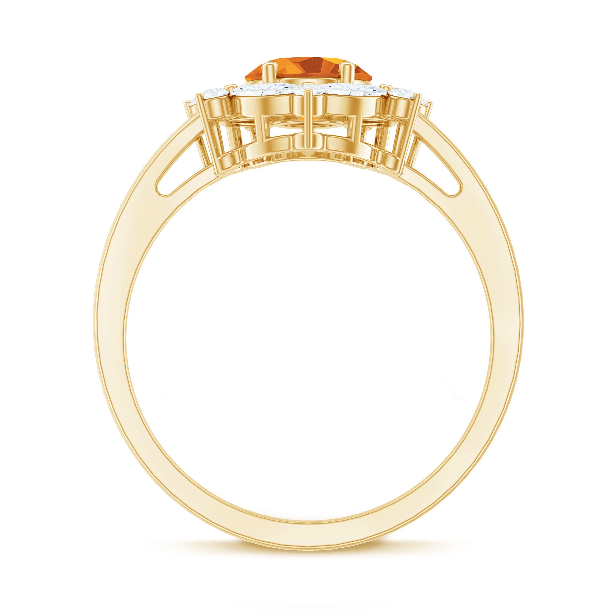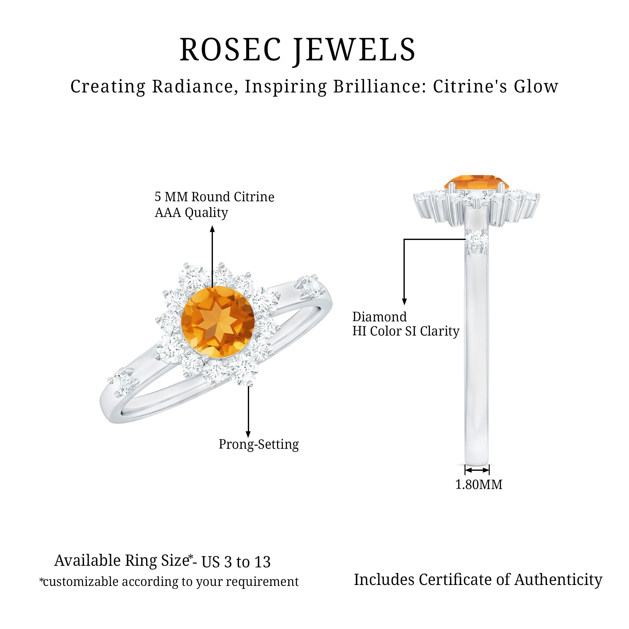 Features a citrine stone, that is a focal point, and small shimmery diamonds add an extra layer of shine & sparkle to the citrine centerpiece. The halo accent enhances the beauty and brilliance of the gem.