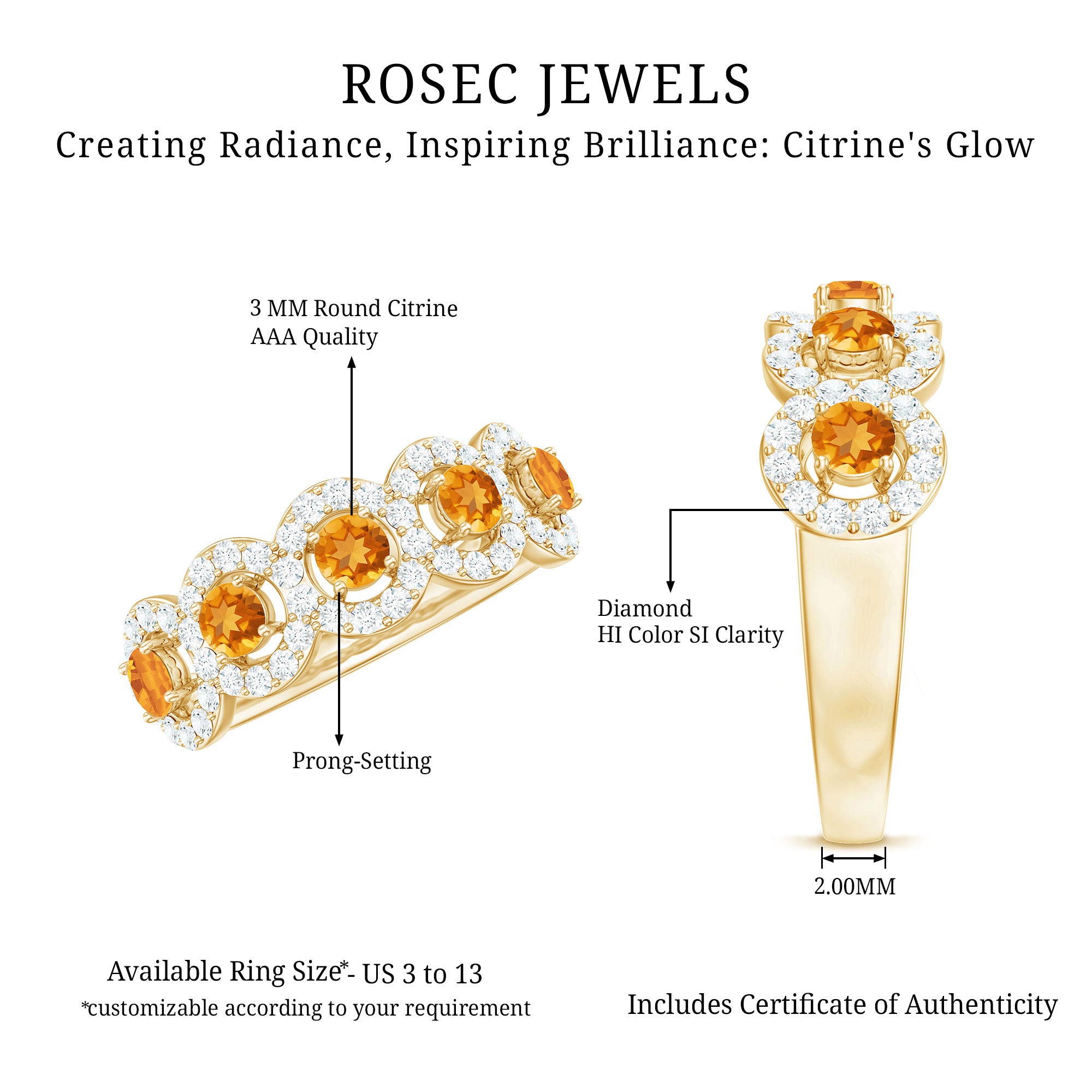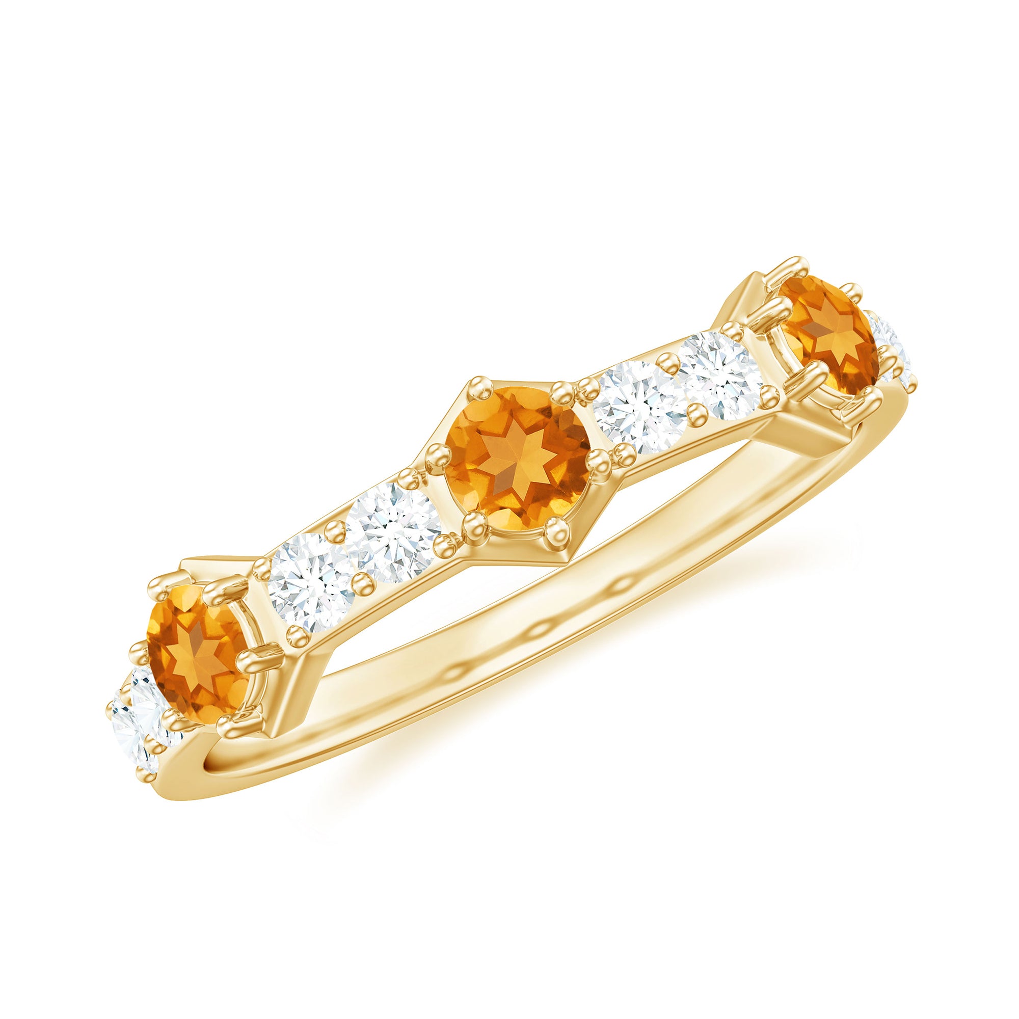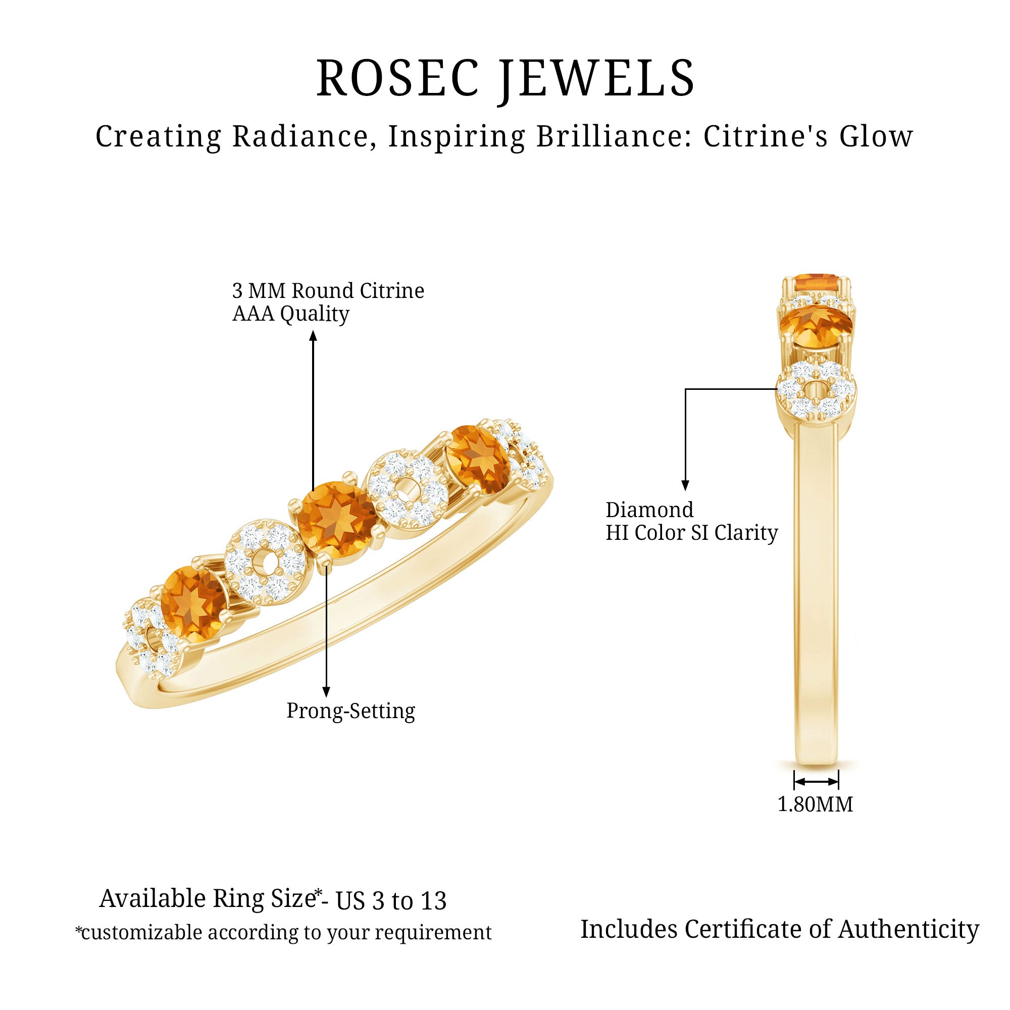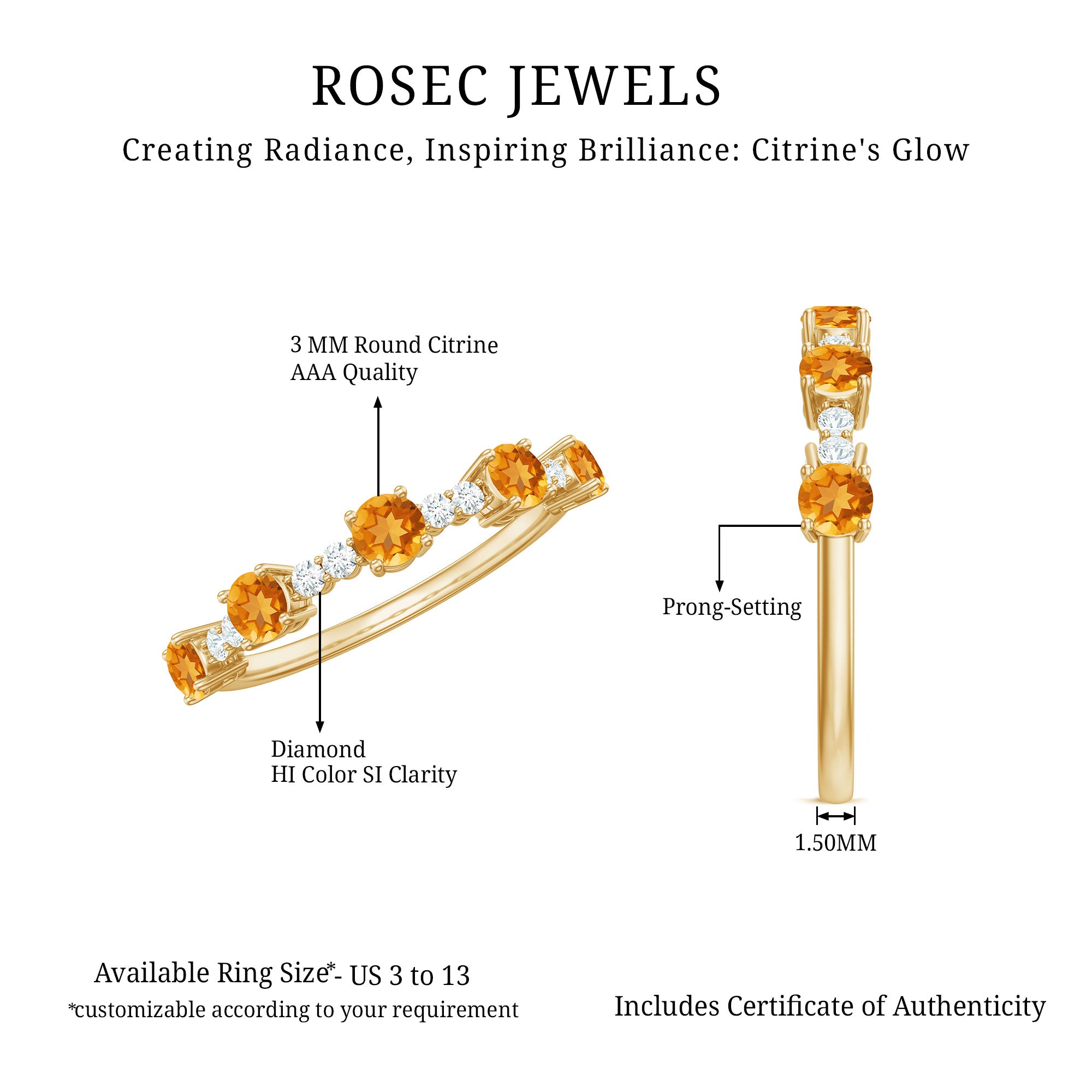 Rosec Jewels’ citrine wedding rings for women are the fruits of fine and excellent craftsmanship of our jewelry experts. In an attempt to create metamorphosis in jewelry for women, we aim towards blending traditions with latest trends to curate citrine rings that will appeal to the women of all class. A further diversification in our wedding ring styles is achieved by experimenting with different colors of citrine gold ring.