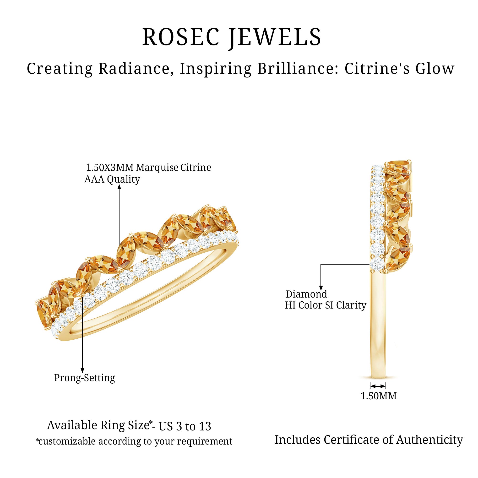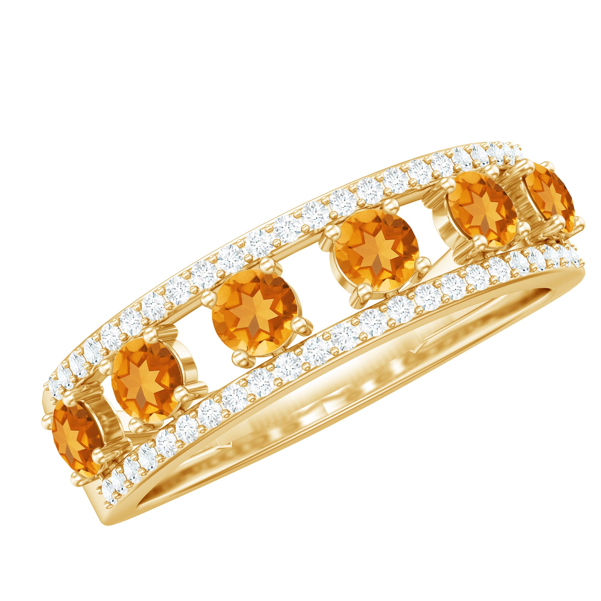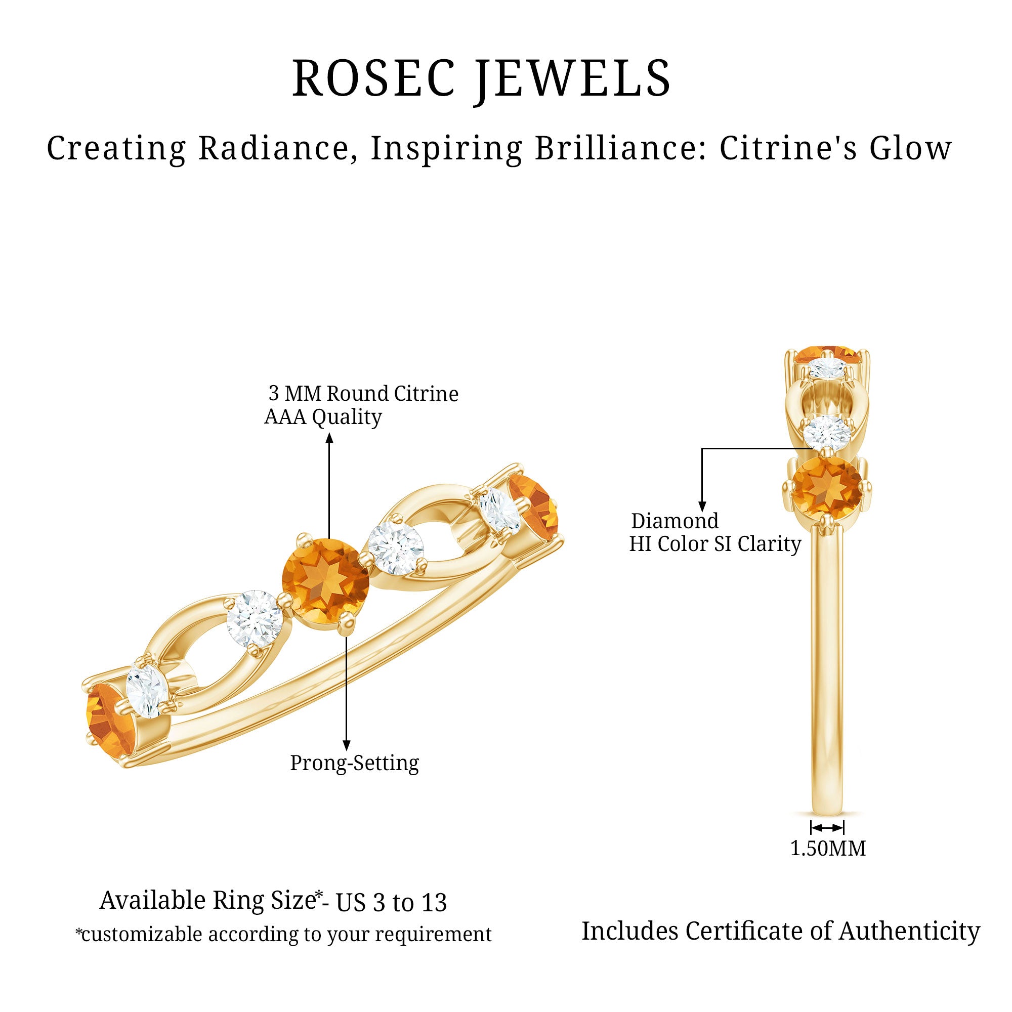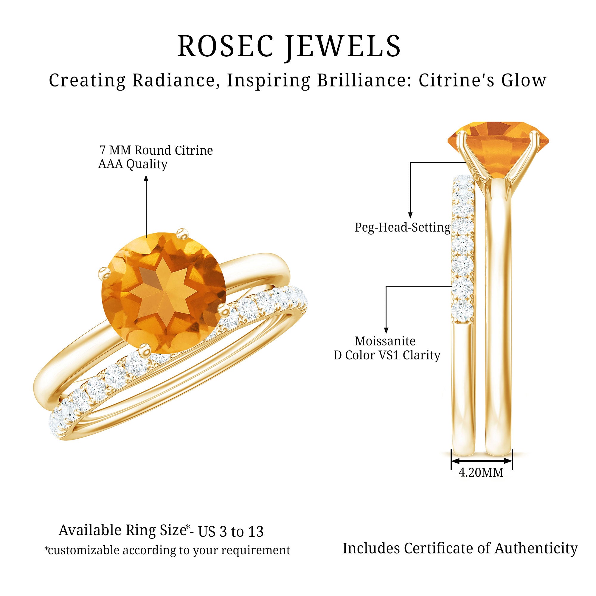Rosec Jewels’ citrine wedding rings for women are the fruits of fine and excellent craftsmanship of our jewelry experts. In an attempt to create metamorphosis in jewelry for women, we aim towards blending traditions with latest trends to curate citrine rings that will appeal to the women of all class. A further diversification in our wedding ring styles is achieved by experimenting with different colors of citrine gold ring.