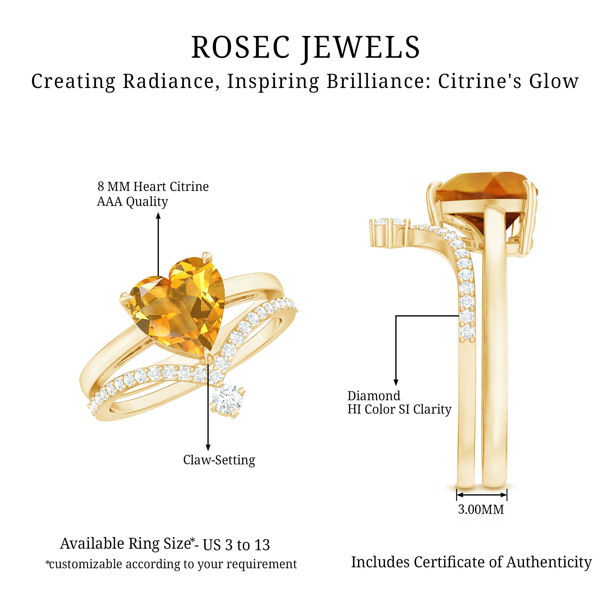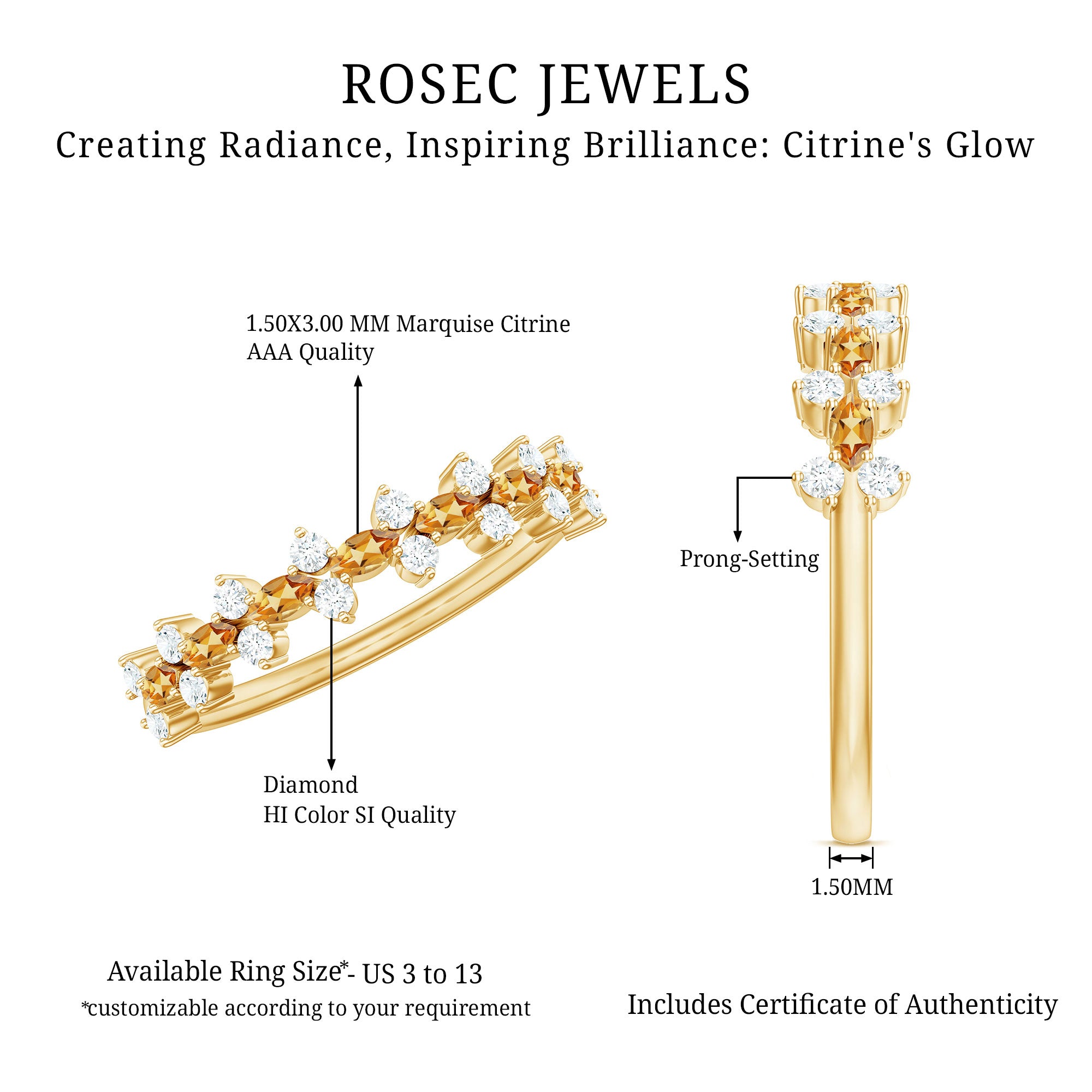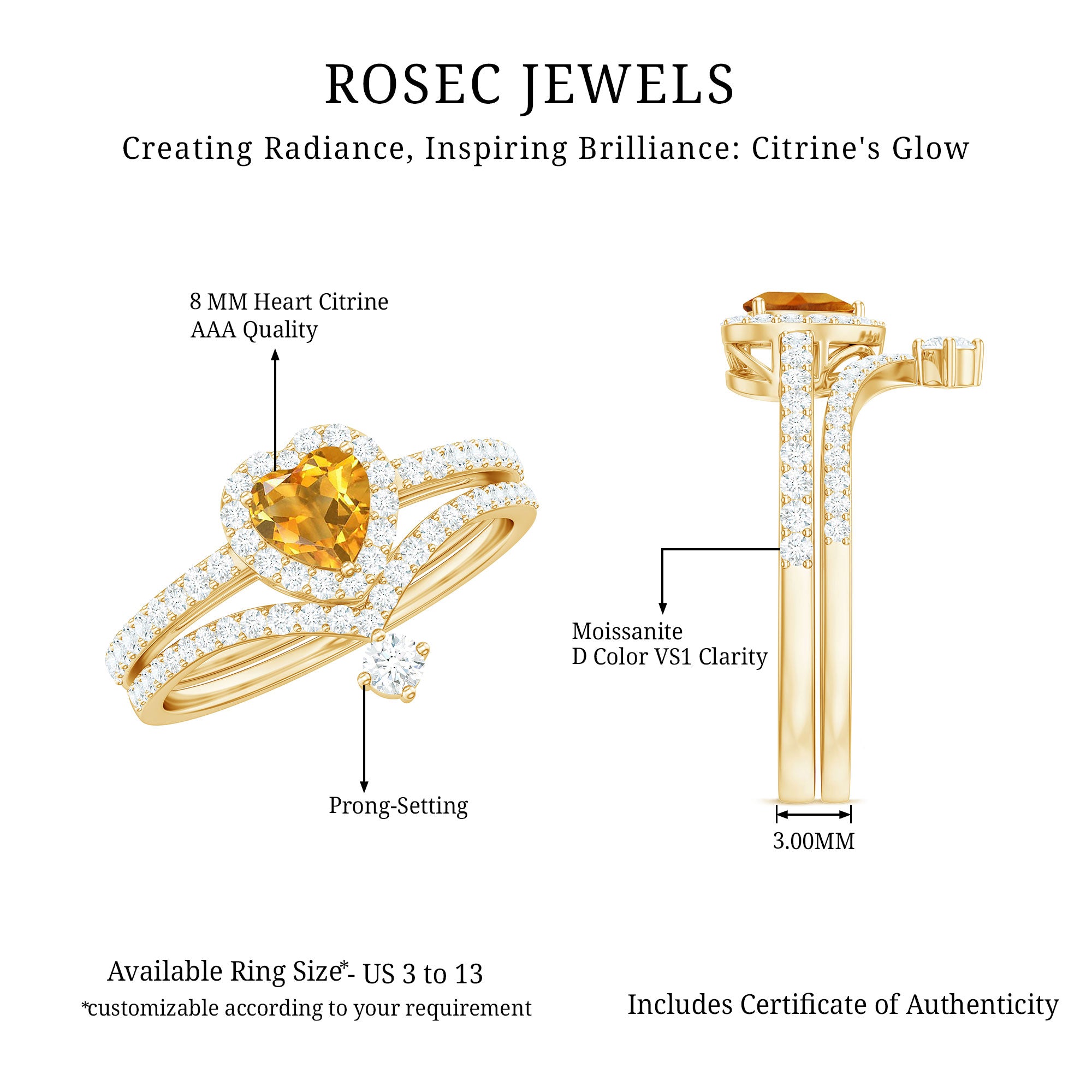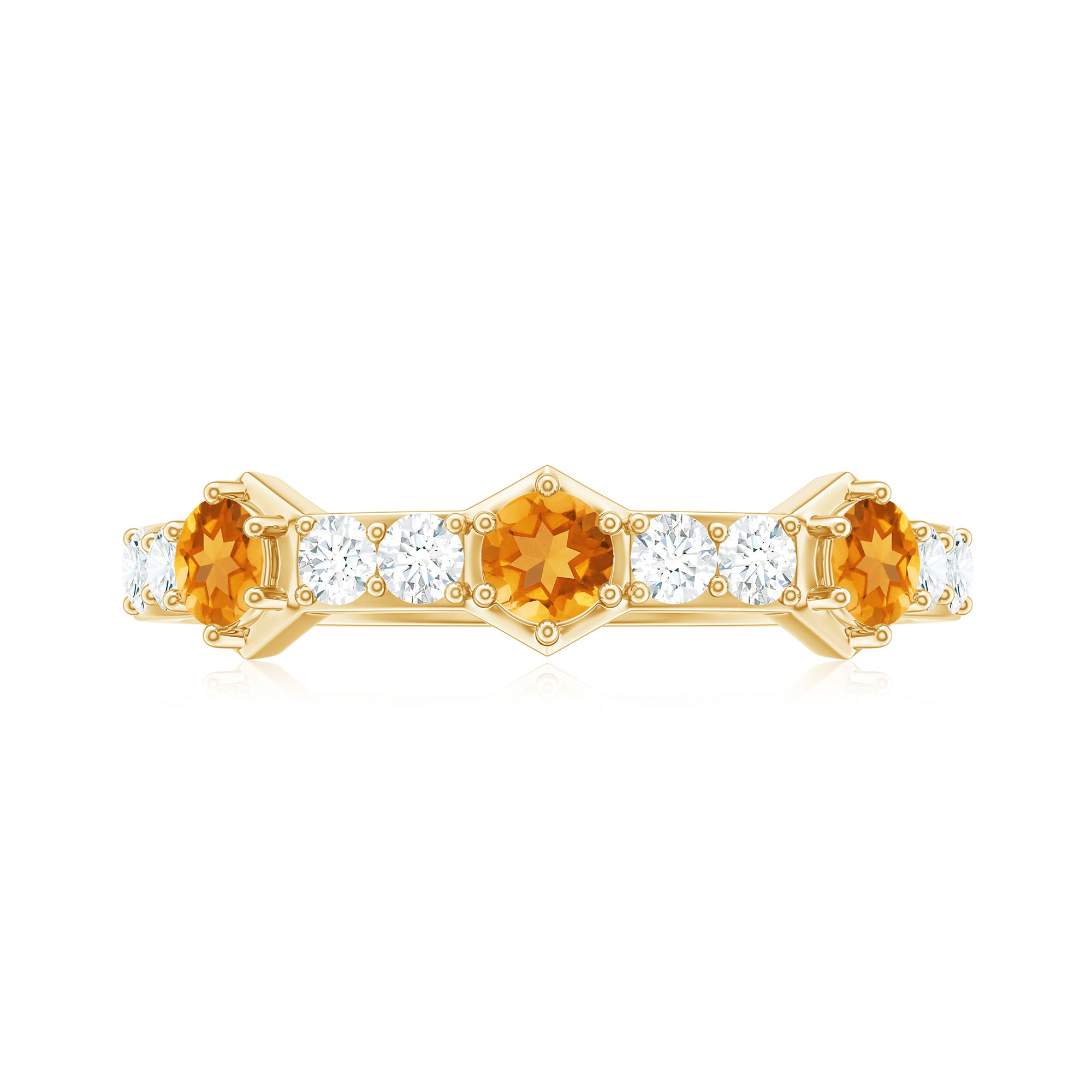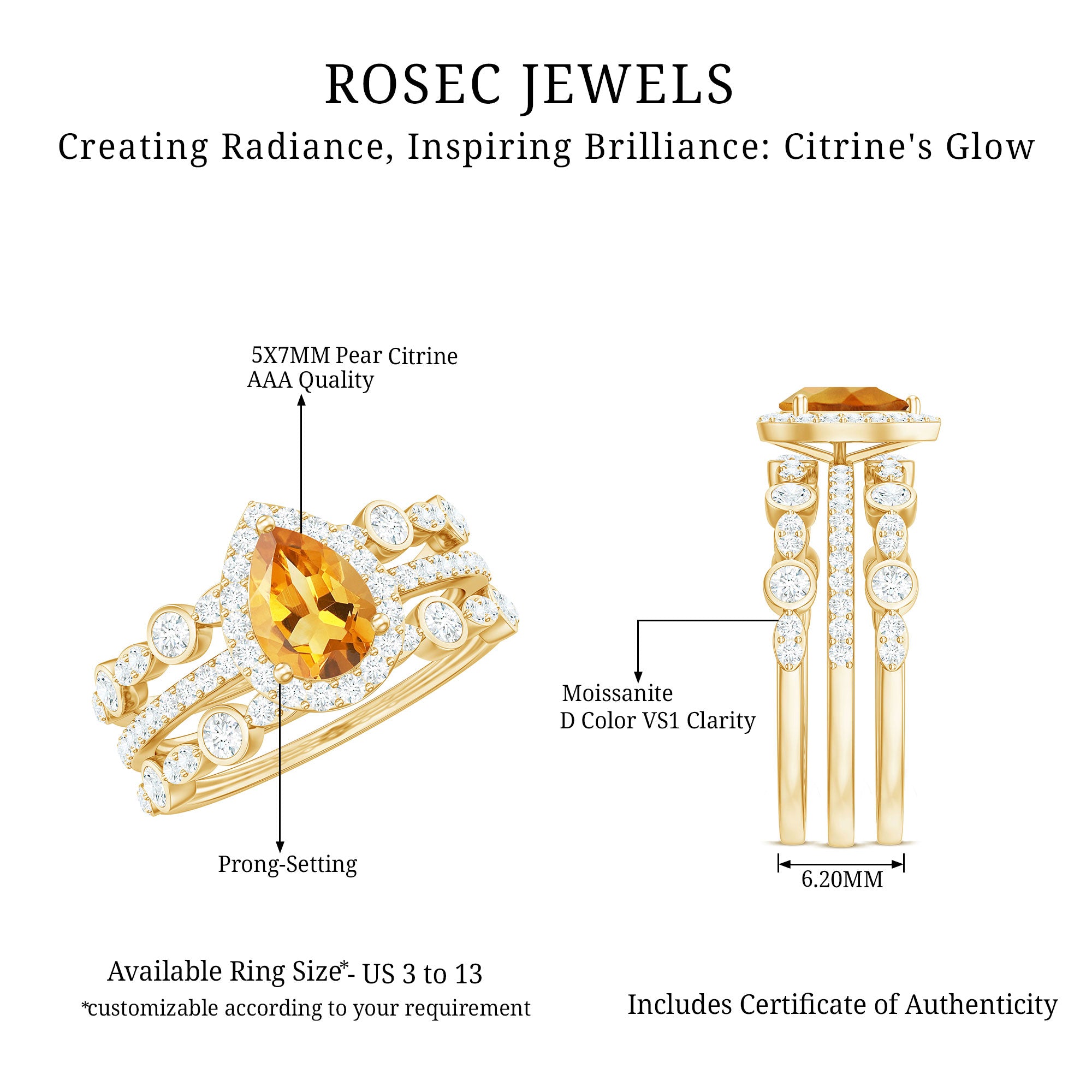 Rosec Jewels’ citrine wedding rings for women are the fruits of fine and excellent craftsmanship of our jewelry experts. In an attempt to create metamorphosis in jewelry for women, we aim towards blending traditions with latest trends to curate citrine rings that will appeal to the women of all class. A further diversification in our wedding ring styles is achieved by experimenting with different colors of citrine gold ring.