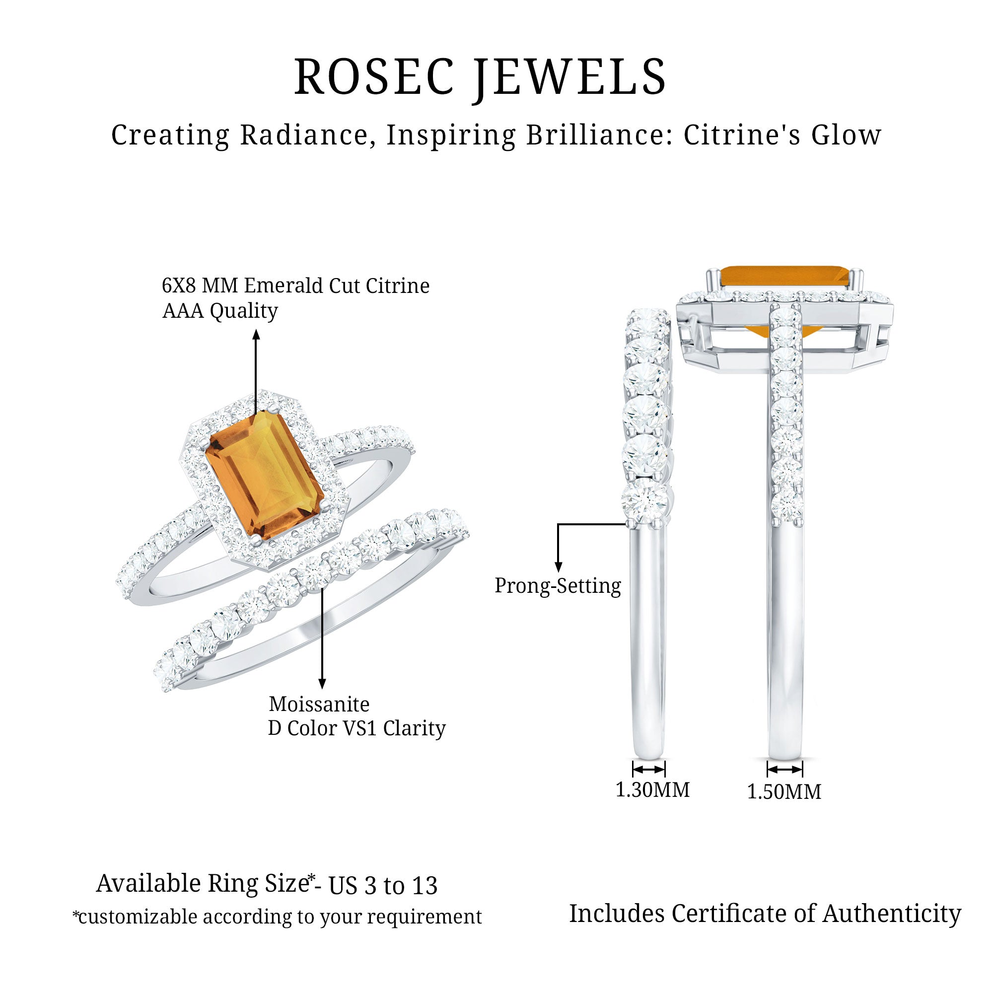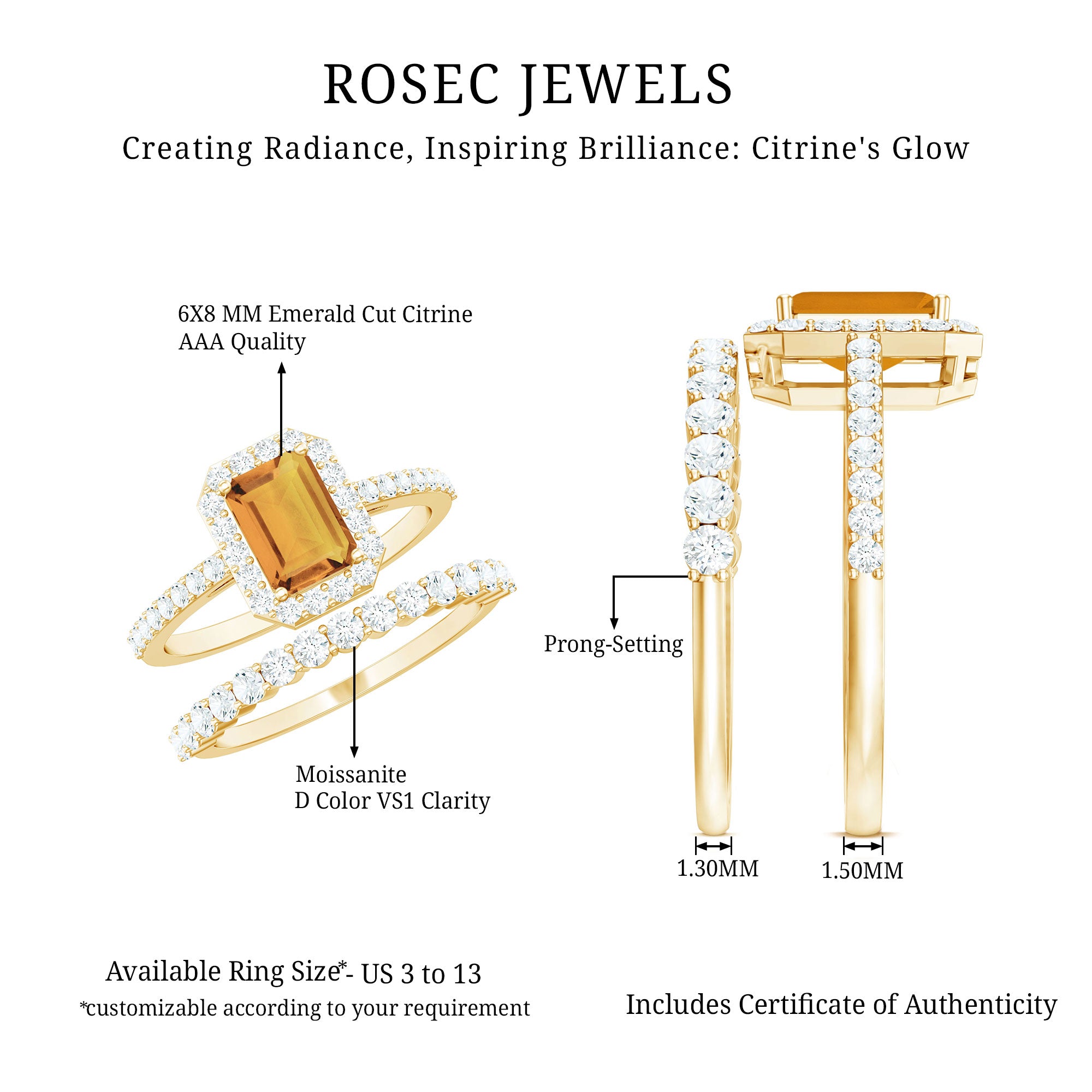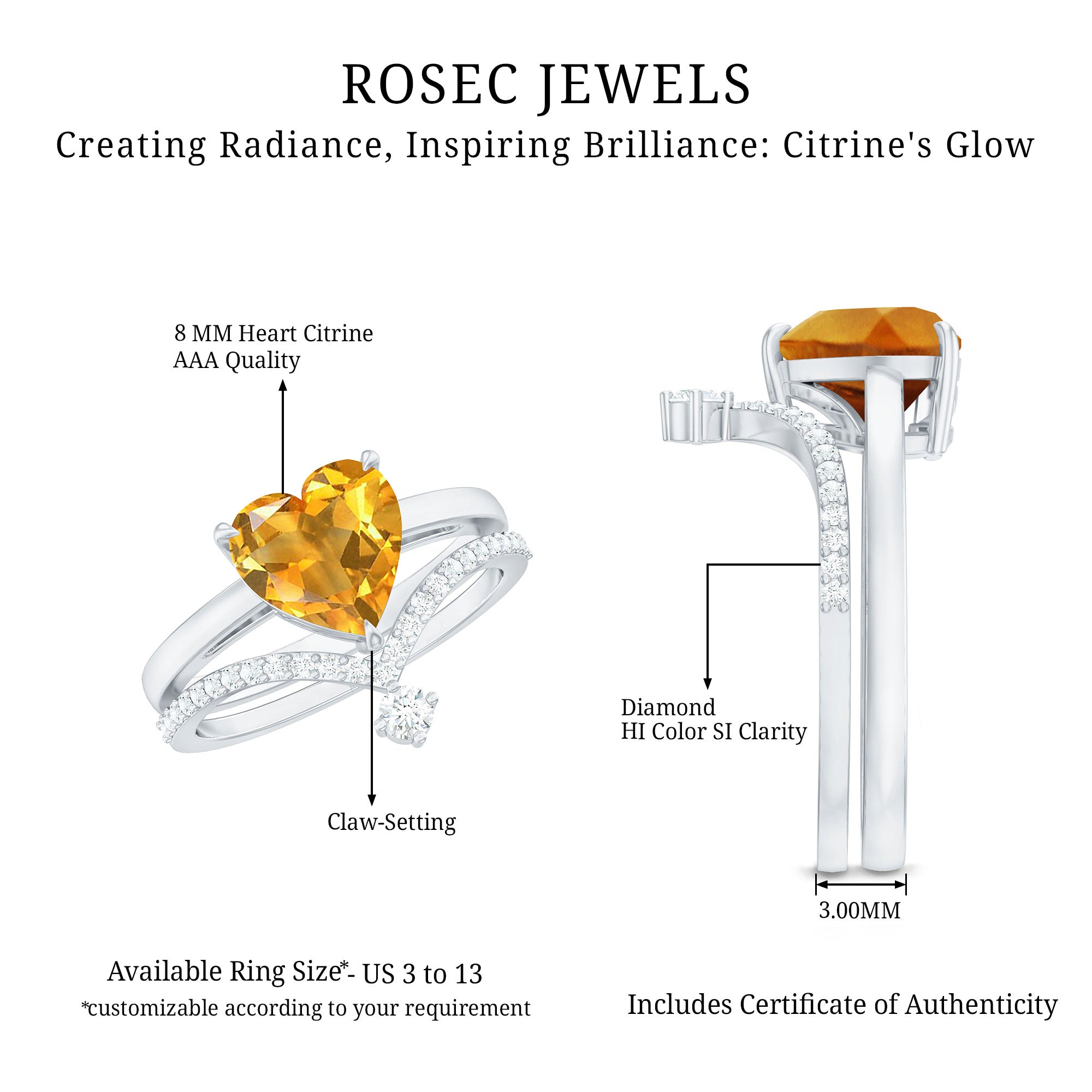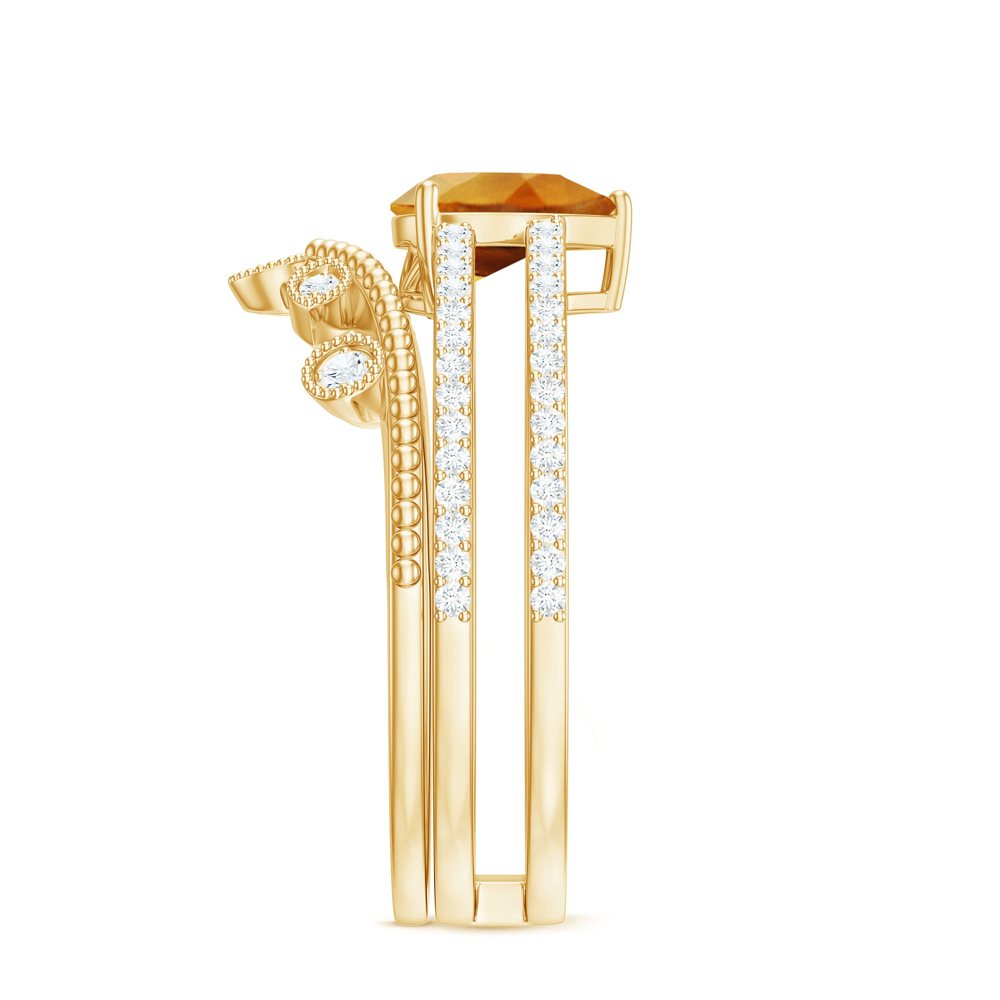 Rosec Jewels’ citrine wedding rings for women are the fruits of fine and excellent craftsmanship of our jewelry experts. In an attempt to create metamorphosis in jewelry for women, we aim towards blending traditions with latest trends to curate citrine rings that will appeal to the women of all class. A further diversification in our wedding ring styles is achieved by experimenting with different colors of citrine gold ring.