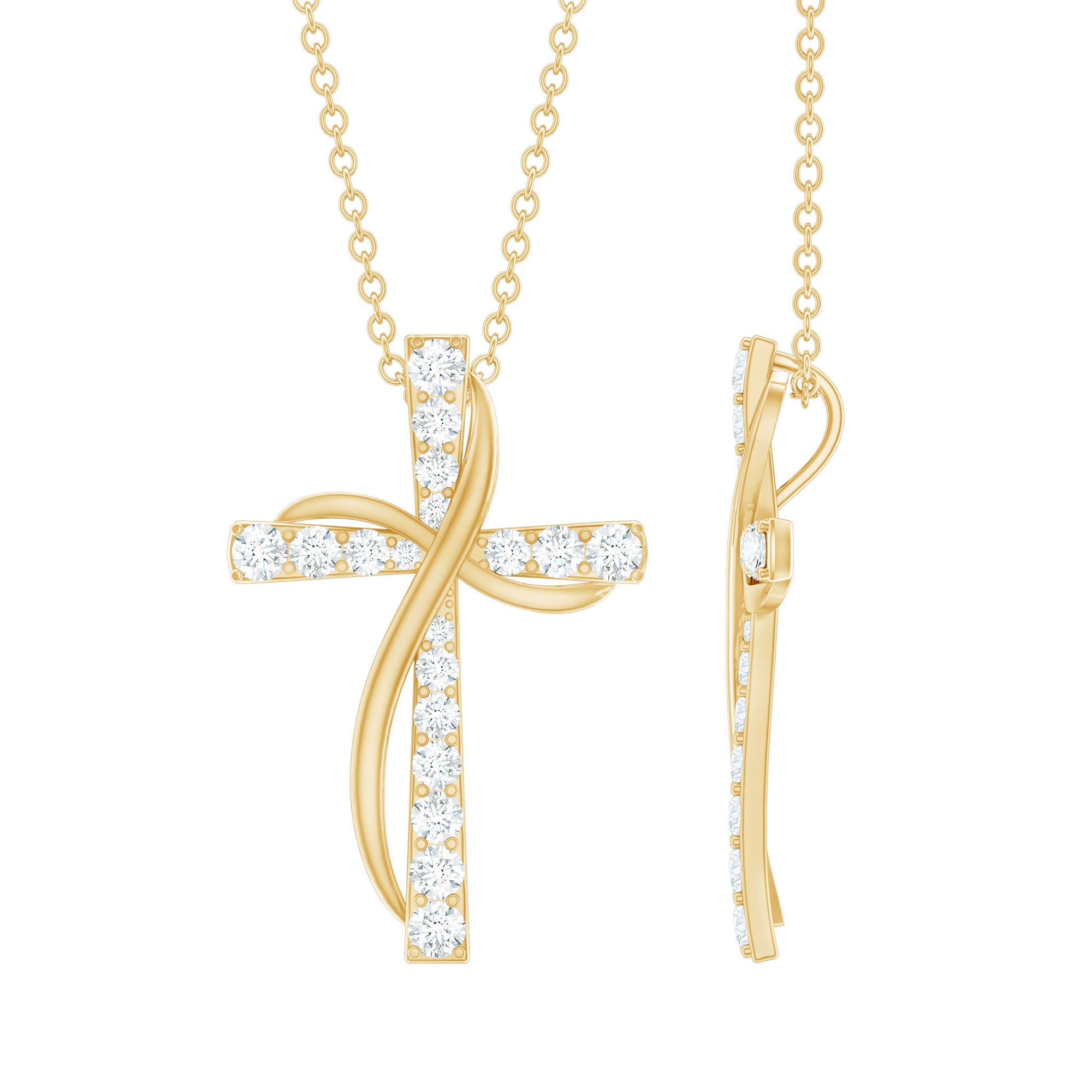 Cross pendant with chain come in 14K solid gold metal that can be obtained in yellow, white and rose gold.