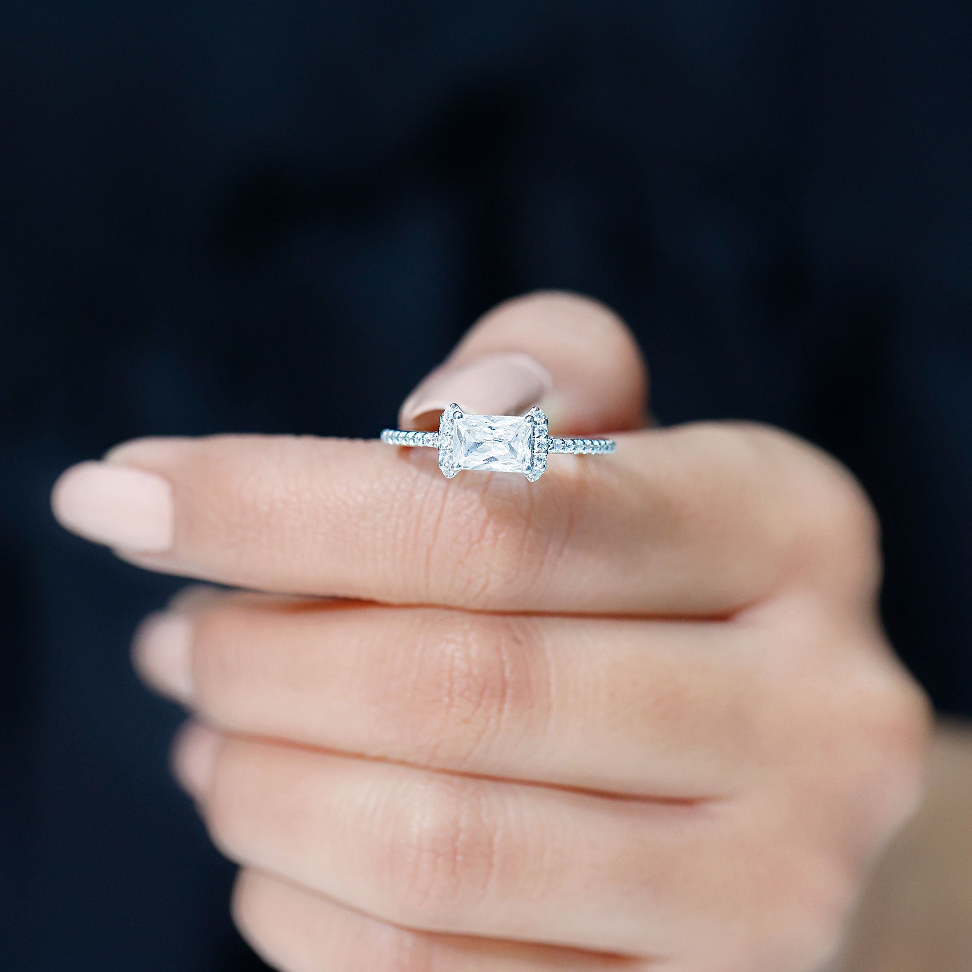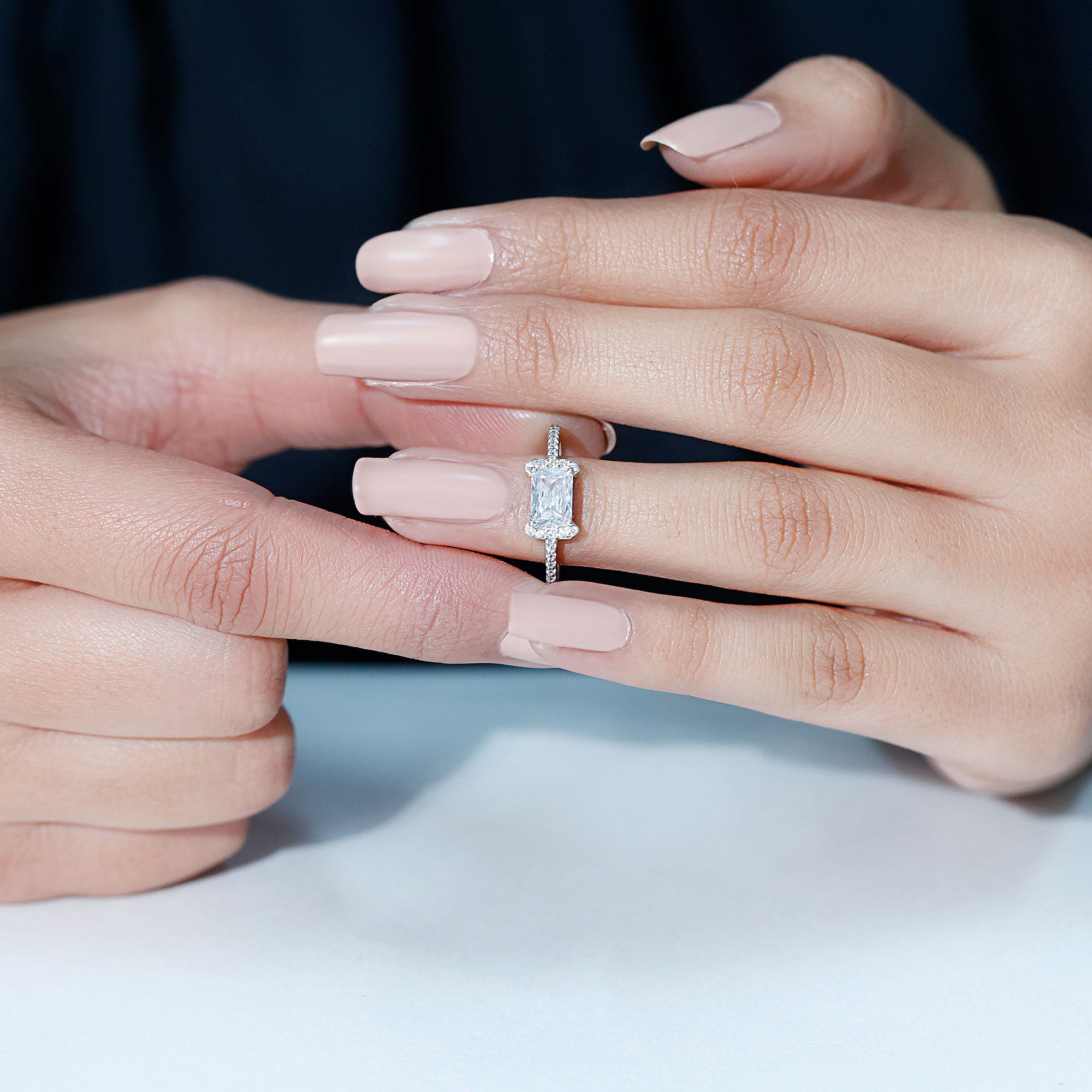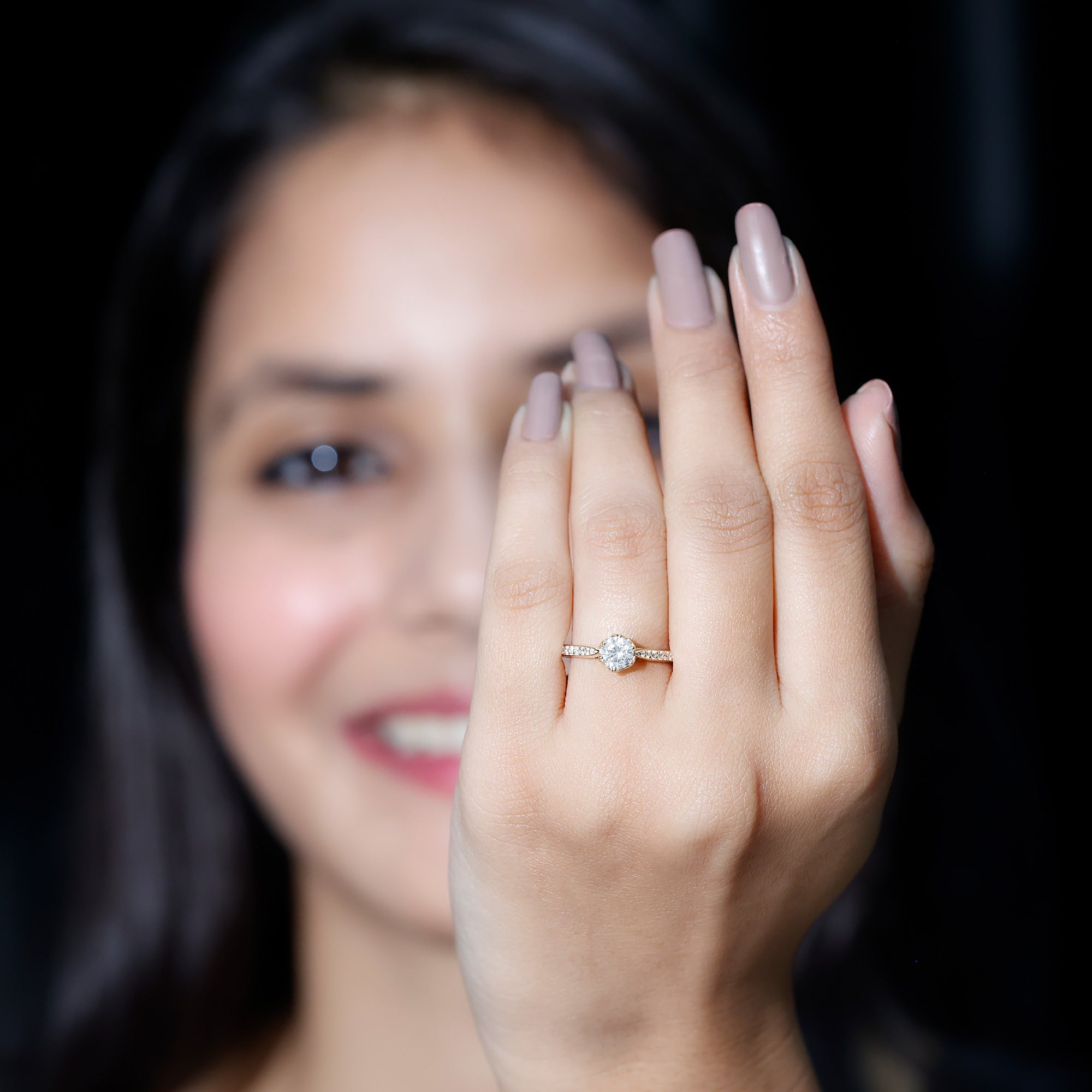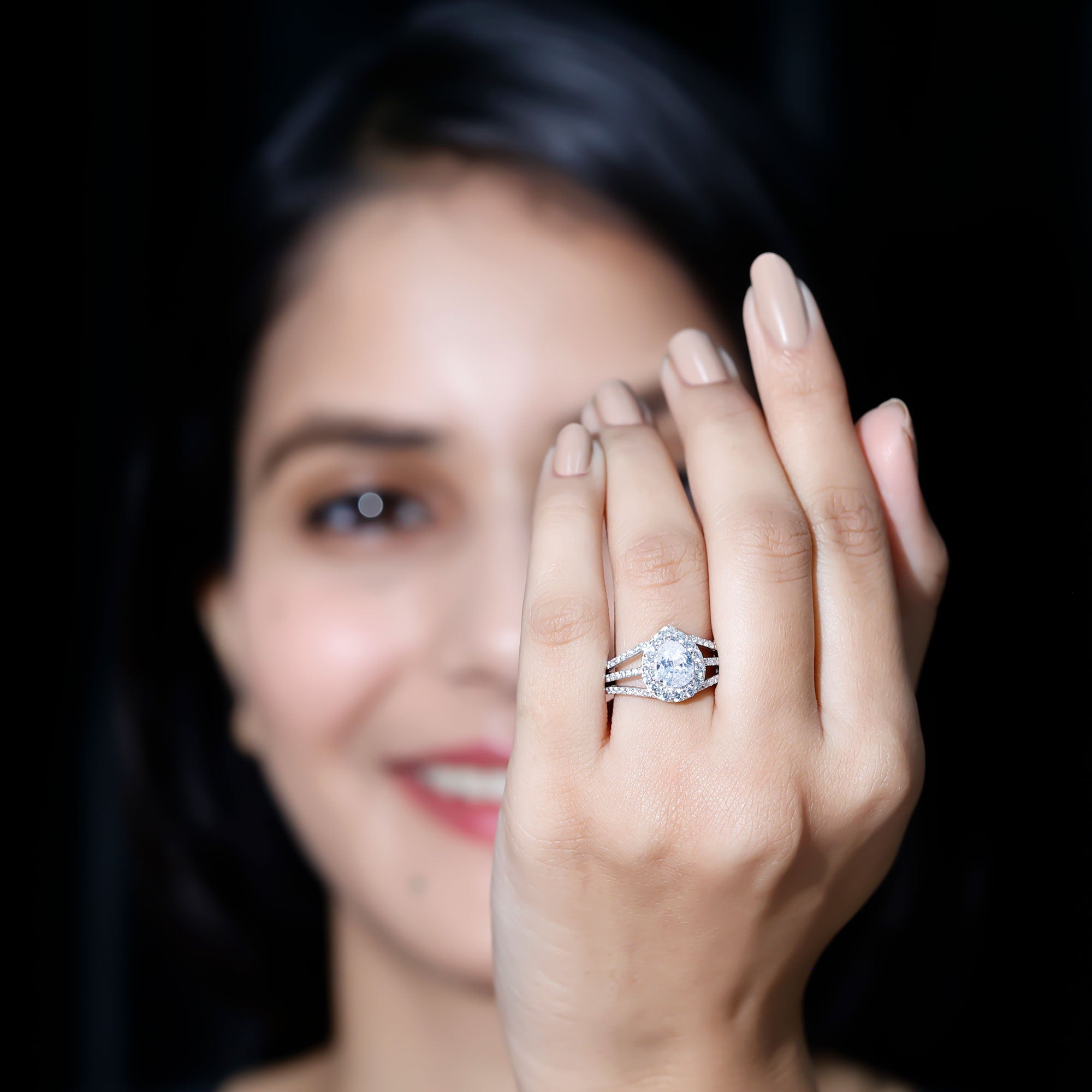 Standing out for its glitz and glam, a Halo encircles the Center Stone with a row of shimmering Cubic Zirconia. As an added advantage, the extra layer of sparkles here deceives the eye by making the center stone appear larger in size. So, if she is all about the bling, a Halo Style Cubic Zirconia Engagement Ring for Women seems like the perfect pick.