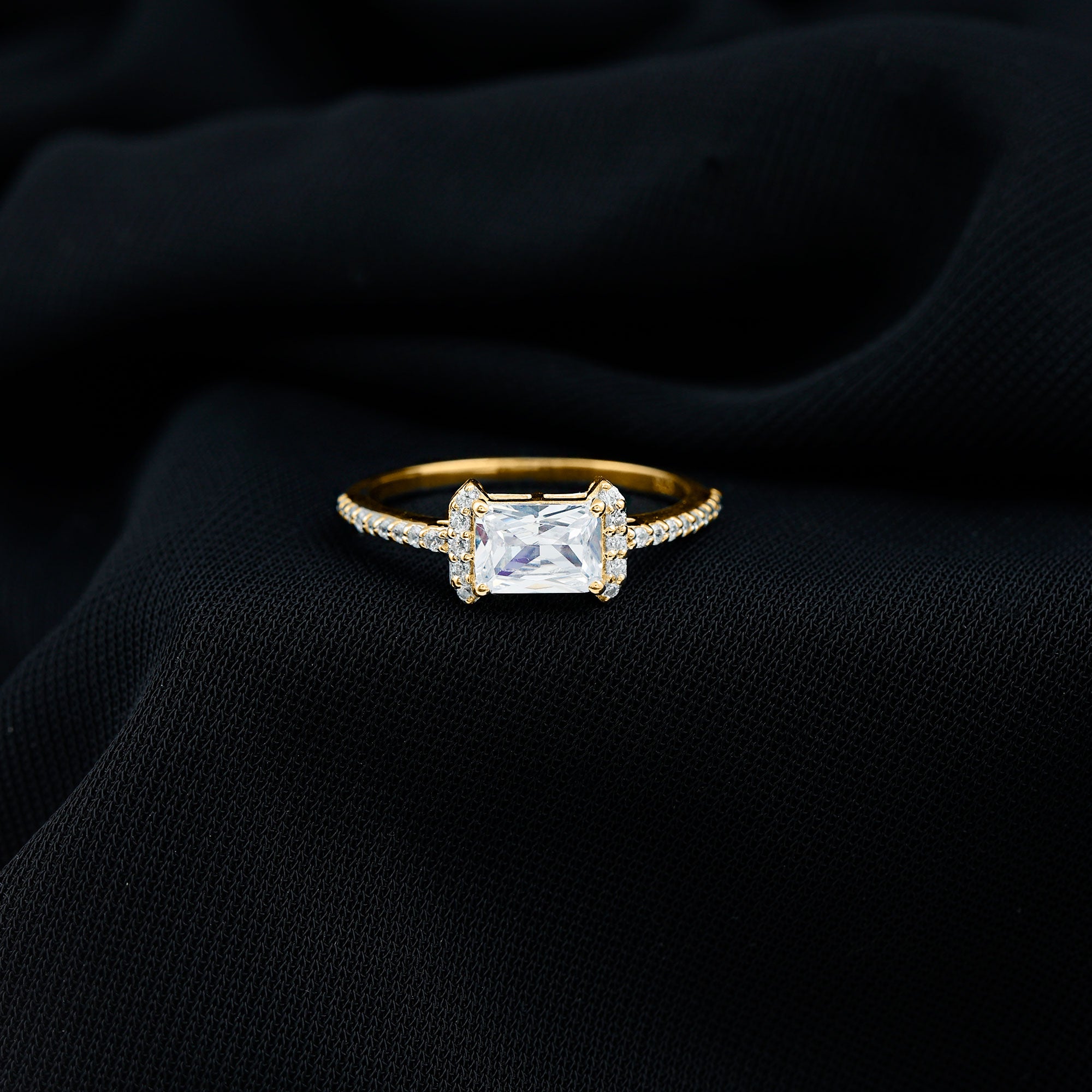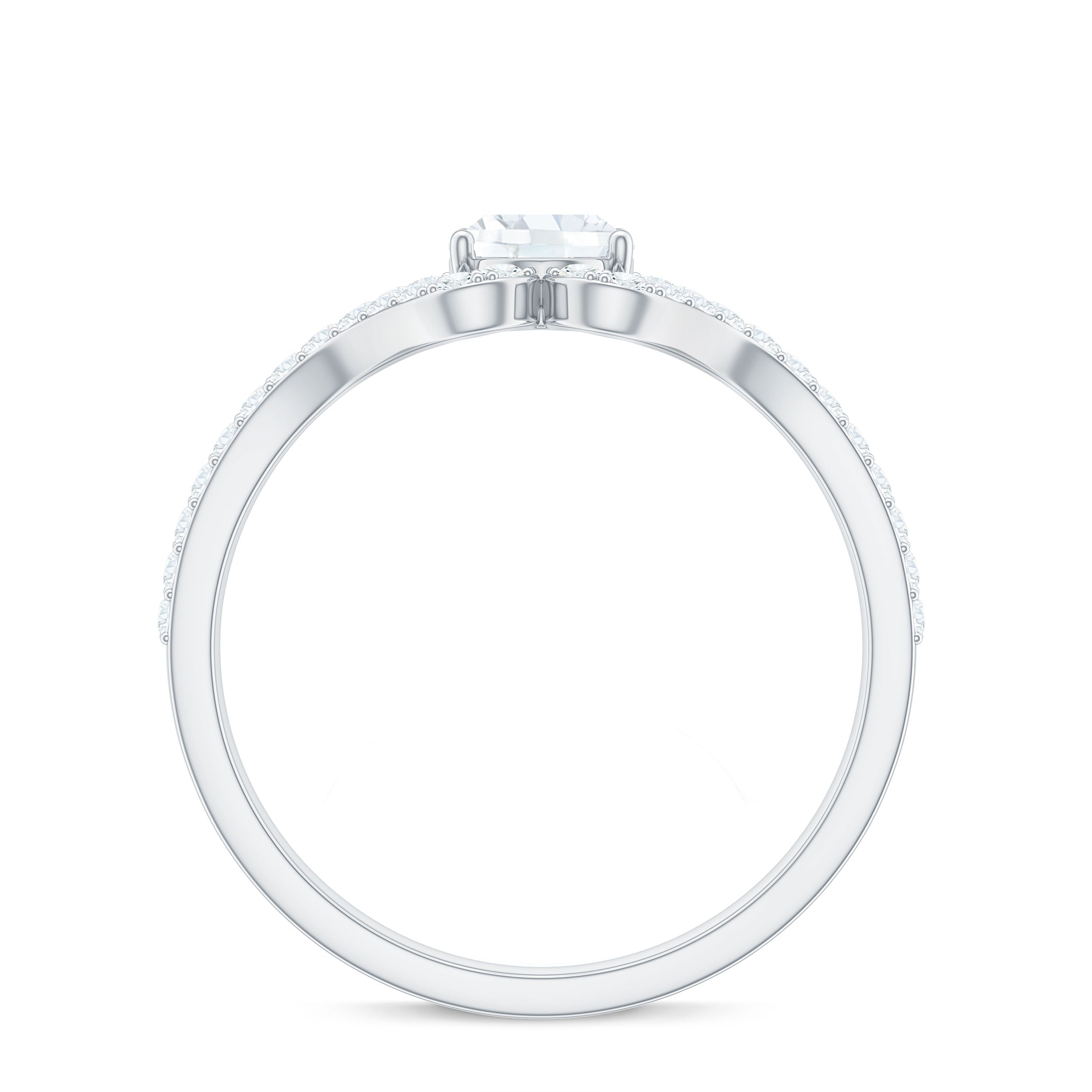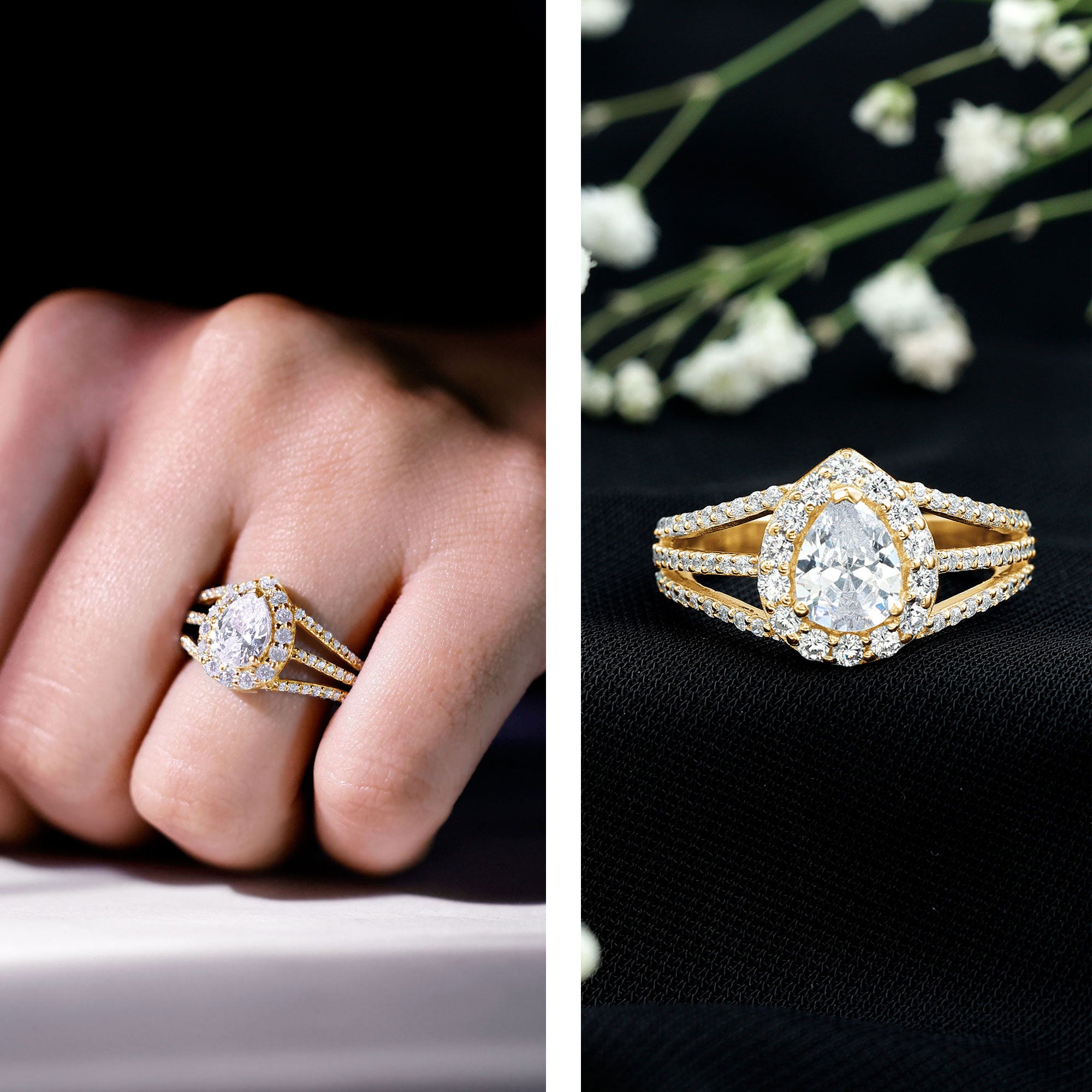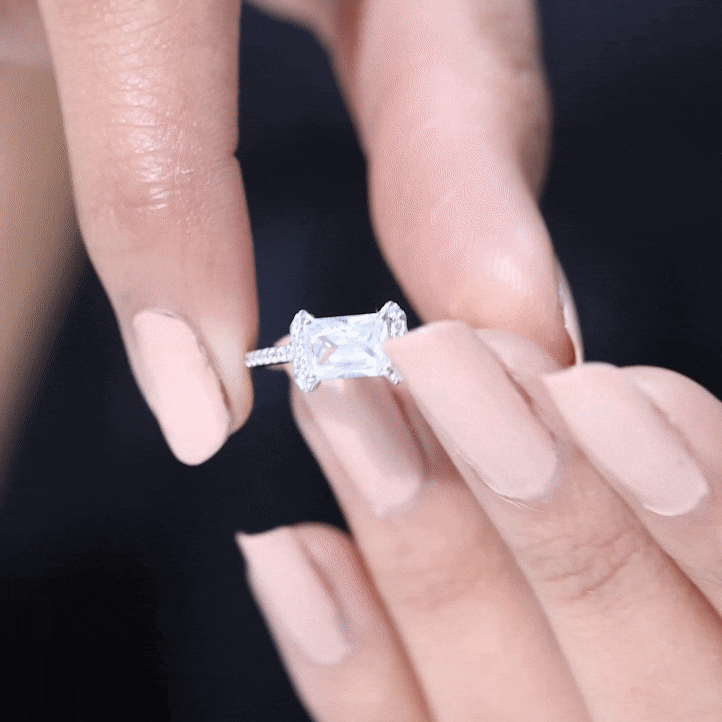 Unconventional and uniquely flashy, this ring style is encased with three stones of Cubic Zirconia arranged uniformly in a row. If you fancy more sparkles in your betrothal ring, a three stone ring is the way forward (since three stones means triple the sparkles). While a Round or Oval Cubic Zirconia Engagement Rings are the most classic options in this ring style, those adorned with Pear, Princess, Cushion, and Emerald Cut are also soaring in popularity. Behind its eye-striking aesthetics, it speaks to each couple uniquely since each of the three stones here sheds light on the couple’s past, present, and future respectively.