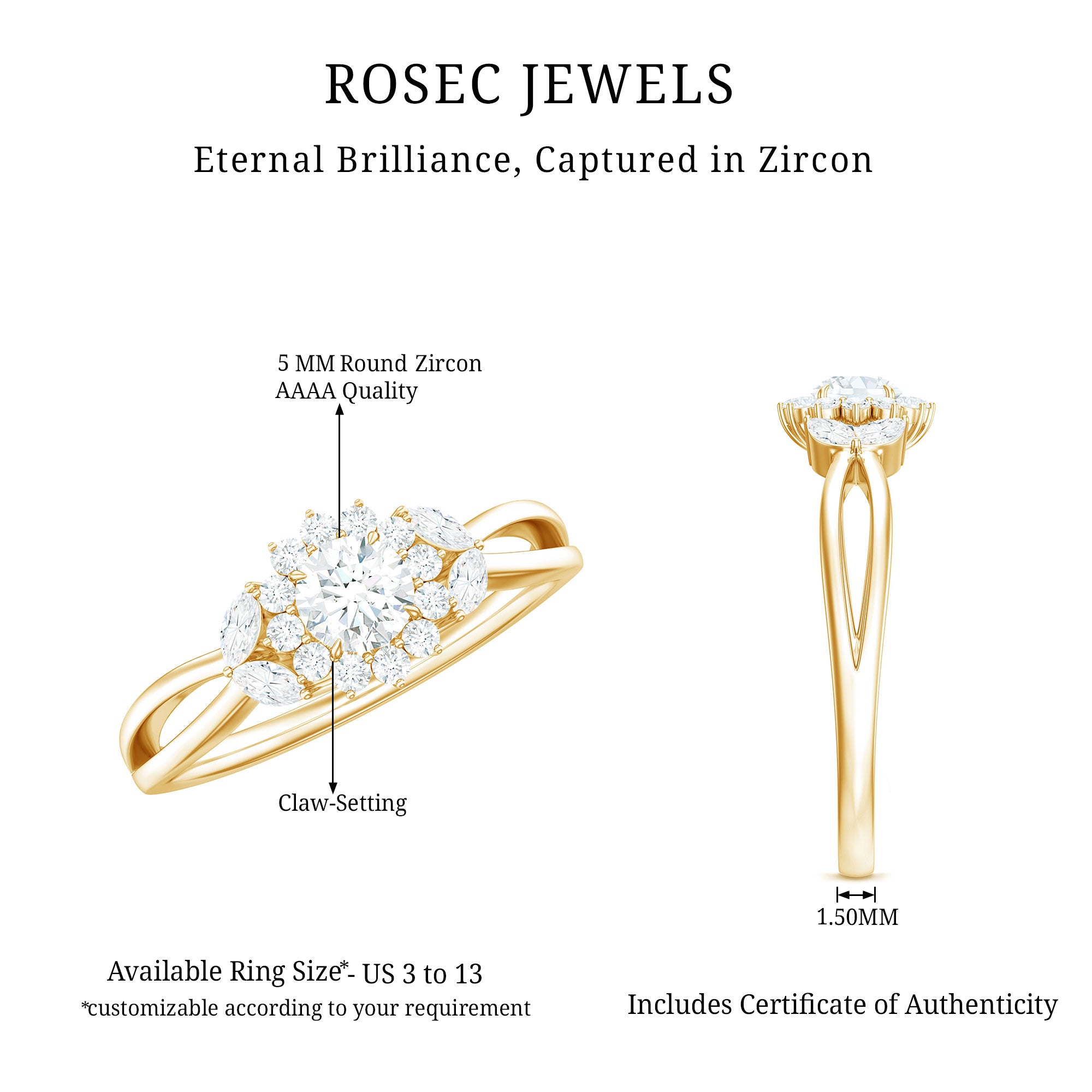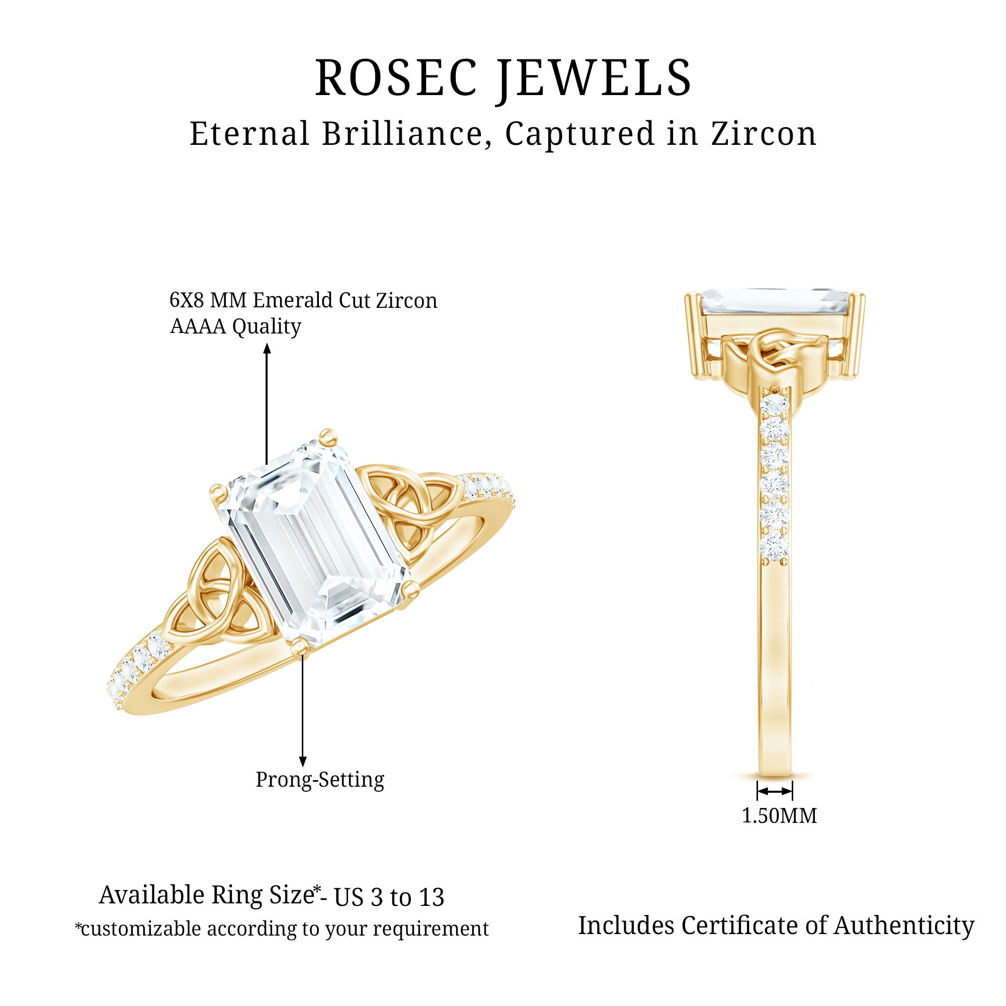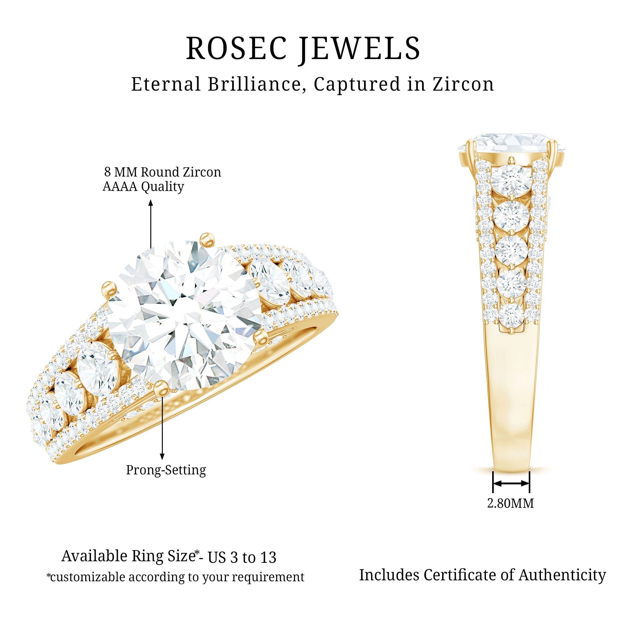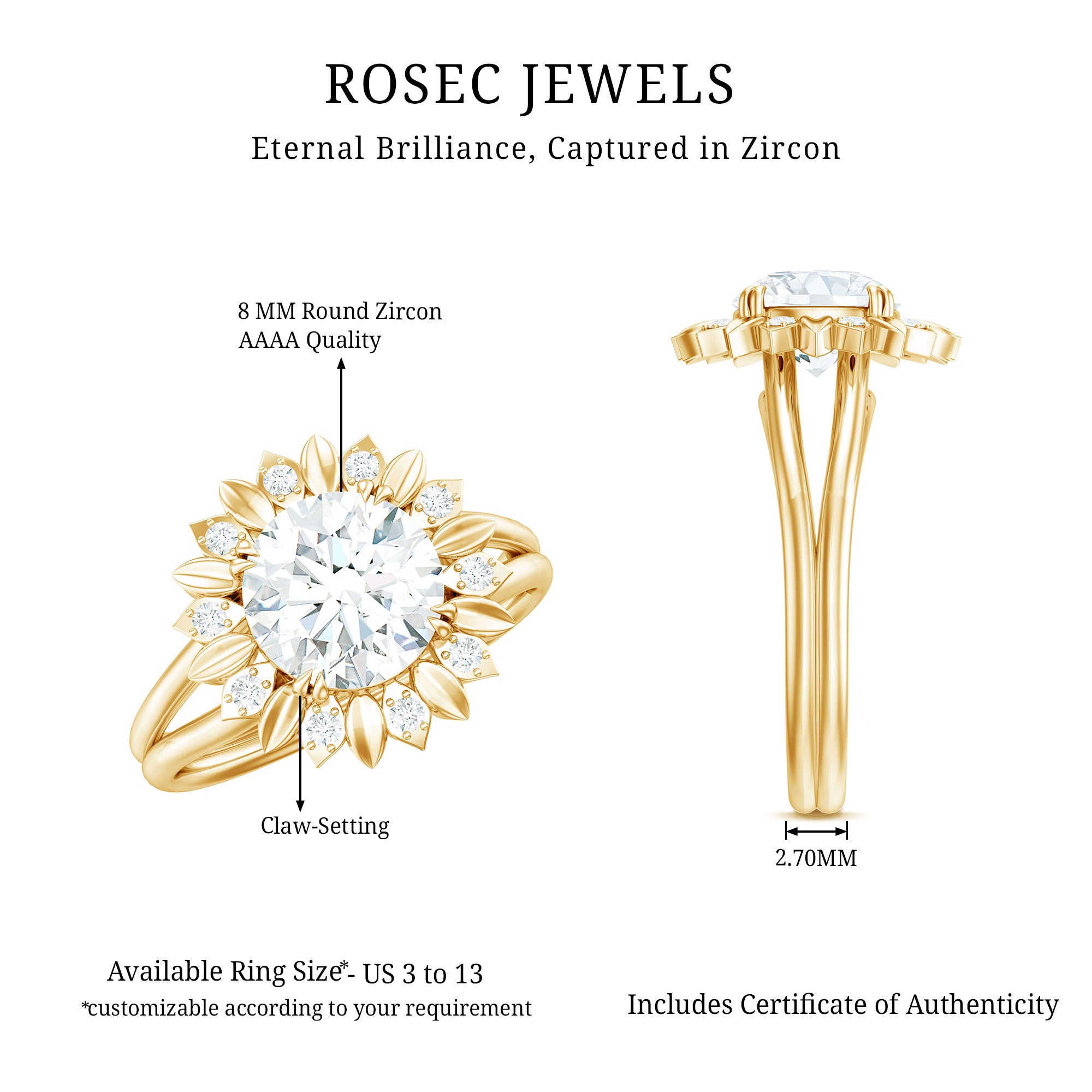 Apart from its many ring styles, a Cubic Zirconia Engagement Ring is fashioned in three tones of Gold- white, yellow, and rose. While White Gold cz engagement rings speak to those with a classic and understated sense of style, the ones fashioned in yellow gold appeal owing to their color-contrasting aesthetic and traditional vibe. On the other hand, a Cz ring fashioned in rose gold looks incredibly feminine.