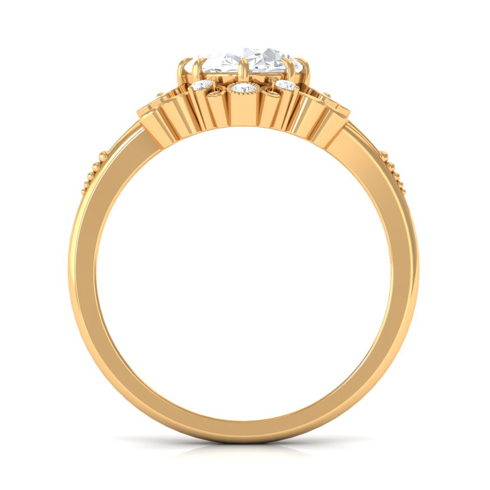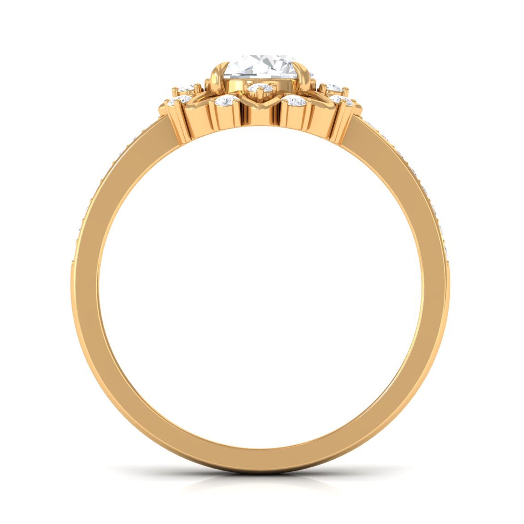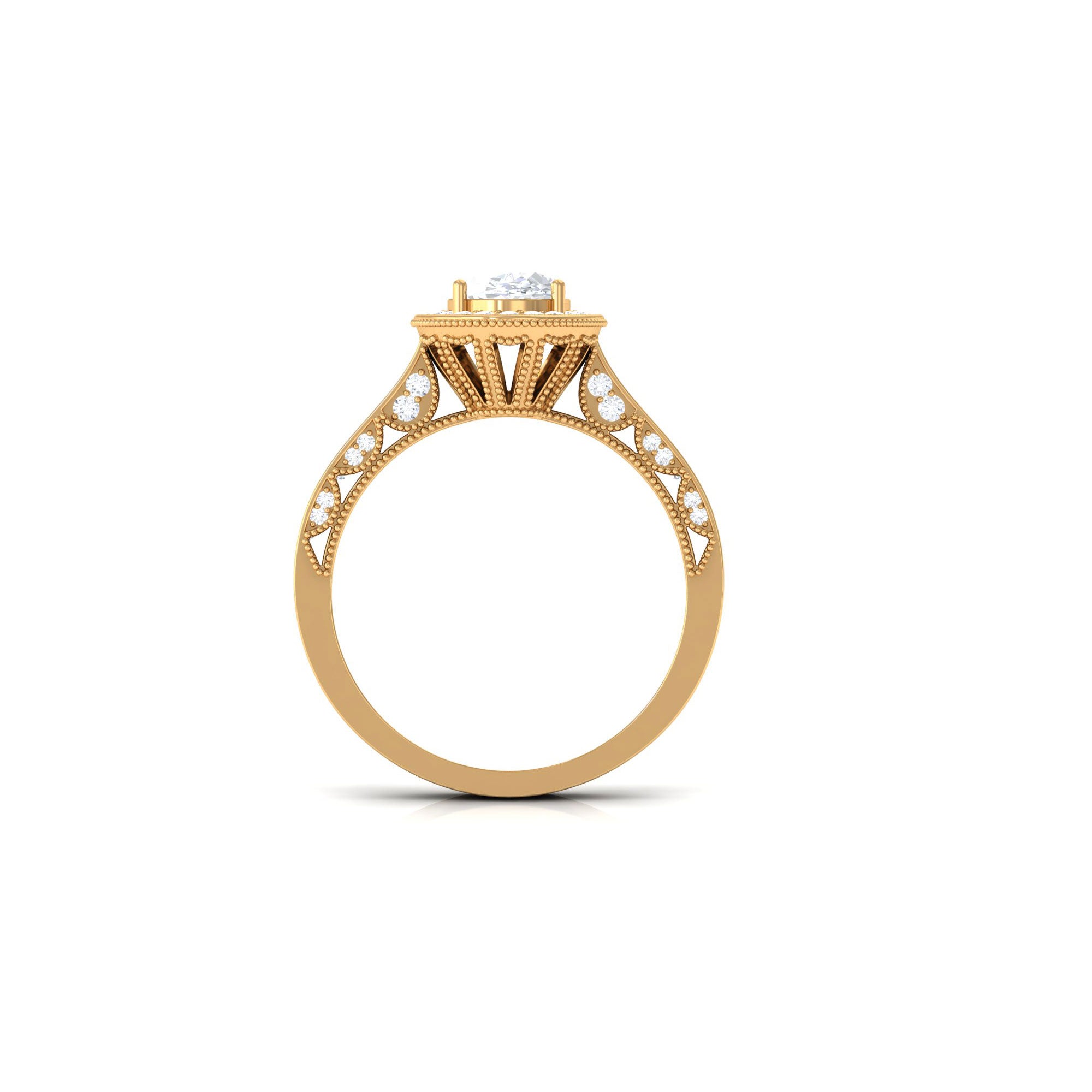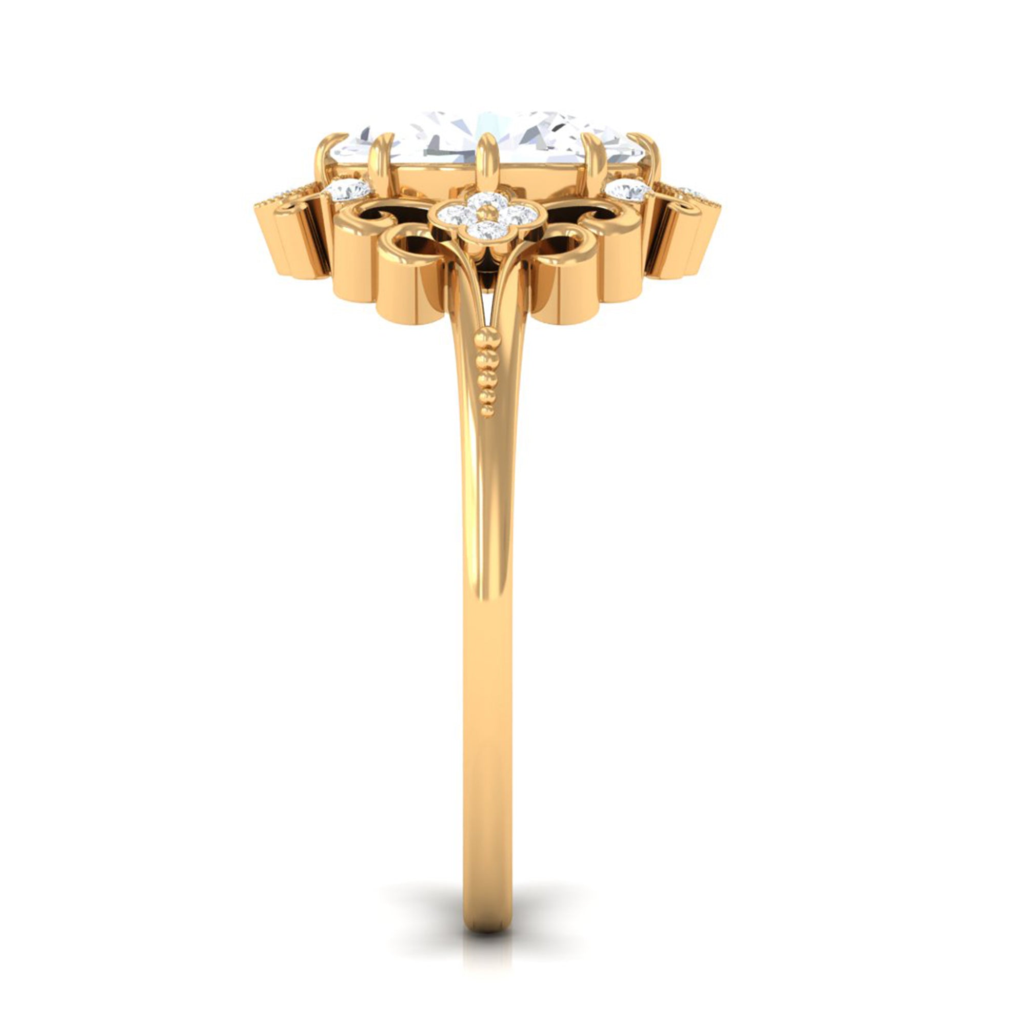 Just like the name suggests, this ring style draws inspiration from the old-world designs of Victorian, Edwardian, and Art Deco Eras that complement the sparkling center stone of CZ steal the limelight. You’re most likely to witness ornately crafted filigree and milgrain detailing, abstract geometrical patterns, retro floral motifs, and antique engravings. So, if you have been on the lookout for Gold Cubic Zirconia Engagement Rings that speak to your old school love, look no further!