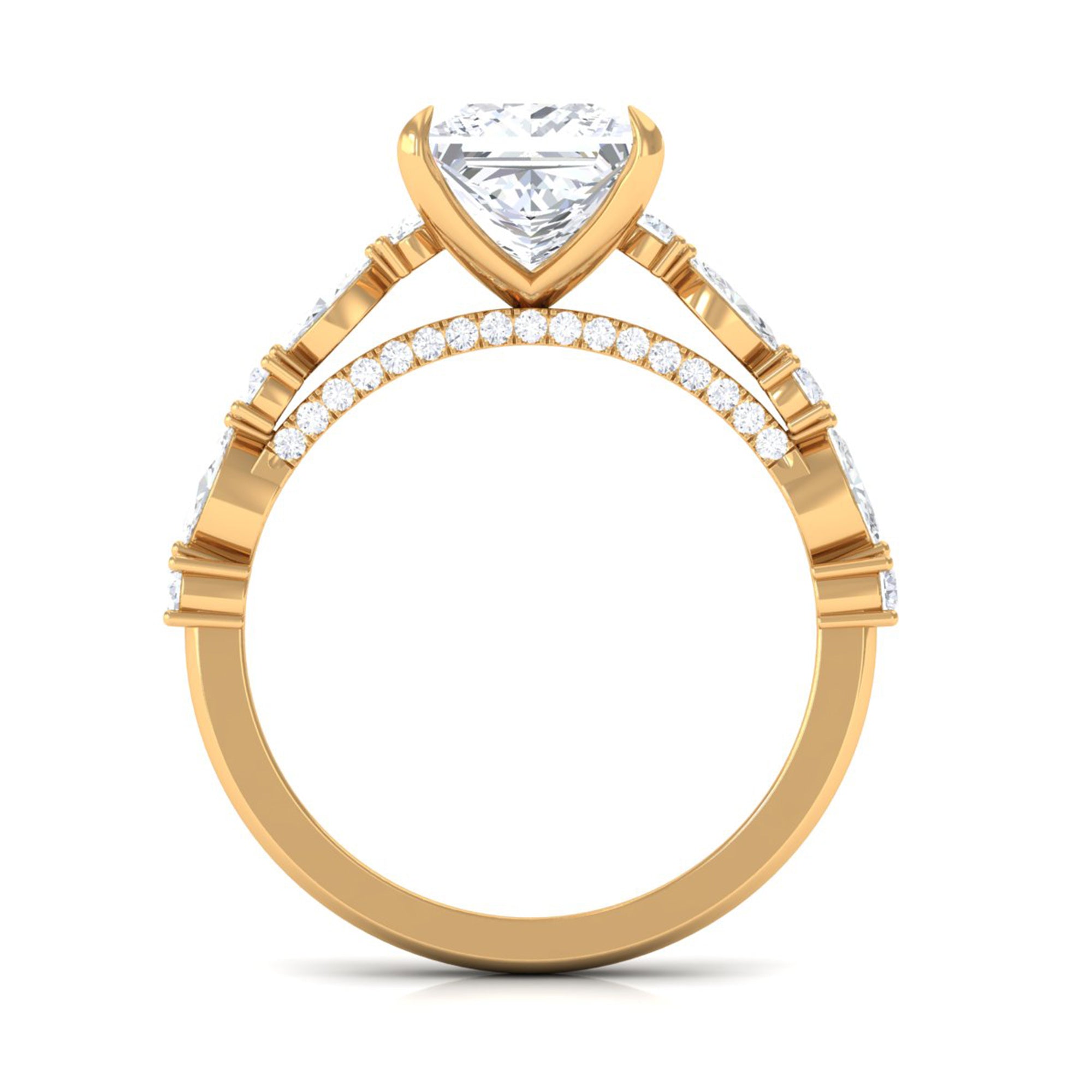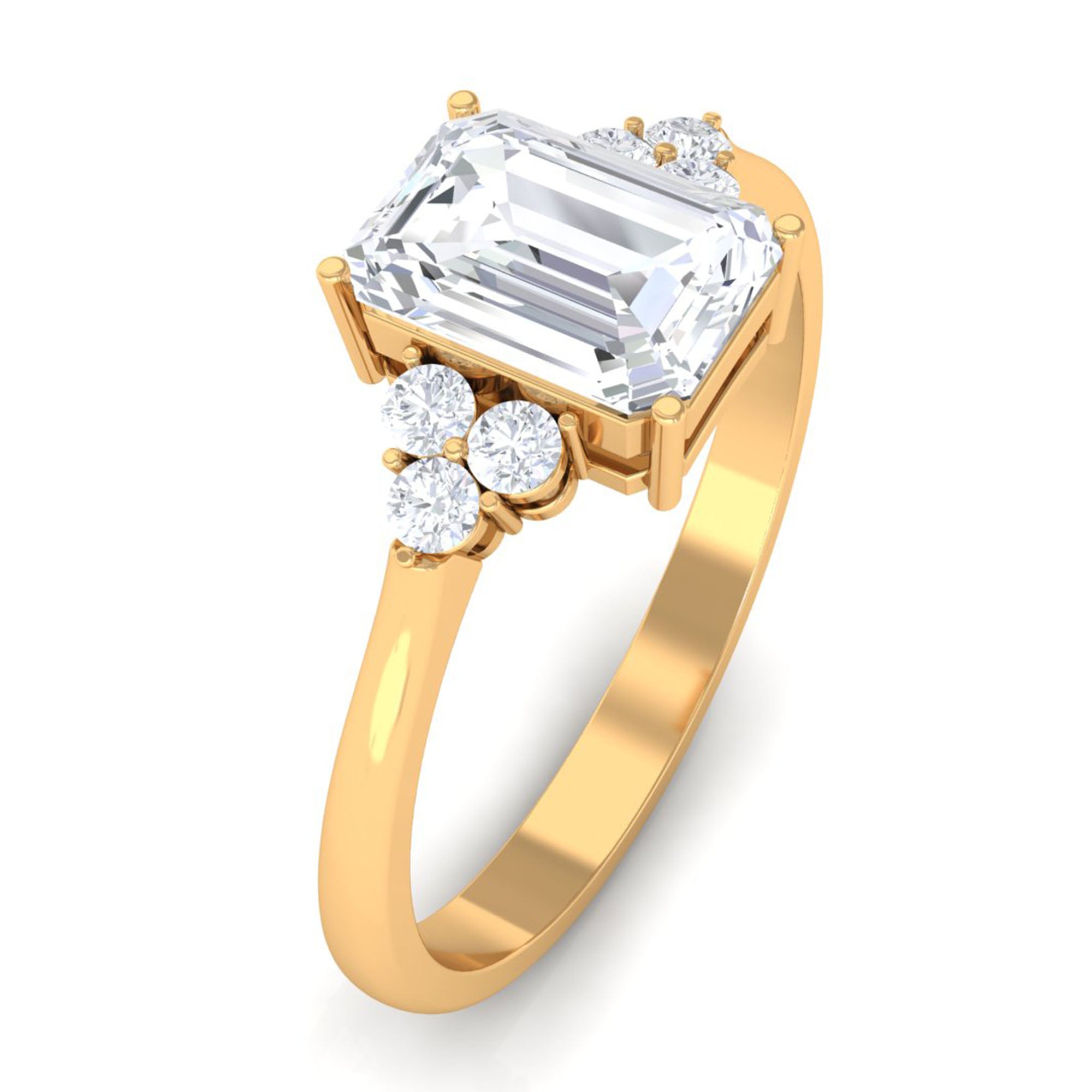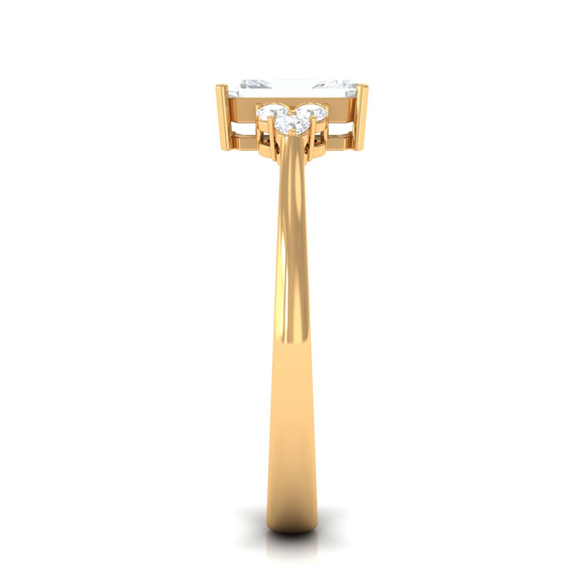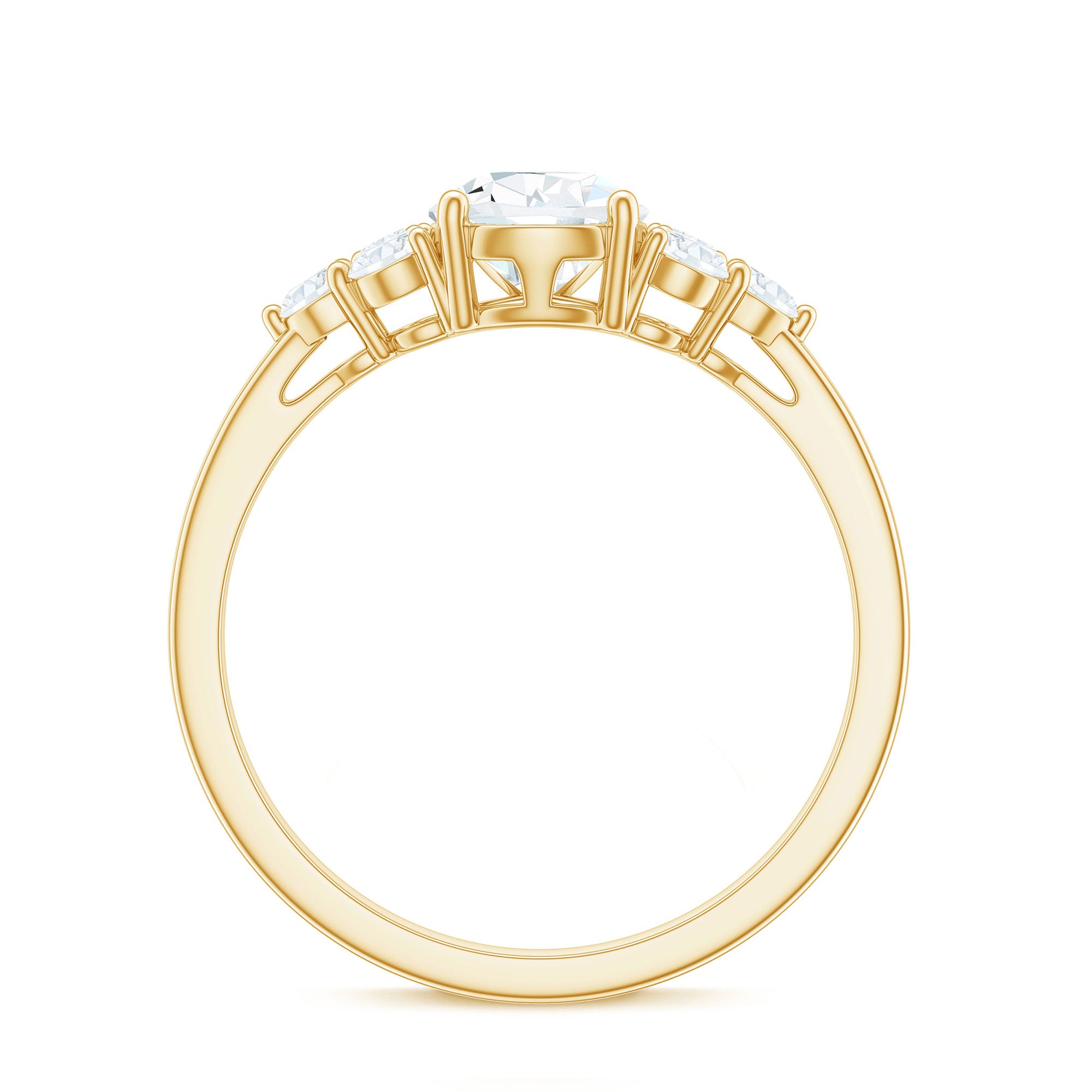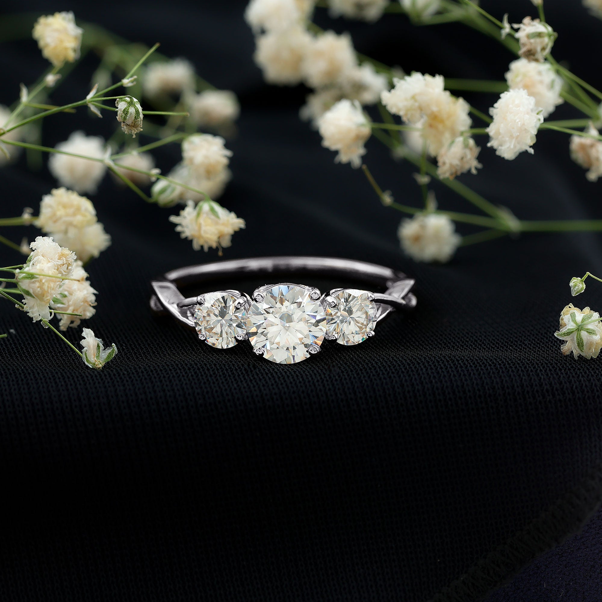 Unconventional and uniquely flashy, this ring style is encased with three stones of Cubic Zirconia arranged uniformly in a row. If you fancy more sparkles in your betrothal ring, a three stone ring is the way forward (since three stones means triple the sparkles). While a Round or Oval Cubic Zirconia Engagement Rings are the most classic options in this ring style, those adorned with Pear, Princess, Cushion, and Emerald Cut are also soaring in popularity. Behind its eye-striking aesthetics, it speaks to each couple uniquely since each of the three stones here sheds light on the couple’s past, present, and future respectively.