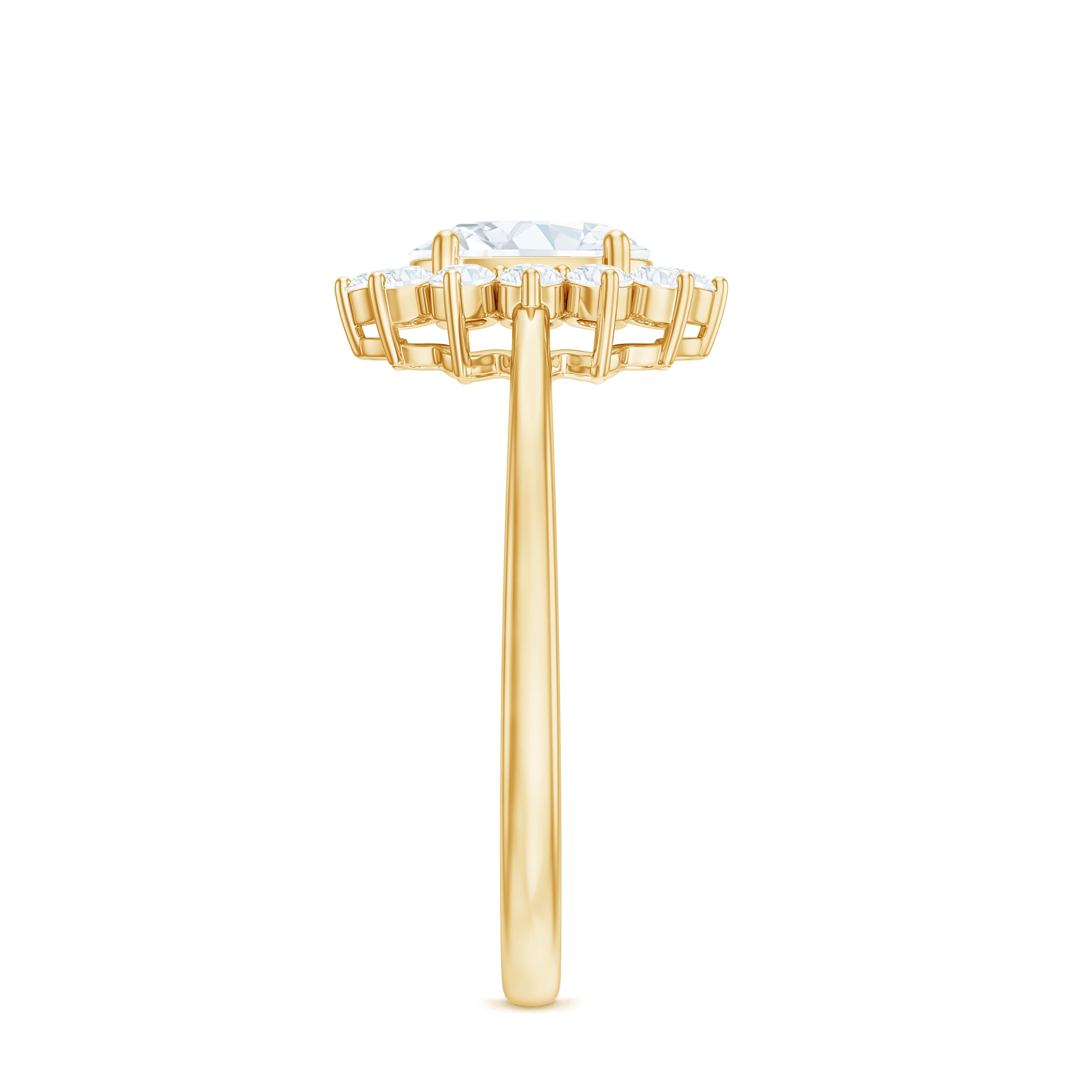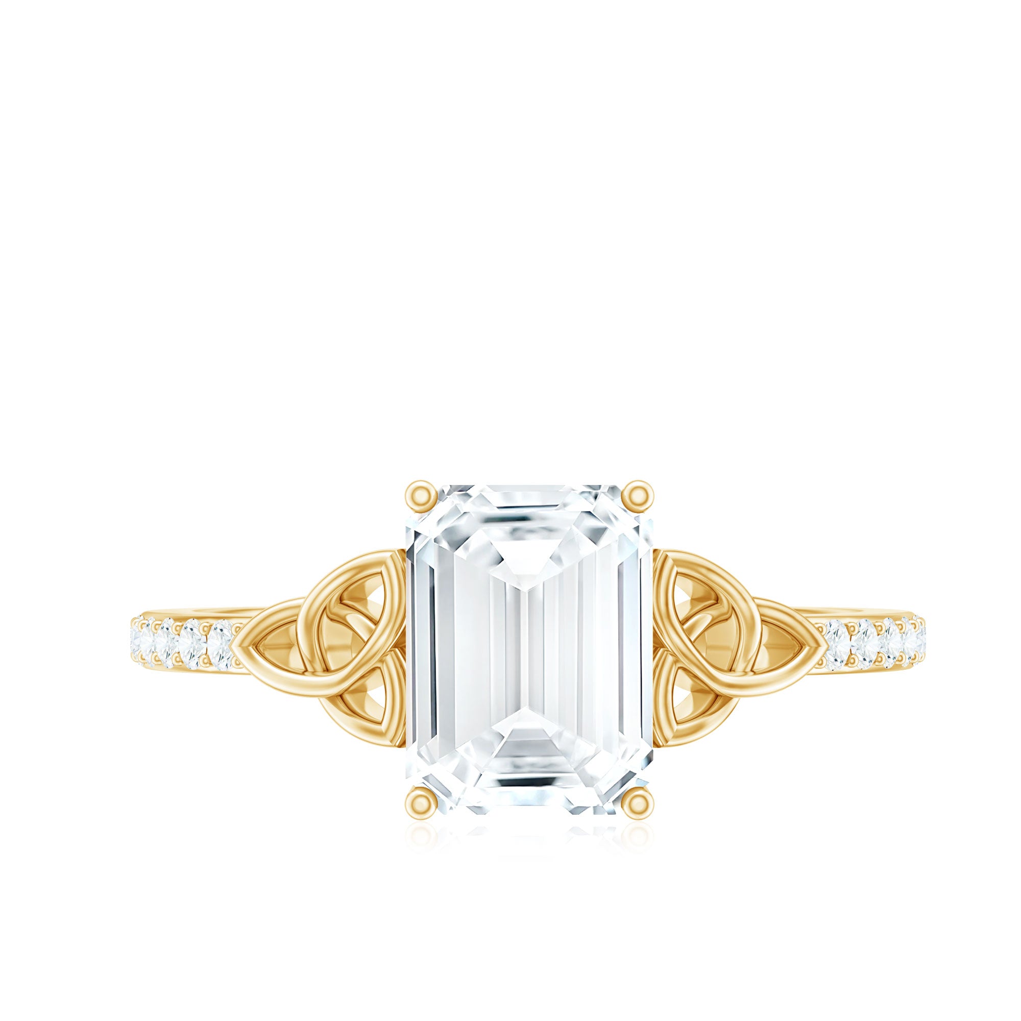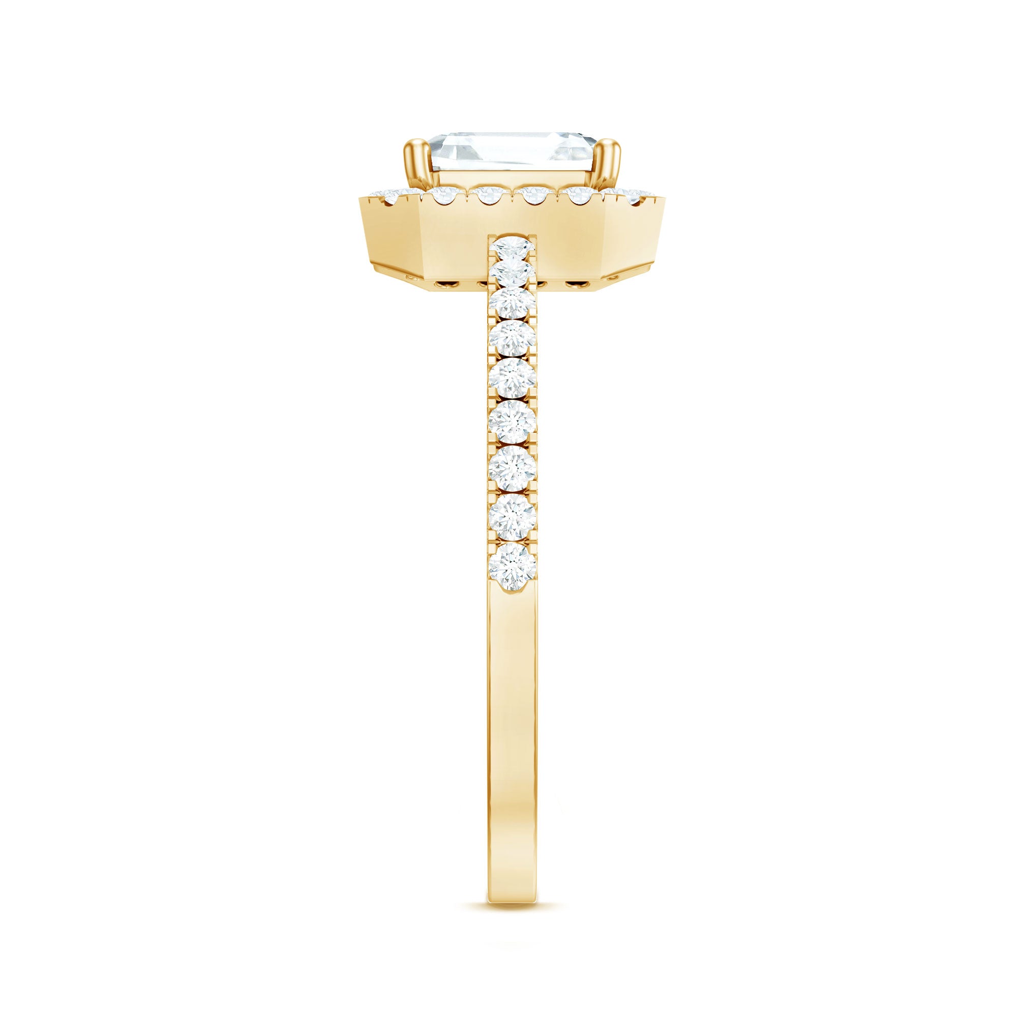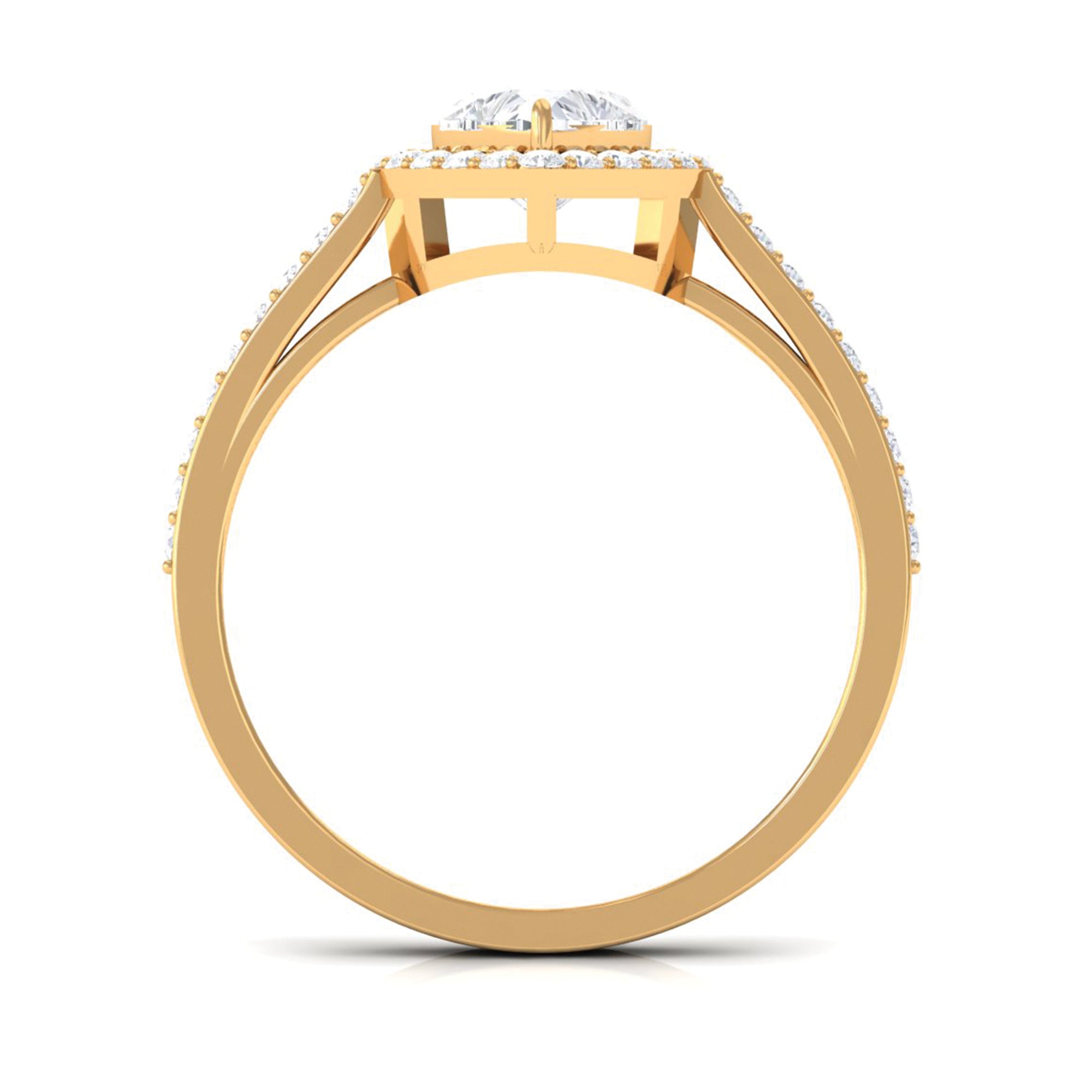Unconventional and uniquely flashy, this ring style is encased with three stones of Cubic Zirconia arranged uniformly in a row. If you fancy more sparkles in your betrothal ring, a three stone ring is the way forward (since three stones means triple the sparkles). While a Round or Oval Cubic Zirconia Engagement Rings are the most classic options in this ring style, those adorned with Pear, Princess, Cushion, and Emerald Cut are also soaring in popularity. Behind its eye-striking aesthetics, it speaks to each couple uniquely since each of the three stones here sheds light on the couple’s past, present, and future respectively.