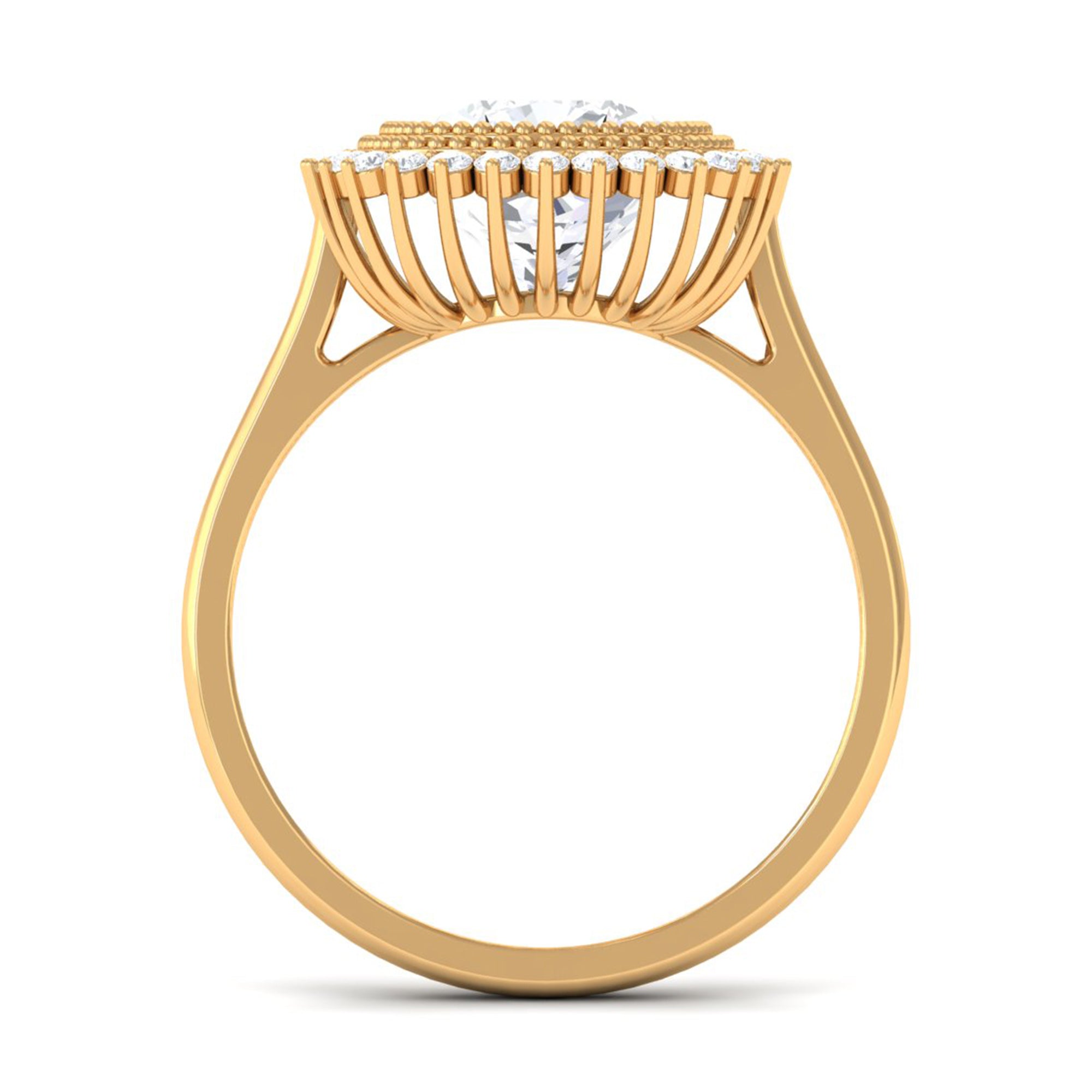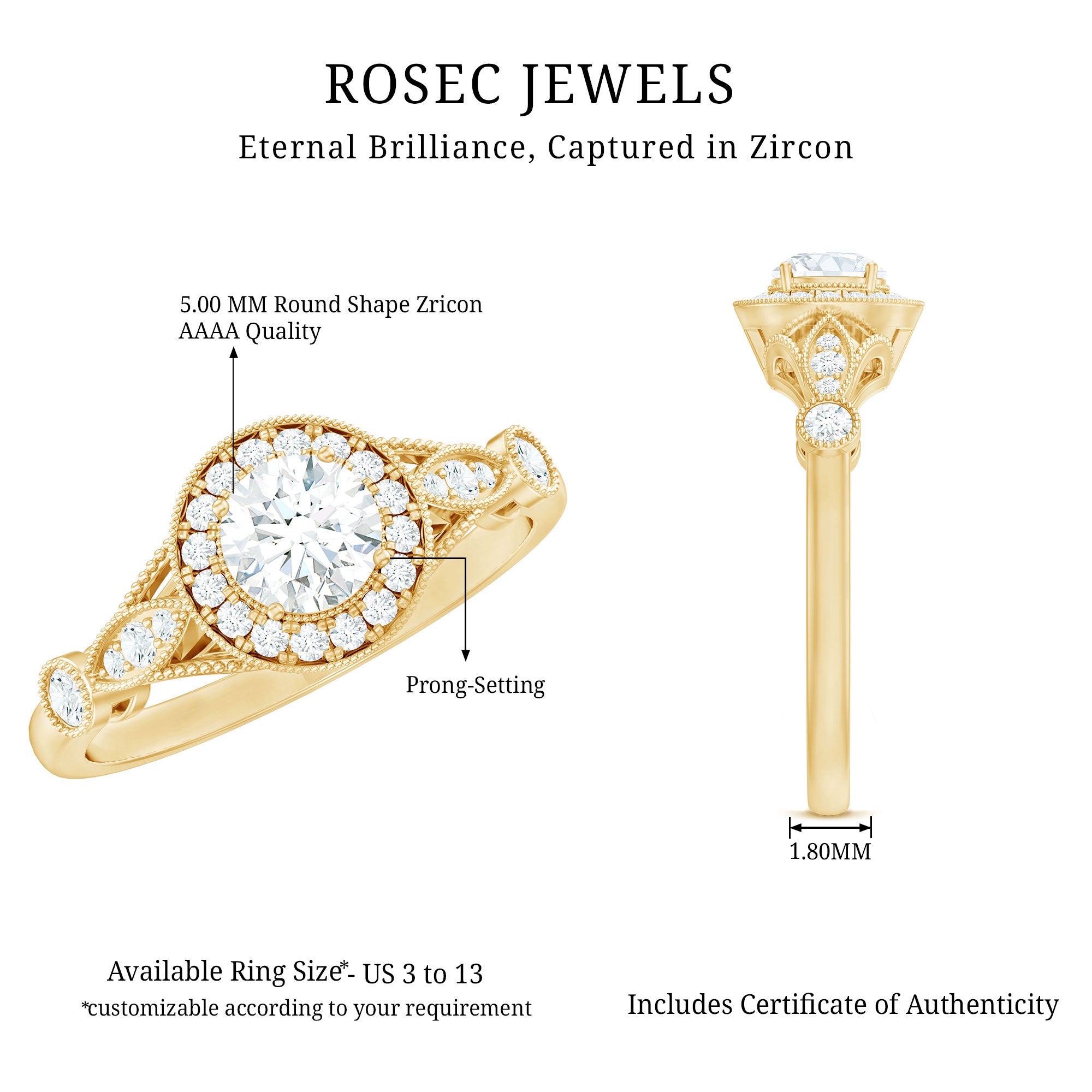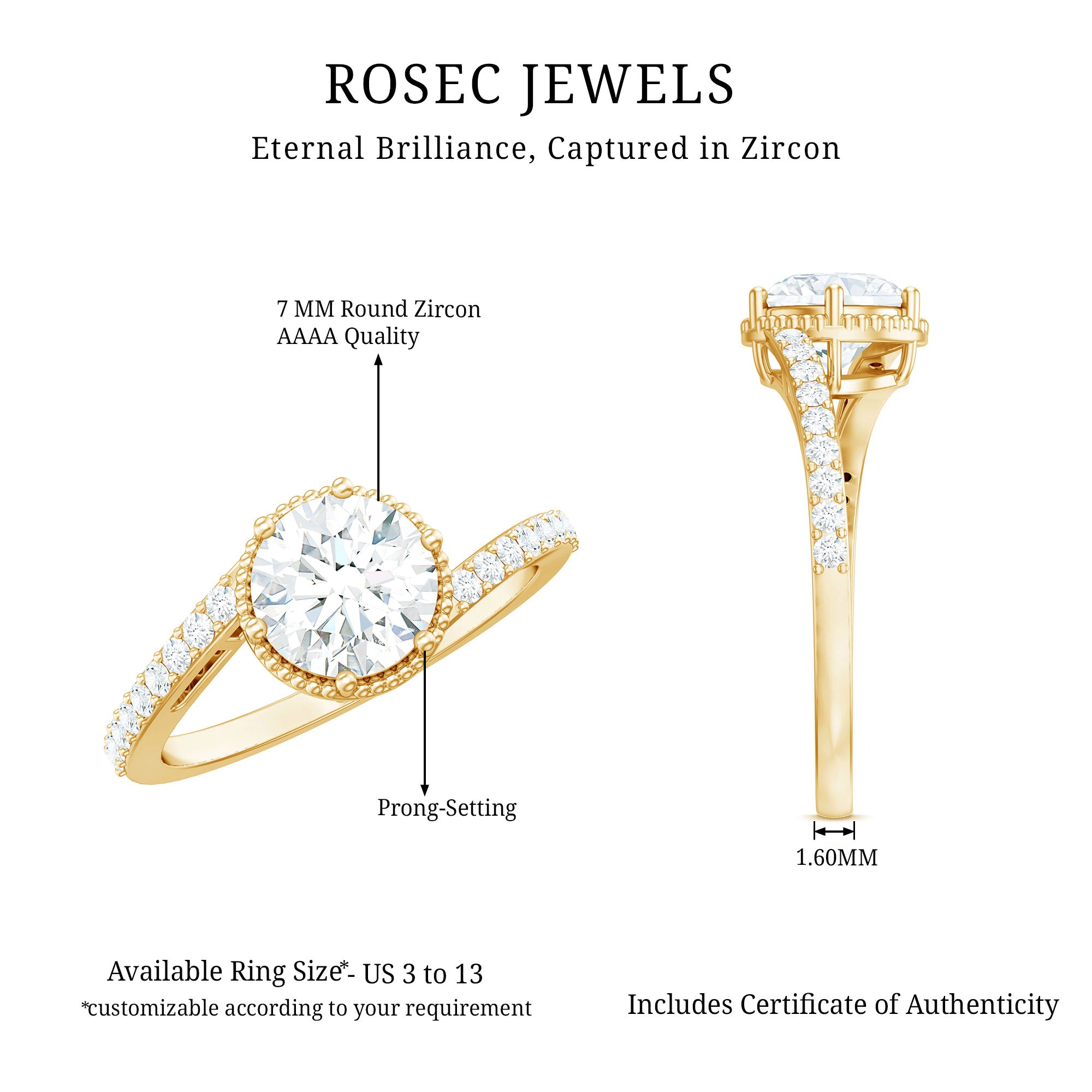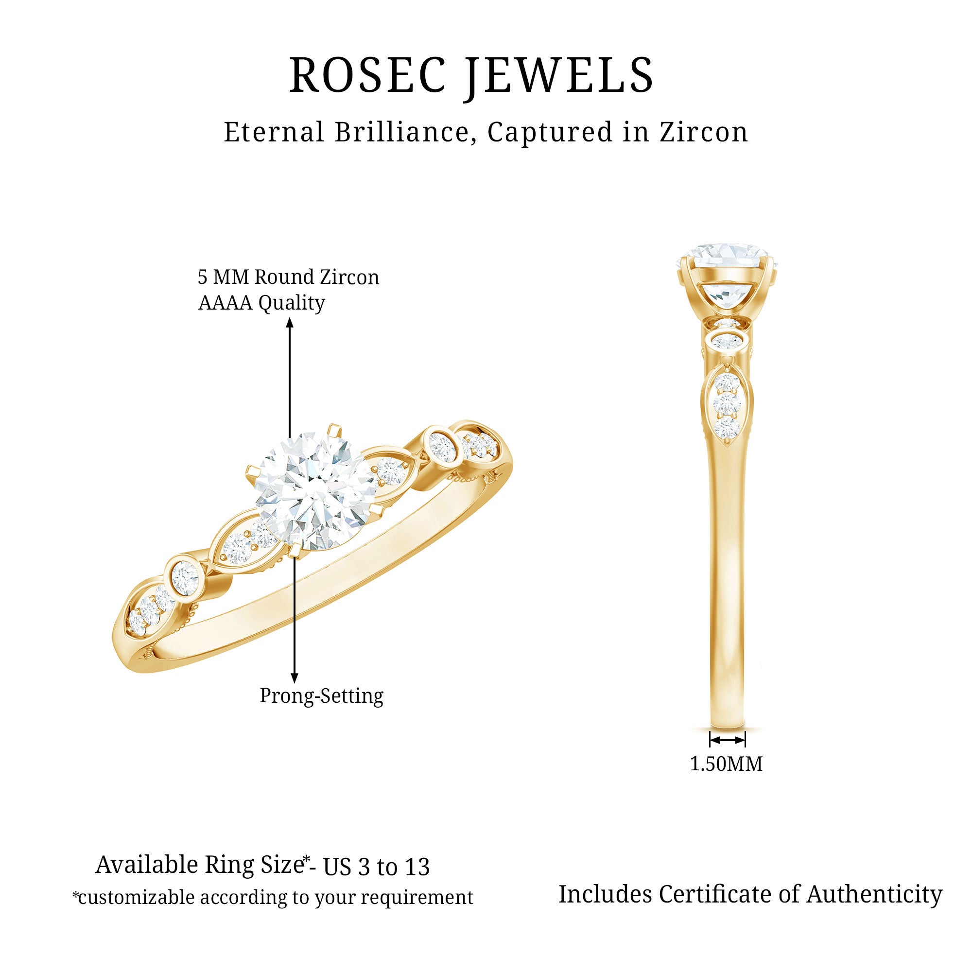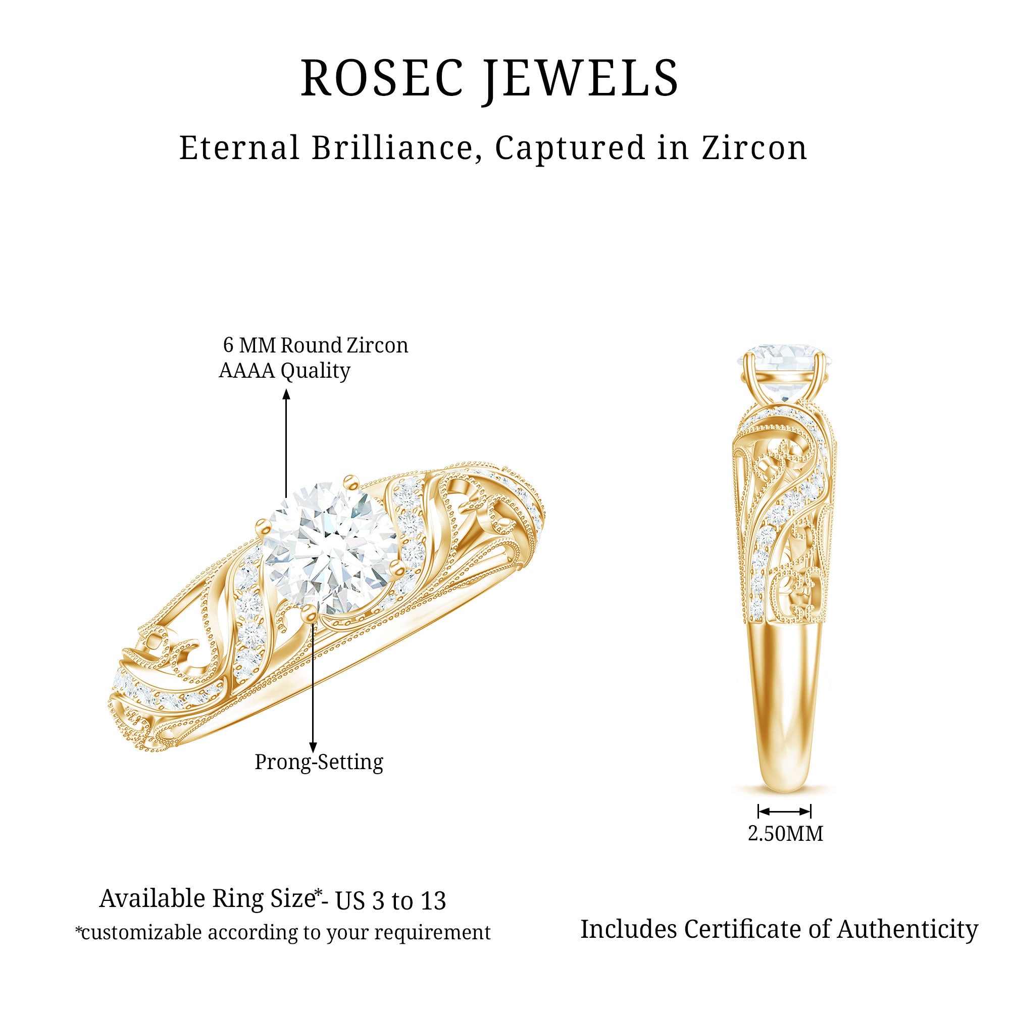 Just like the name suggests, this ring style draws inspiration from the old-world designs of Victorian, Edwardian, and Art Deco Eras that complement the sparkling center stone of CZ steal the limelight. You’re most likely to witness ornately crafted filigree and milgrain detailing, abstract geometrical patterns, retro floral motifs, and antique engravings. So, if you have been on the lookout for Gold Cubic Zirconia Engagement Rings that speak to your old school love, look no further!