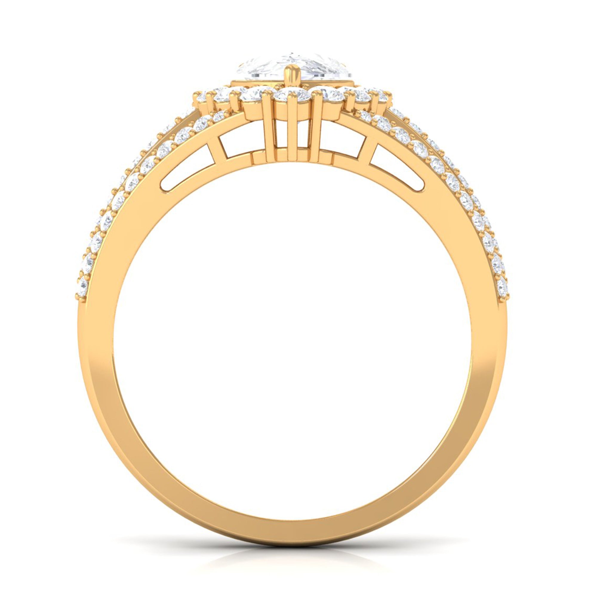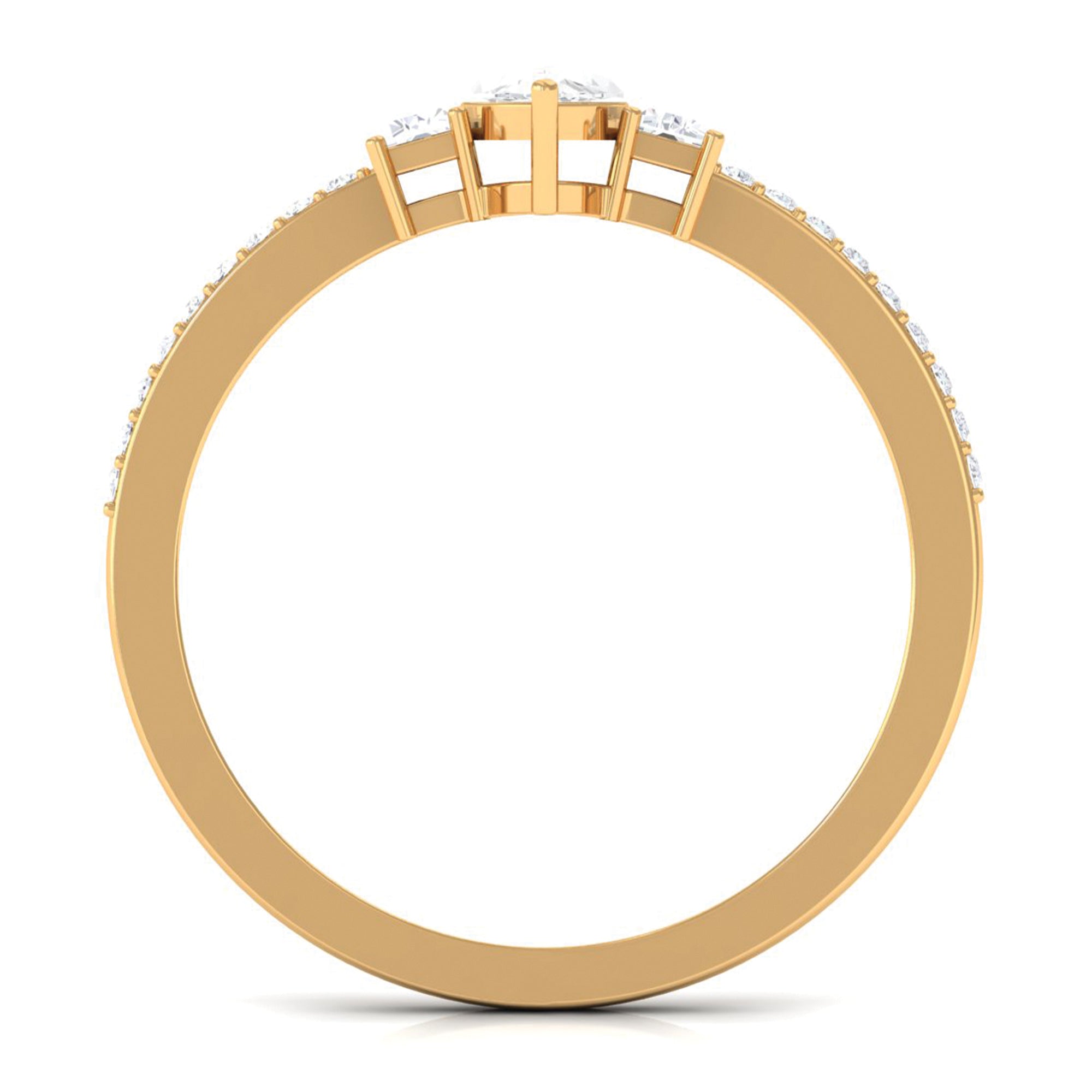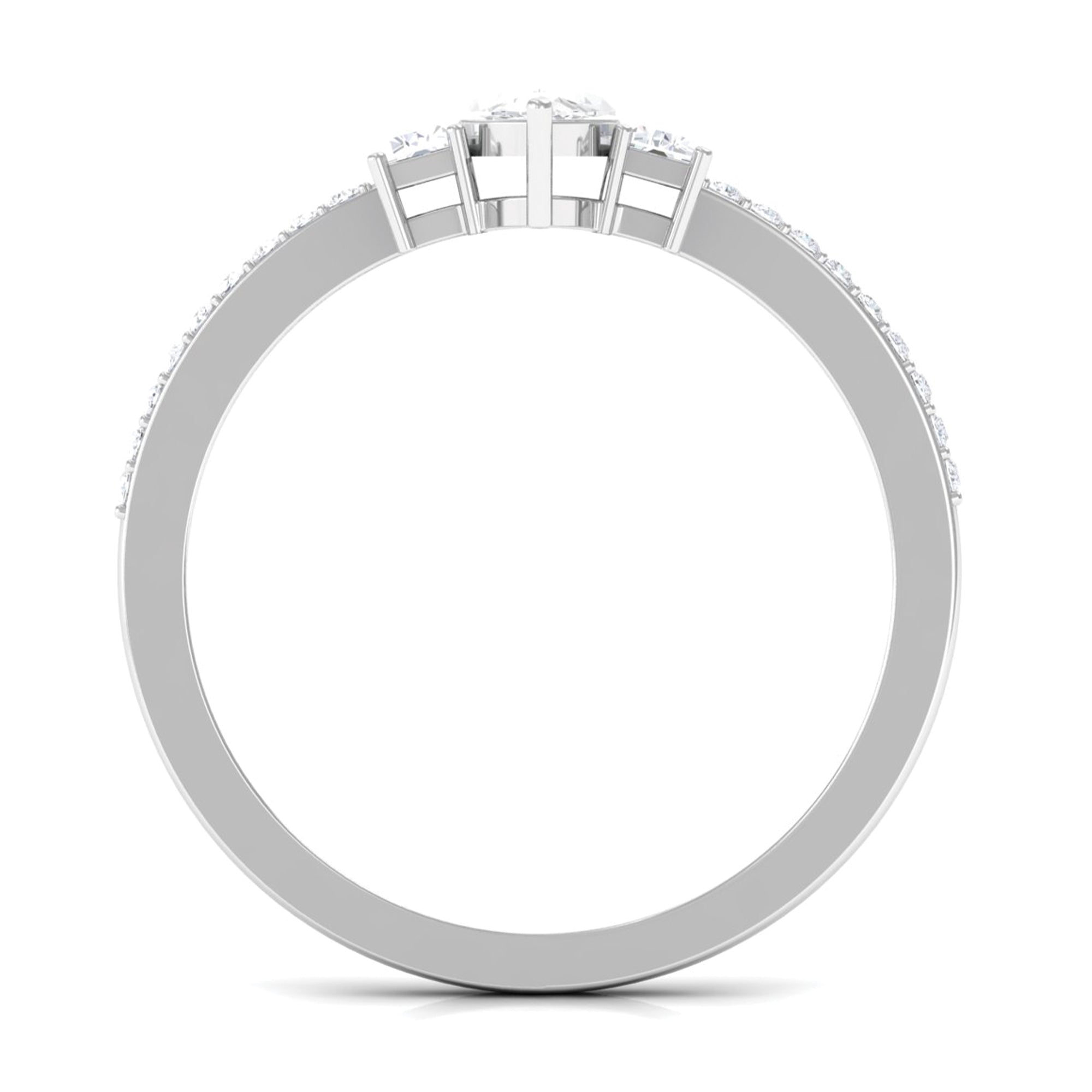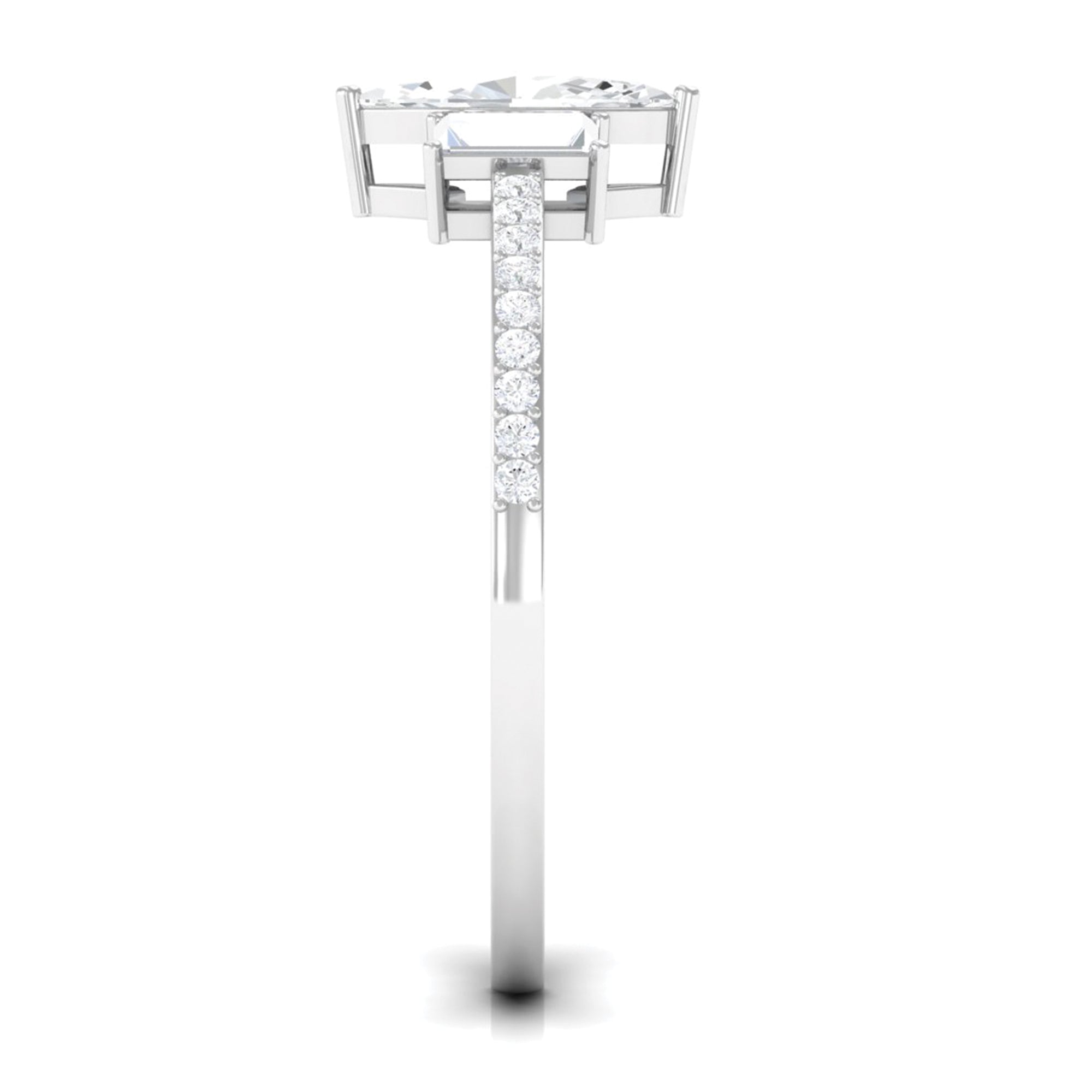 Unconventional and uniquely flashy, this ring style is encased with three stones of Cubic Zirconia arranged uniformly in a row. If you fancy more sparkles in your betrothal ring, a three stone ring is the way forward (since three stones means triple the sparkles). While a Round or Oval Cubic Zirconia Engagement Rings are the most classic options in this ring style, those adorned with Pear, Princess, Cushion, and Emerald Cut are also soaring in popularity. Behind its eye-striking aesthetics, it speaks to each couple uniquely since each of the three stones here sheds light on the couple’s past, present, and future respectively.