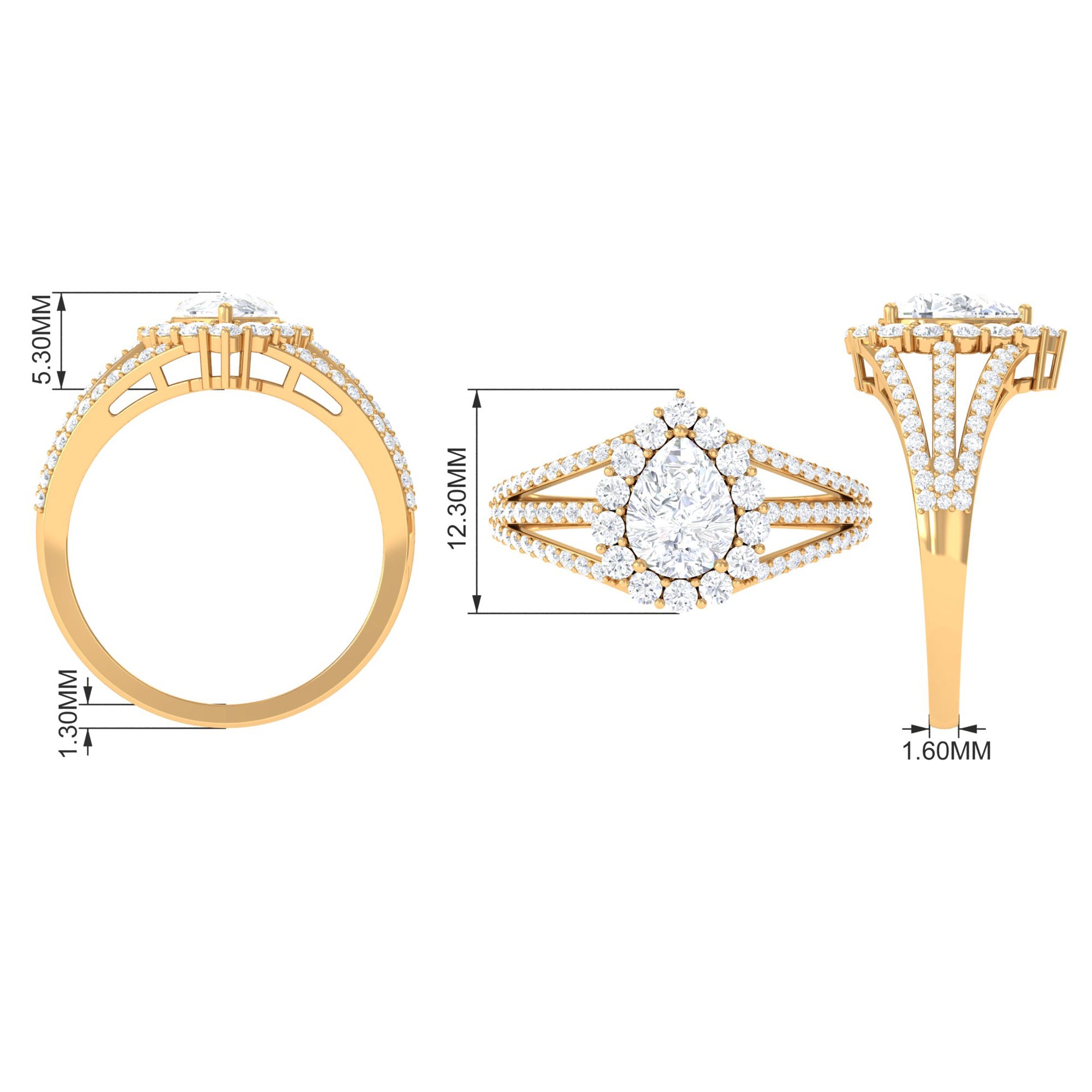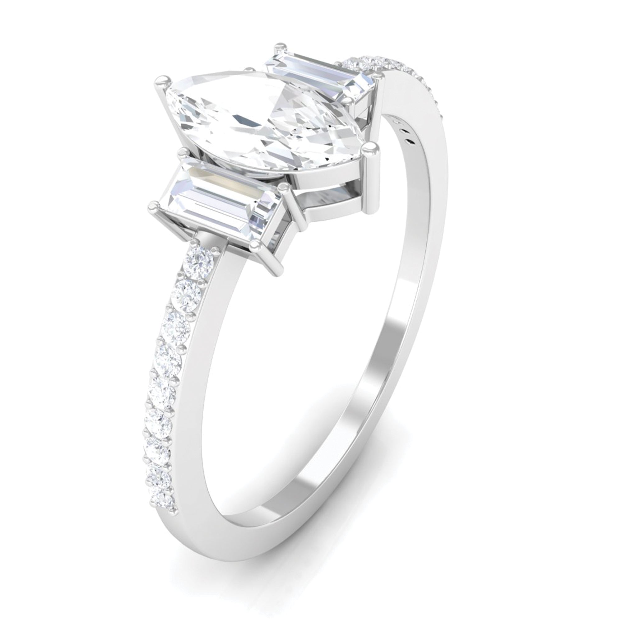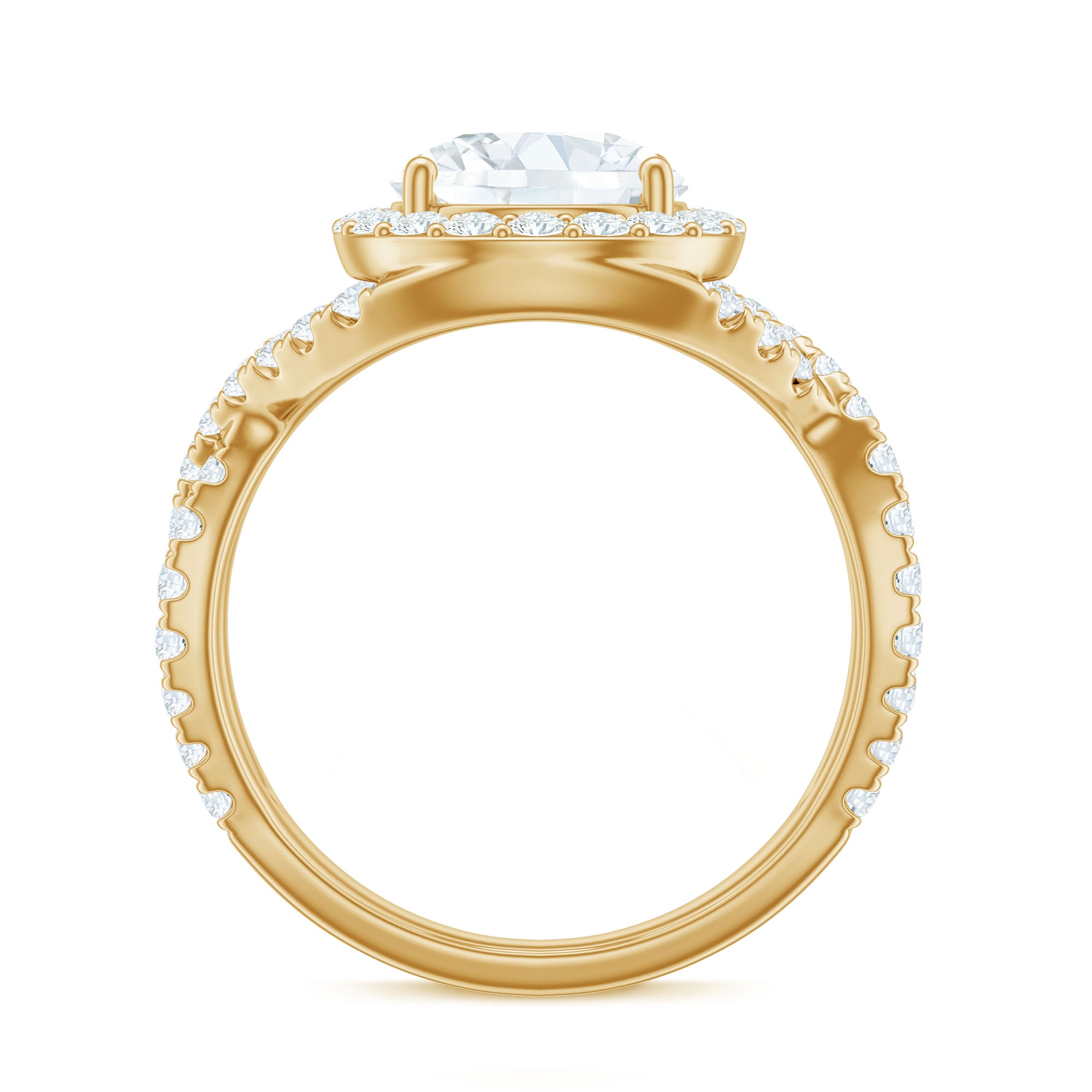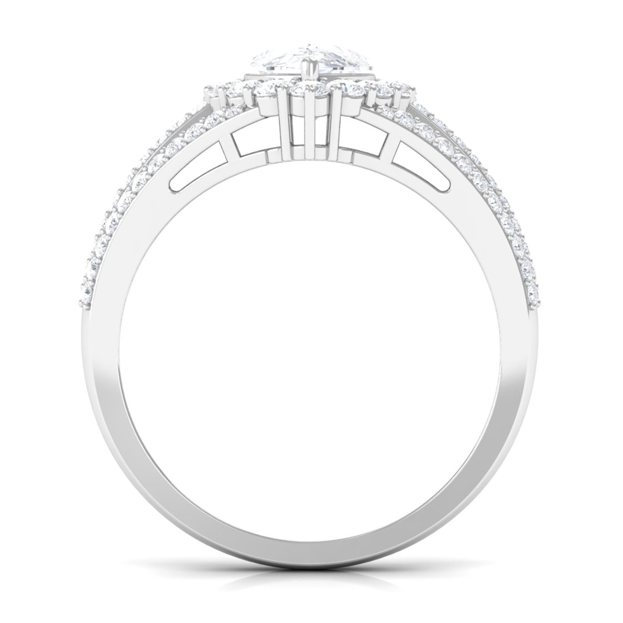 Unconventional and uniquely flashy, this ring style is encased with three stones of Cubic Zirconia arranged uniformly in a row. If you fancy more sparkles in your betrothal ring, a three stone ring is the way forward (since three stones means triple the sparkles). While a Round or Oval Cubic Zirconia Engagement Rings are the most classic options in this ring style, those adorned with Pear, Princess, Cushion, and Emerald Cut are also soaring in popularity. Behind its eye-striking aesthetics, it speaks to each couple uniquely since each of the three stones here sheds light on the couple’s past, present, and future respectively.