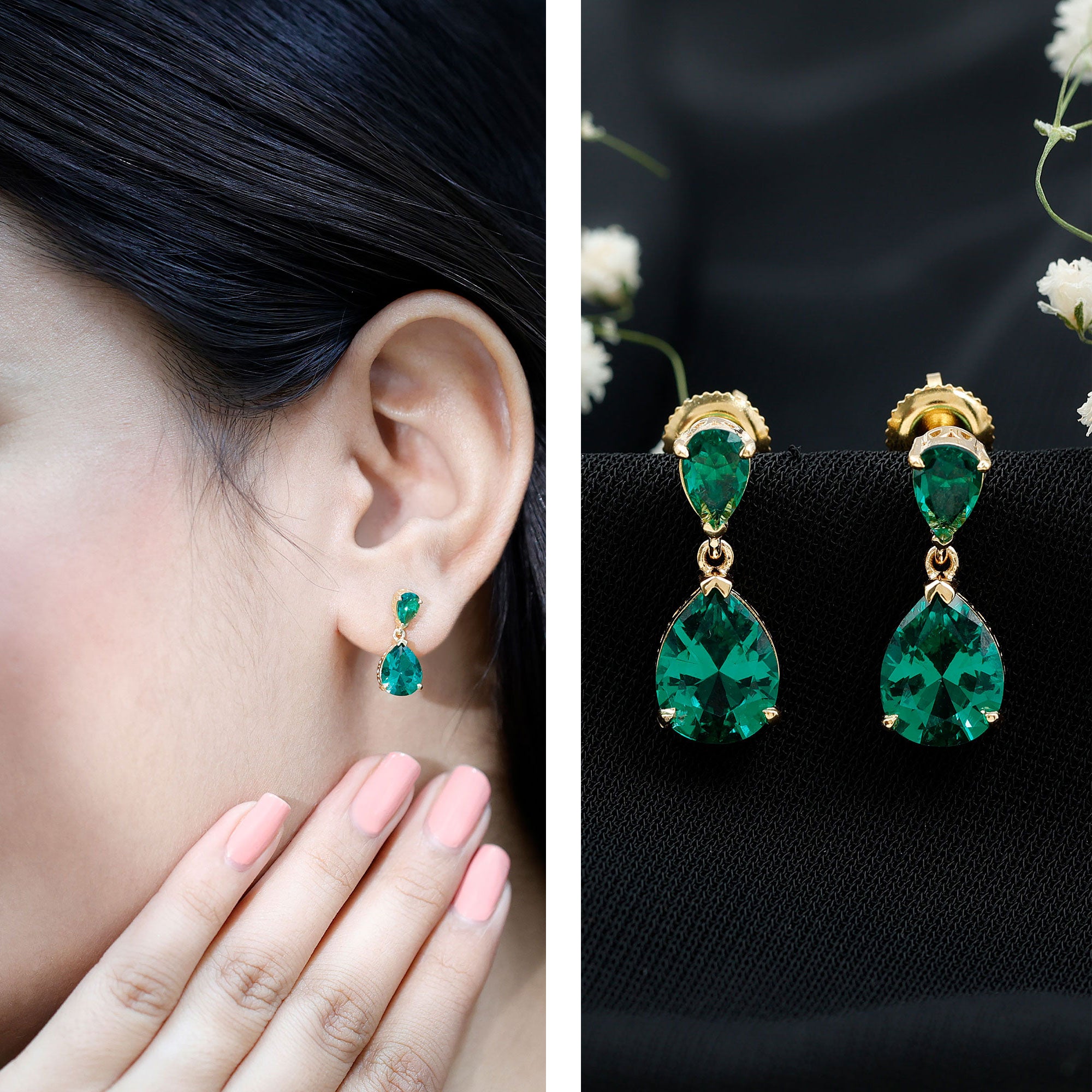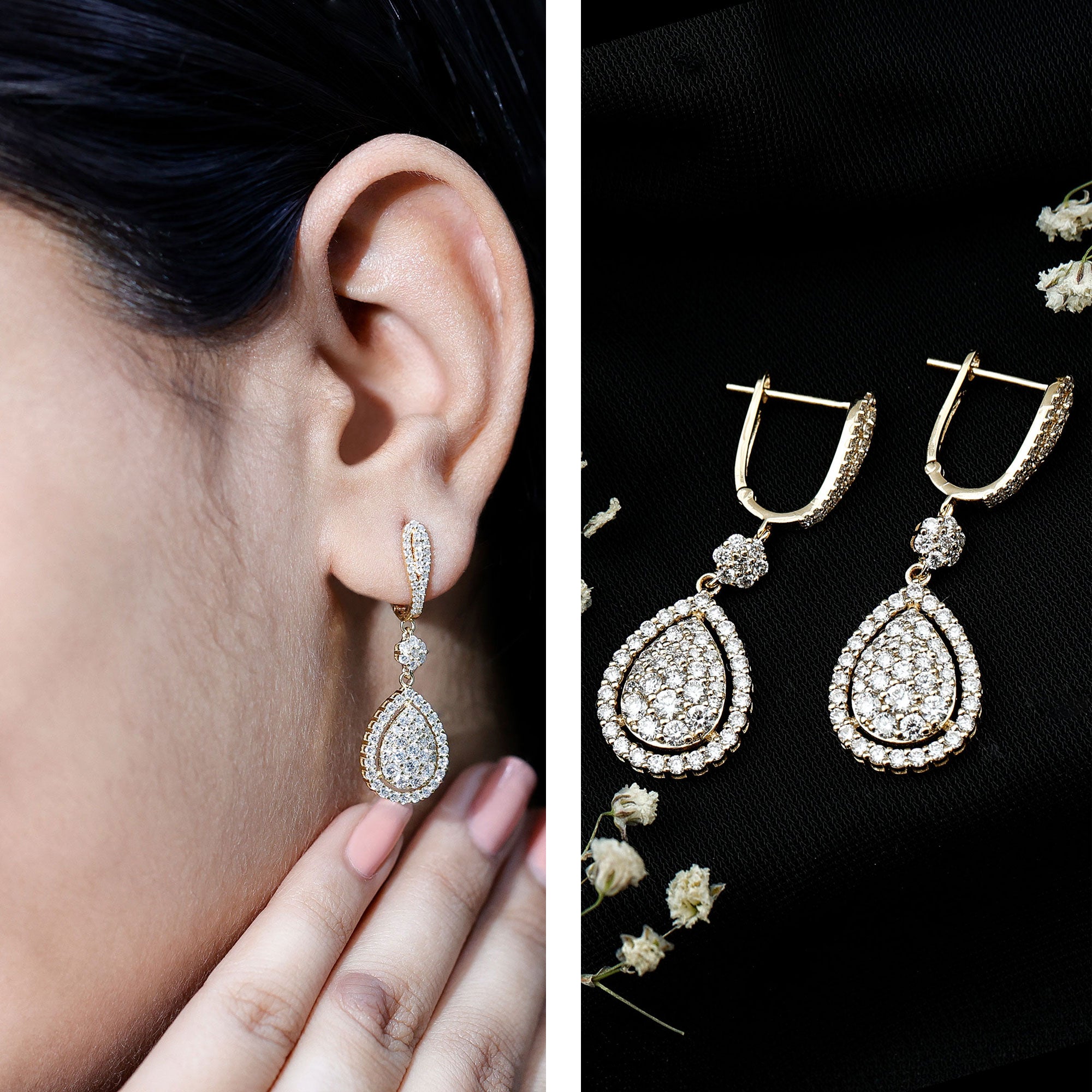 Both hang below the earlobe but the key difference is that while drop earrings don’t move as much, dangle earrings dangle or swing back and forth below the earlobe. That’s makes them differ in their appearances as well.