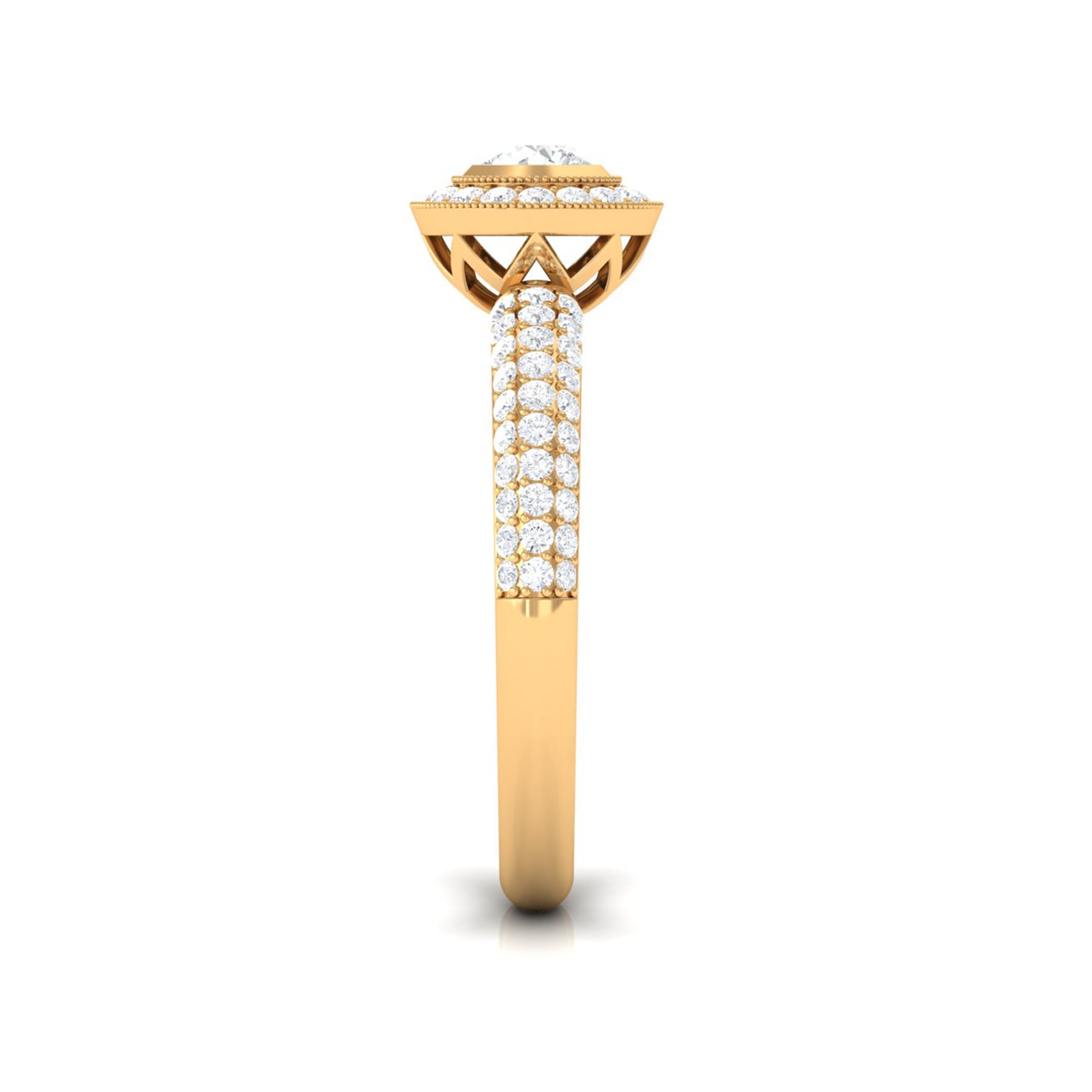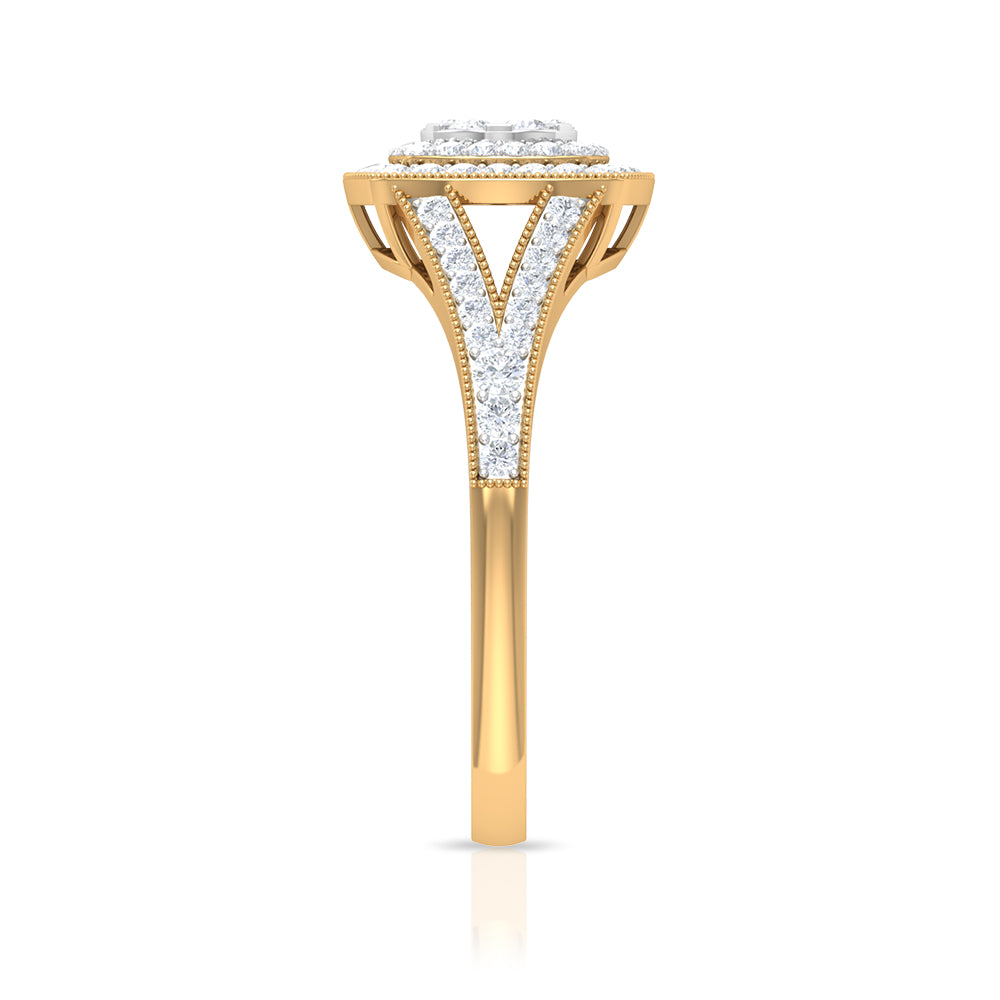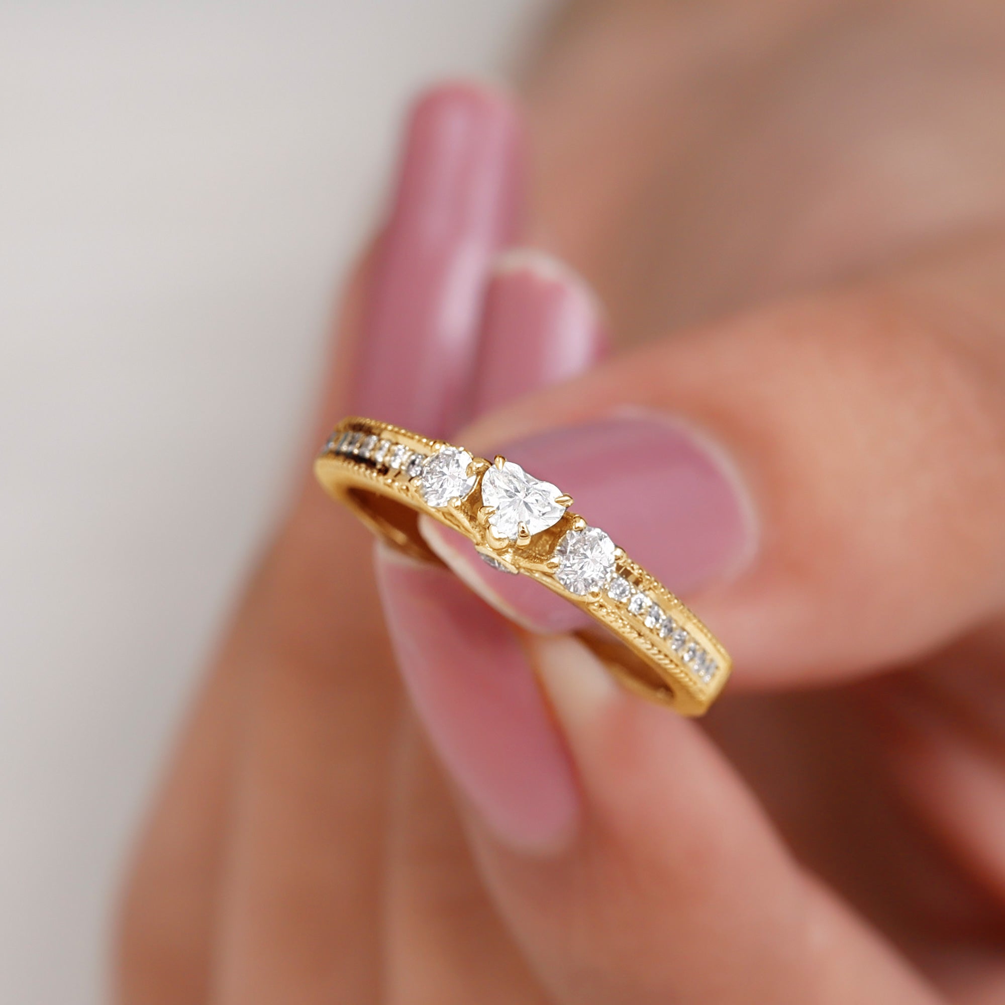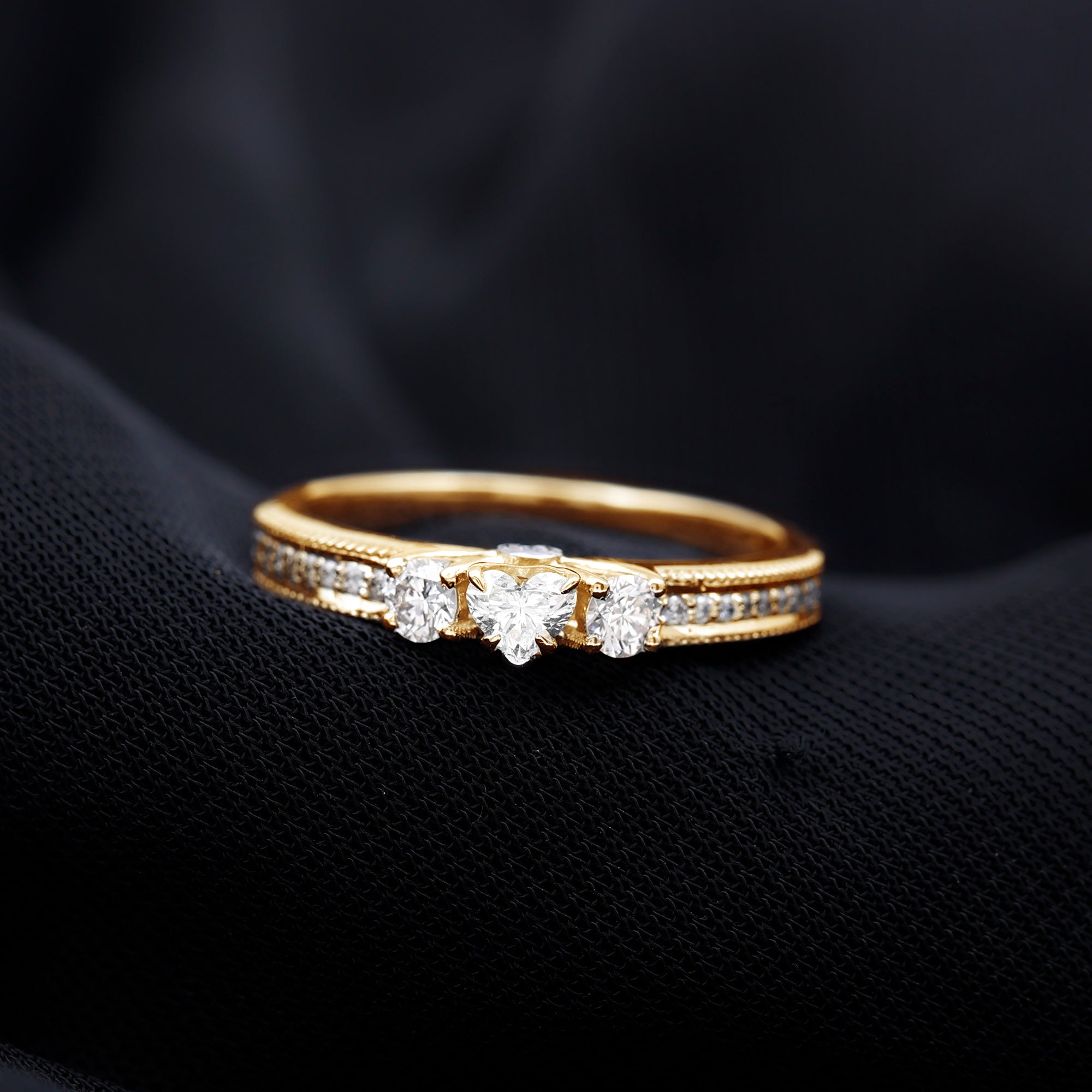 The ultimate expression of love, a Heart Diamond Engagement Ring appeals with its trendy, feminine, and romantic aesthetic. Most preferred in a solitaire, halo, and pave style, this shape is characterized by 56 and 58 facets and (interestingly) a pointy end that boasts a French tip (which greatly helps it exude more brilliance).
