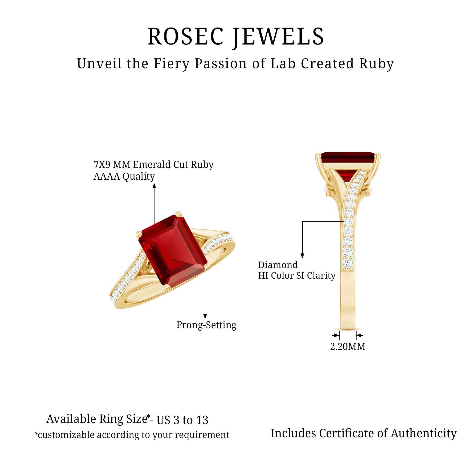A Bright and Luxurious Choice: Vivid color of any gemstone is highlighted best in emerald cut as it emphasises on its clarity, depth, and elegance. A stunning visual effect created in emerald cut gemstone, makes the gemstone appear larger and more radiant. Overall beauty of the ring is enhanced by an emerald cut.