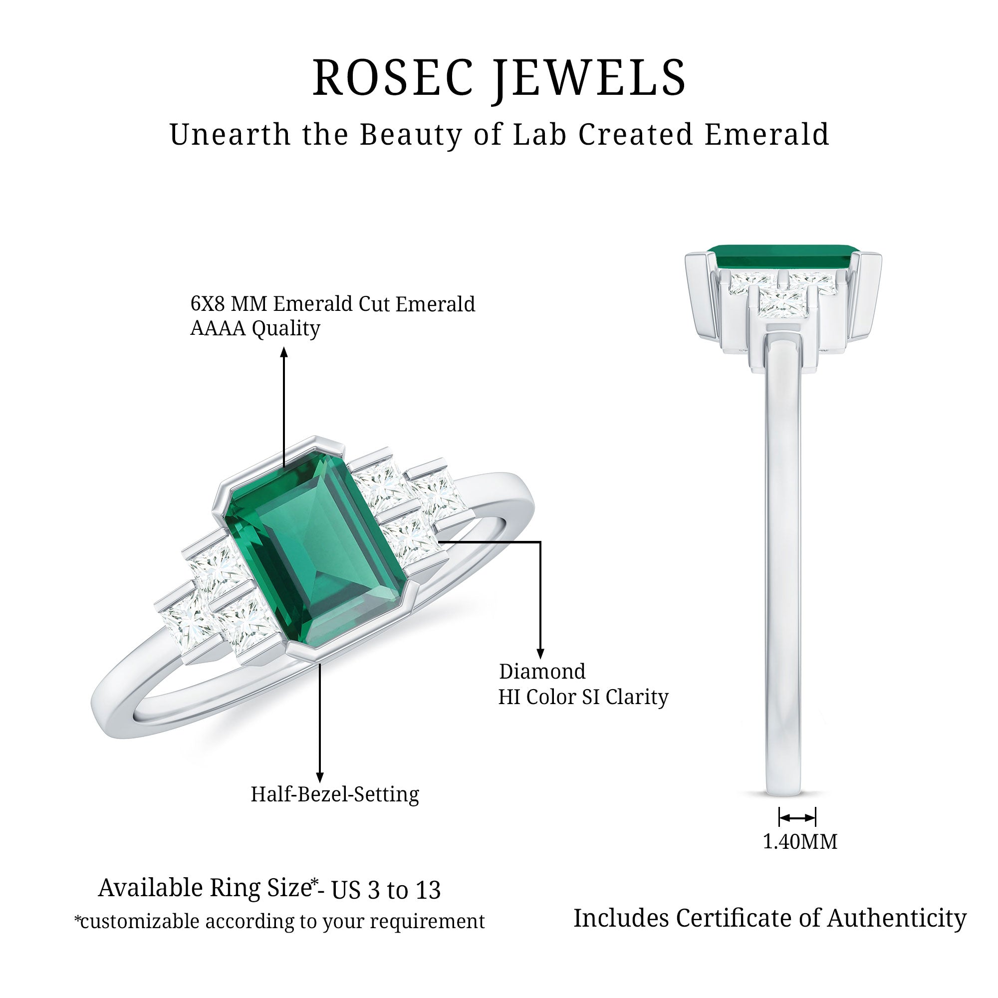 Usually pear, round, marquise, princess cut and shaped gemstones complement well with emerald cut gemstones. Basically side stones are chosen according to the design of the ring and its band style.