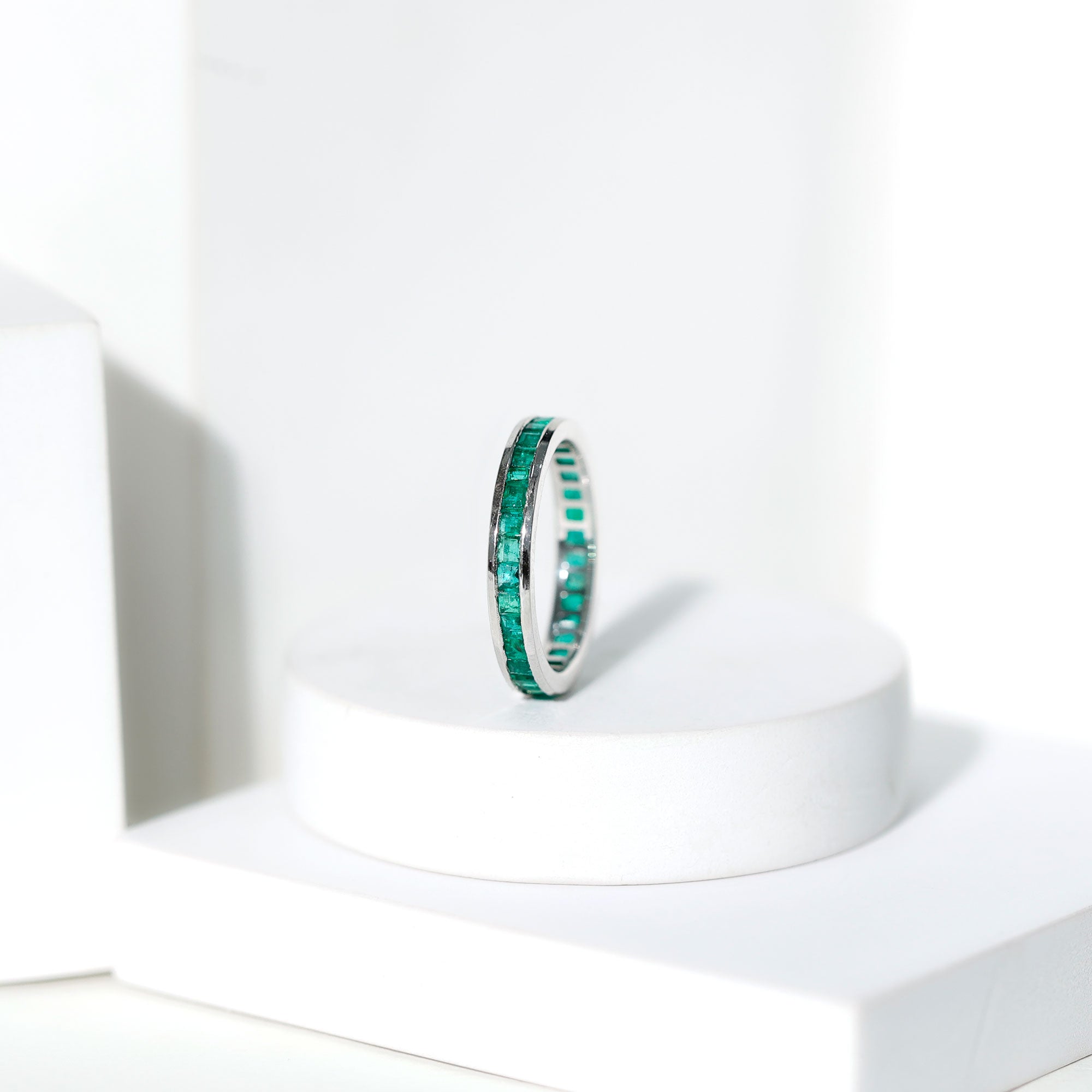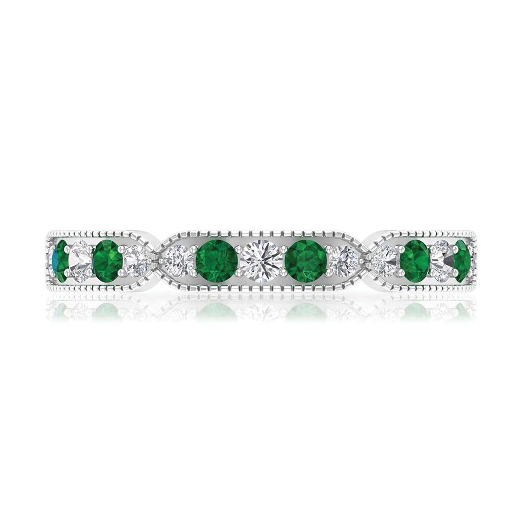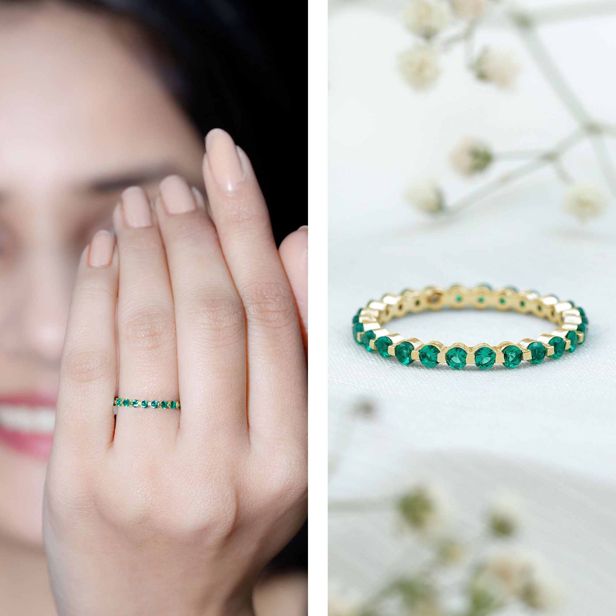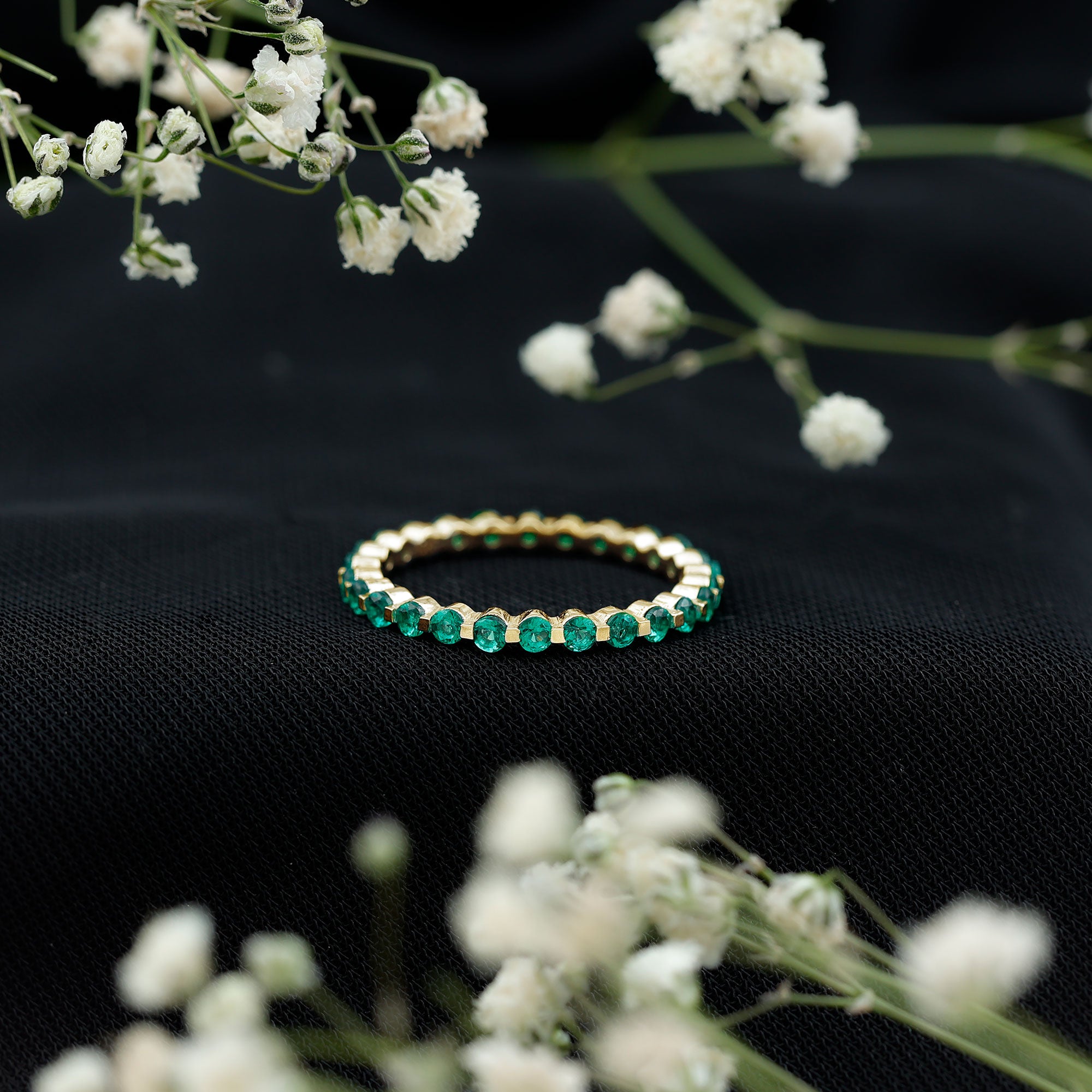Half-eternity bands offer comfort for daily wear, while full-eternity styles deliver maximum emerald coverage and visual impact.
