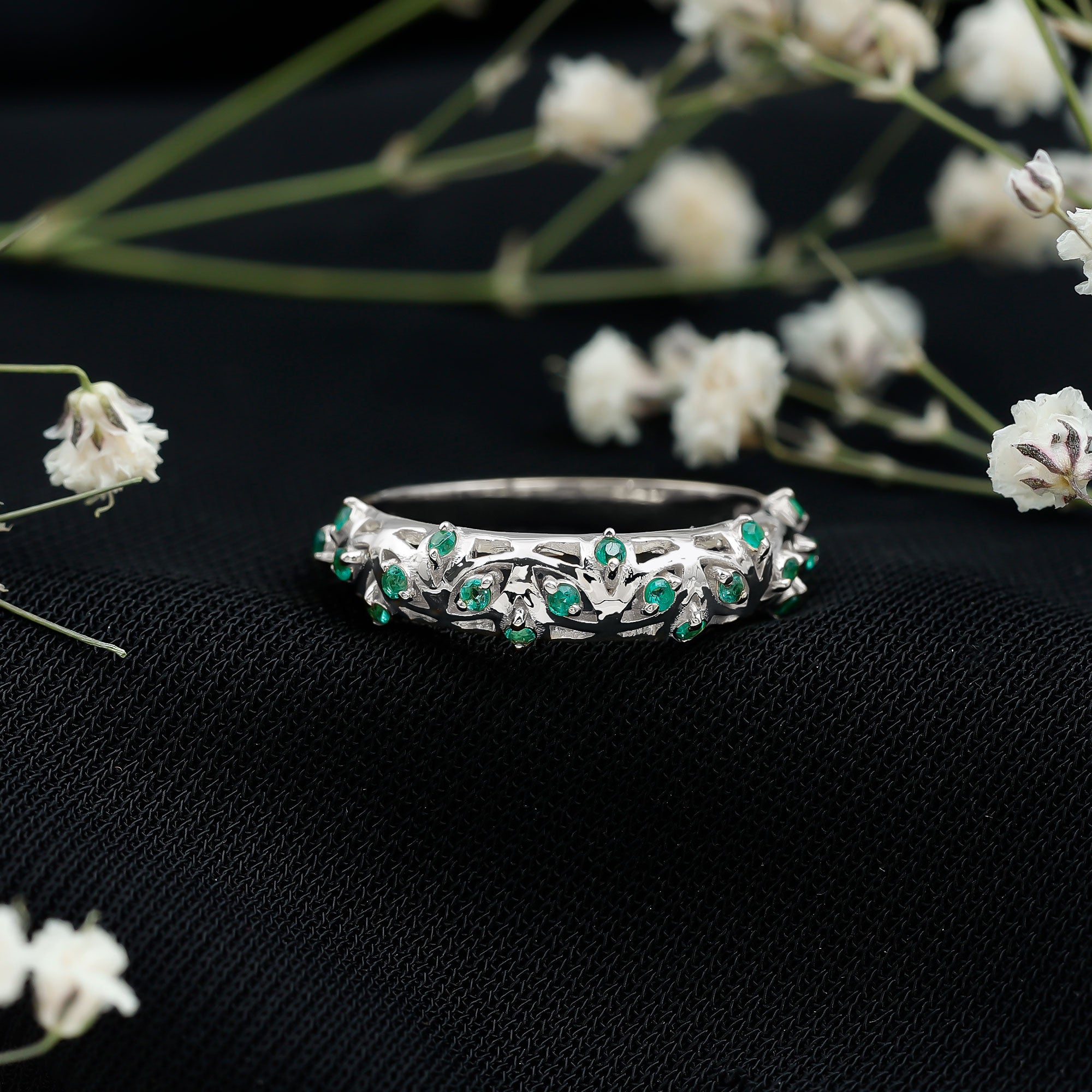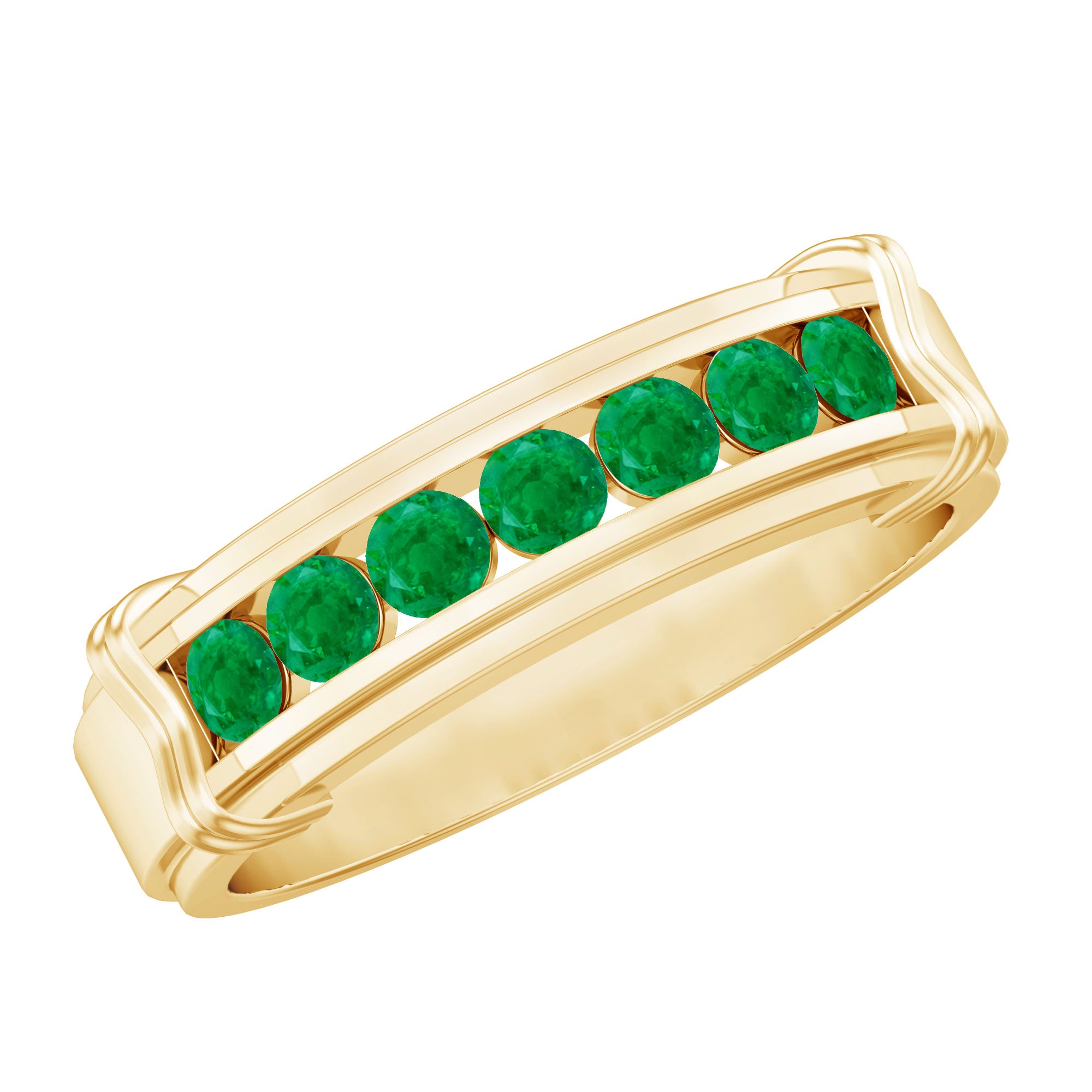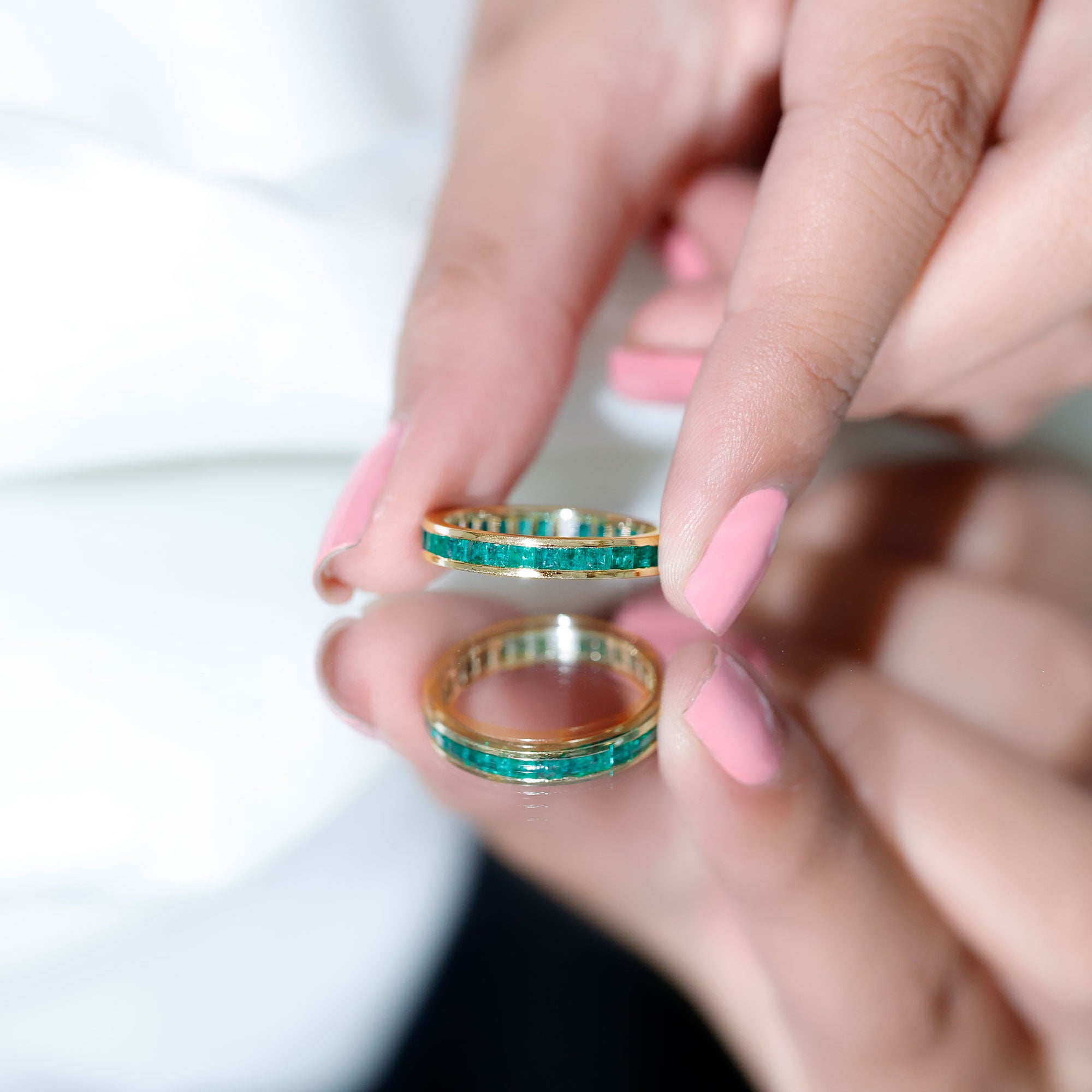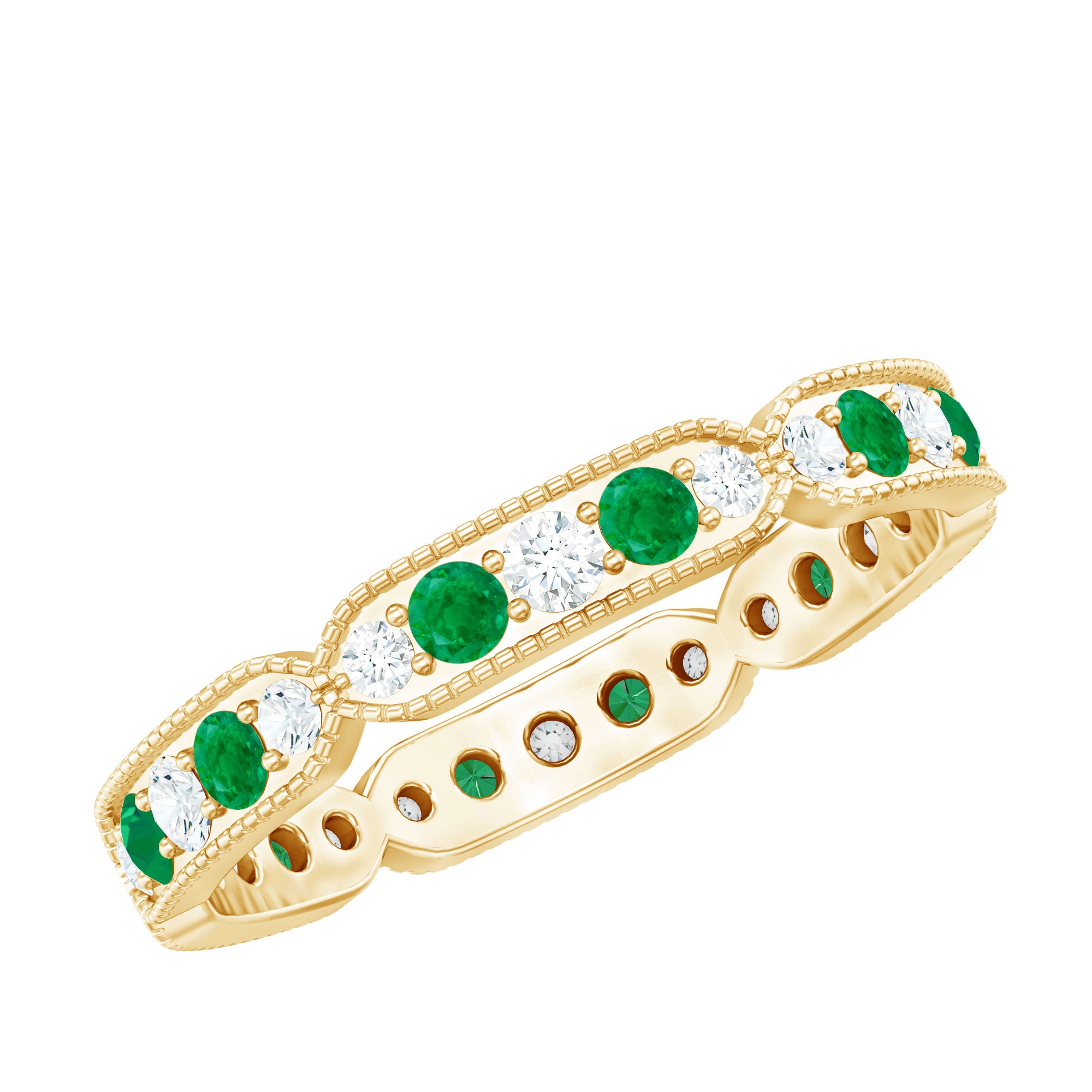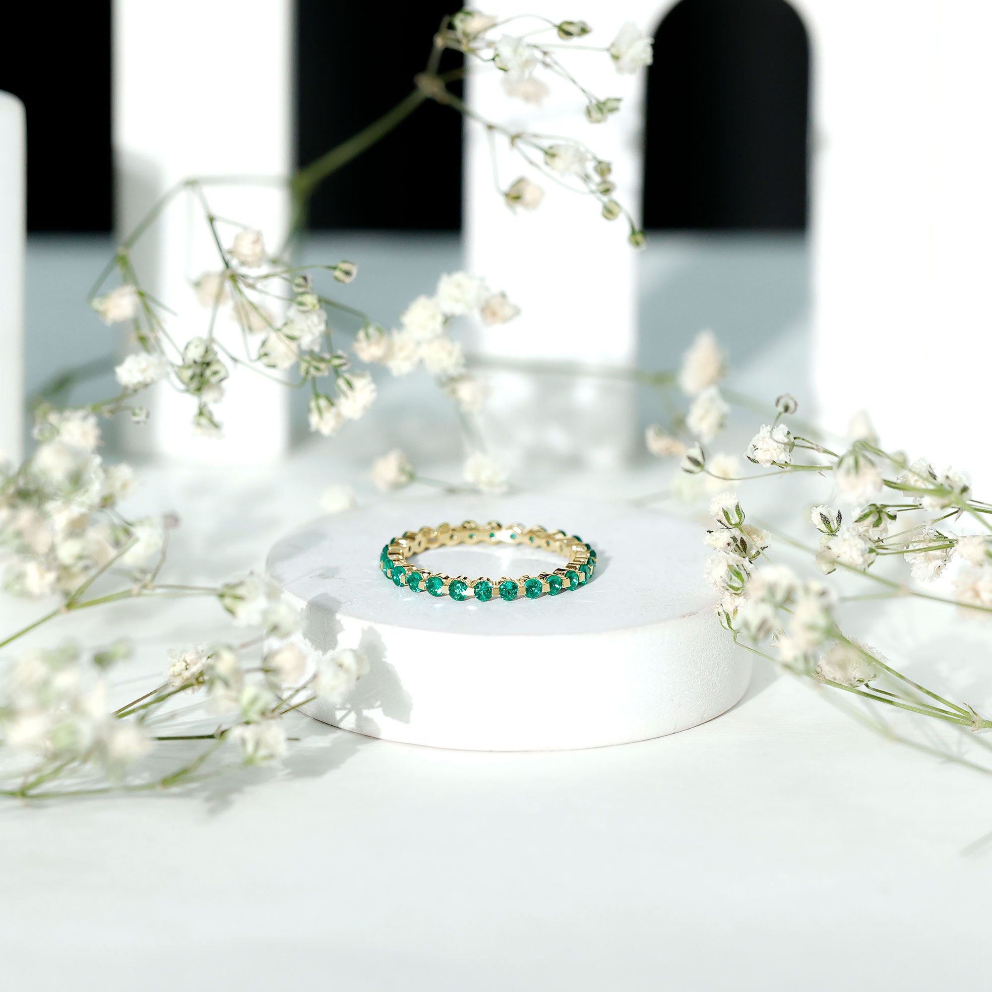 Half-eternity bands offer comfort for daily wear, while full-eternity styles deliver maximum emerald coverage and visual impact.